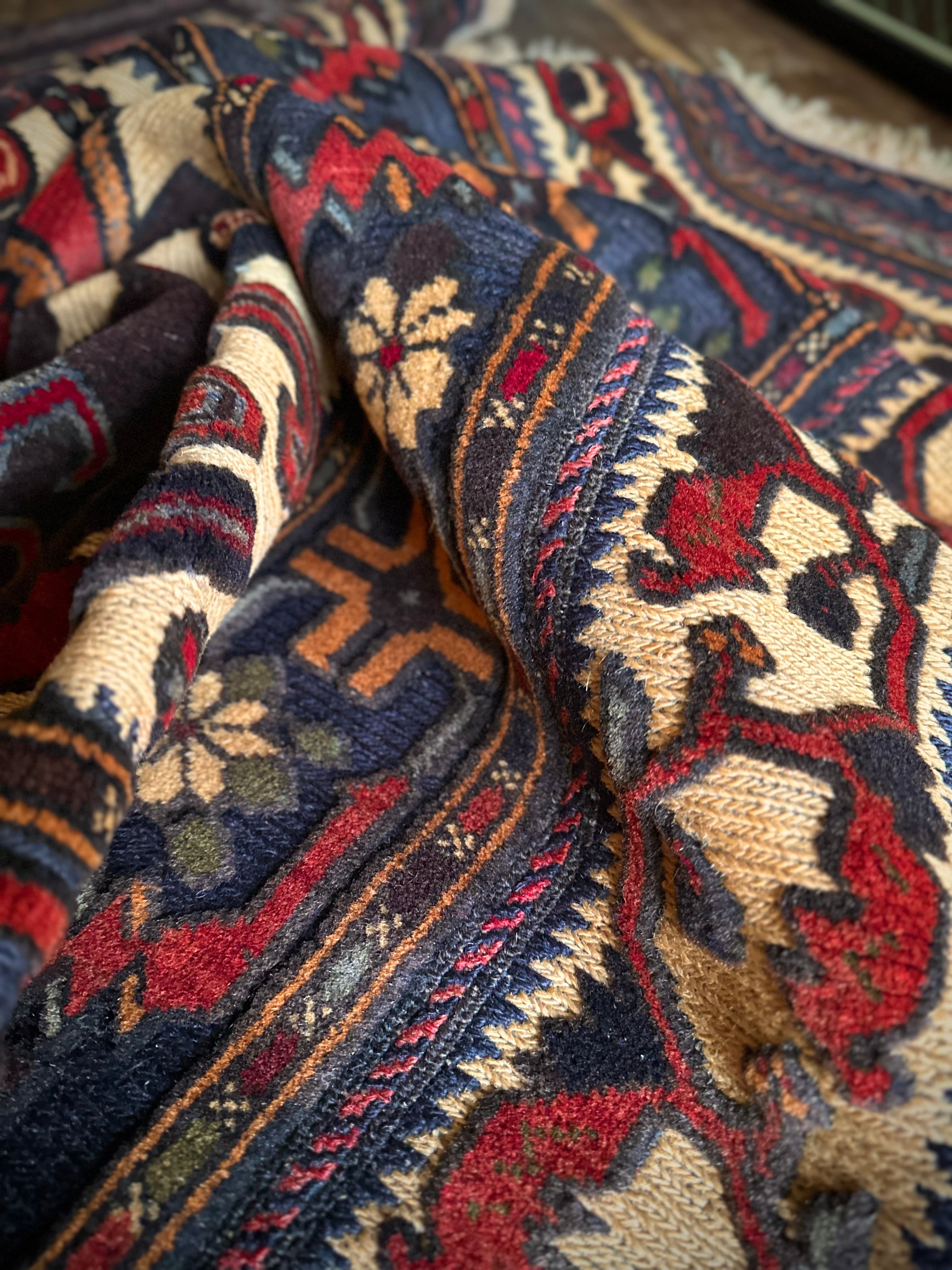 主なベースは平織りのキリムになりますが、柄の部分には毛足のあるパイルが使用されていて、ボコボコとした印象はマシュワニ族のそれと似ていて非なるものかと、より立体的に浮き上がった柄が見ていて楽しく、薄手となりますので壁や間仕切りとしても使えそうな珍しい1枚です。