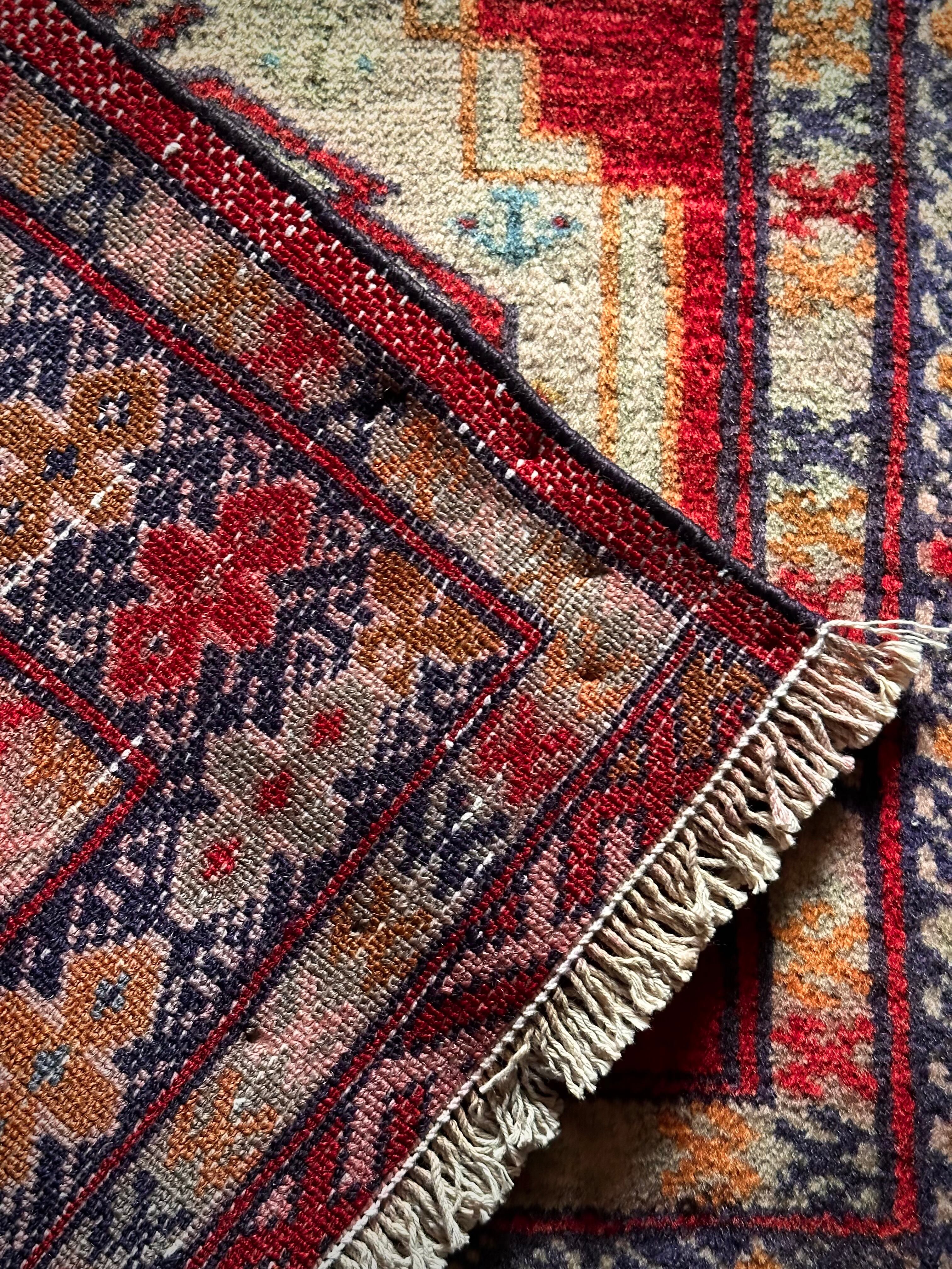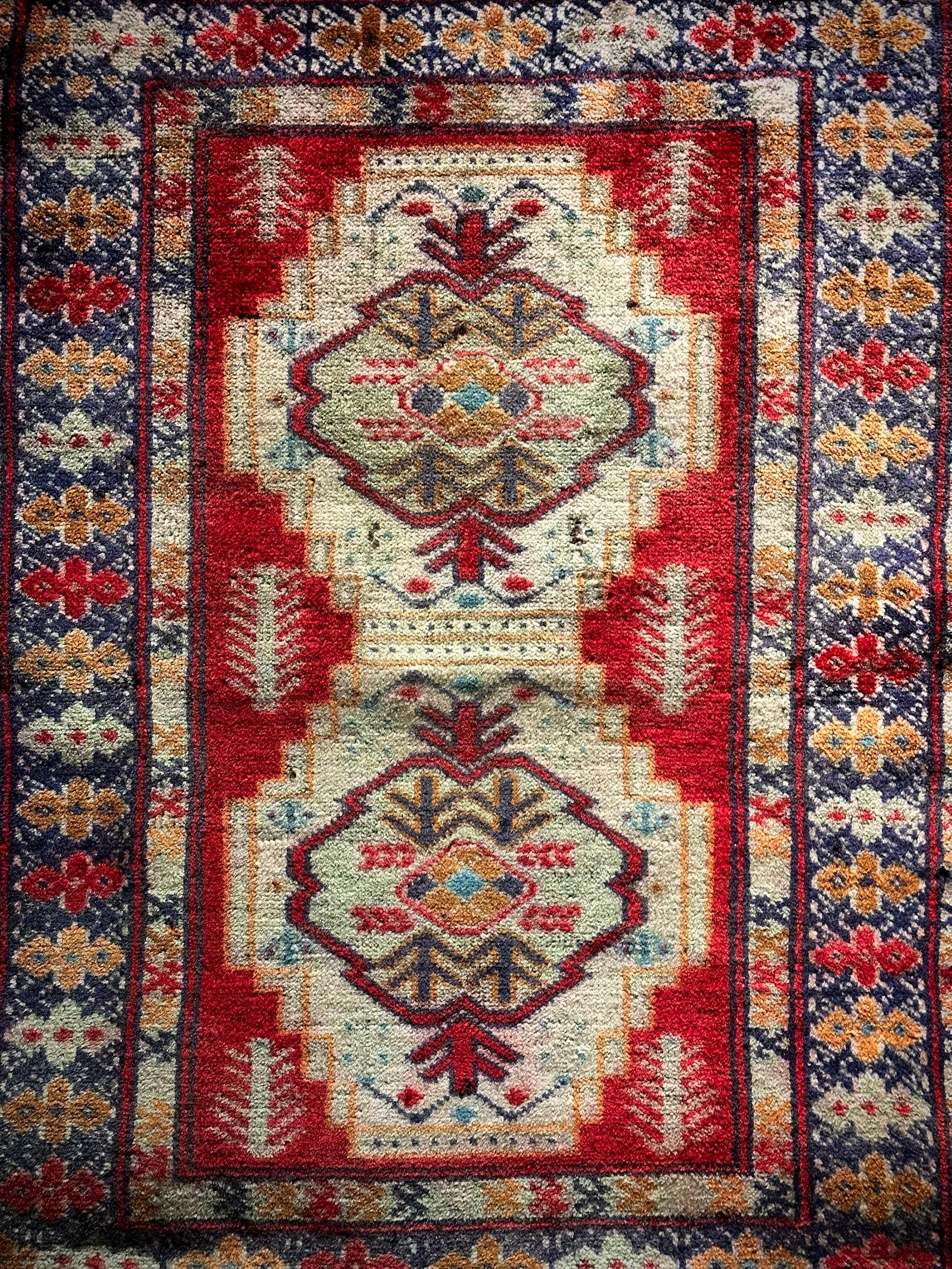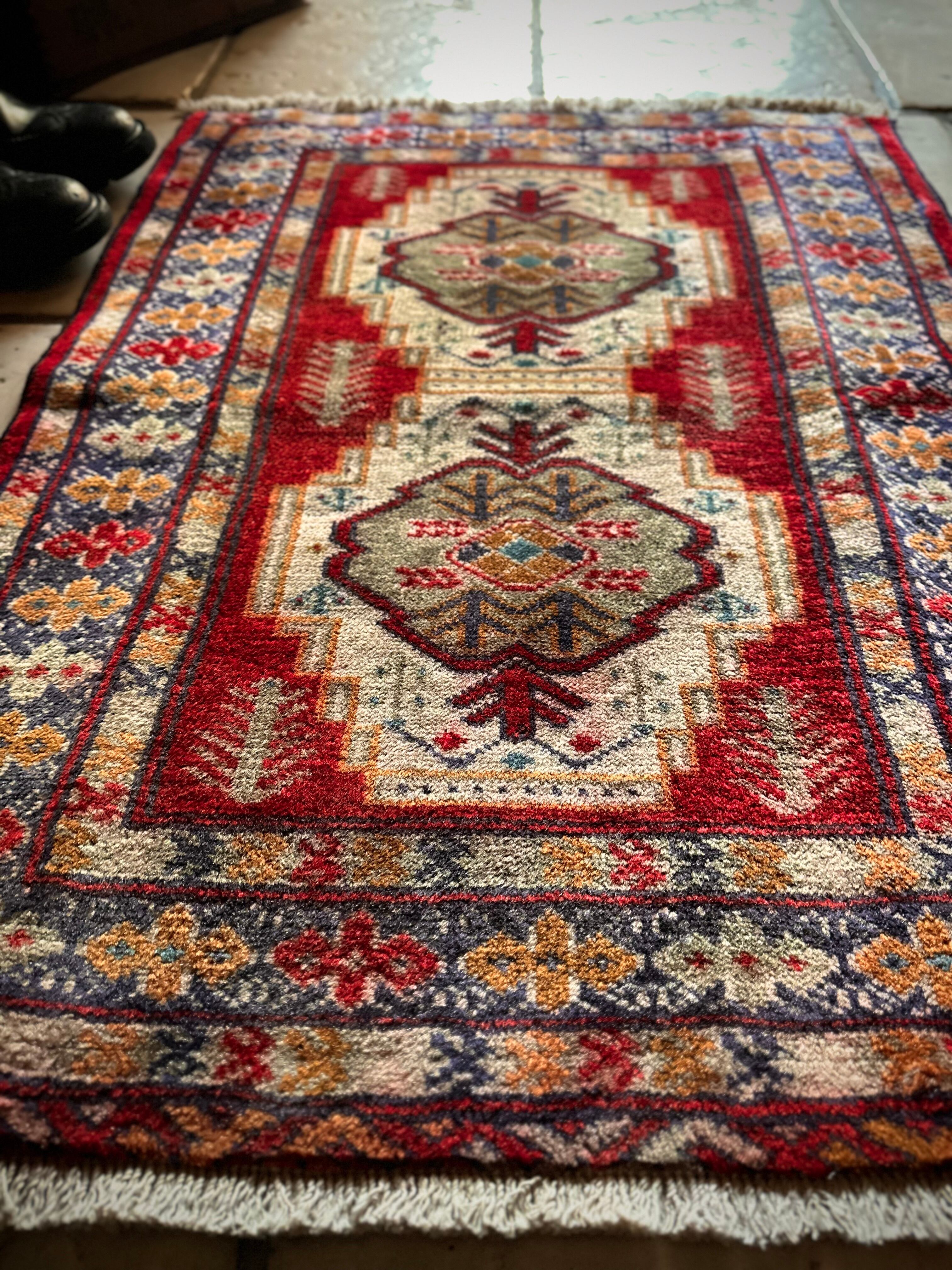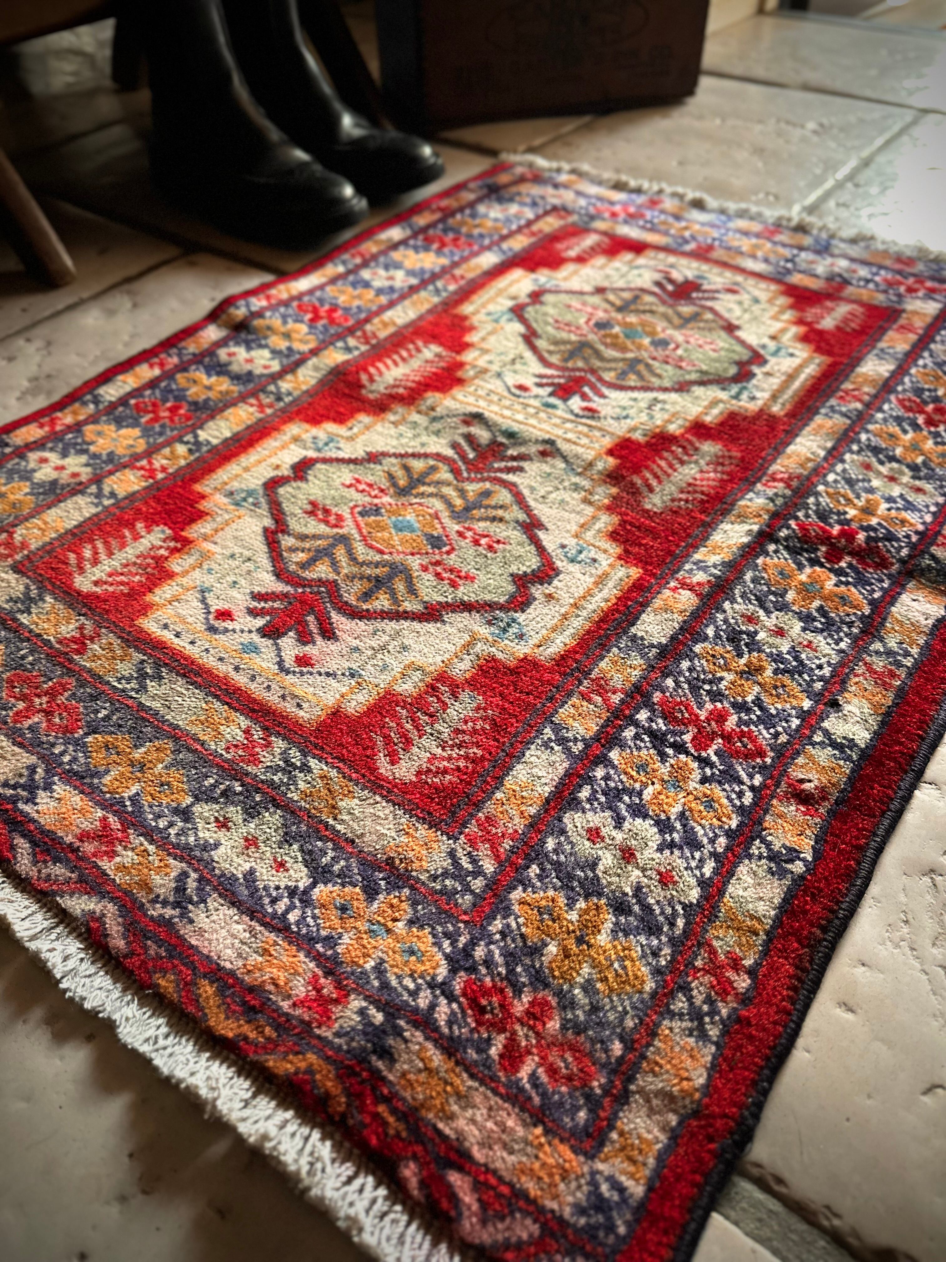 最後にラグそのものに関しては羊毛特有の匂いがあり、採寸は中央付近で計測していますが、手織りならではの歪みによる誤差や水洗いクリーニングによる縮み、また草木染めによる経年劣化の色ムラなどがありますが、それもまたヴィンテージラグの魅力かとご理解ください。