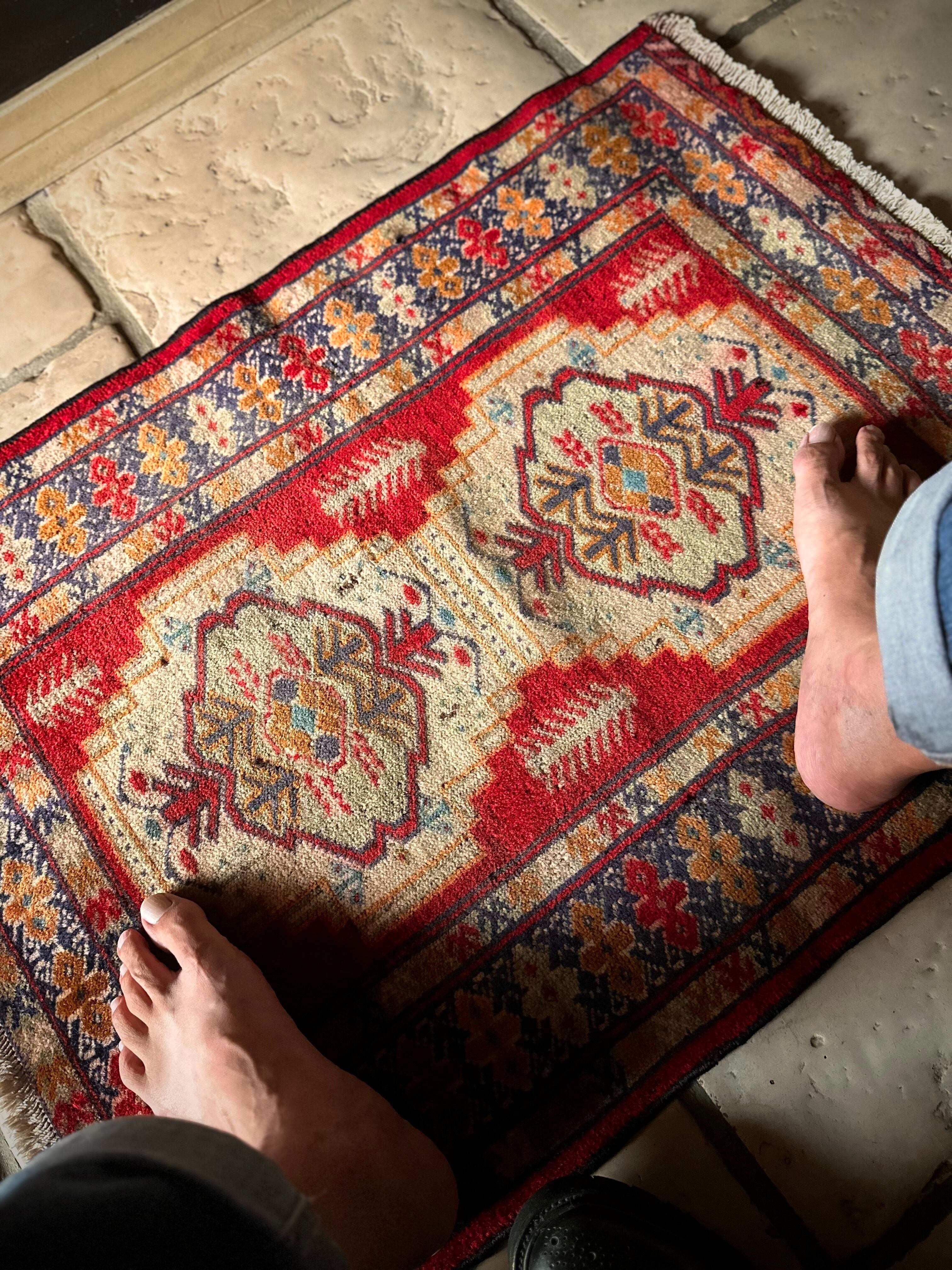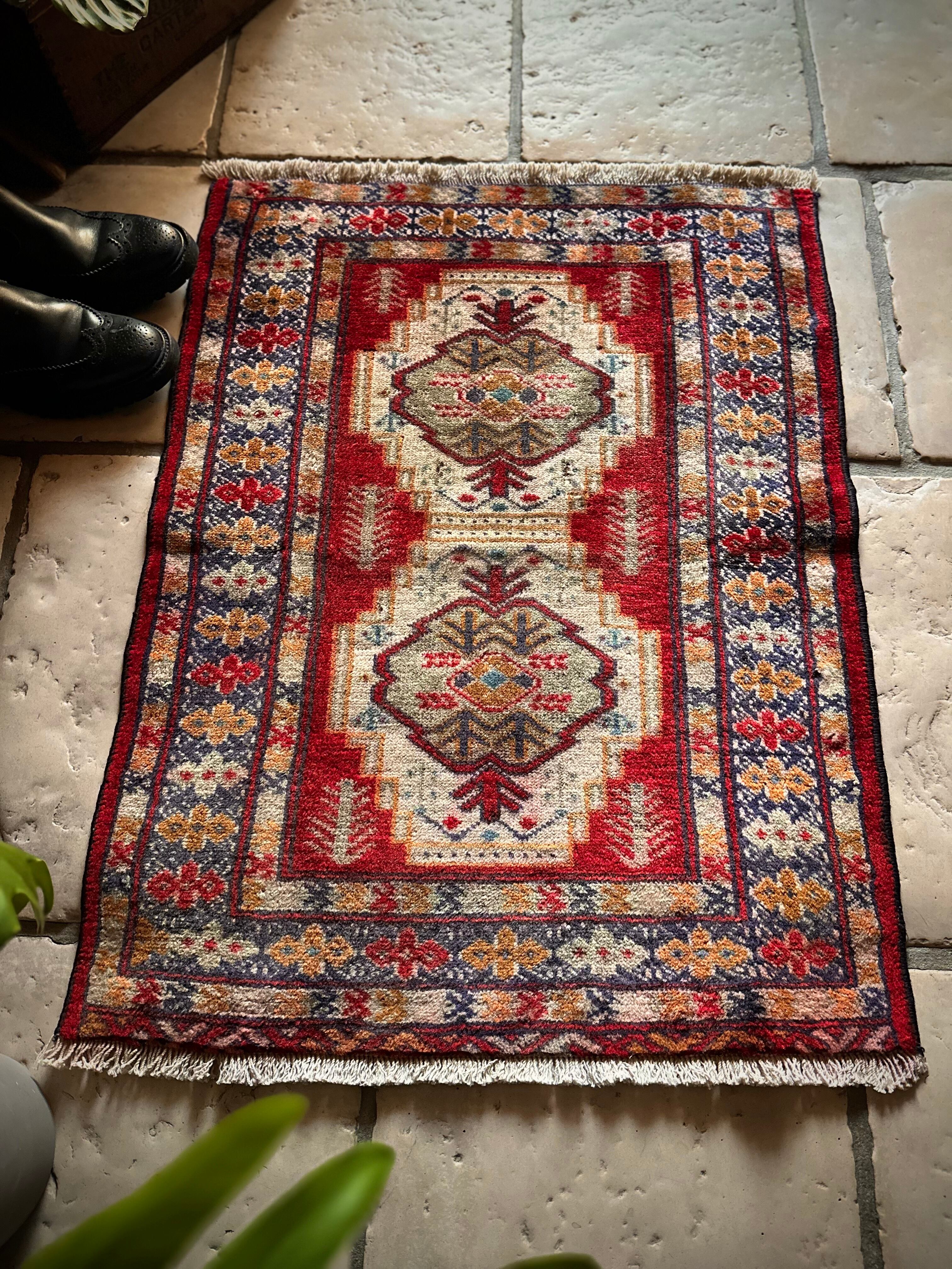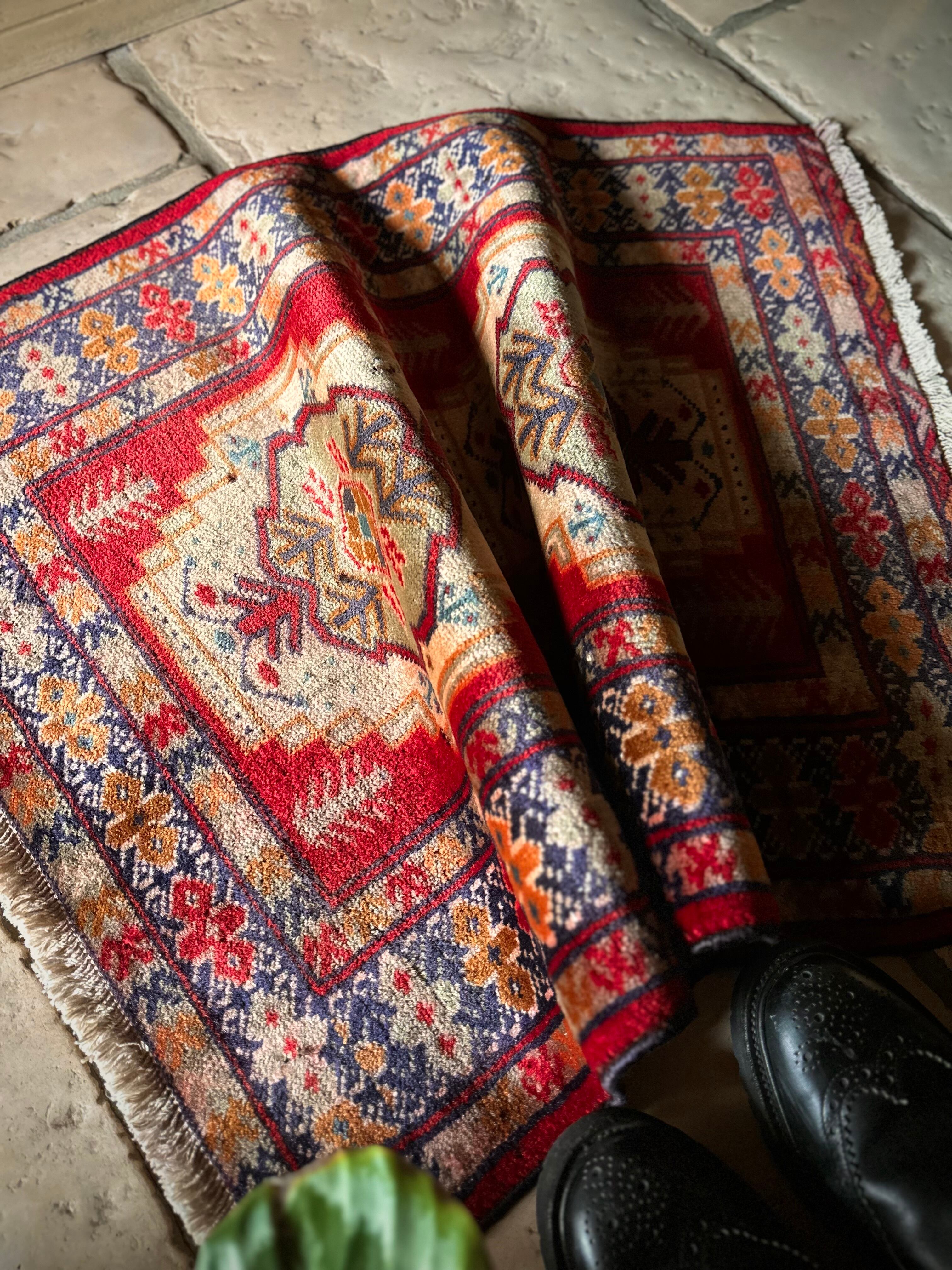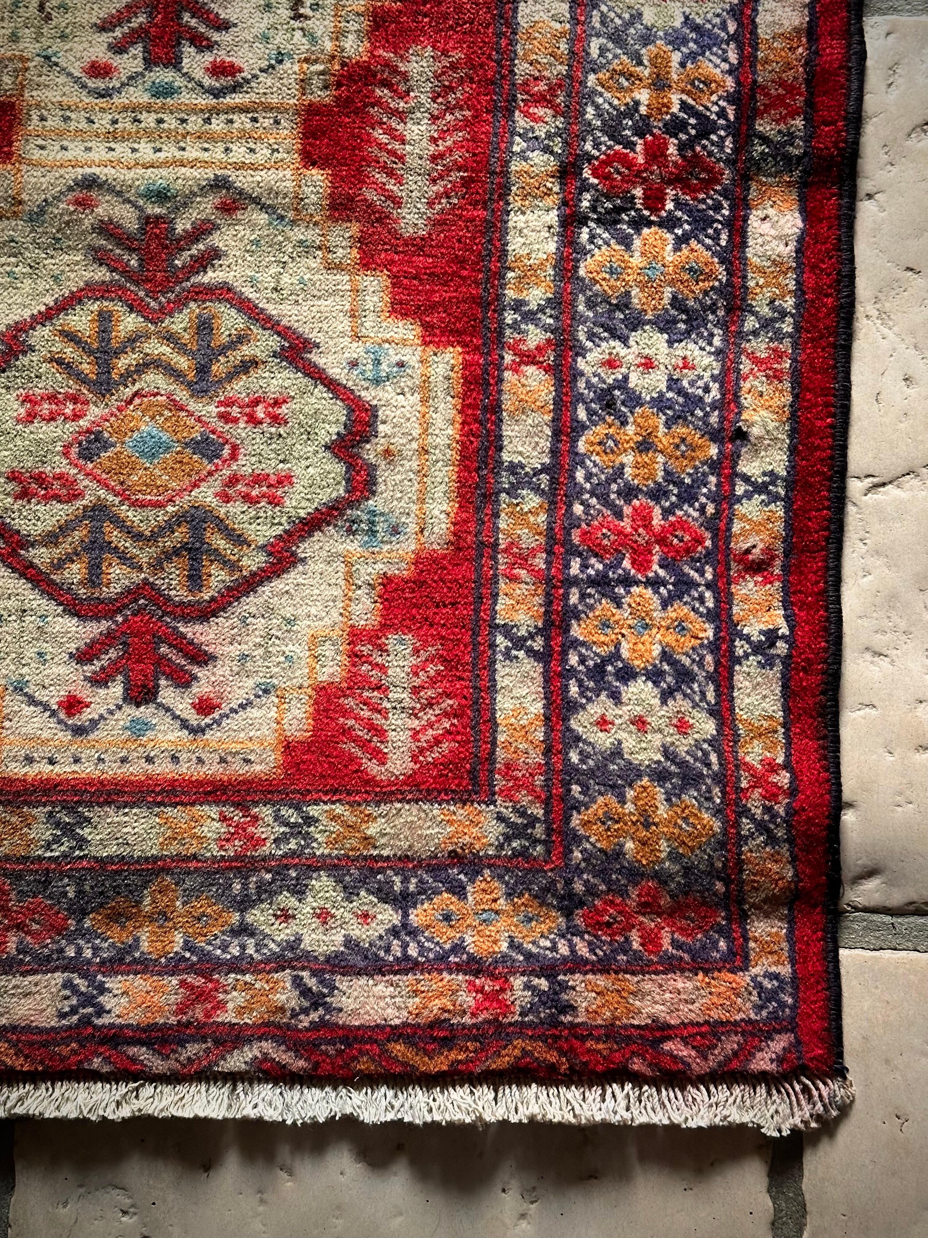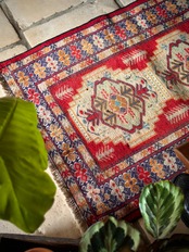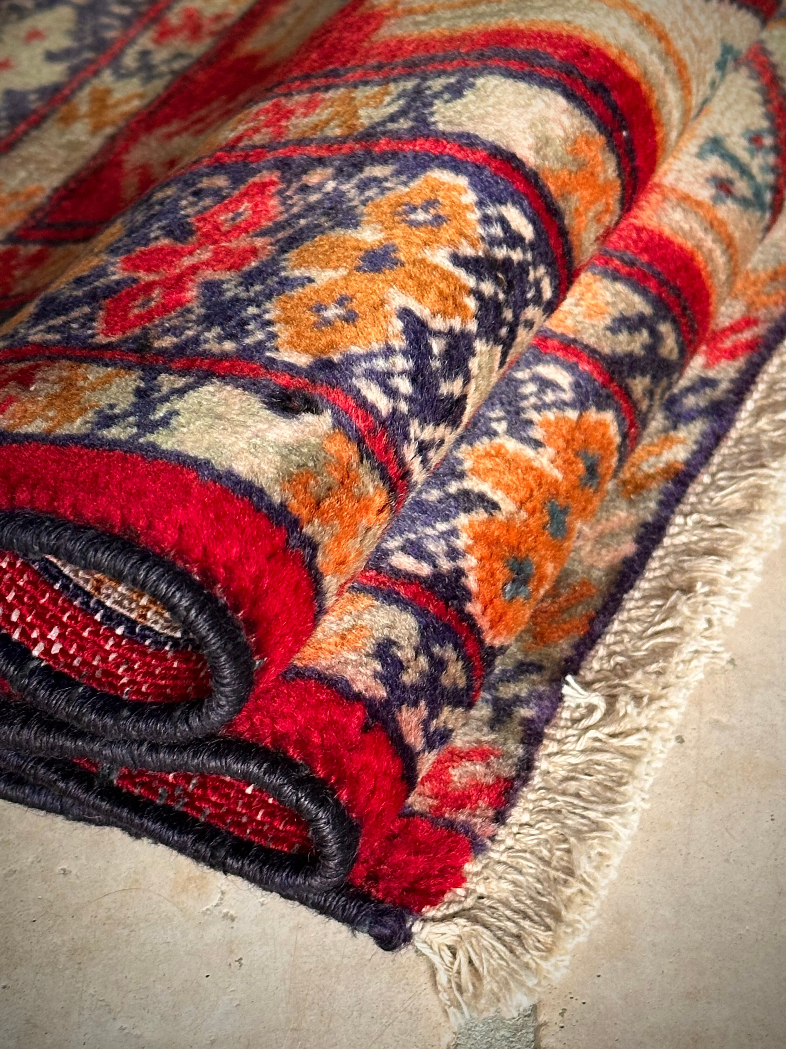 最後にラグそのものに関しては羊毛特有の匂いがあり、採寸は中央付近で計測していますが、手織りならではの歪みによる誤差や水洗いクリーニングによる縮み、また草木染めによる経年劣化の色ムラなどがありますが、それもまたヴィンテージラグの魅力かとご理解ください。