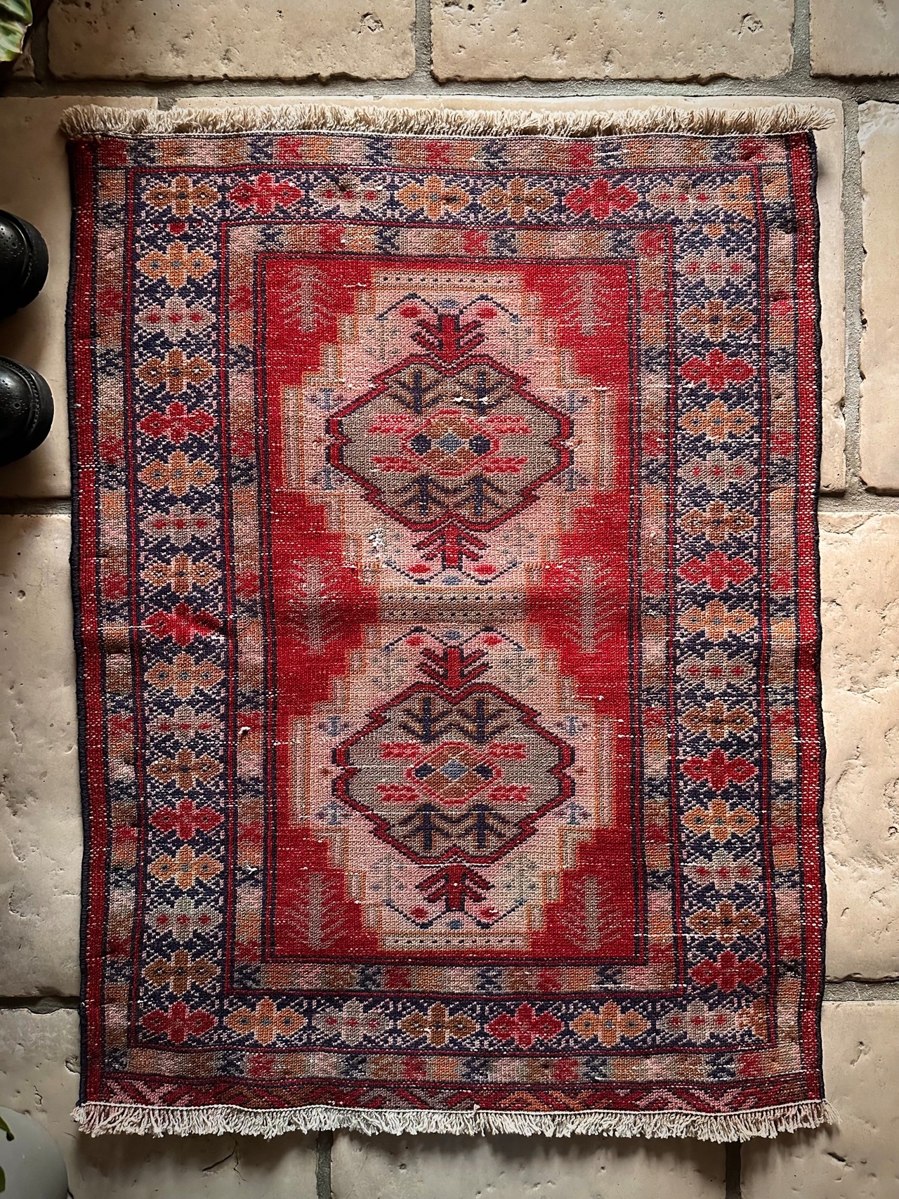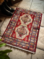 そんなこちらは矢が描かれたような戦旗のような柄で、シンボルでもある赤を上手く使った配色がかっこ良く、トライバルラグらしさが色濃く出された玄関マットサイズのアクセントラグになります。
