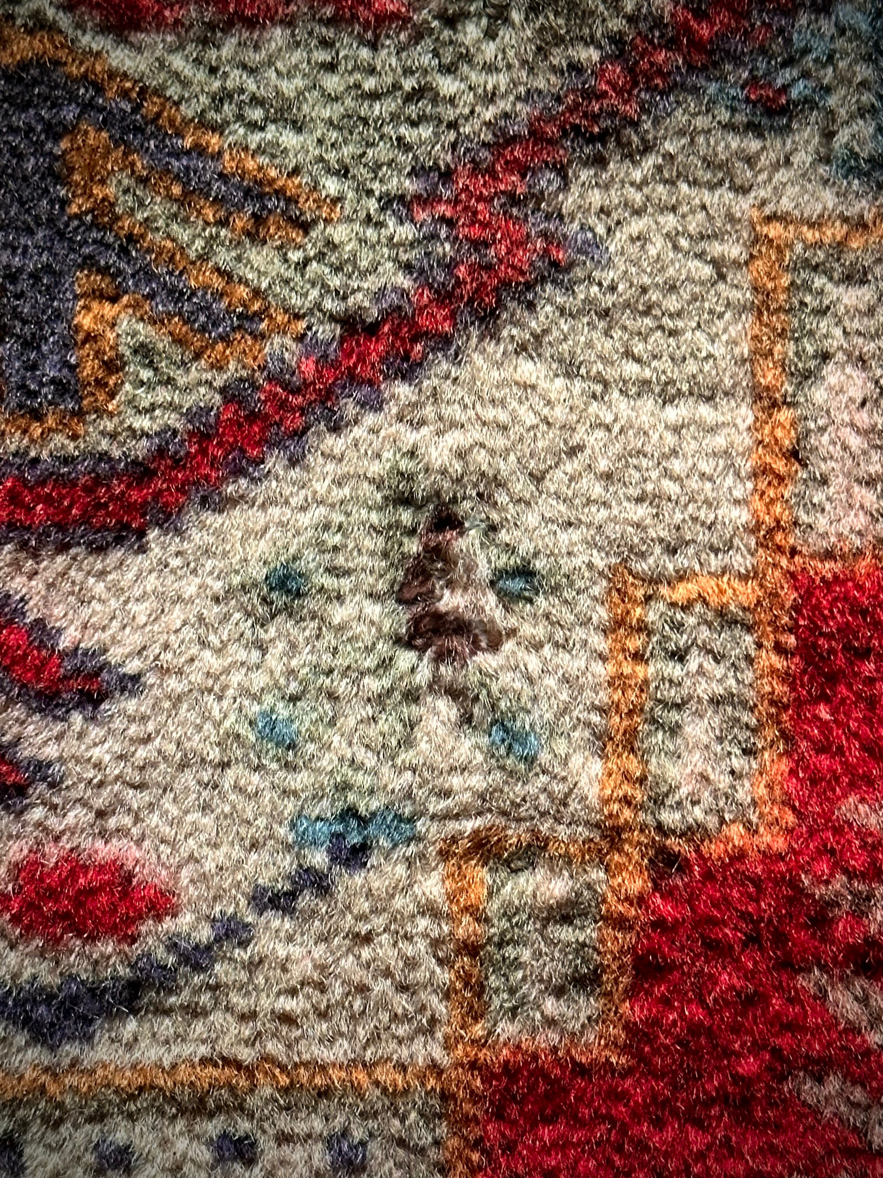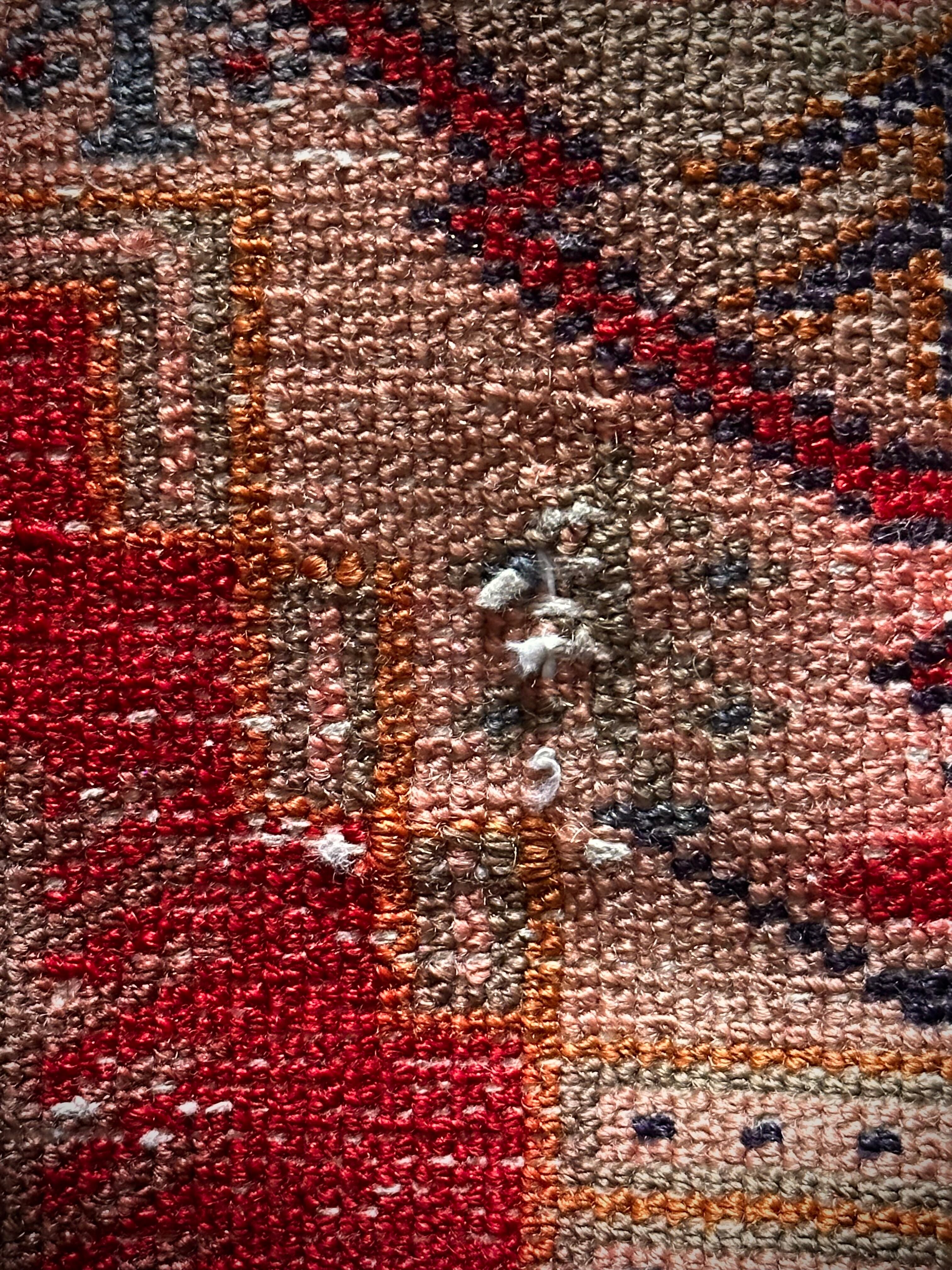 経年としては比較的に近年に織られた10年くらいと、トルクメン特有の短めのパイルはサラッとしていて、特に目立つ汚れやダメージはありませんが、小さなリペア跡は何故だか違う色の毛糸で補修されていますので写真にてご確認ください。