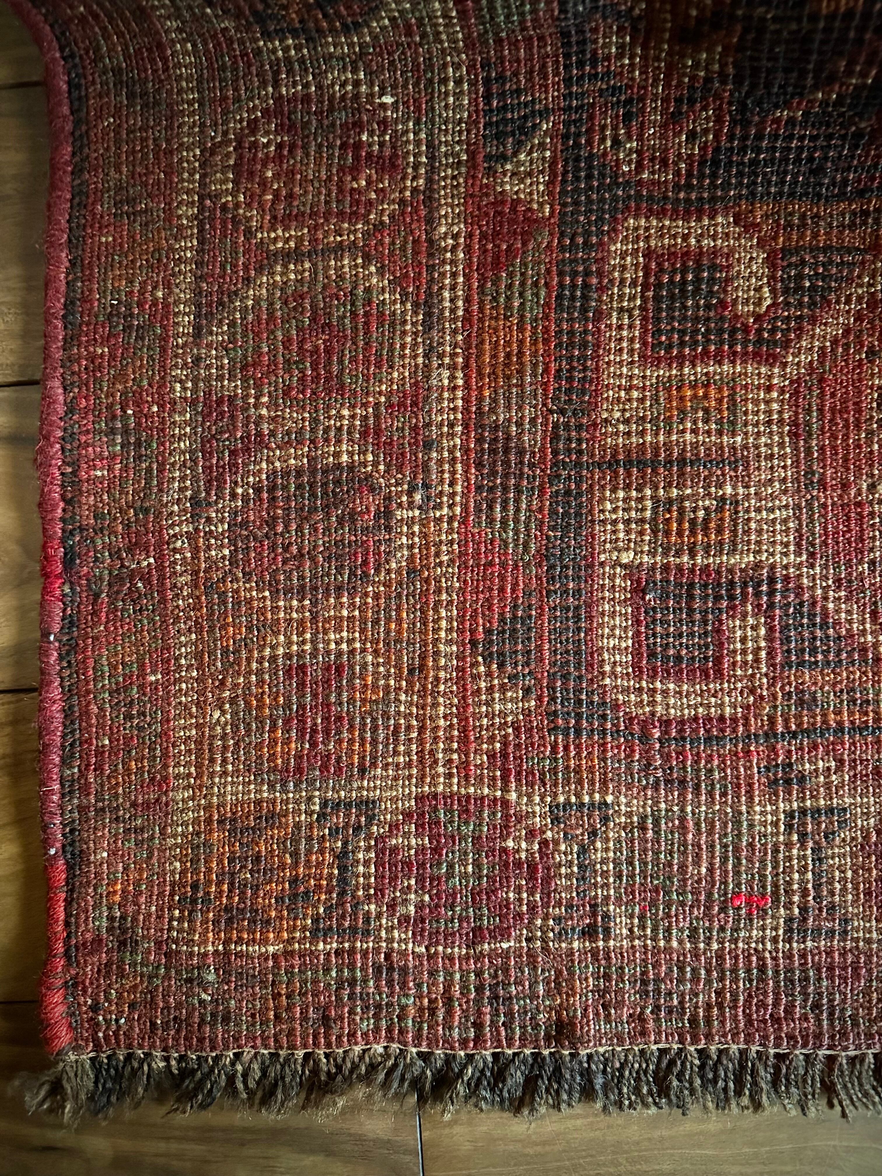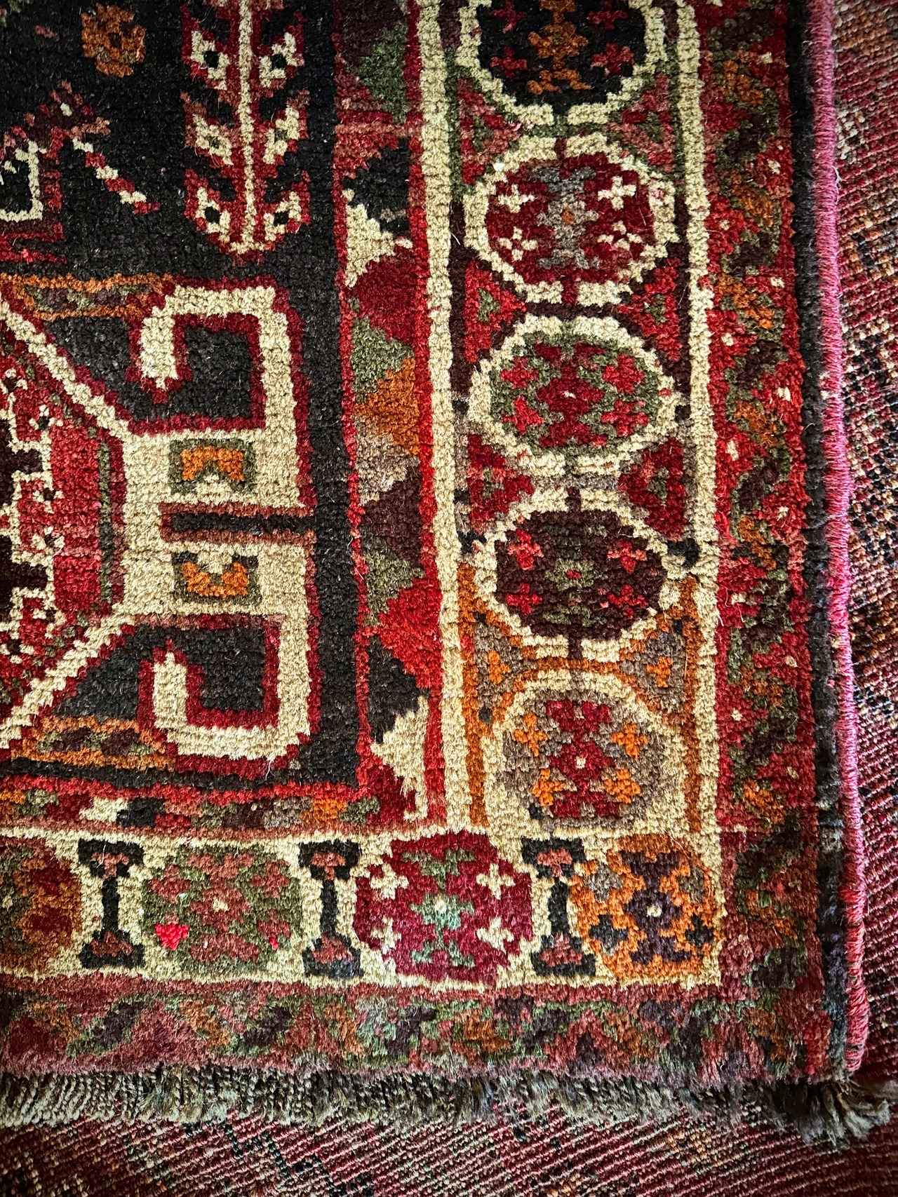 経年としては当店が扱ったなかでは最も古い80年モノのオールドラグとなりますが、先ほども述べたように素晴らしいパイルの状態に、特に目立つ汚れやダメージはありませんが、小さなリペアとして真っ赤な毛糸で補修された箇所がありますので写真にてご確認ください。