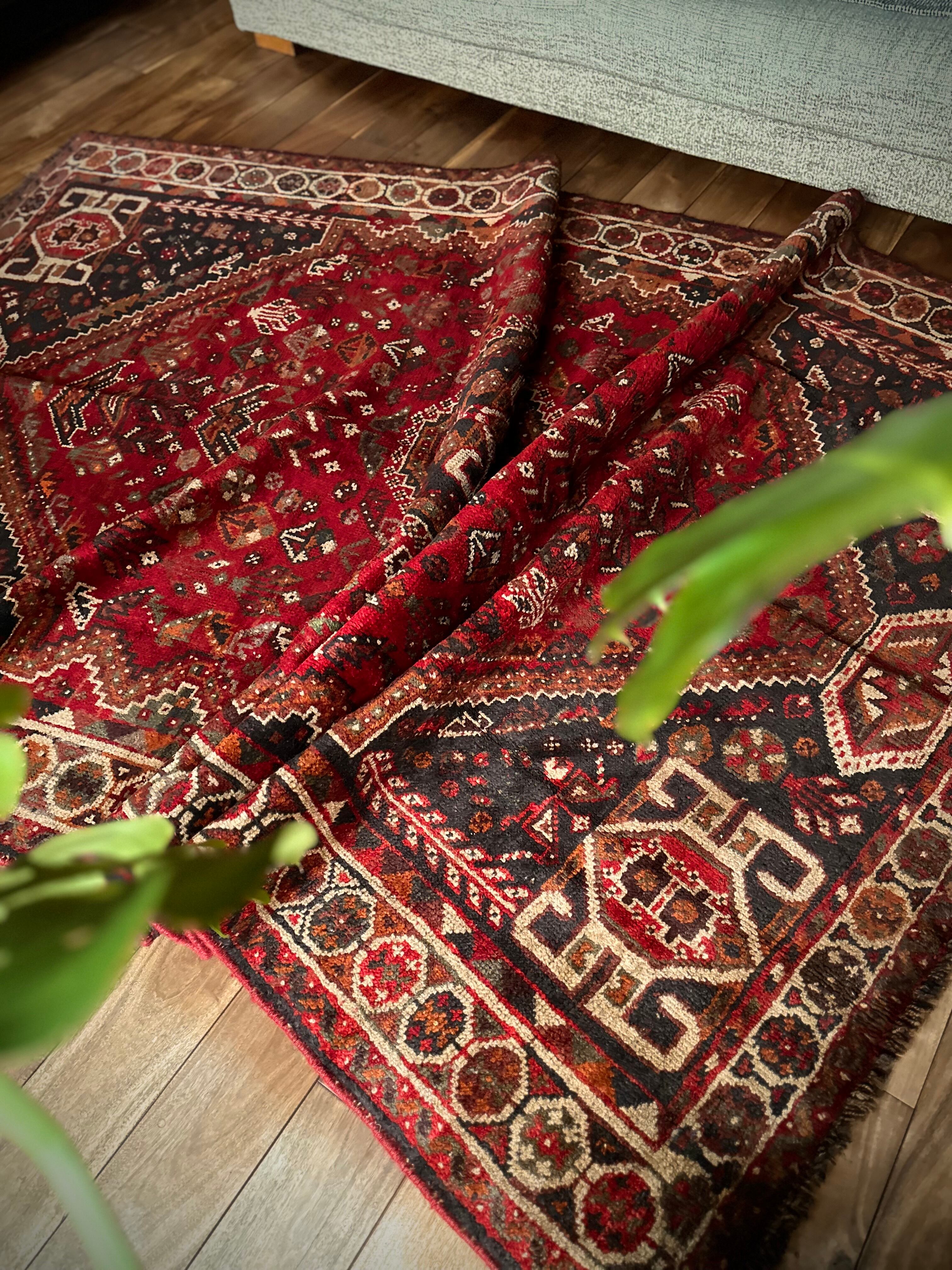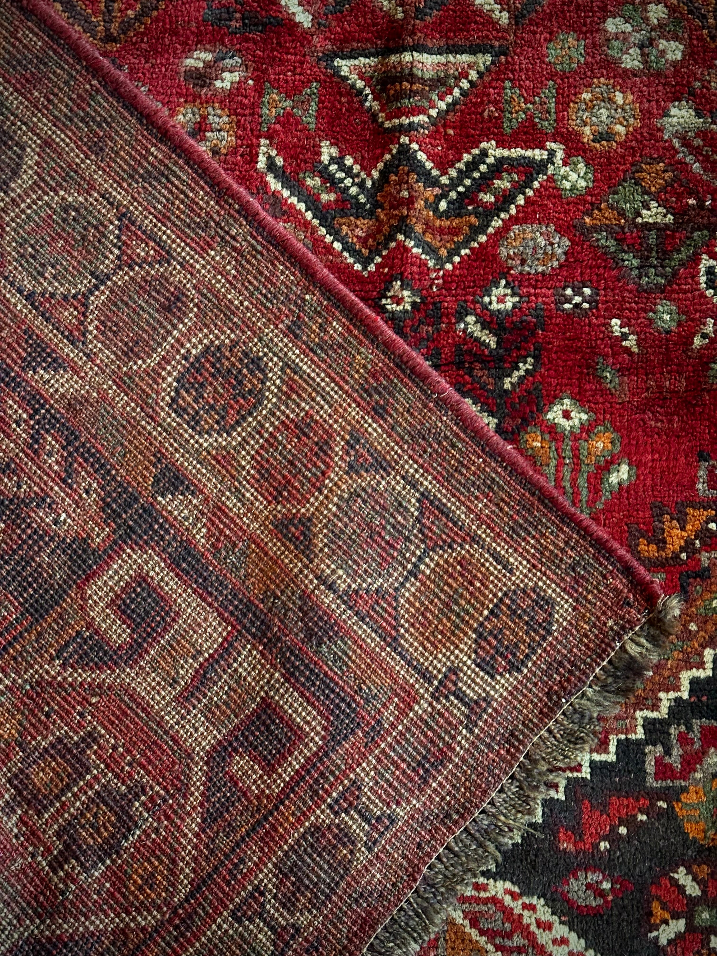 イラン南西部の街シラーズ周辺に居住するカシュガイ族は、古くはトルコ系の遊牧民族として独特な色彩感覚に優れ、なかでもこちら細かな紋様が散りばめられた絵柄は、まるで宝石箱をひっくり返した様と喩えられるほどに目を見張るトライバルラグになります。