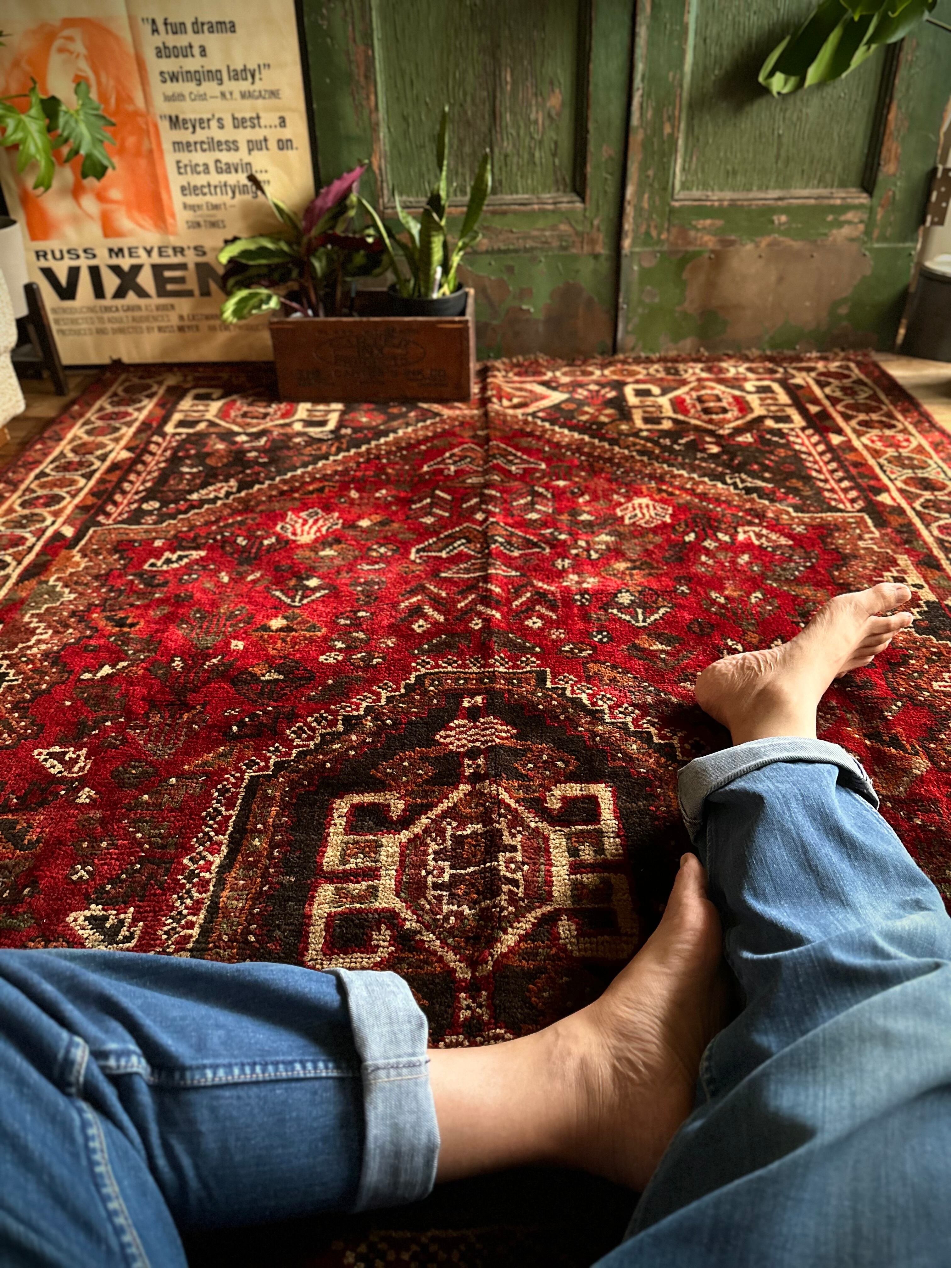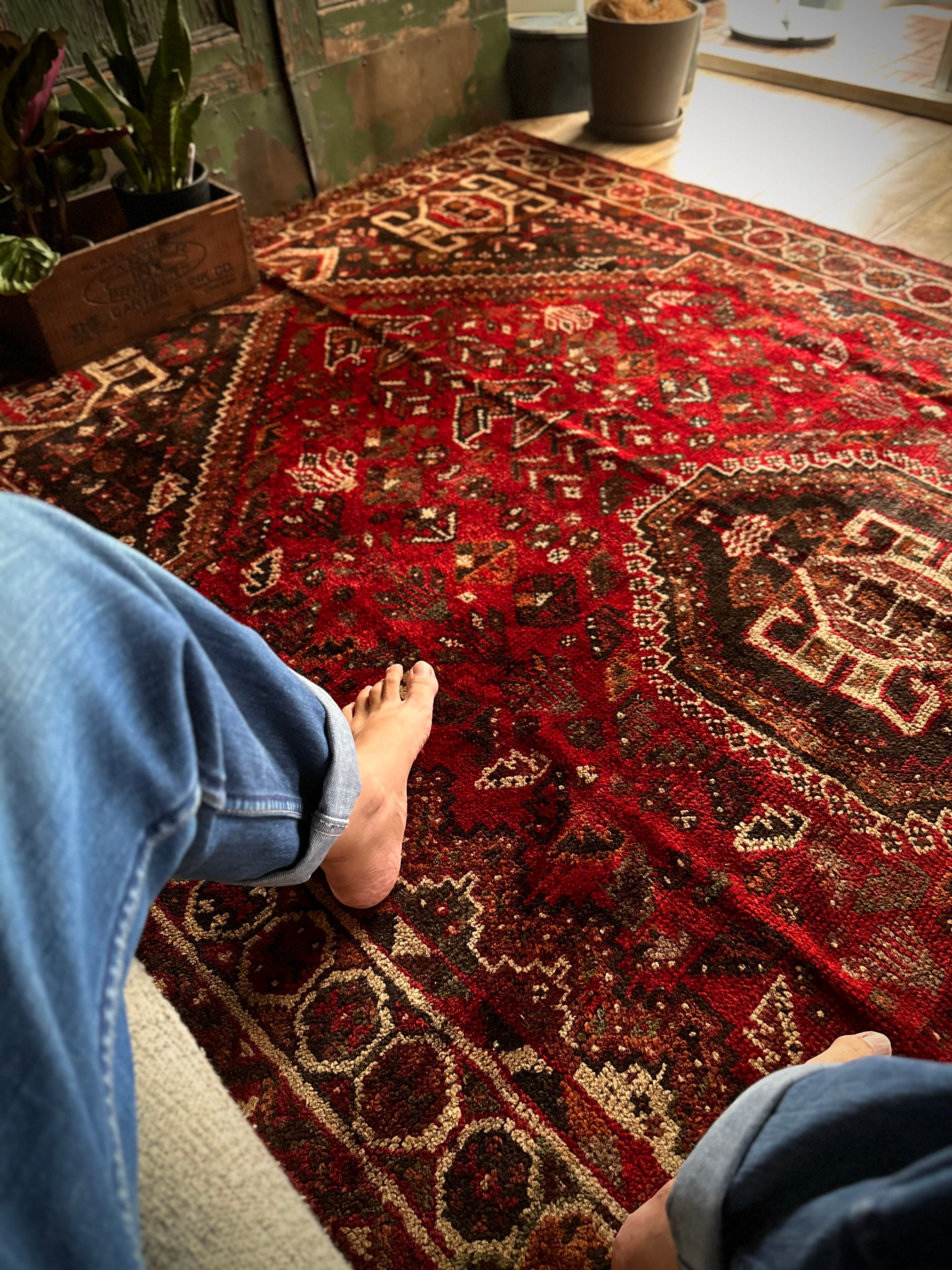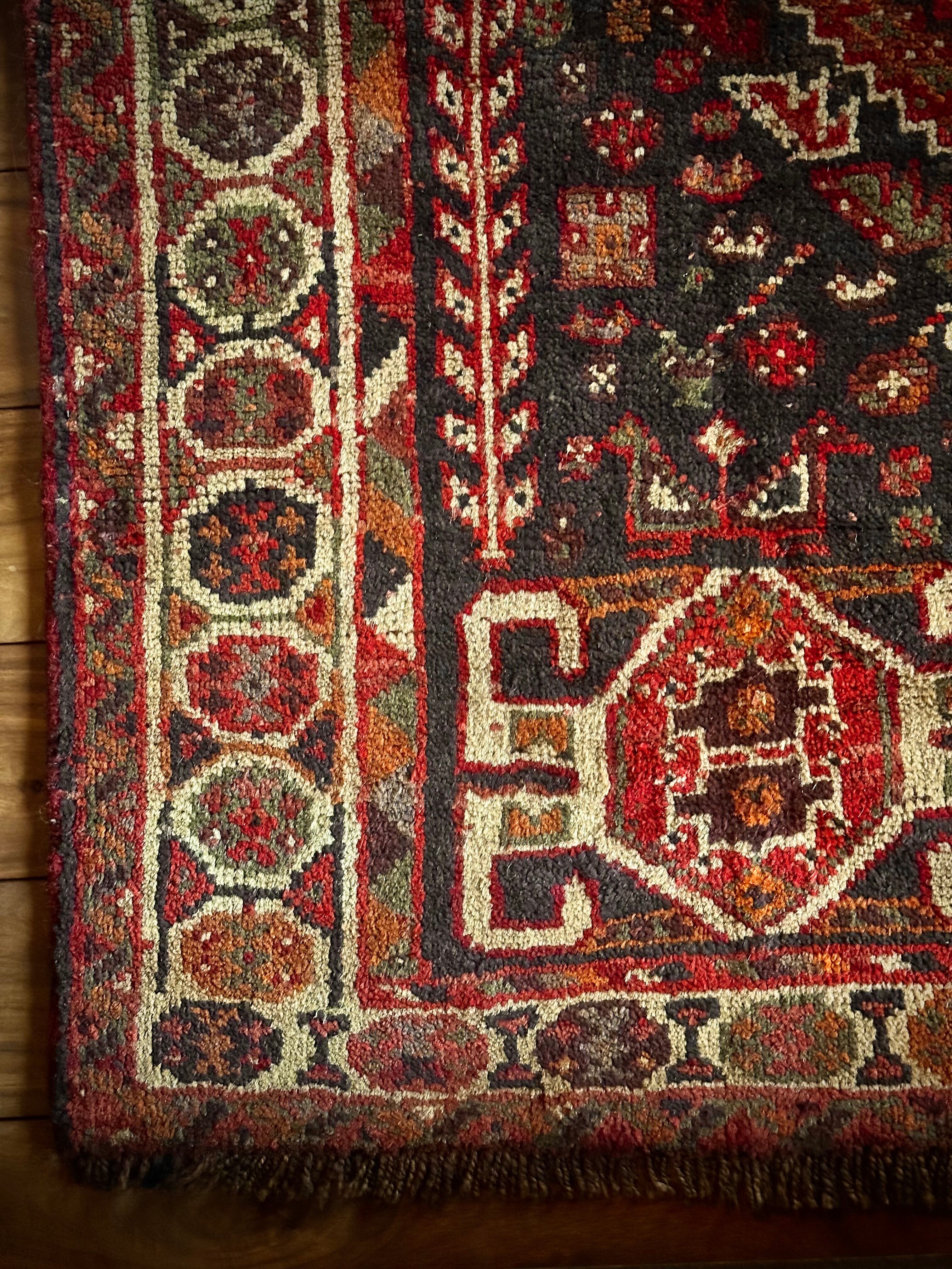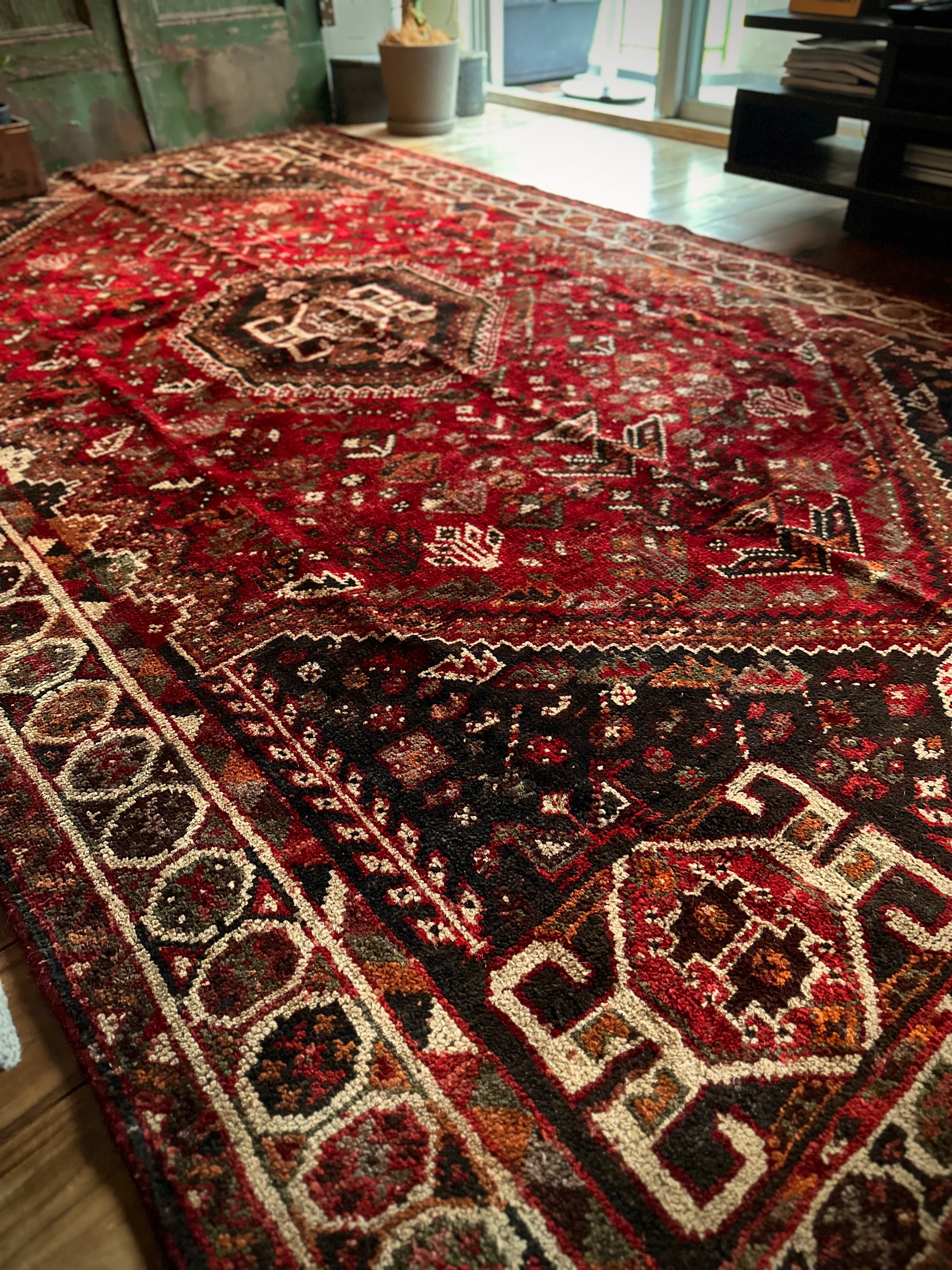 深みのあるバーガンディにメダリオンがあしらわれたお馴染みのスタイルで、ネイビーとの対比がかっこ良く男前な部屋でも様になるでしょうか。自宅で撮影するには限界を感じるほどの大判サイズで、オールドラグにしてはフサフサしたパイルの状態に驚きが隠せません。