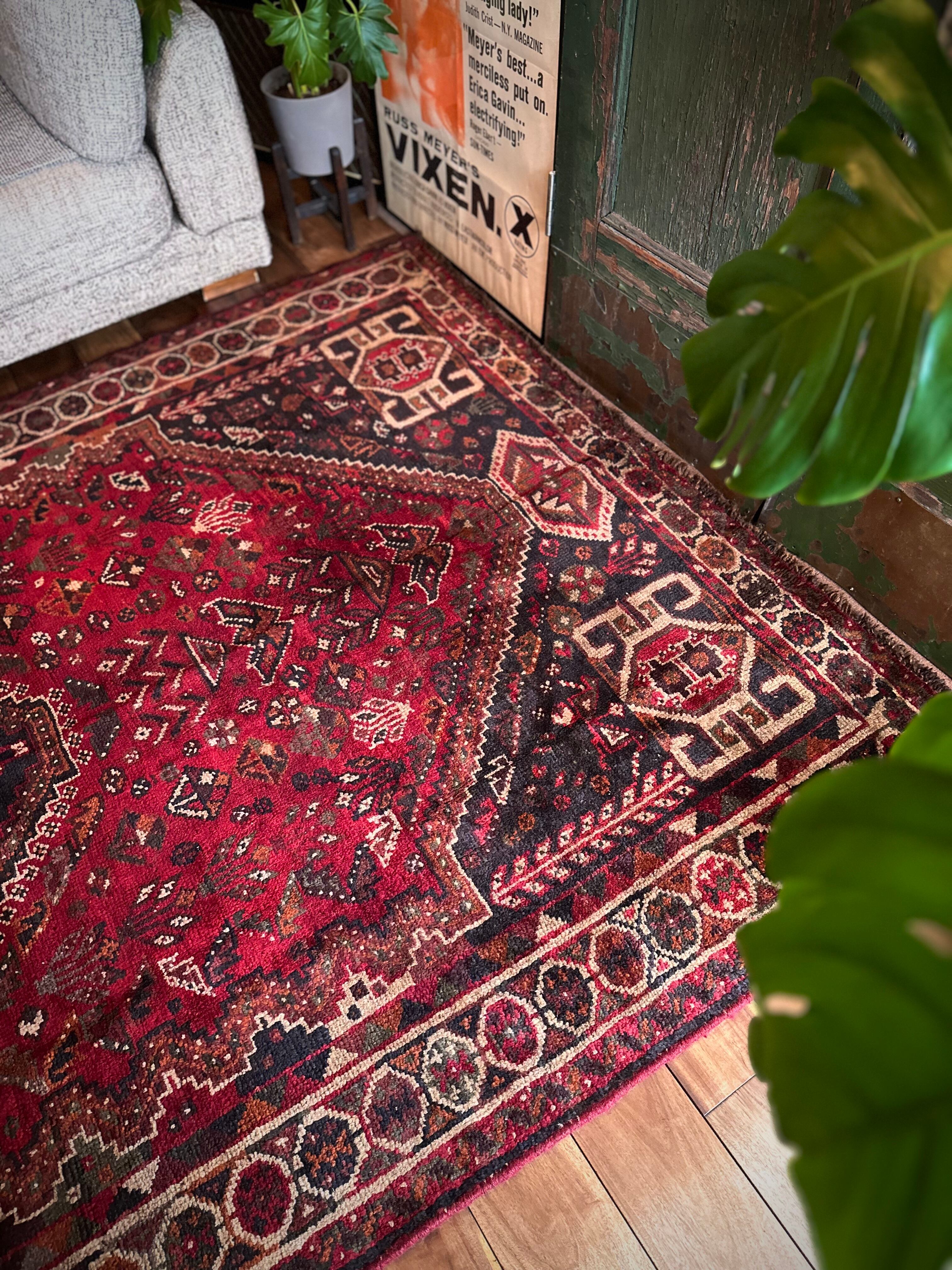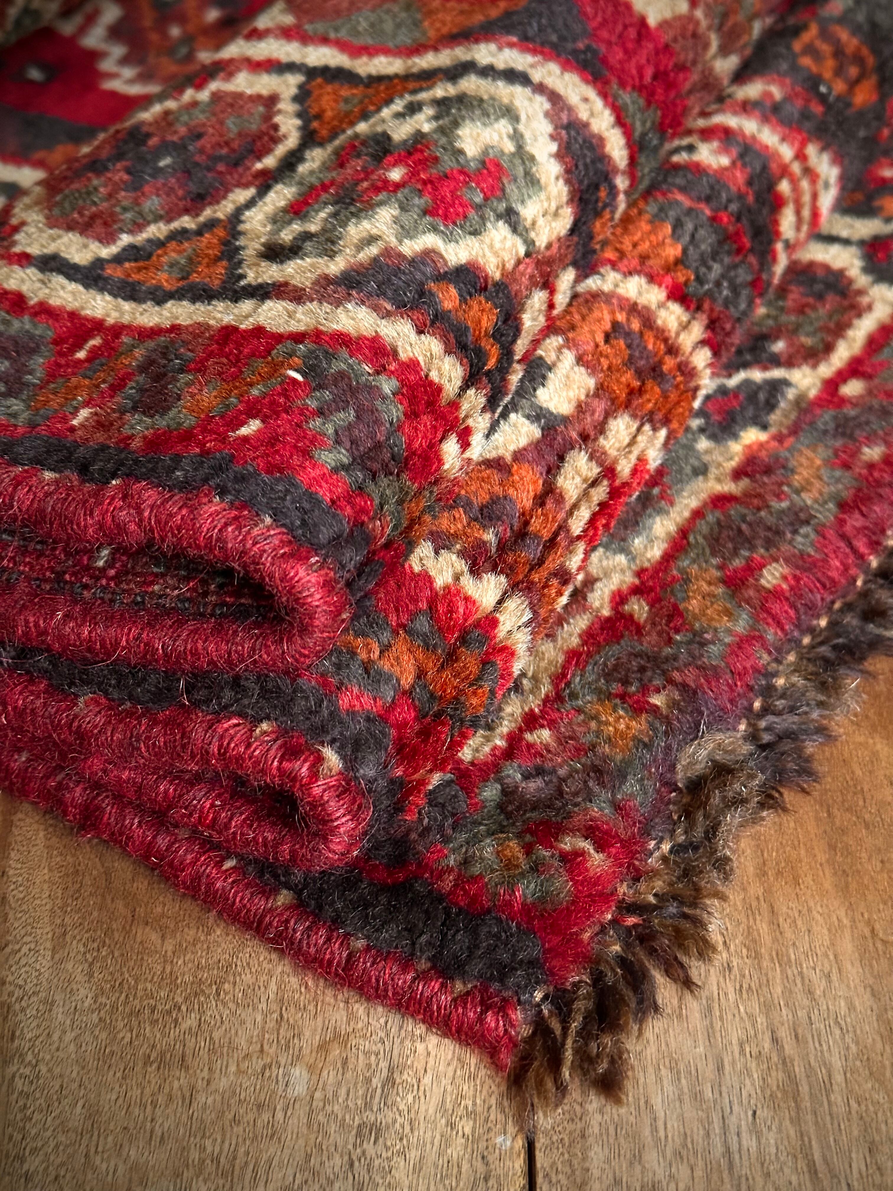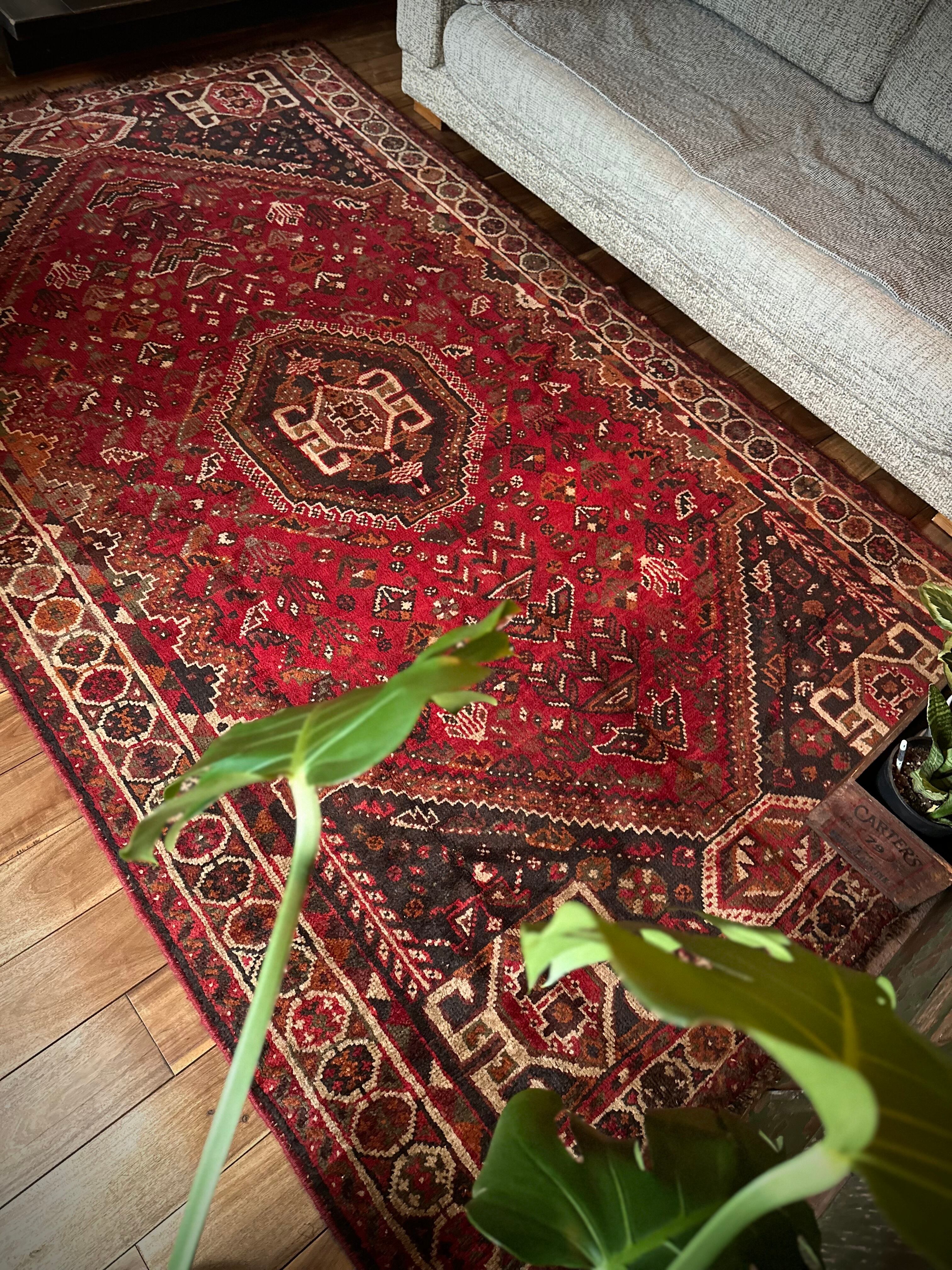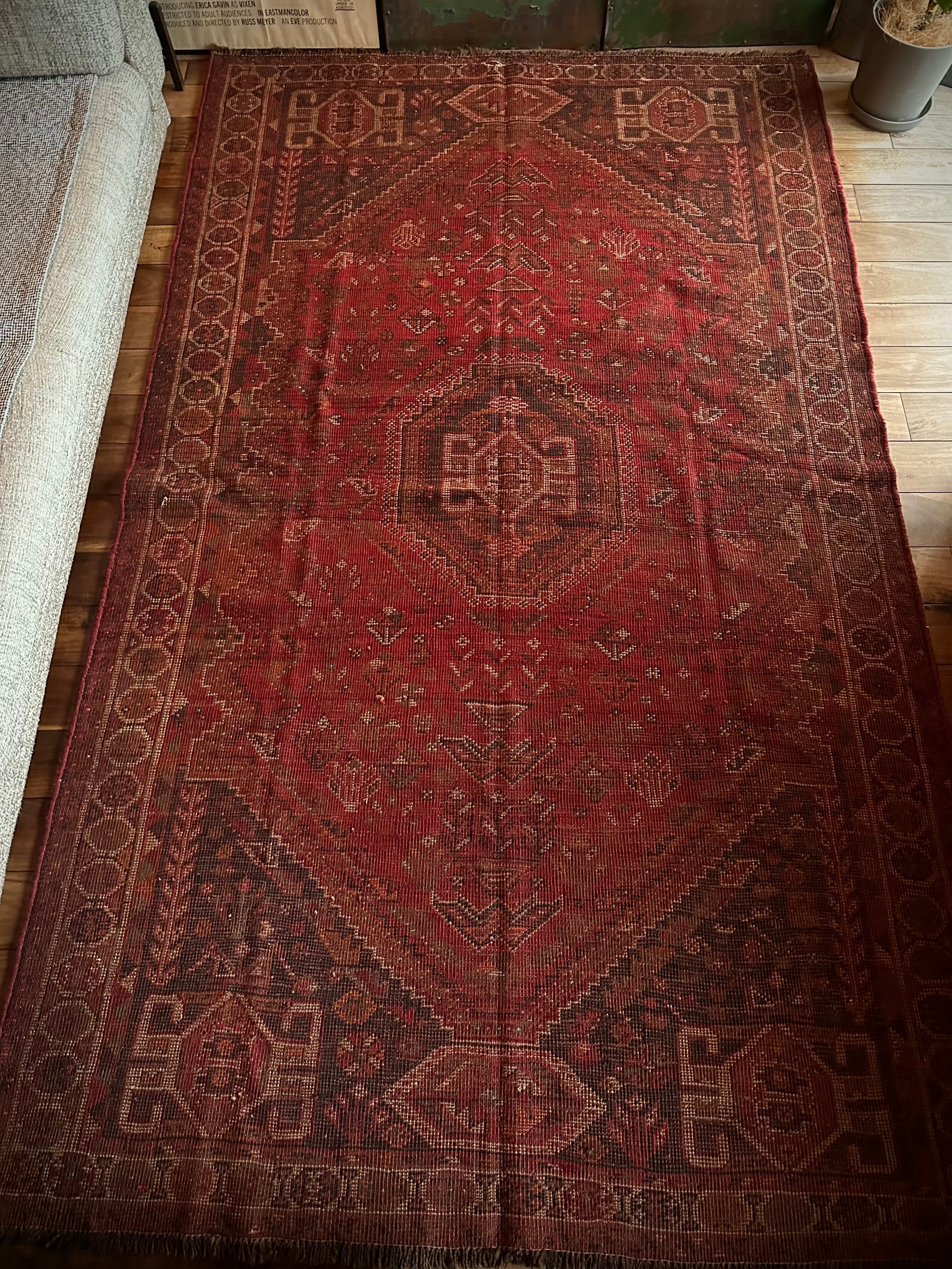 深みのあるバーガンディにメダリオンがあしらわれたお馴染みのスタイルで、ネイビーとの対比がかっこ良く男前な部屋でも様になるでしょうか。自宅で撮影するには限界を感じるほどの大判サイズで、オールドラグにしてはフサフサしたパイルの状態に驚きが隠せません。