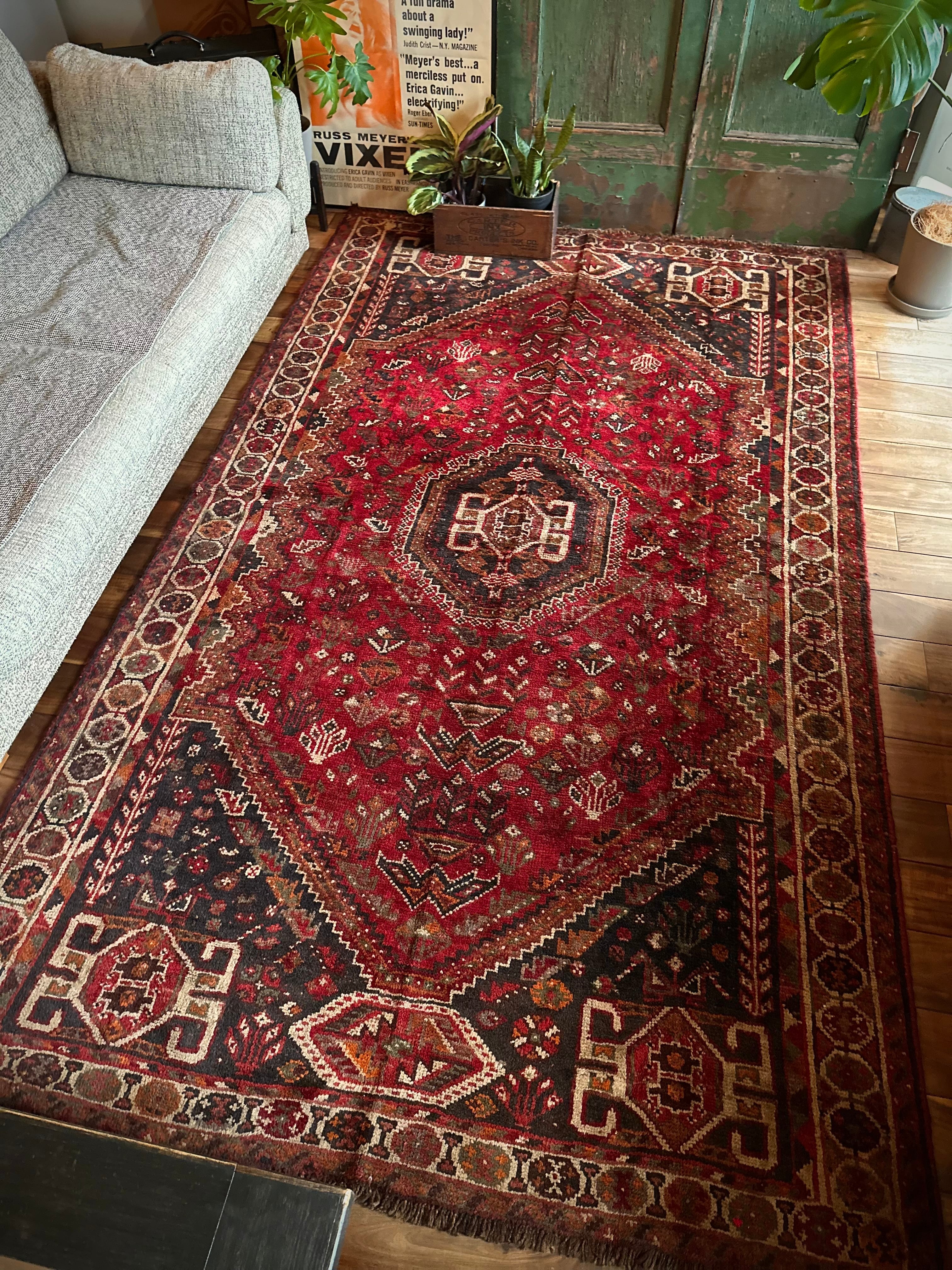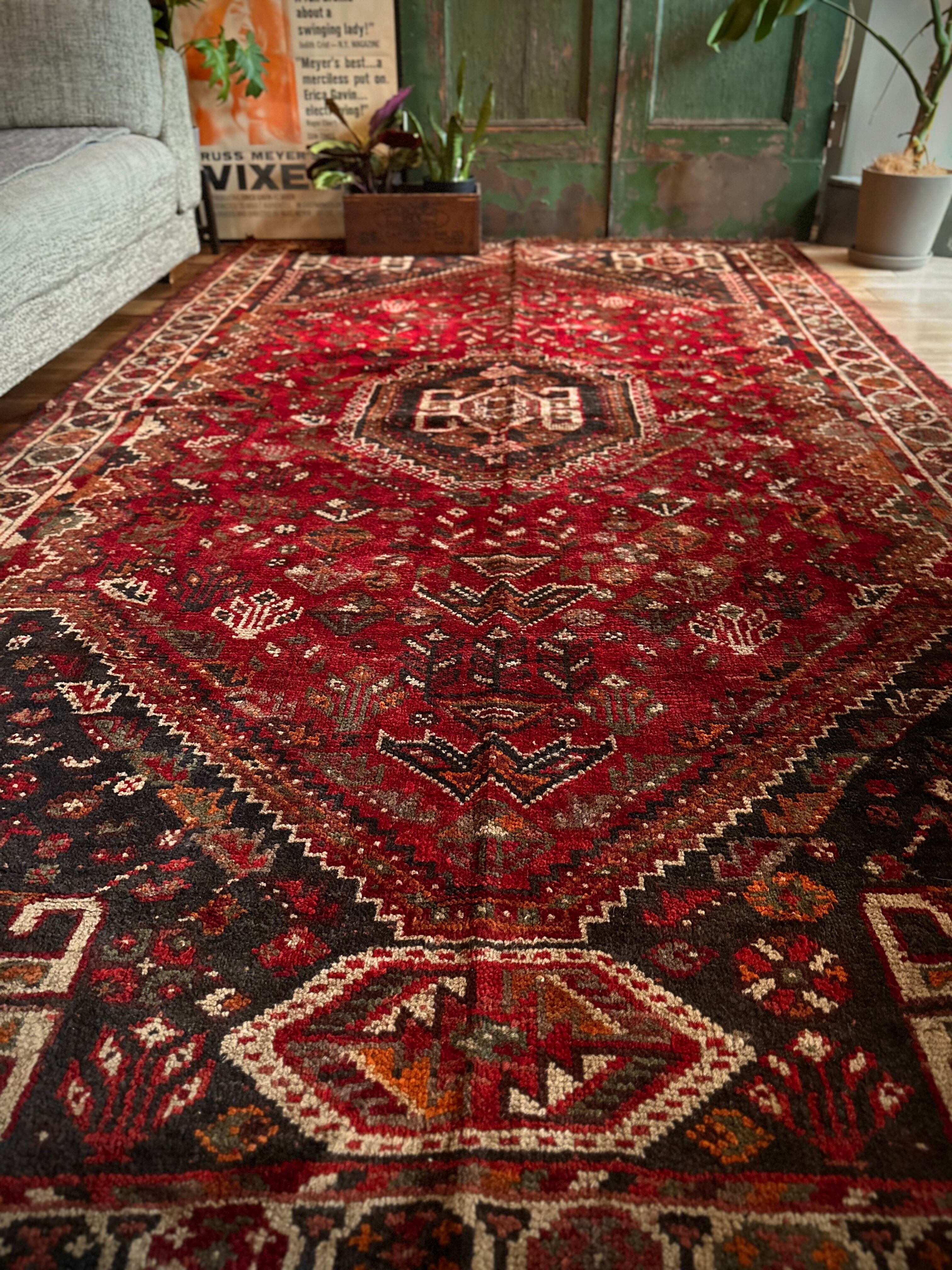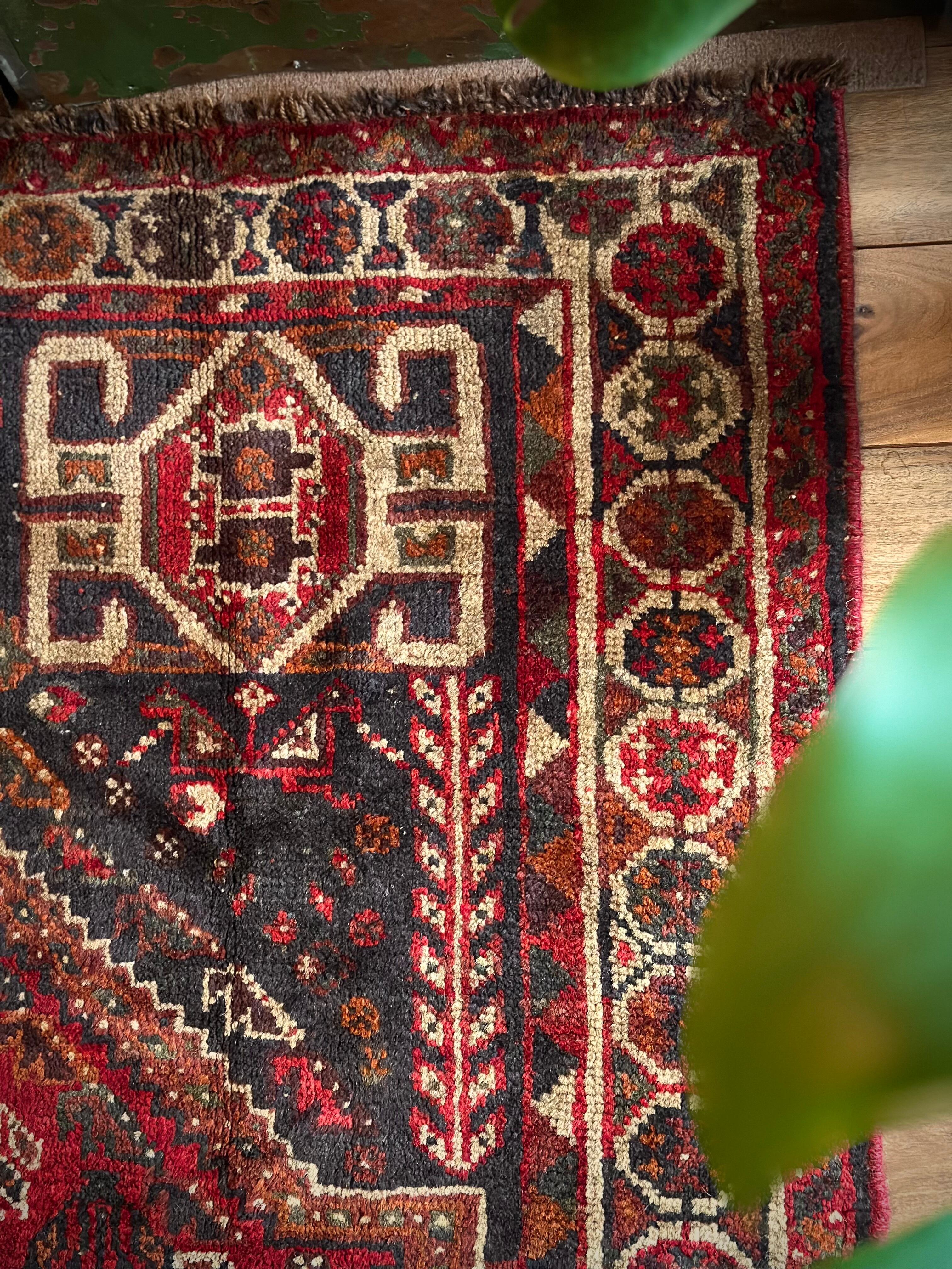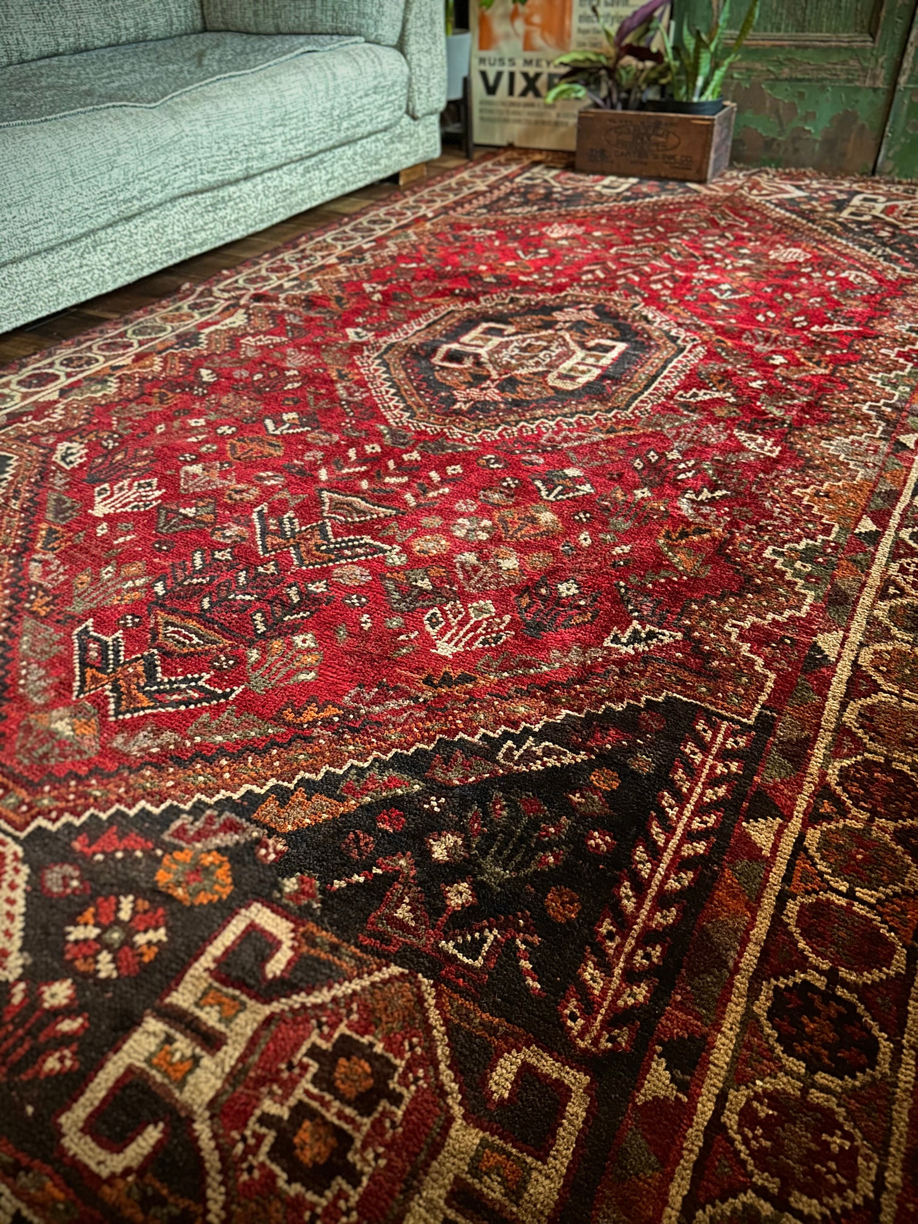 深みのあるバーガンディにメダリオンがあしらわれたお馴染みのスタイルで、ネイビーとの対比がかっこ良く男前な部屋でも様になるでしょうか。自宅で撮影するには限界を感じるほどの大判サイズで、オールドラグにしてはフサフサしたパイルの状態に驚きが隠せません。