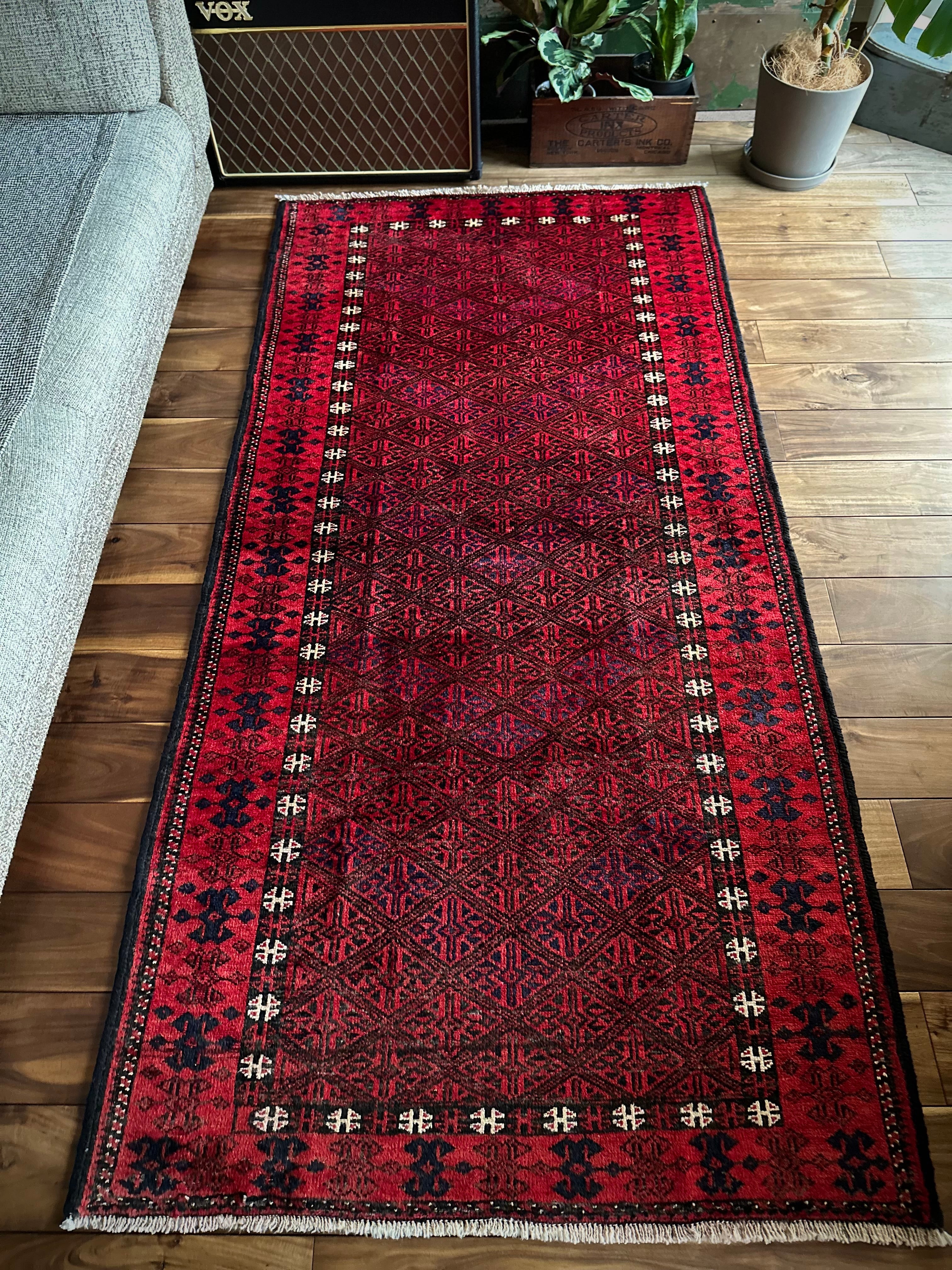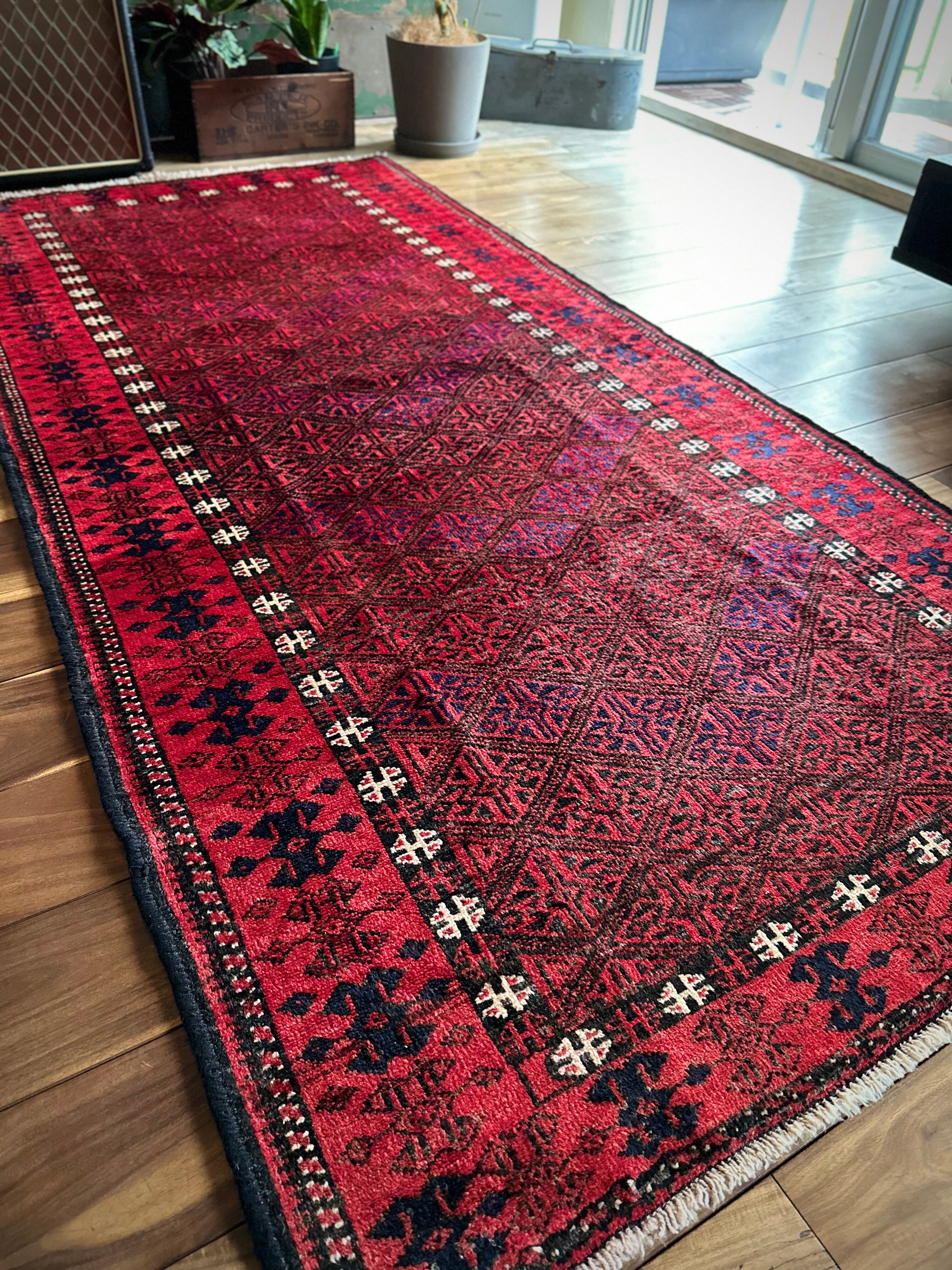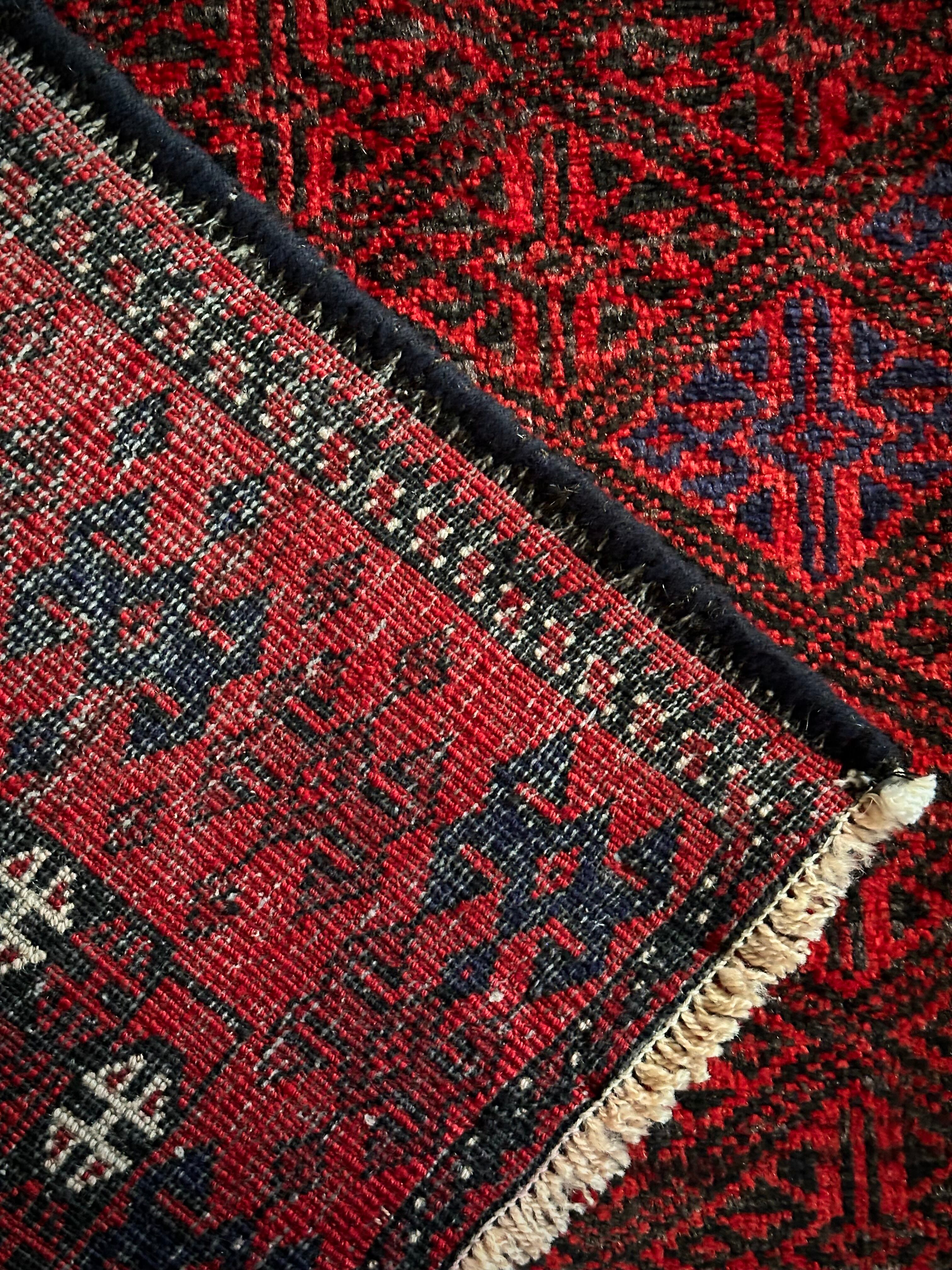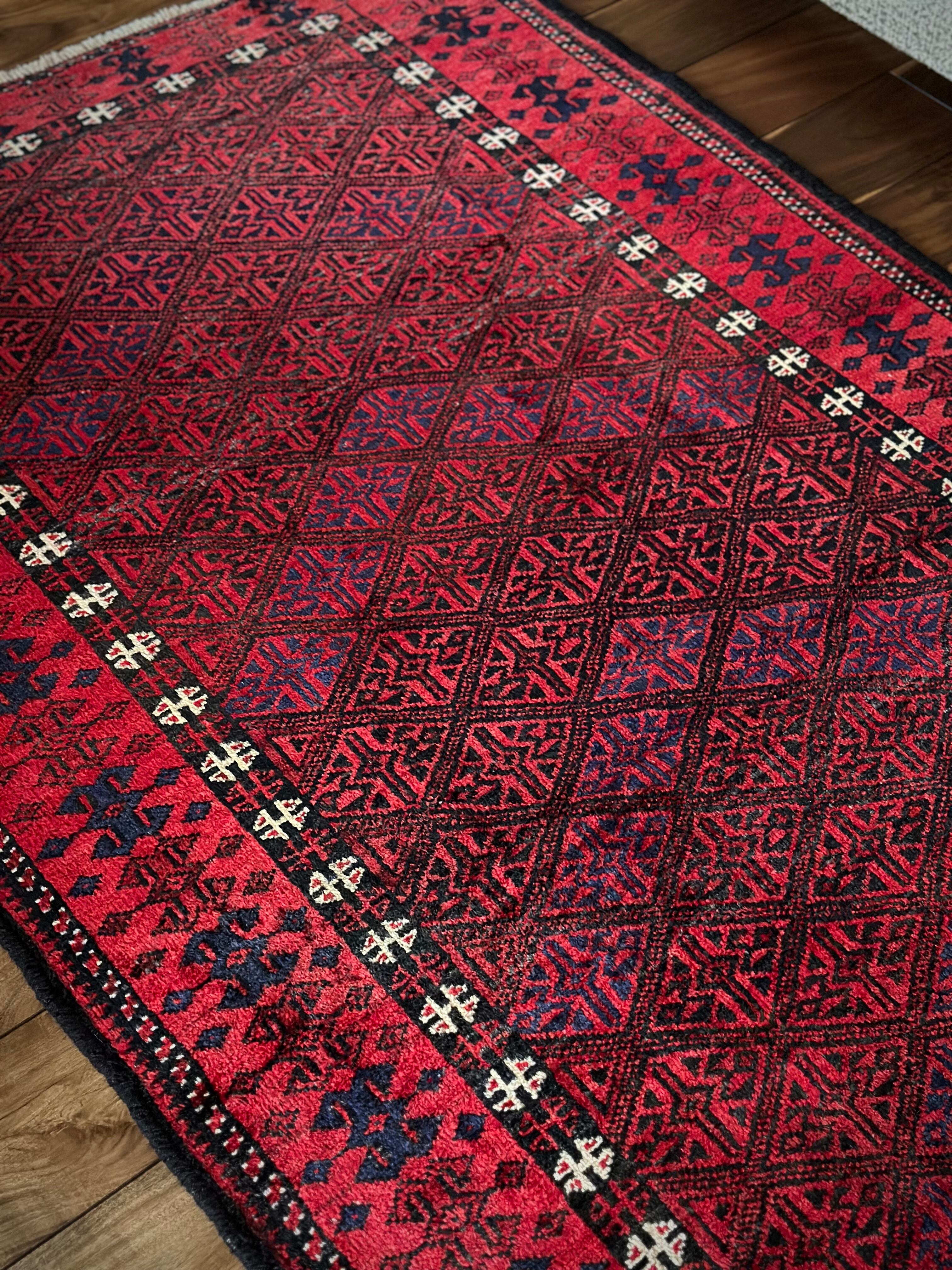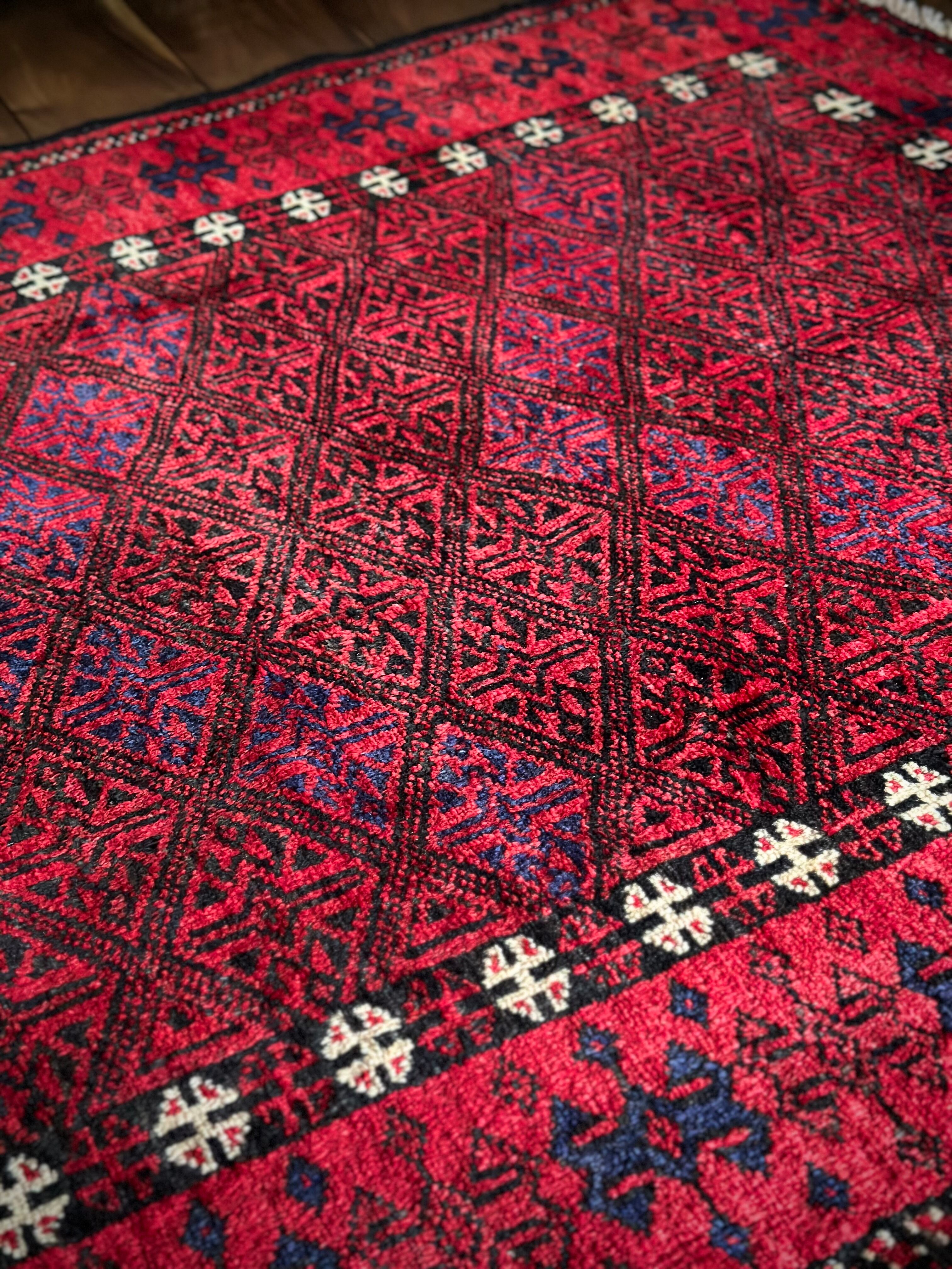 ブラック&レッドの見た目に細かな連続紋様が素晴らしくてかっこいい、イラン東部のアフガニスタンからパキスタン国境付近に暮らすバルーチ族のトライバルラグになります。