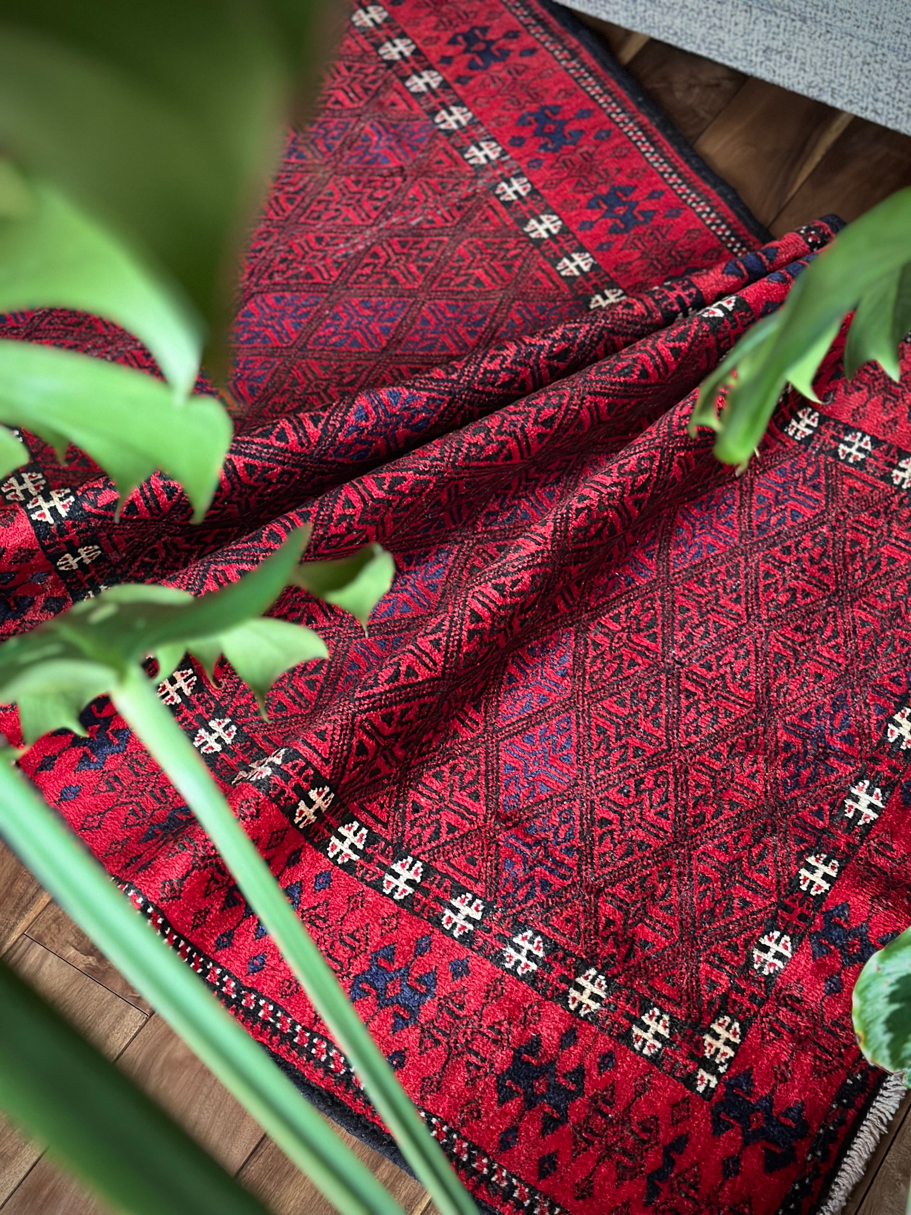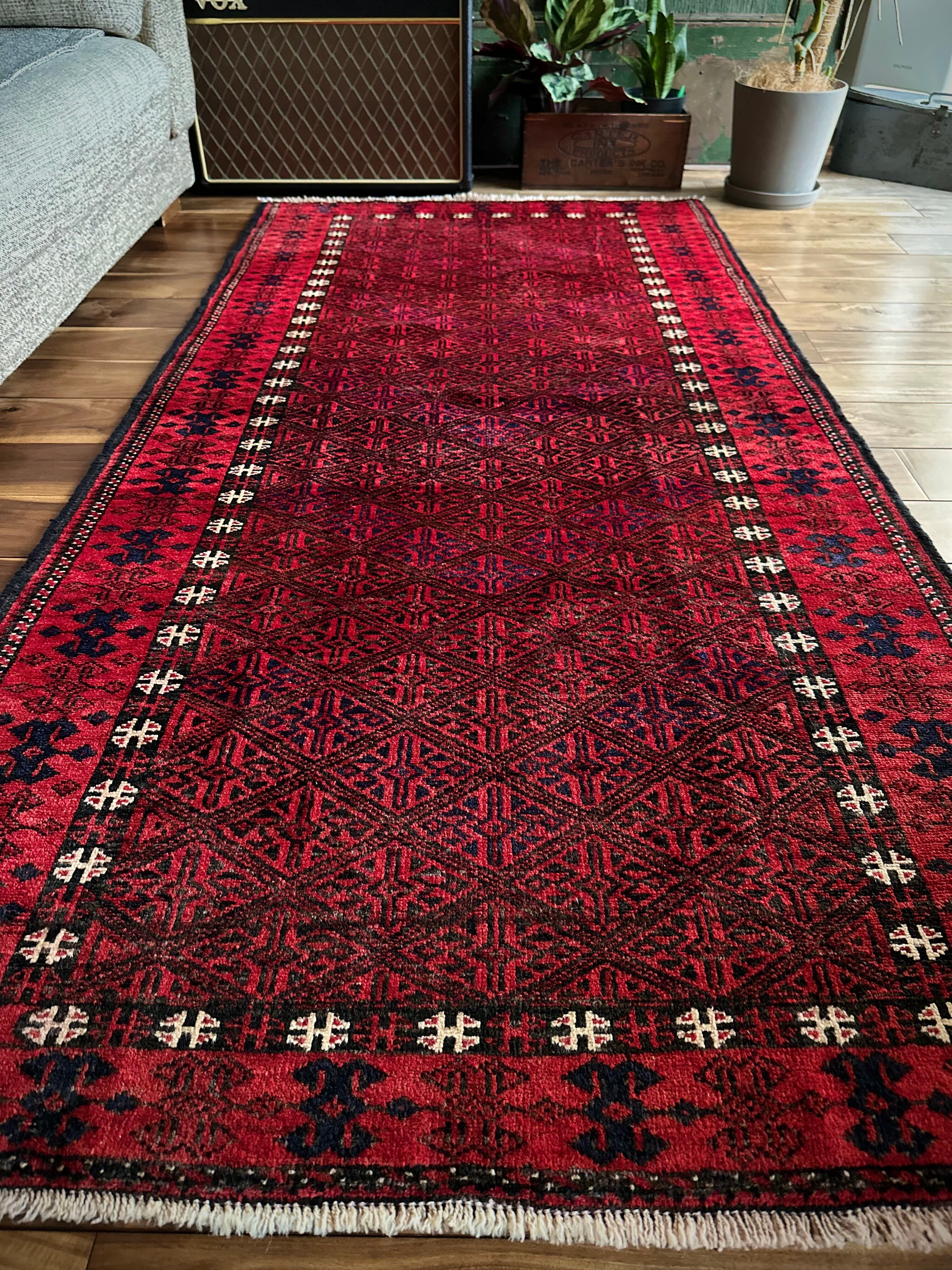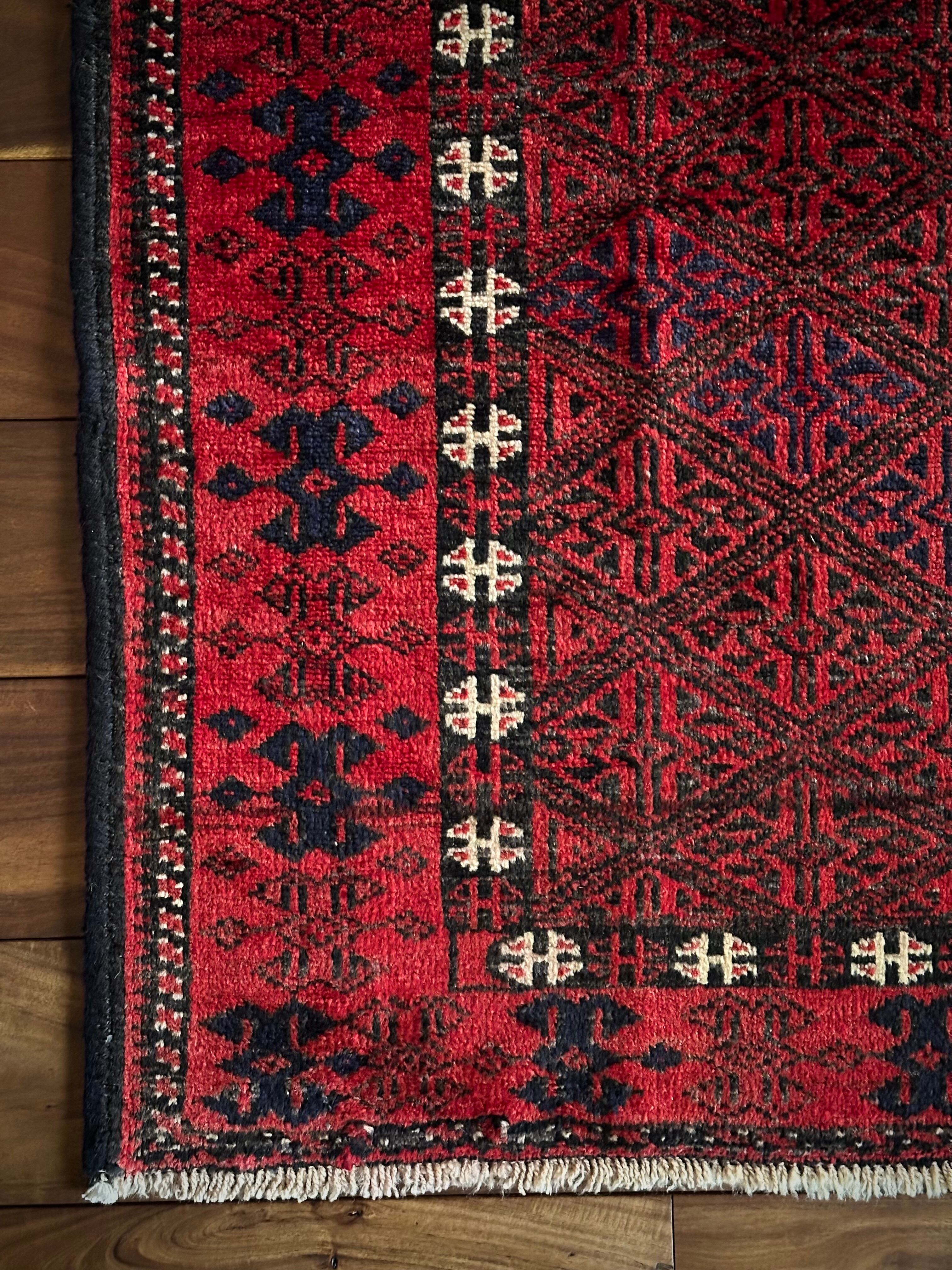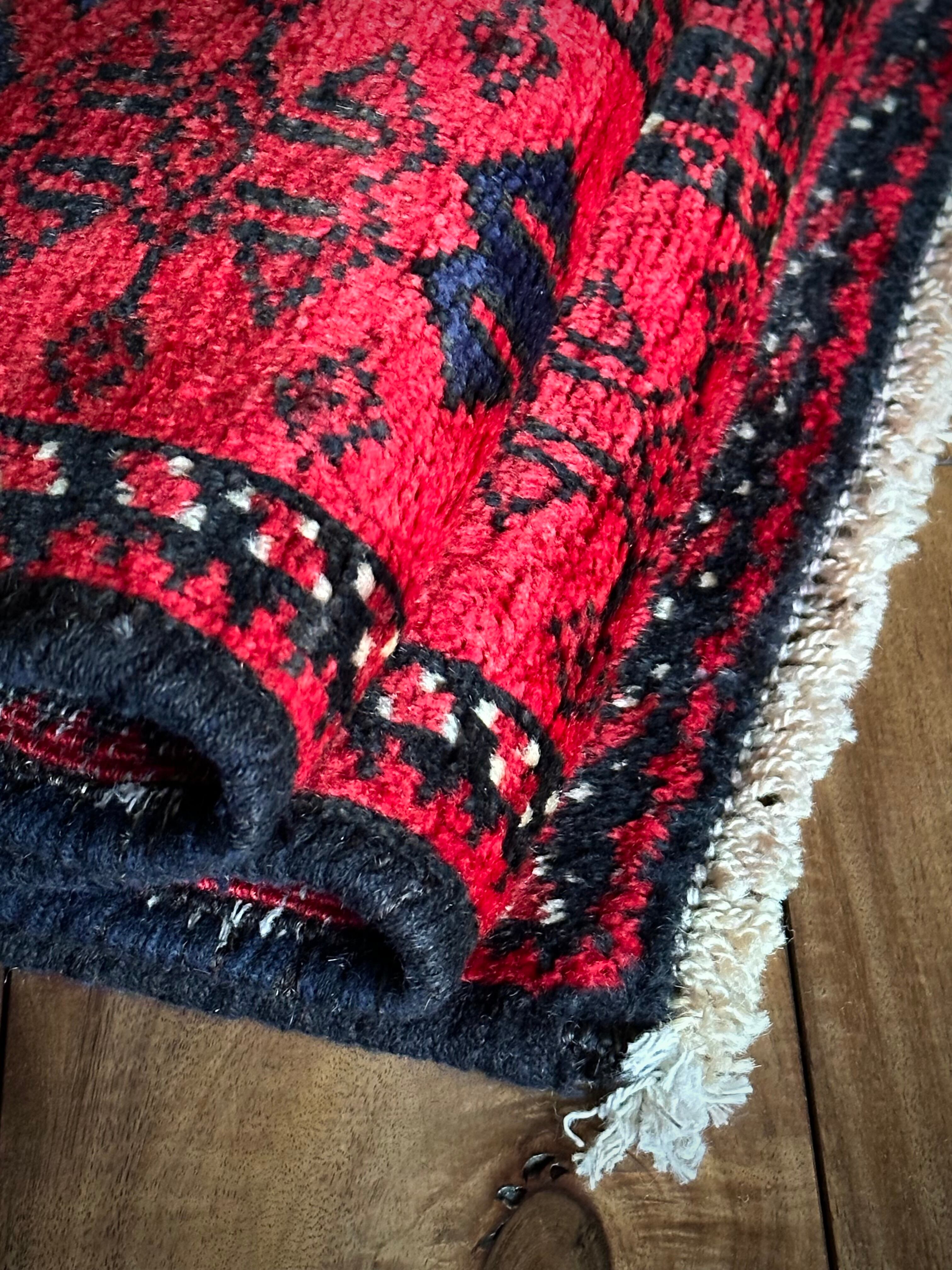 ブラック&レッドの見た目に細かな連続紋様が素晴らしくてかっこいい、イラン東部のアフガニスタンからパキスタン国境付近に暮らすバルーチ族のトライバルラグになります。