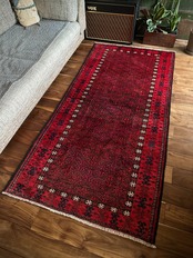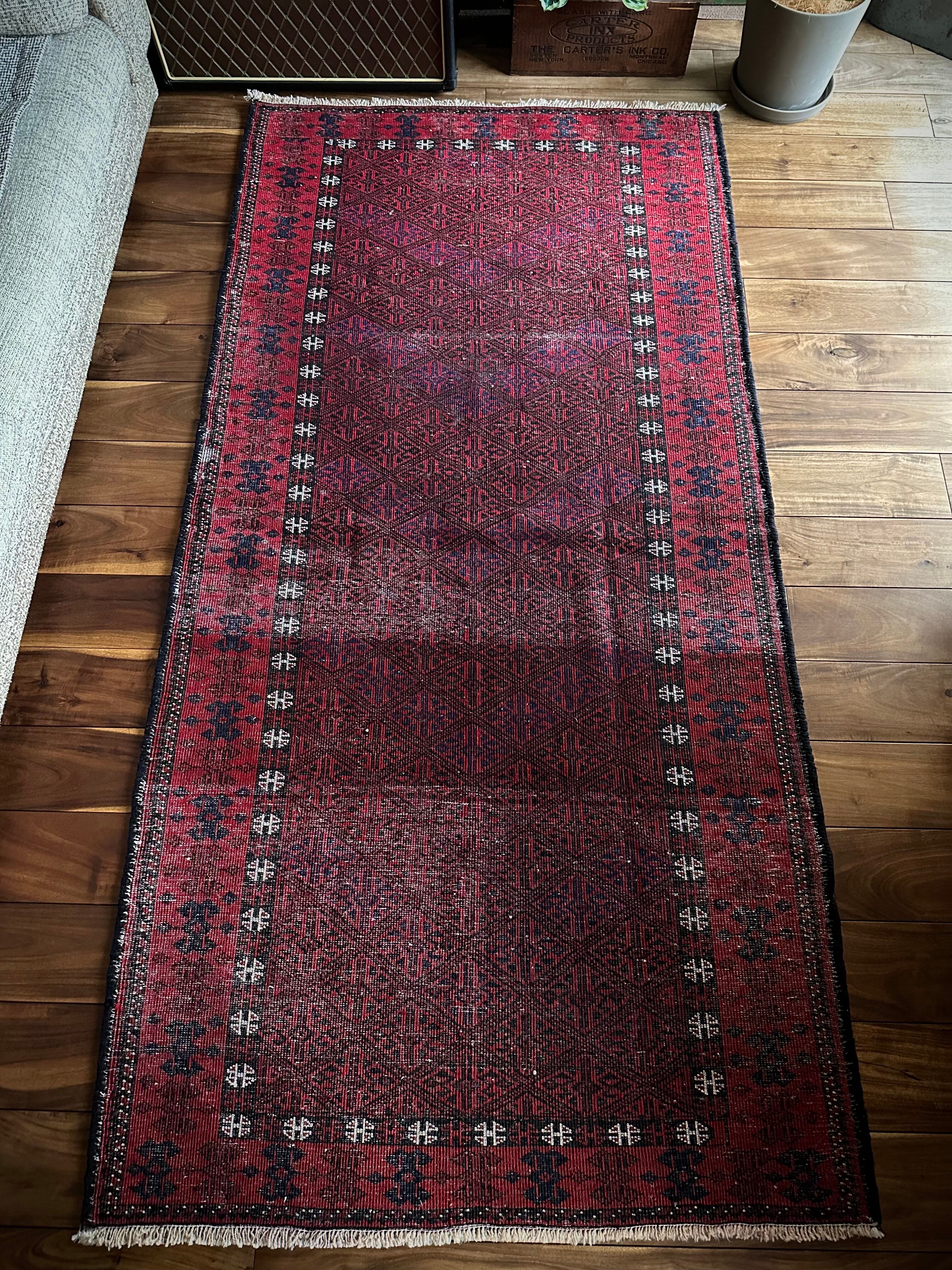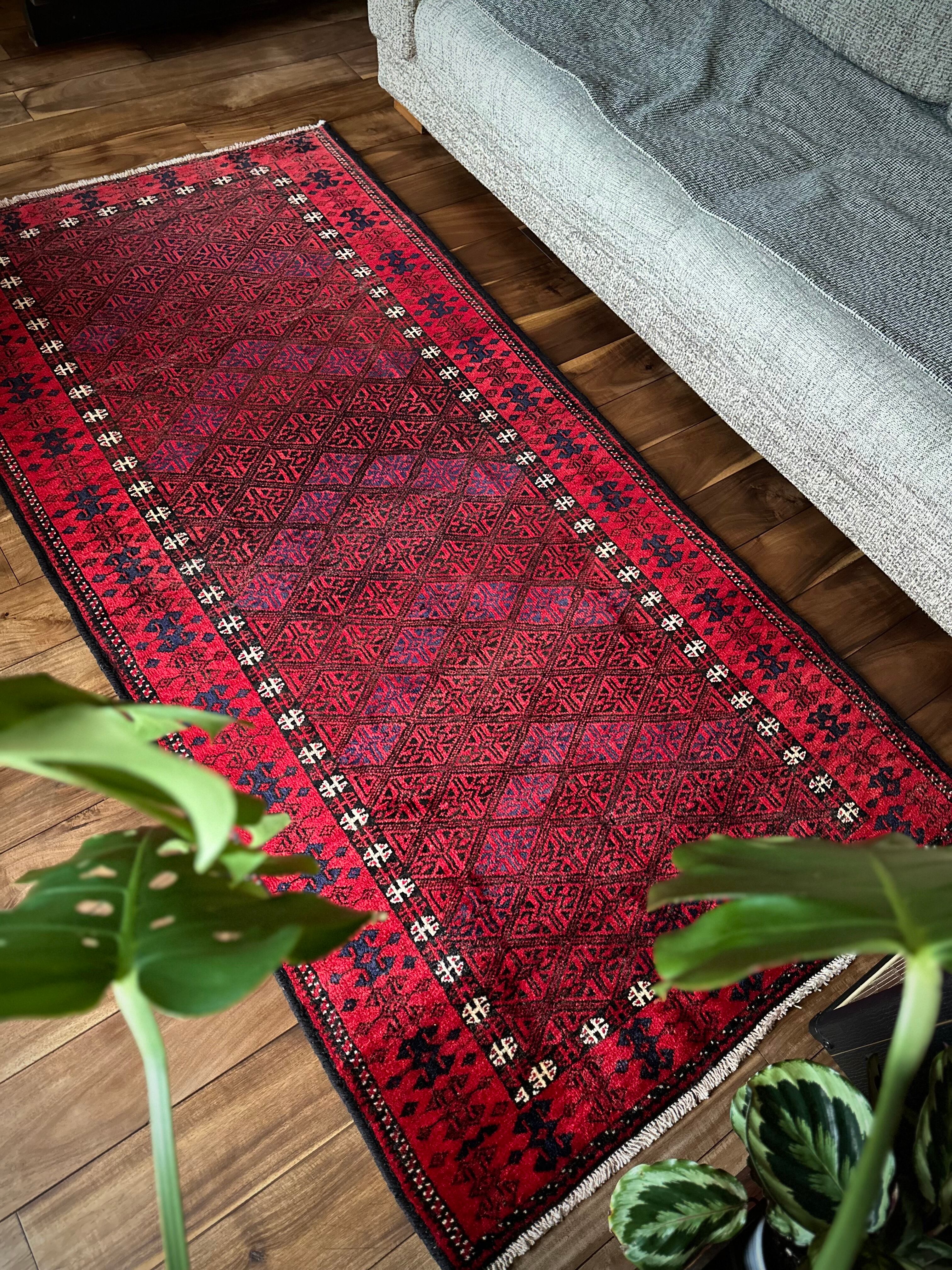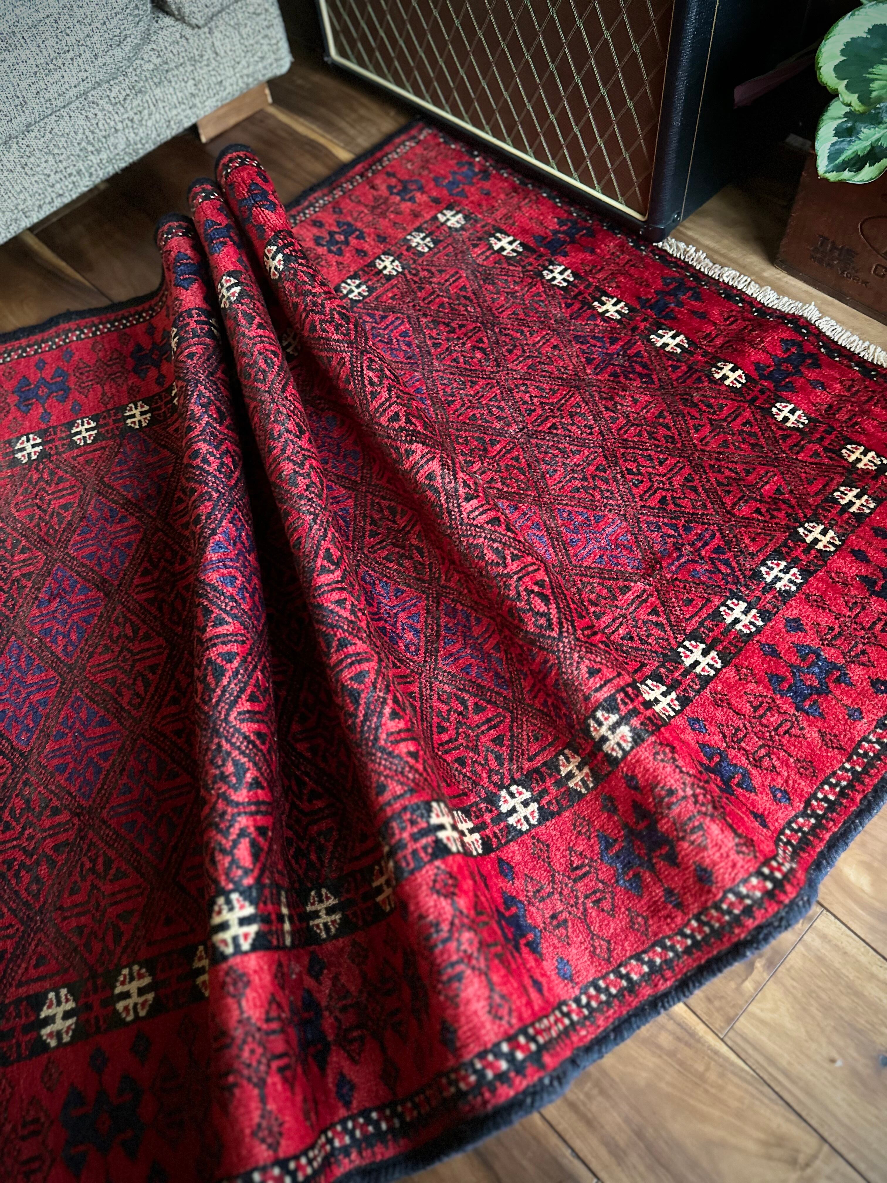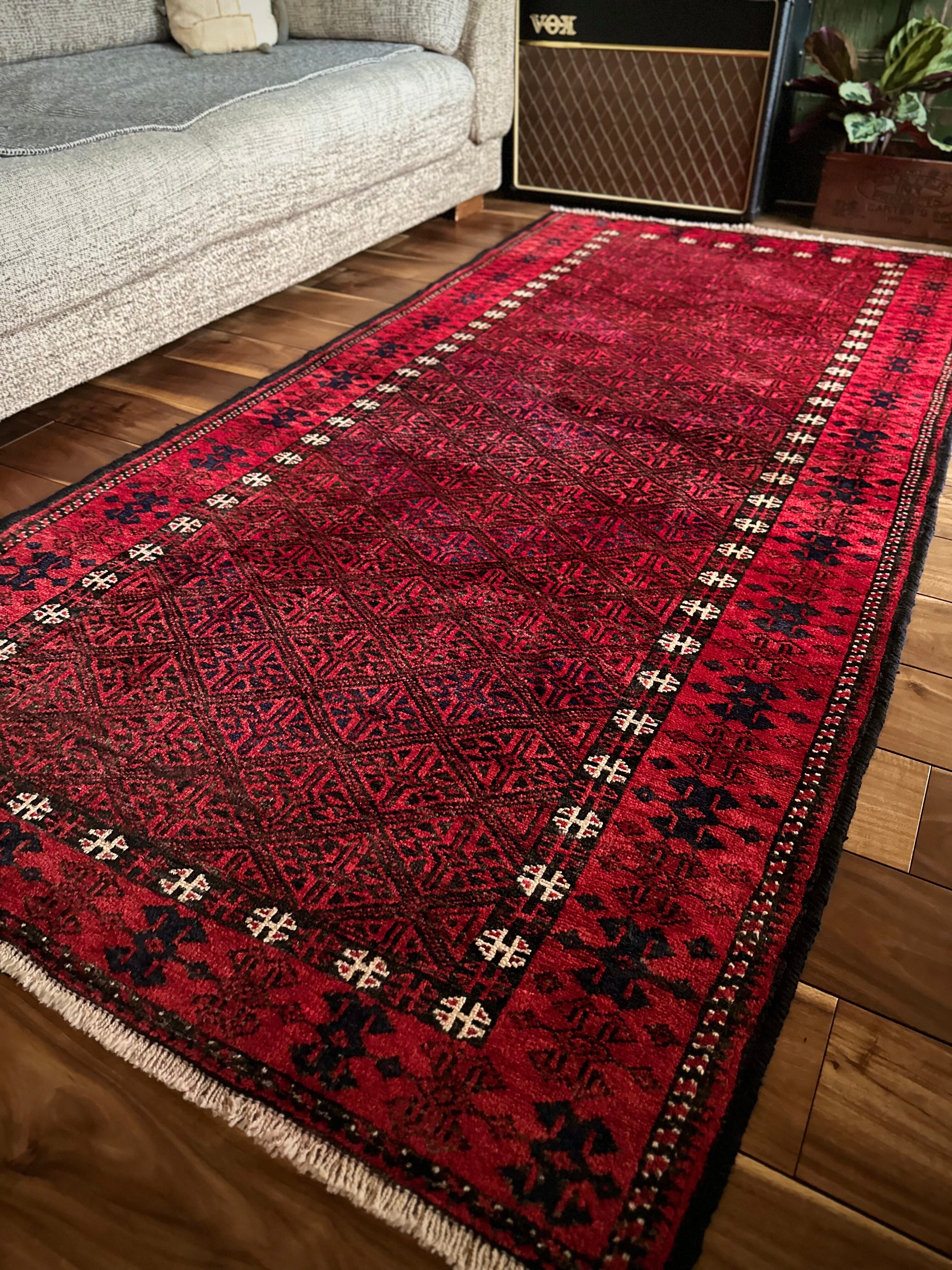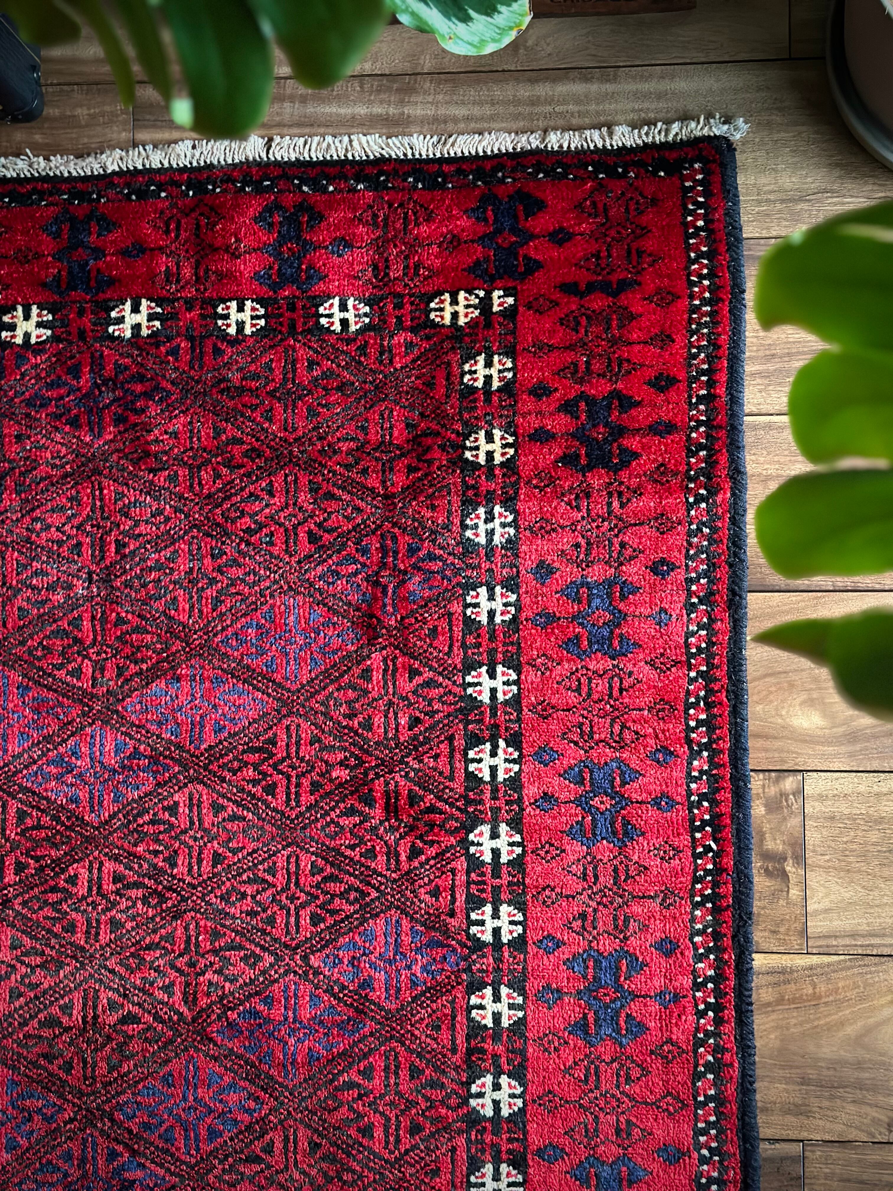 ブラック&レッドの見た目に細かな連続紋様が素晴らしくてかっこいい、イラン東部のアフガニスタンからパキスタン国境付近に暮らすバルーチ族のトライバルラグになります。