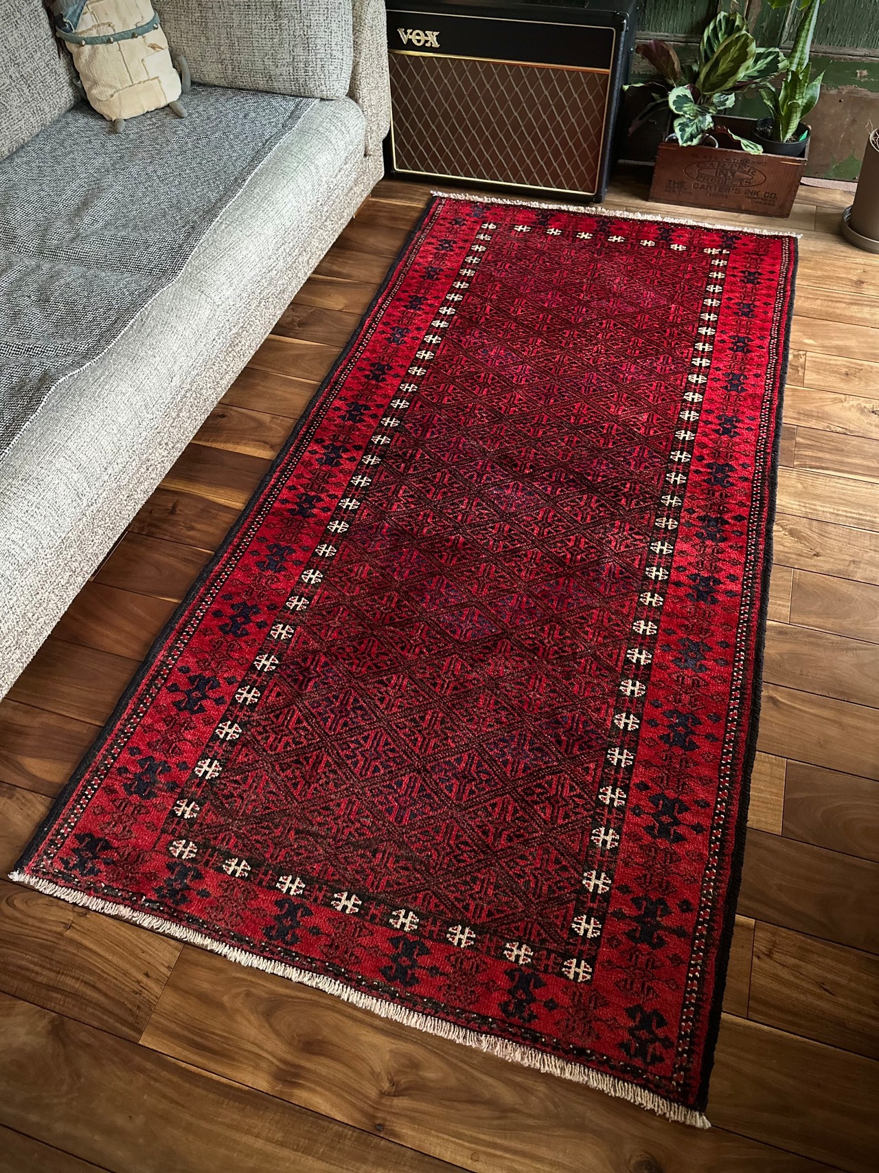 最後にラグそのものに関しては羊毛特有の匂いがあり、採寸は中央付近で計測していますが、手織りならではの歪みによる誤差や水洗いクリーニングによる縮み、また草木染めによる経年劣化の色ムラなどがありますが、それもまたヴィンテージラグの魅力かとご理解ください。