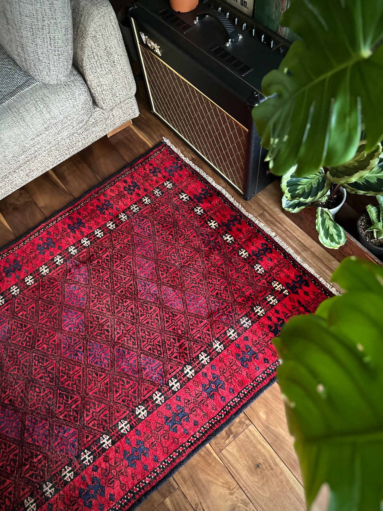 取り分けイラン第2の都市マシュハド産らしいバルーチラグですが、光の加減でよく見るとVの字に黒からネイビーへと等間隔にコントラストが描かれているのがお分かりでしょうか。片側からはブラック一色に見えますが、もう片側からは色の違いがよく分かる手の込んだデザインに脱帽してしまいます。