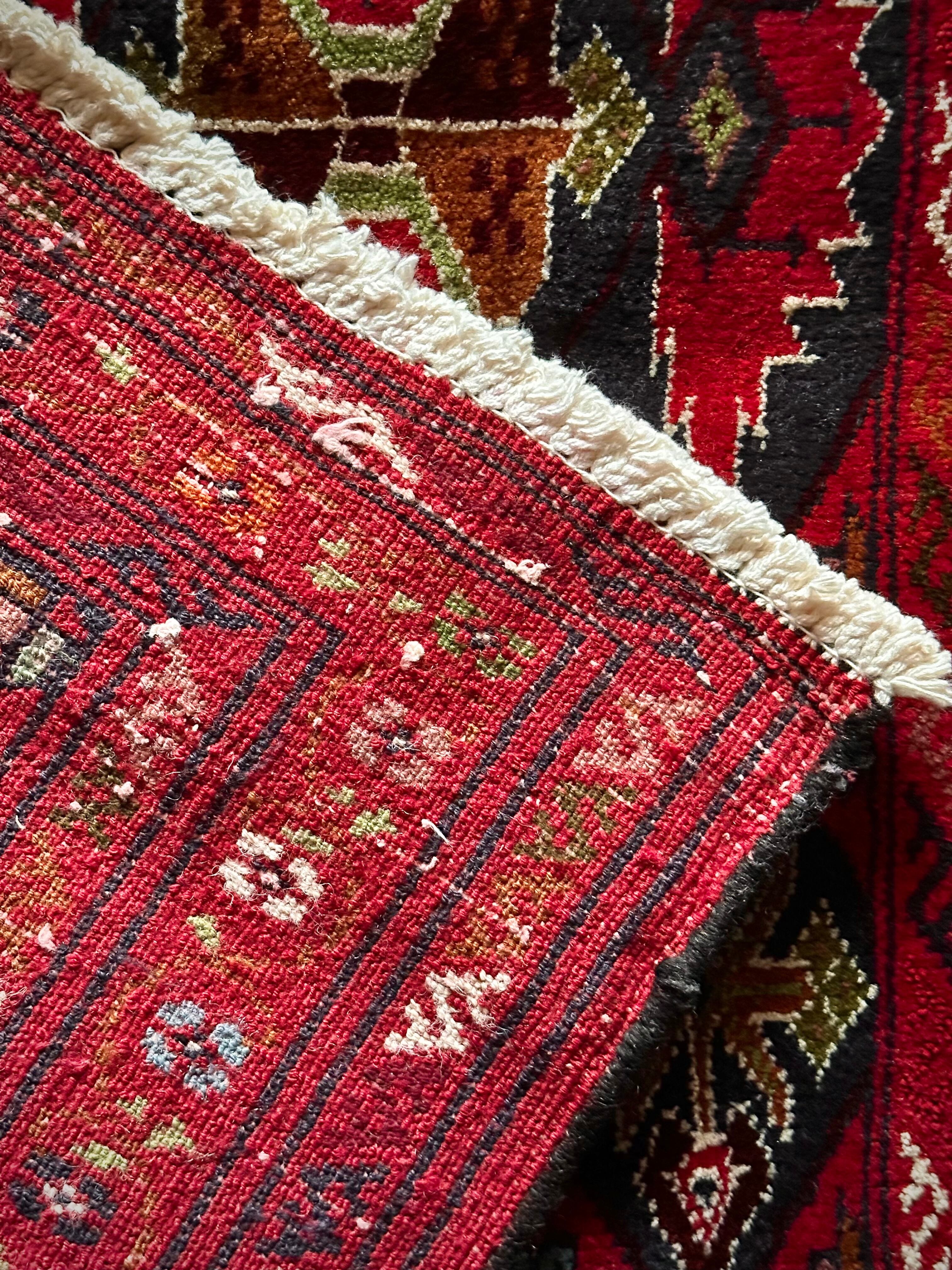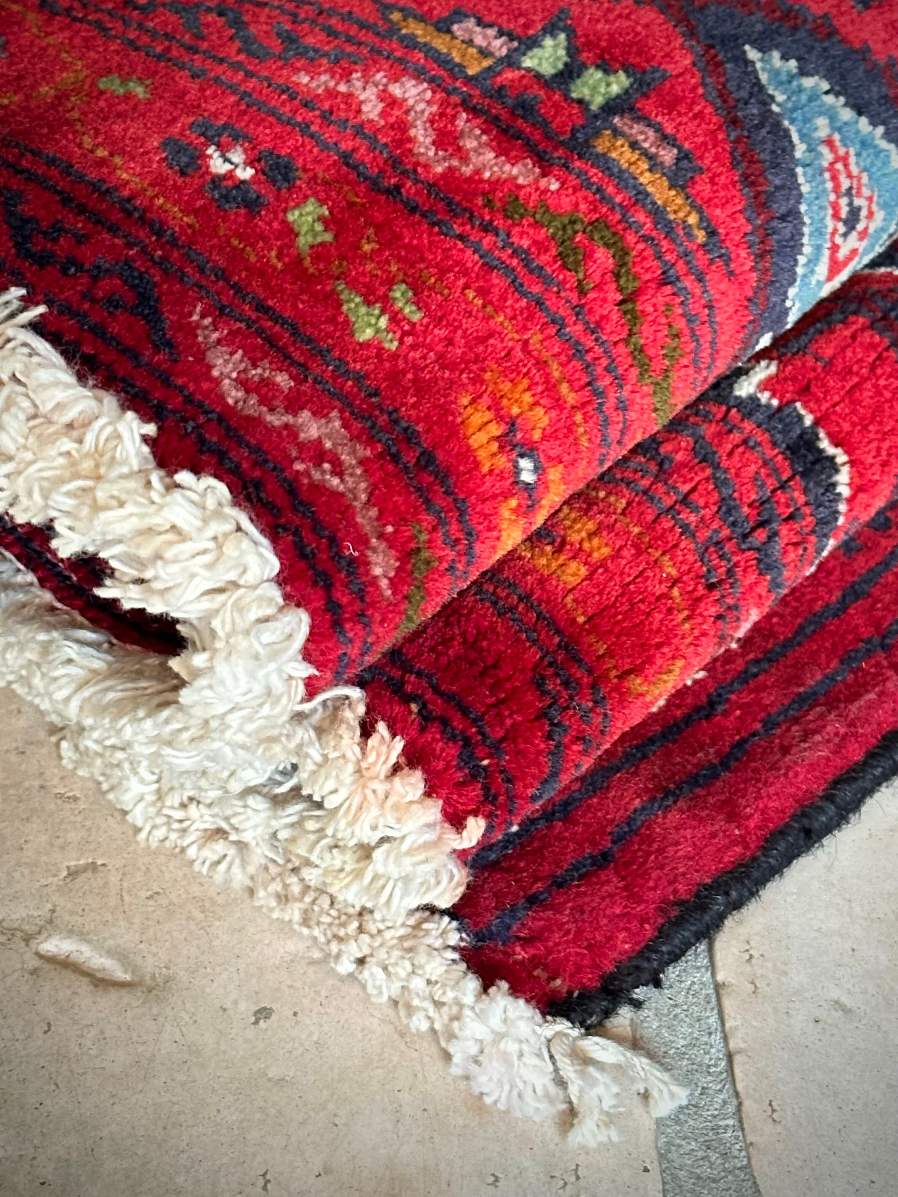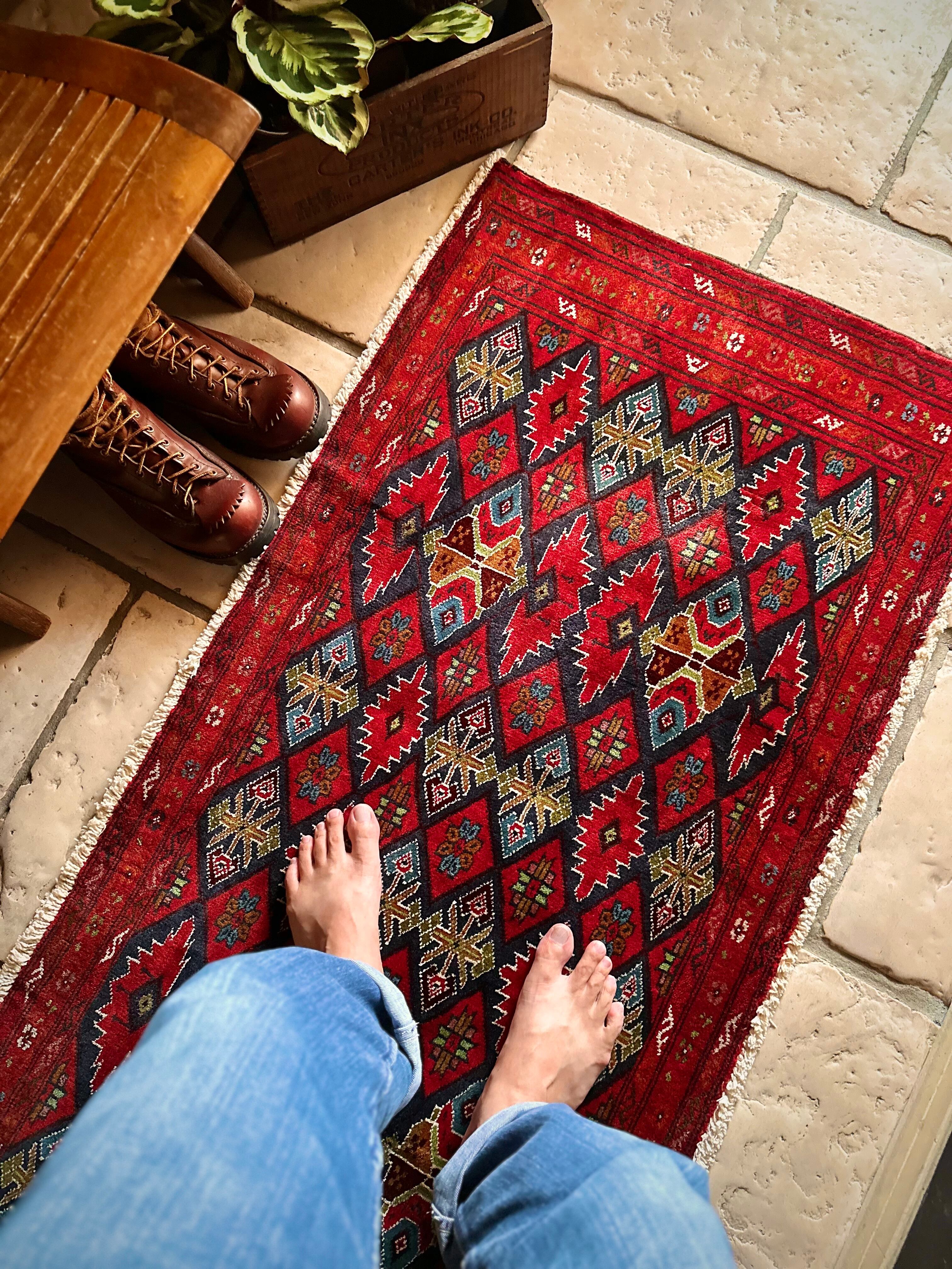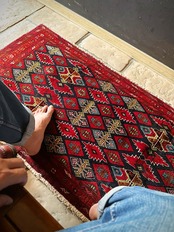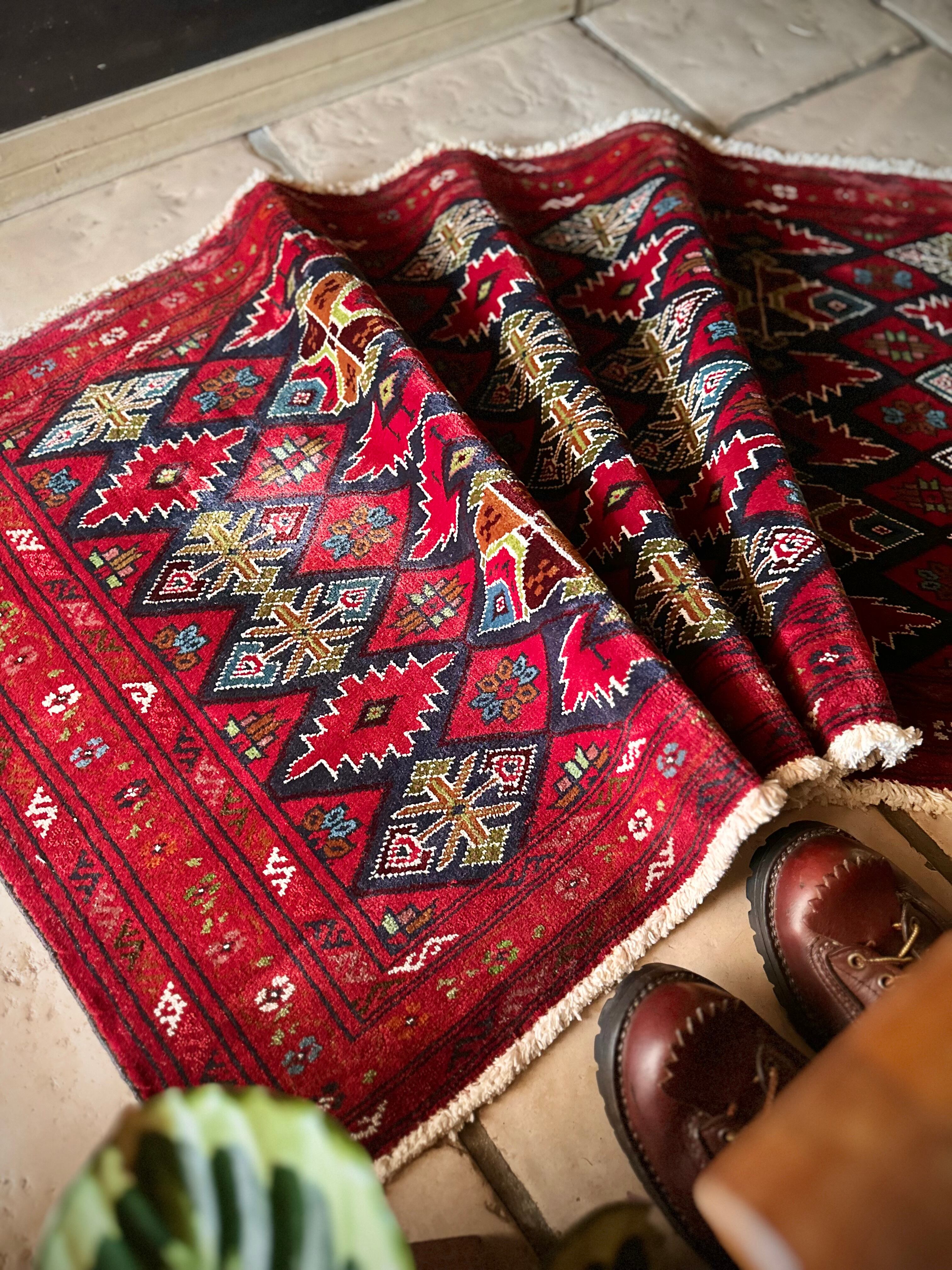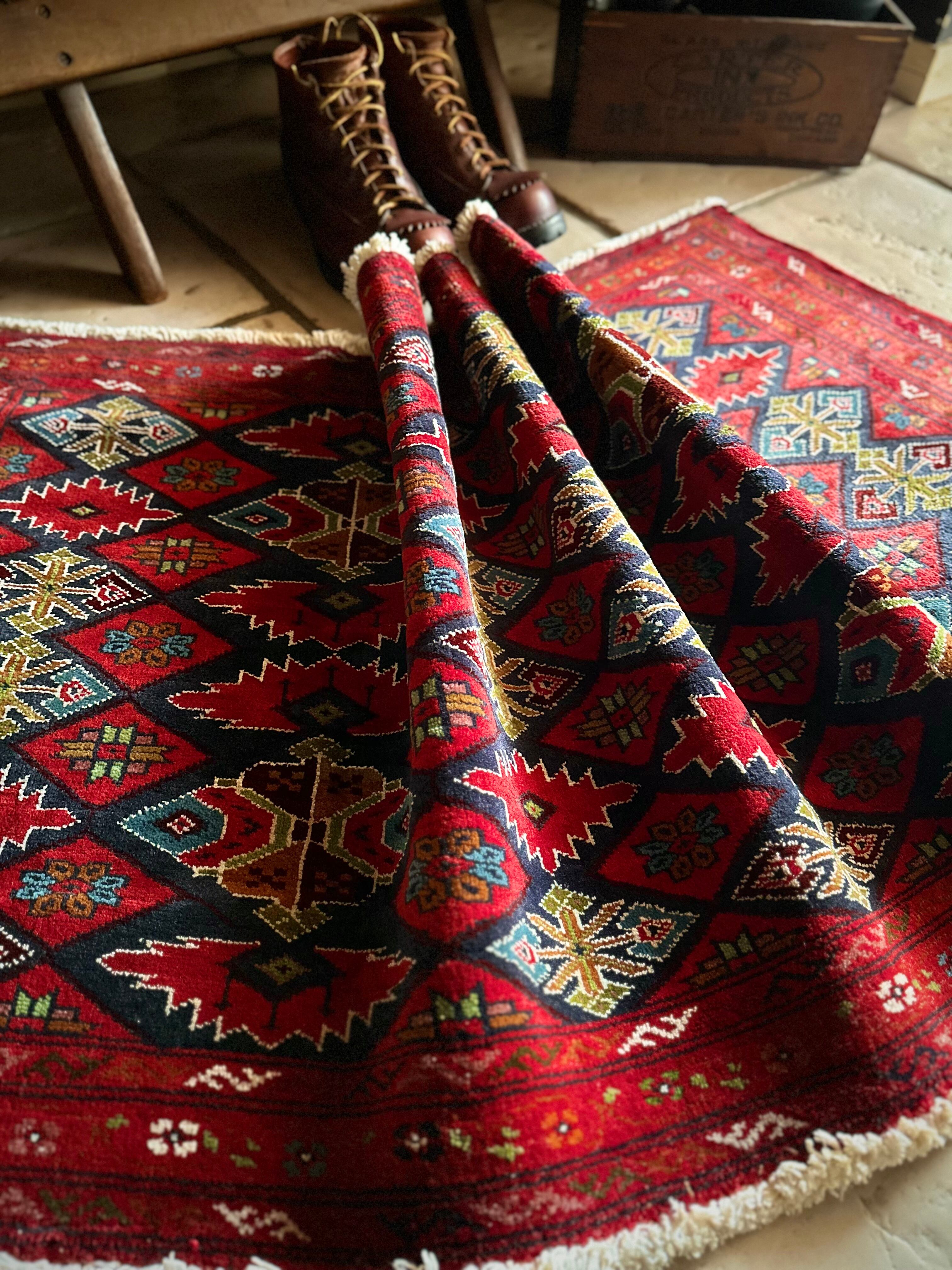 最後にラグそのものに関しては羊毛特有の匂いがあり、採寸は中央付近で計測していますが、手織りならではの歪みによる誤差や水洗いクリーニングによる縮み、また草木染めによる経年劣化の色ムラなどがありますが、それもまたヴィンテージラグの魅力かとご理解ください。