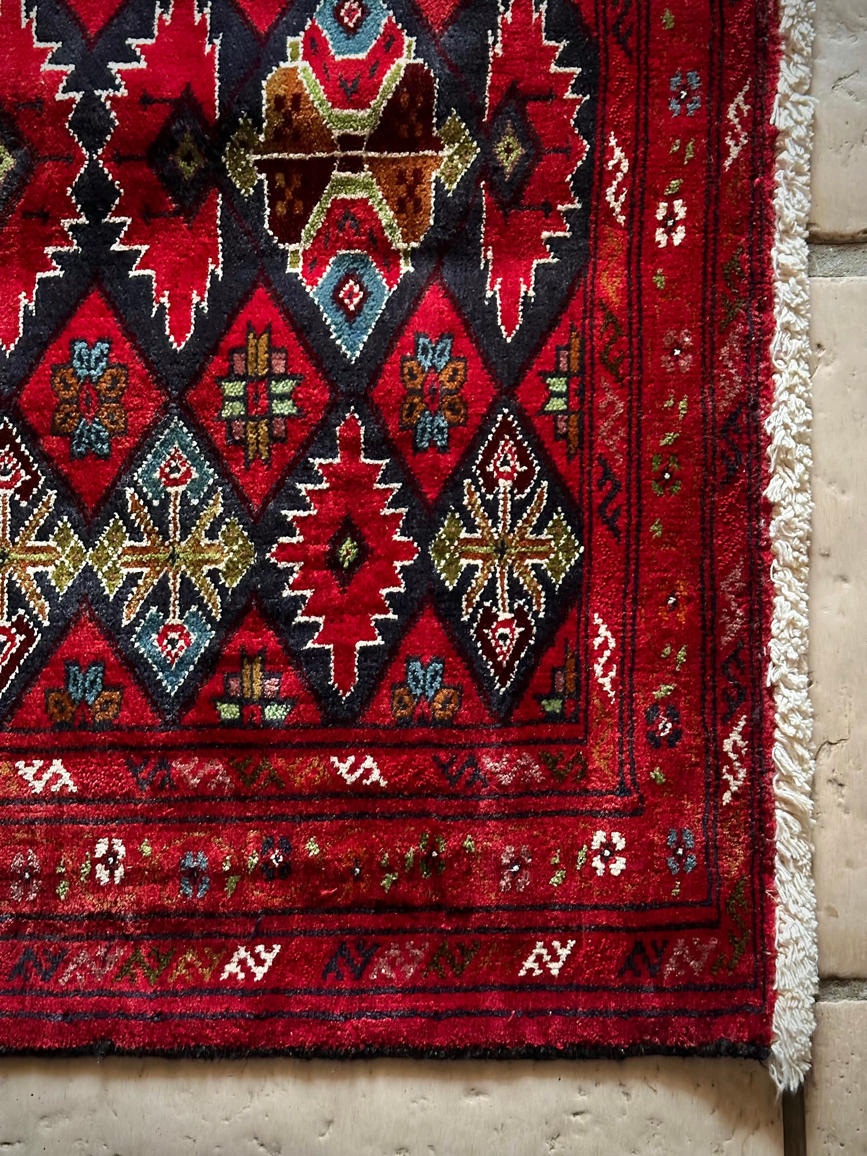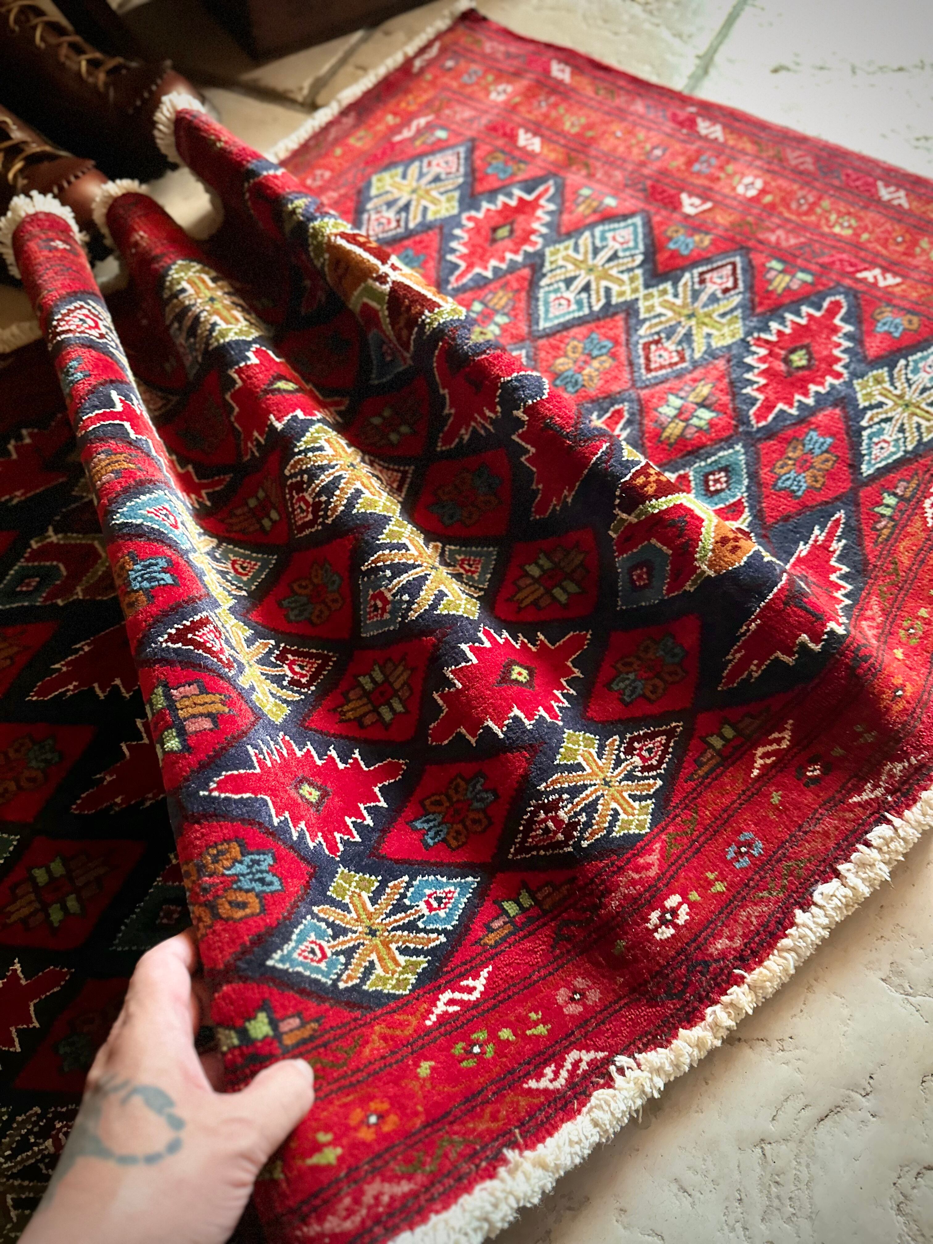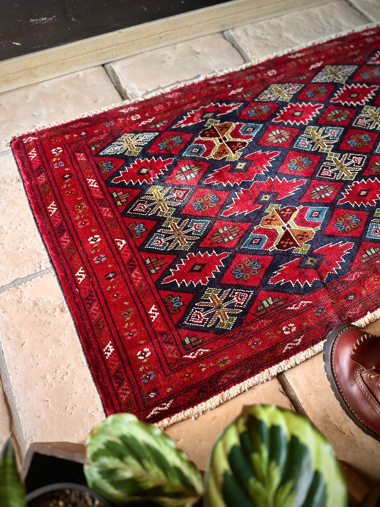 真っ赤な絨毯の代名詞とも言えるトルクメンから、こちらあまり見かける事がないアメリカン・インディアンのような連続紋様がかっこいいトライバルラグで、白の縁取りラインが浮きだって見える渋さが堪りません。