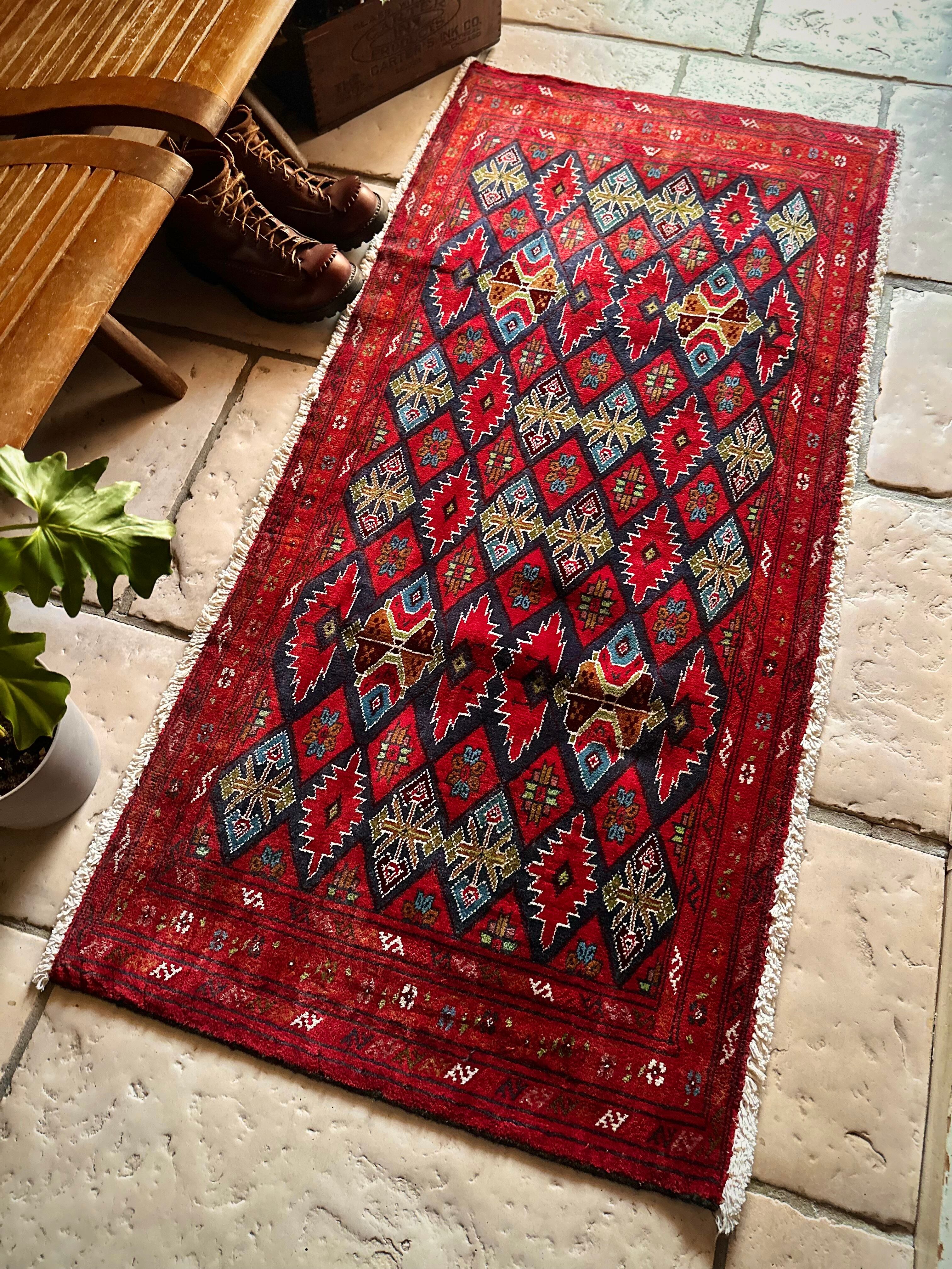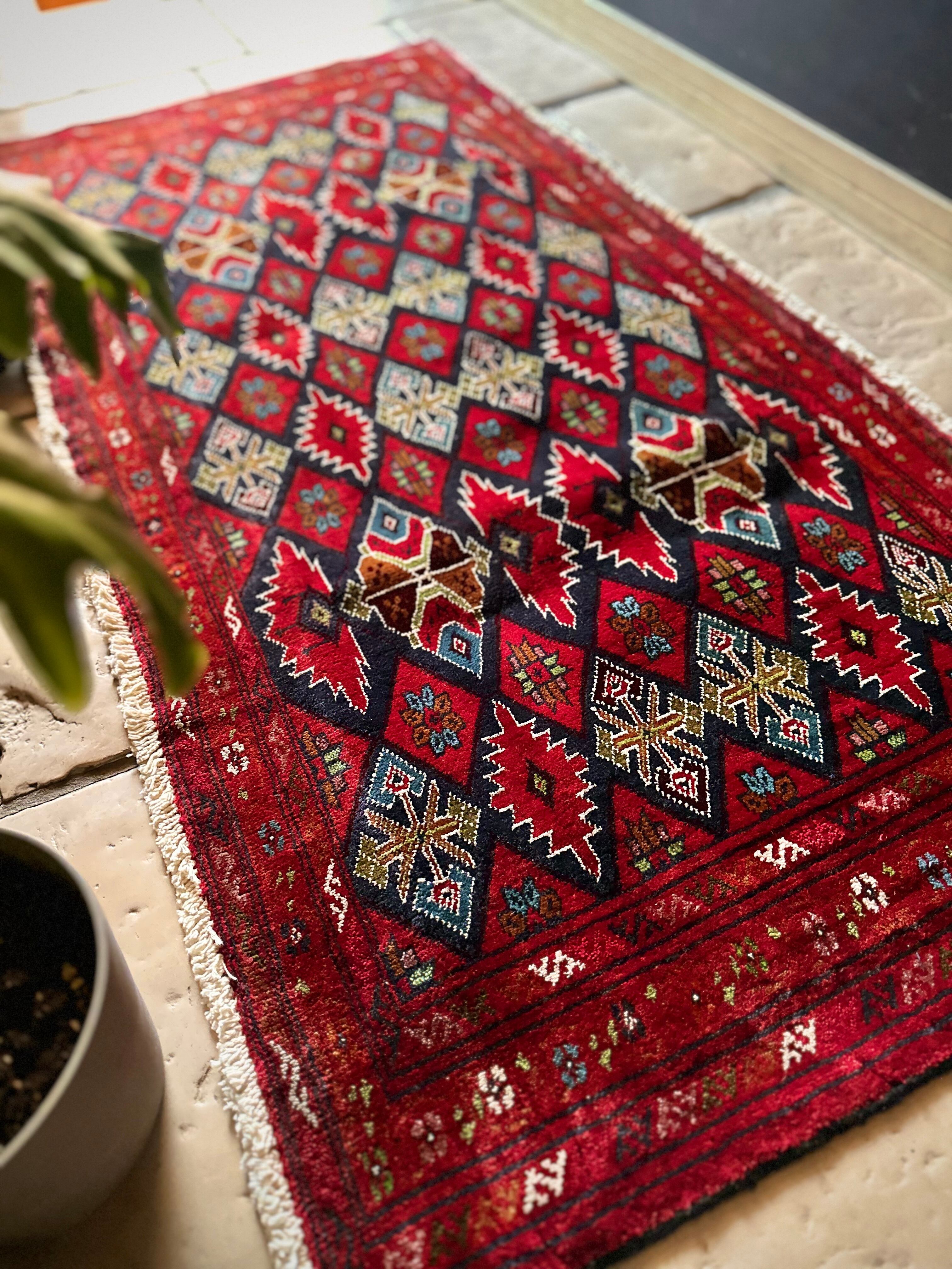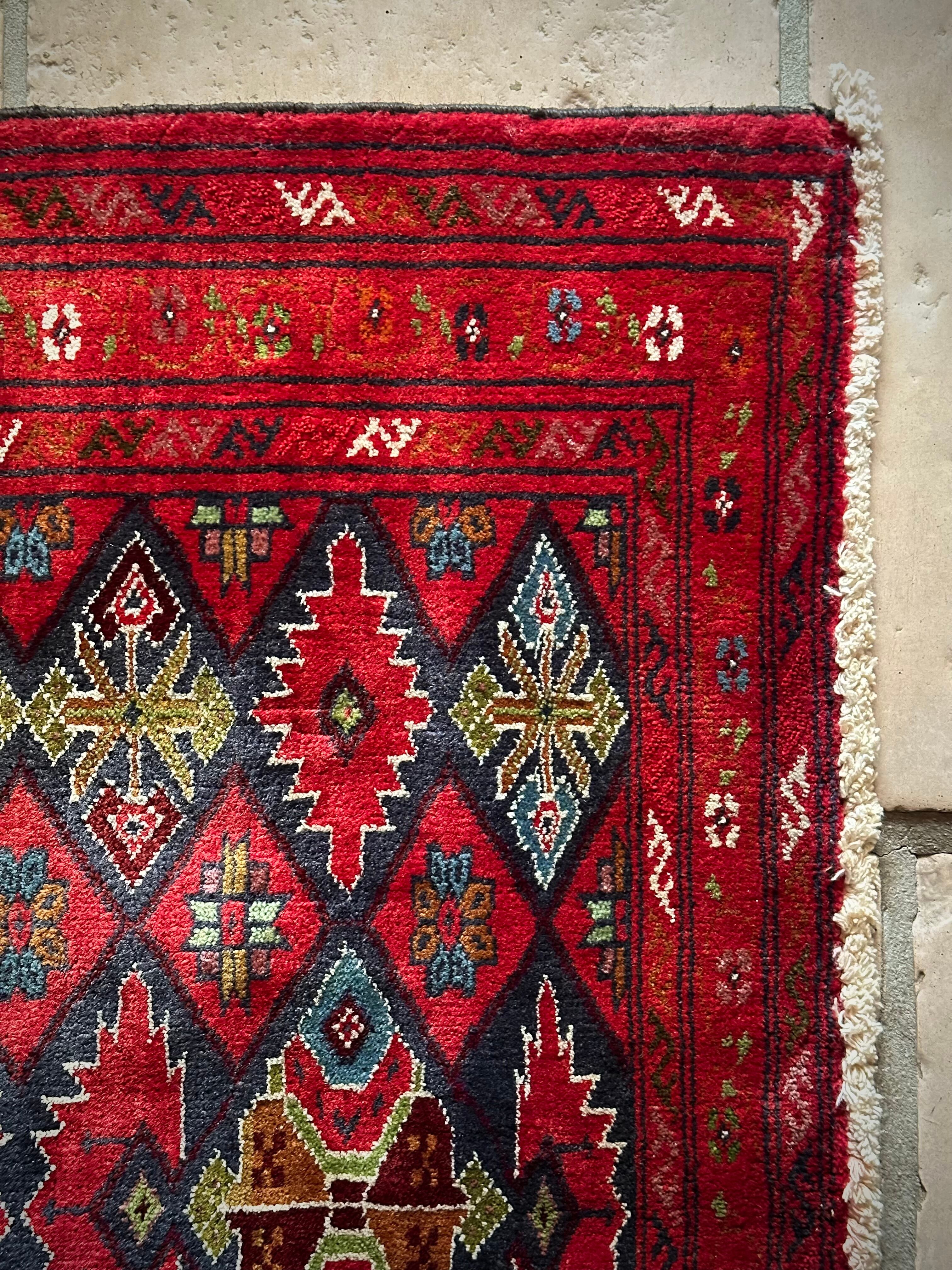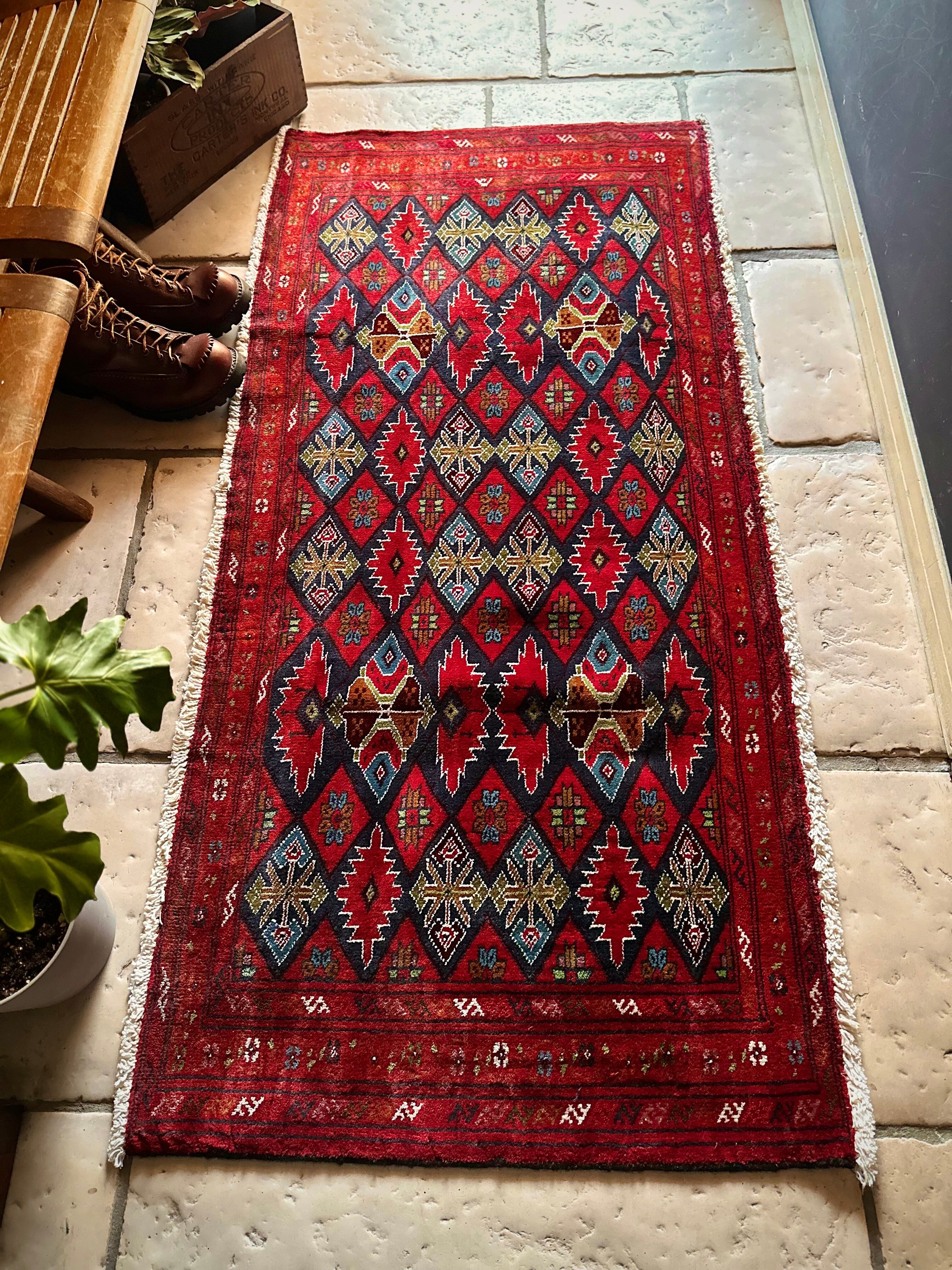 真っ赤な絨毯の代名詞とも言えるトルクメンから、こちらあまり見かける事がないアメリカン・インディアンのような連続紋様がかっこいいトライバルラグで、白の縁取りラインが浮きだって見える渋さが堪りません。