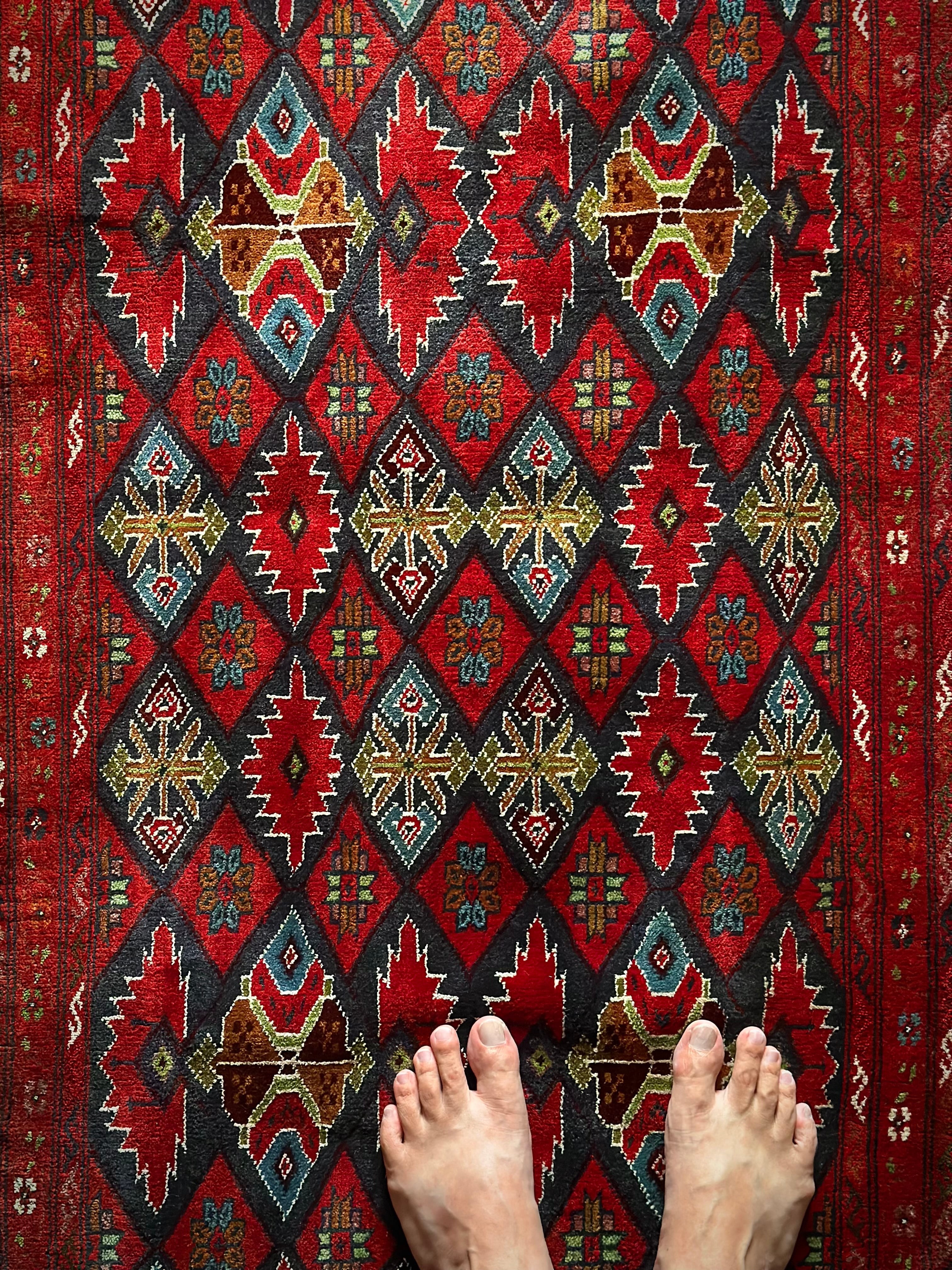 経年としては30年となりヴィンテージ然としたツヤがあり、特に目立つ汚れやリペア箇所も見当たらないグッドなコンディションで、トルクメンらしくパイル自体は長くはありませんが、しっとりとした羊毛の柔らかさで足裏を癒してくれます。