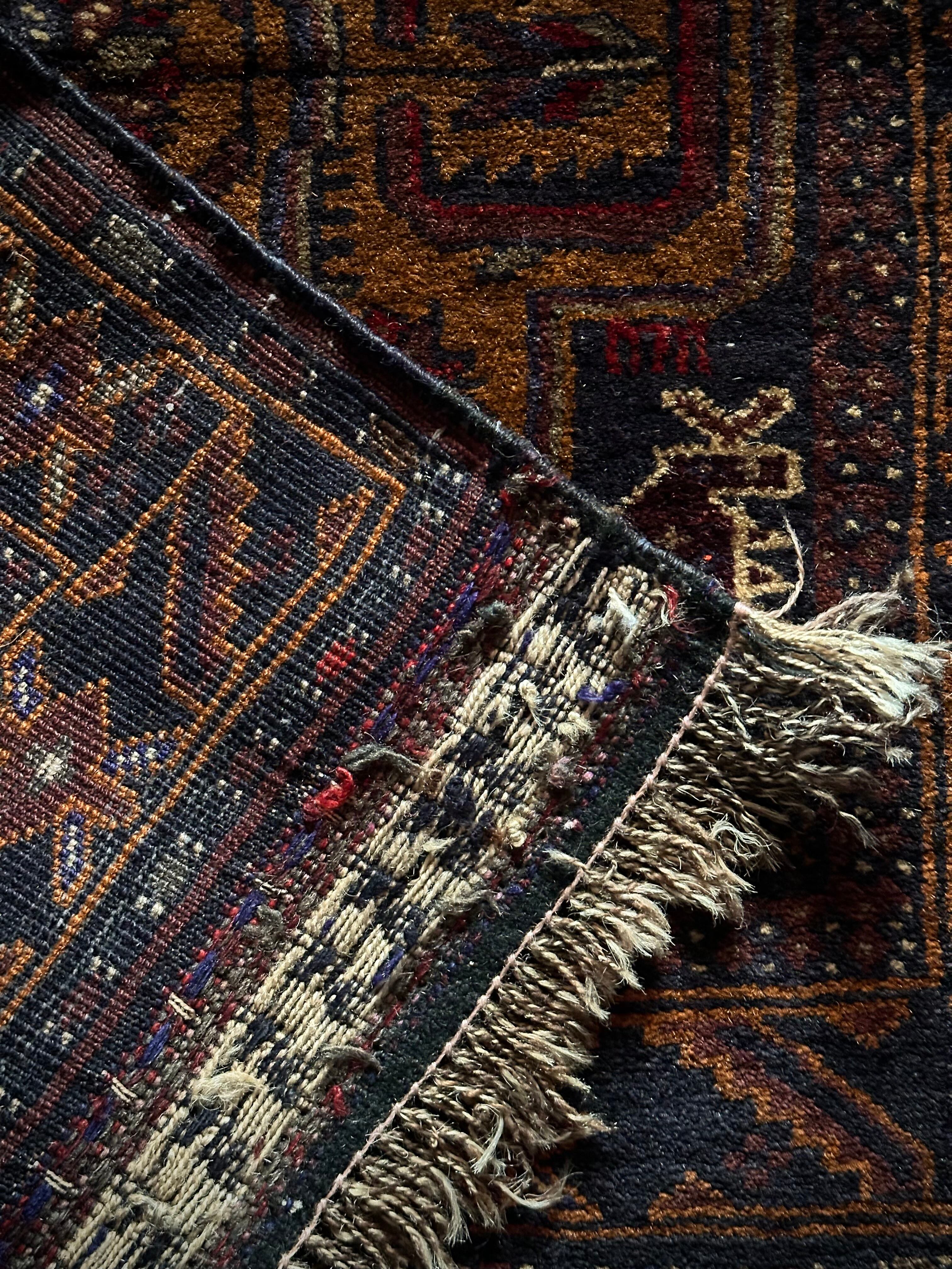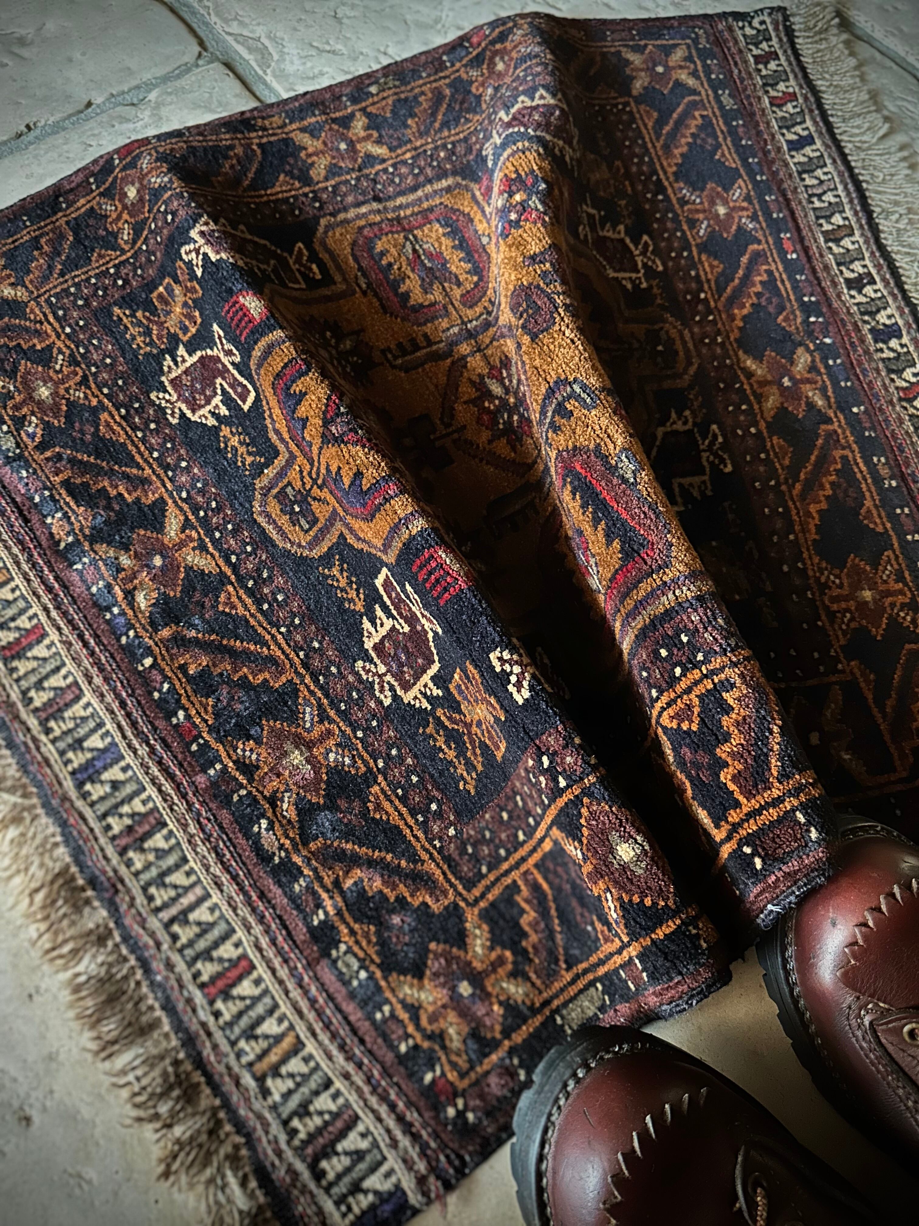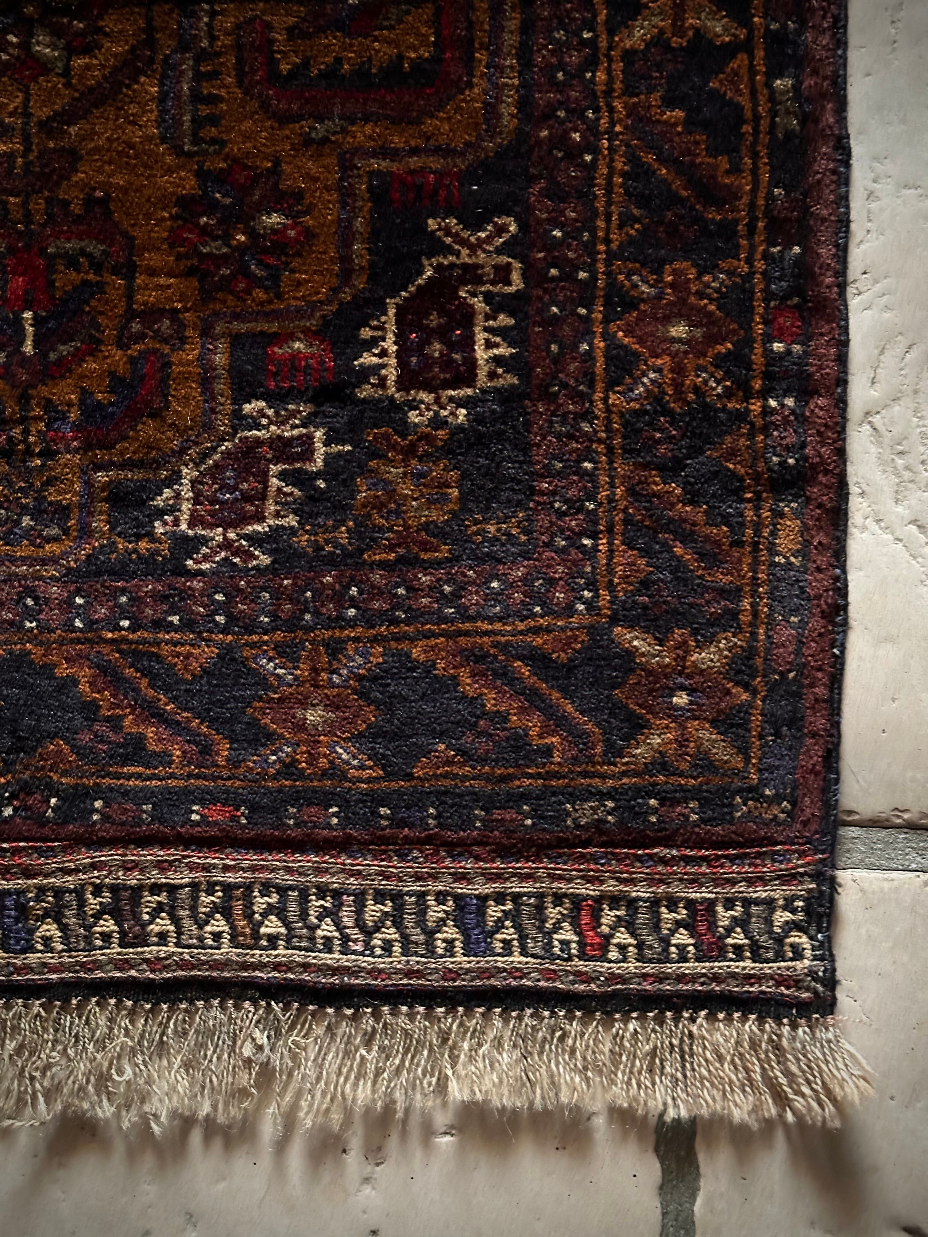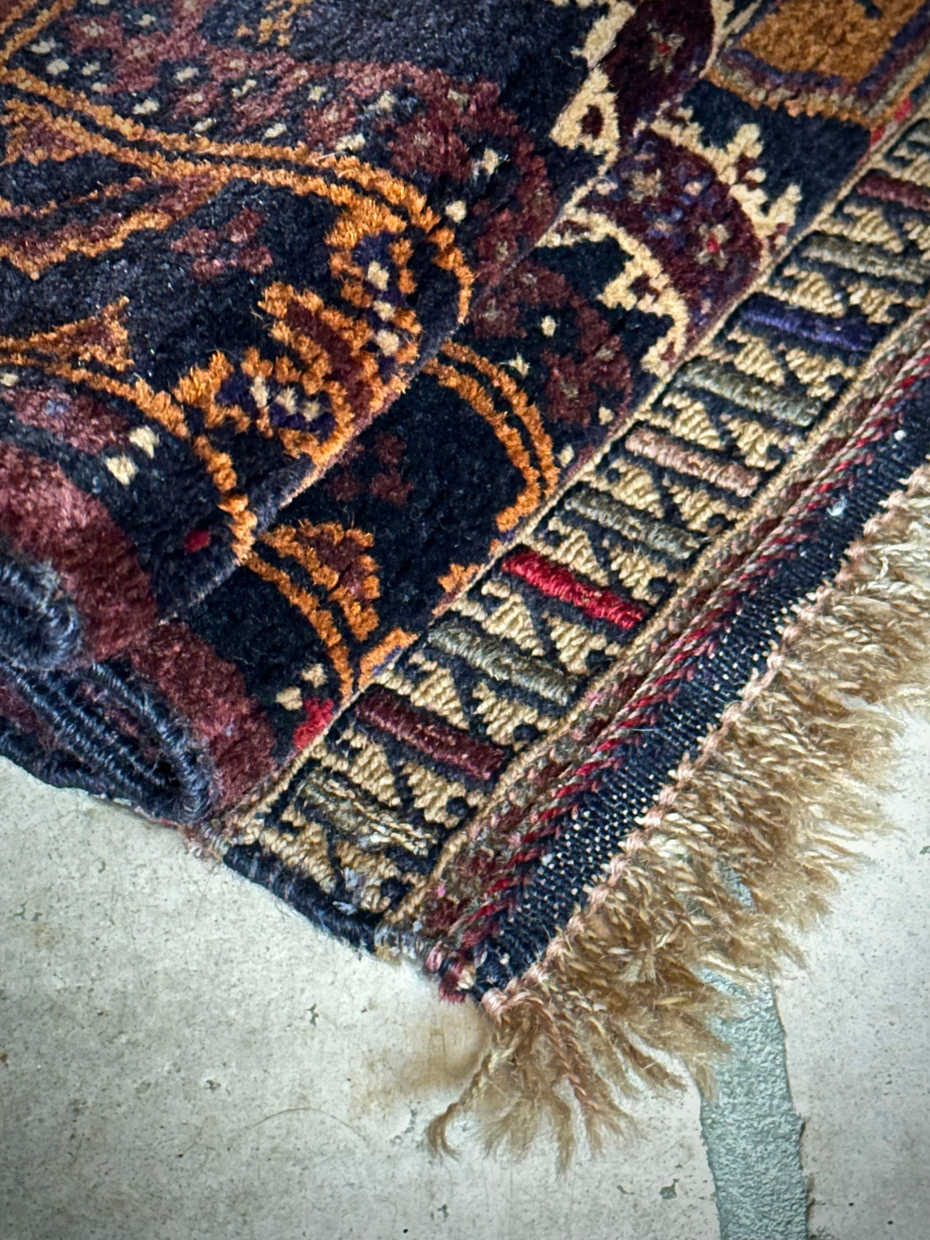 アフガン産バルーチらしいプリミティブな印象のこちらは、ヘラート州に居住するバルーチ族のトライバルラグで、大きさからして元はバッグに使用されていたパイル表皮を仕立て直したモノかと思われます。