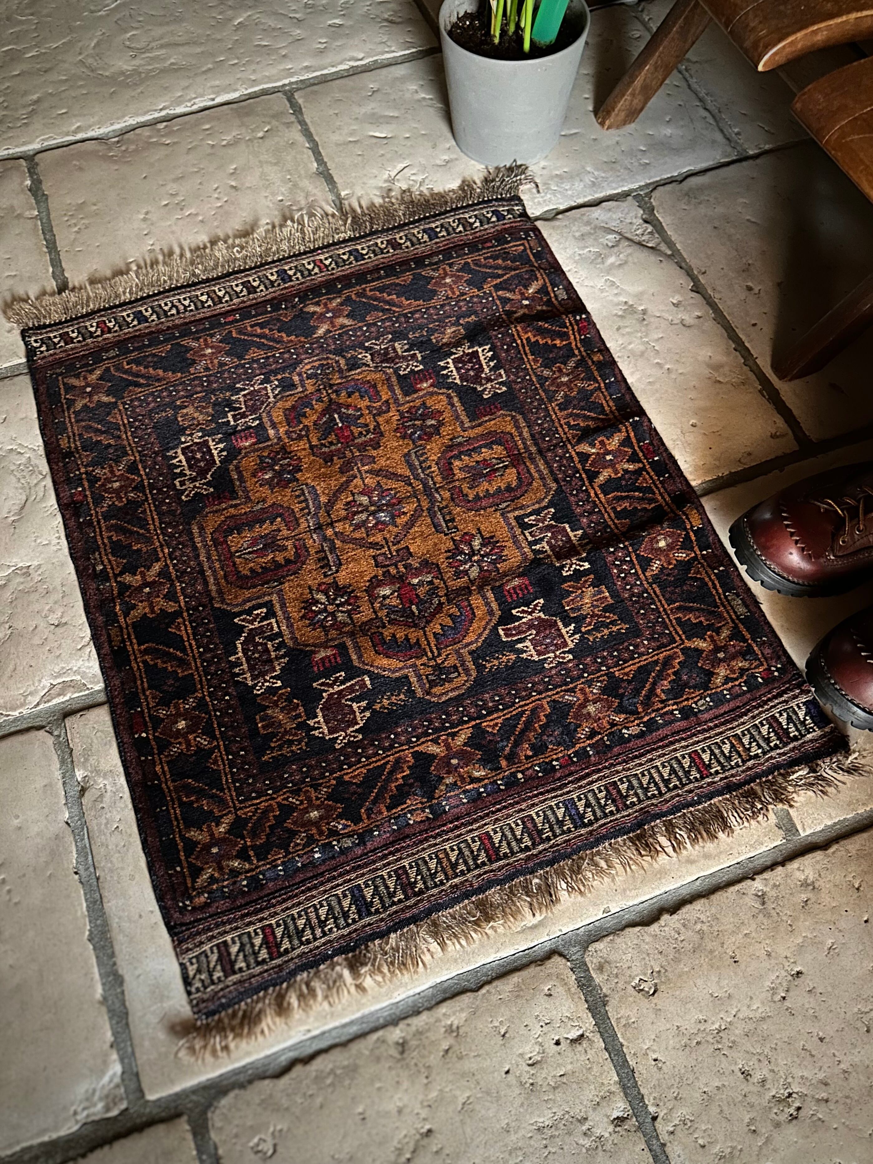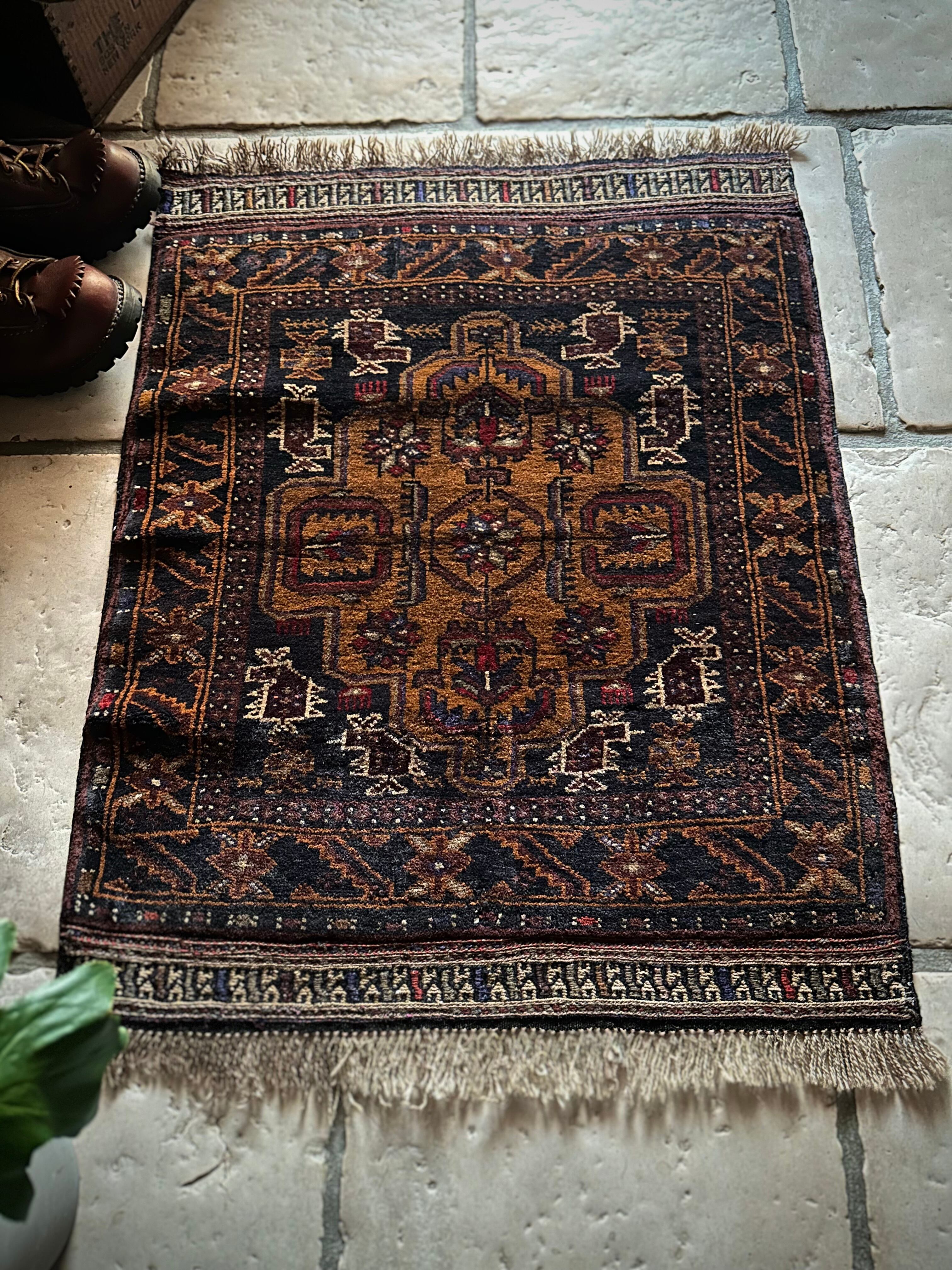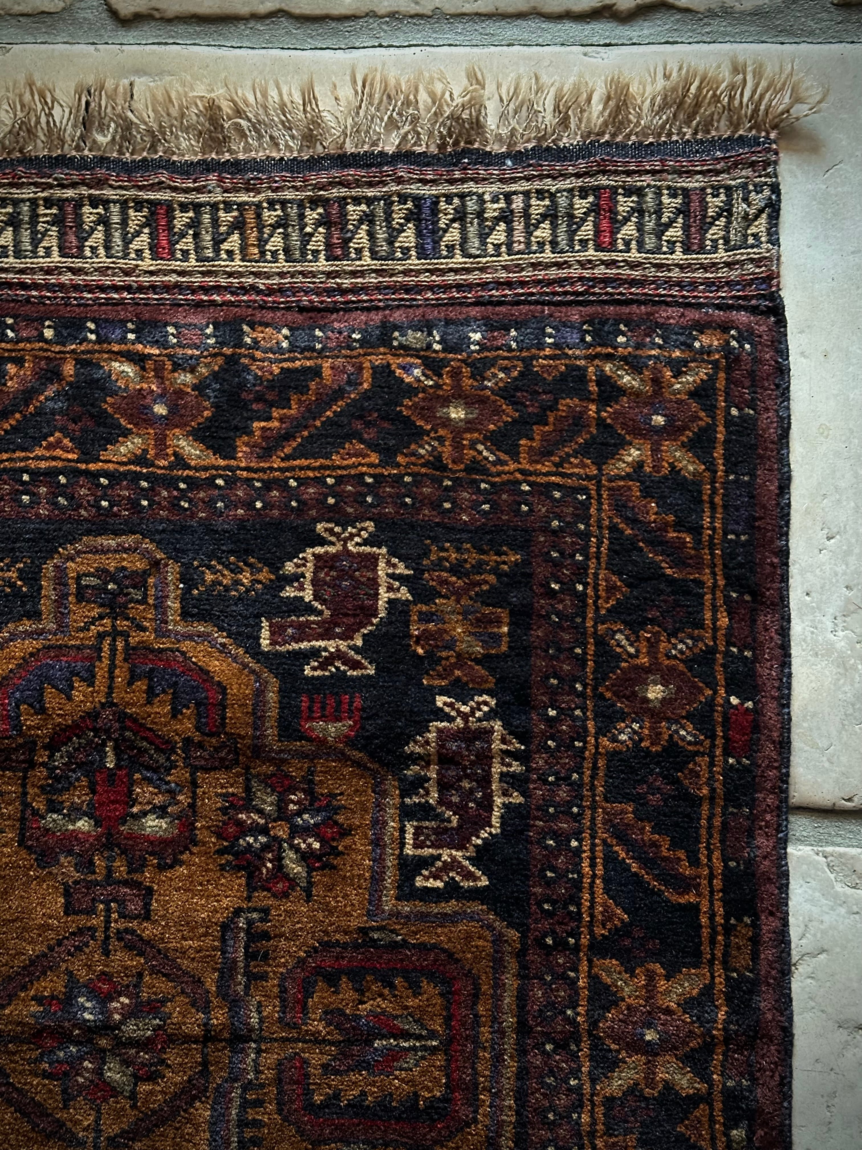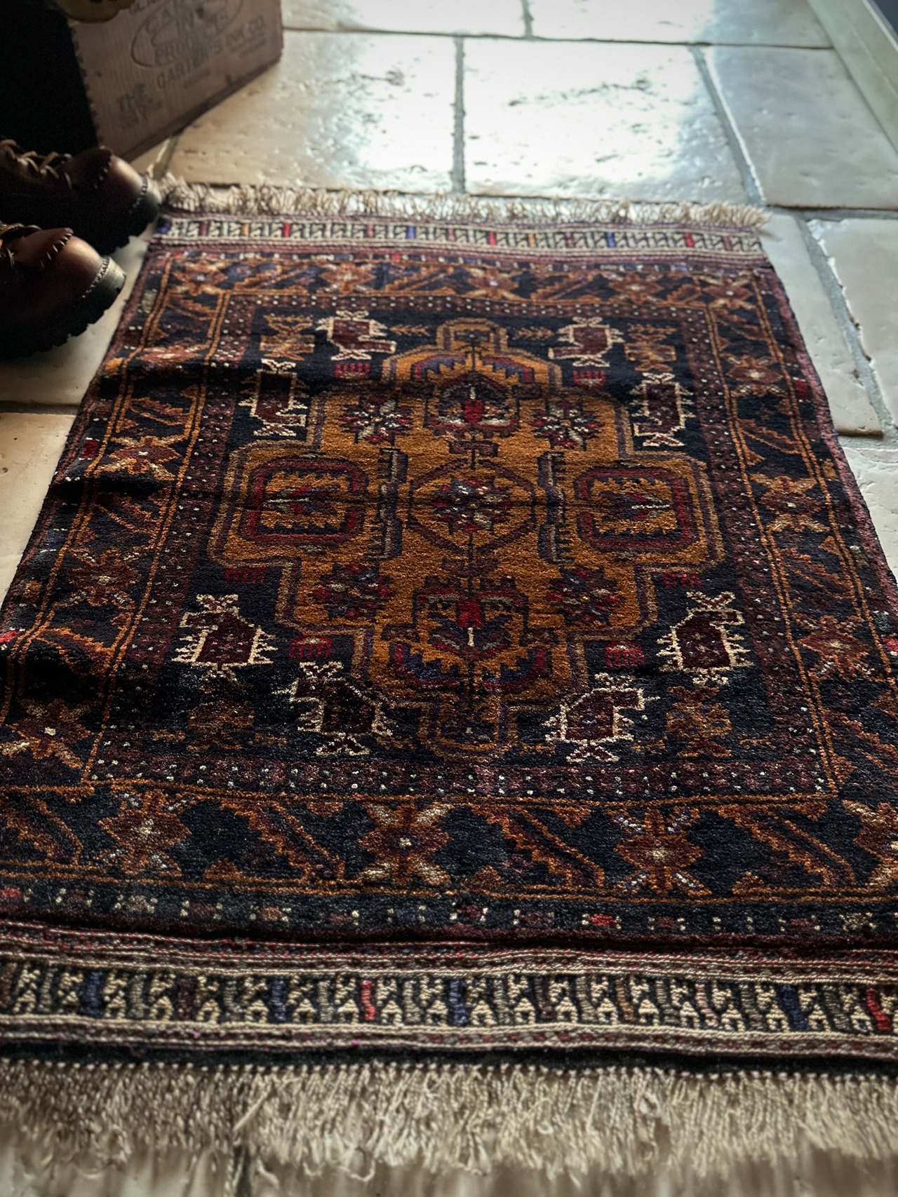 アフガン産バルーチらしいプリミティブな印象のこちらは、ヘラート州に居住するバルーチ族のトライバルラグで、大きさからして元はバッグに使用されていたパイル表皮を仕立て直したモノかと思われます。