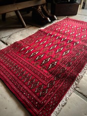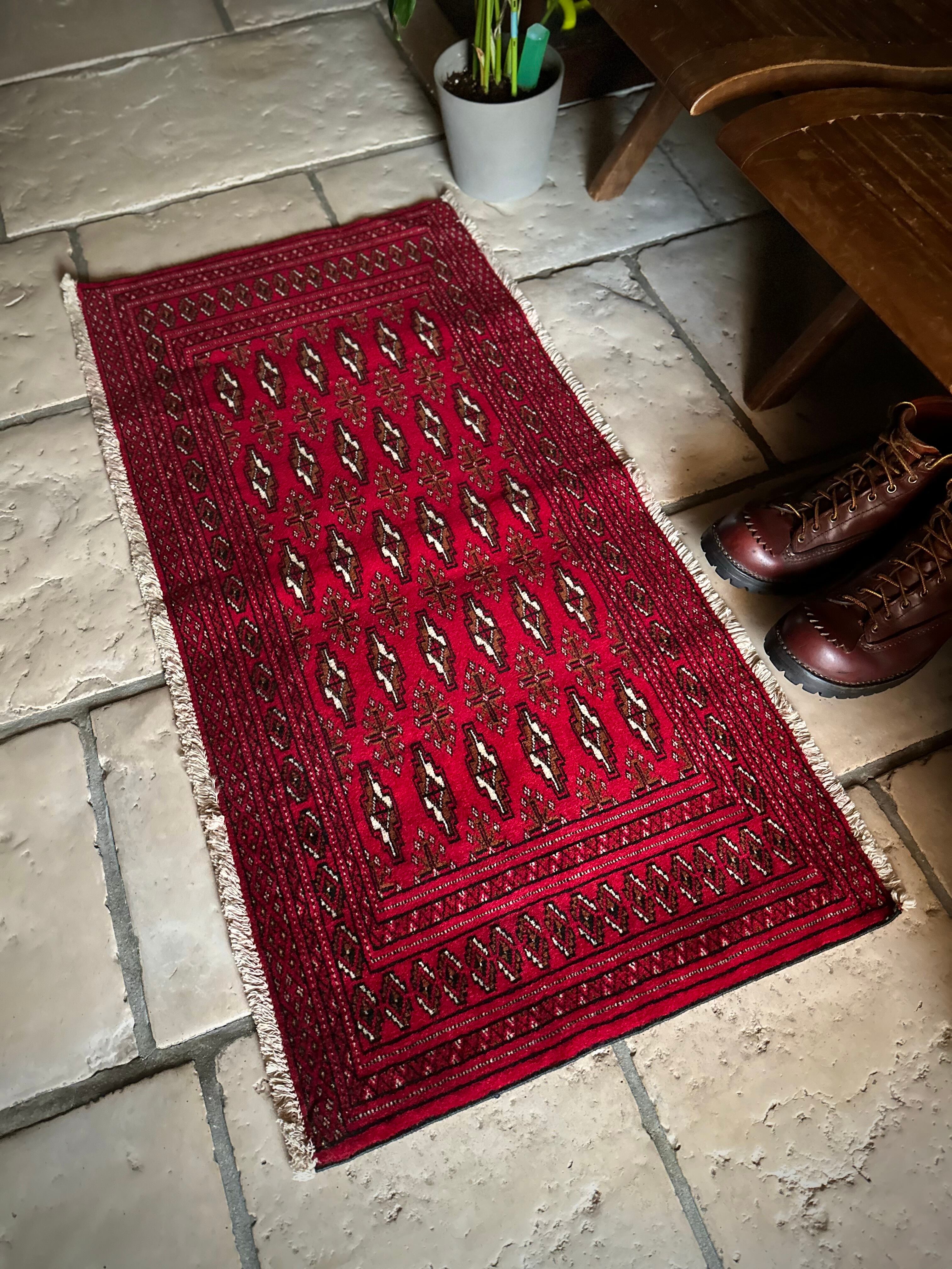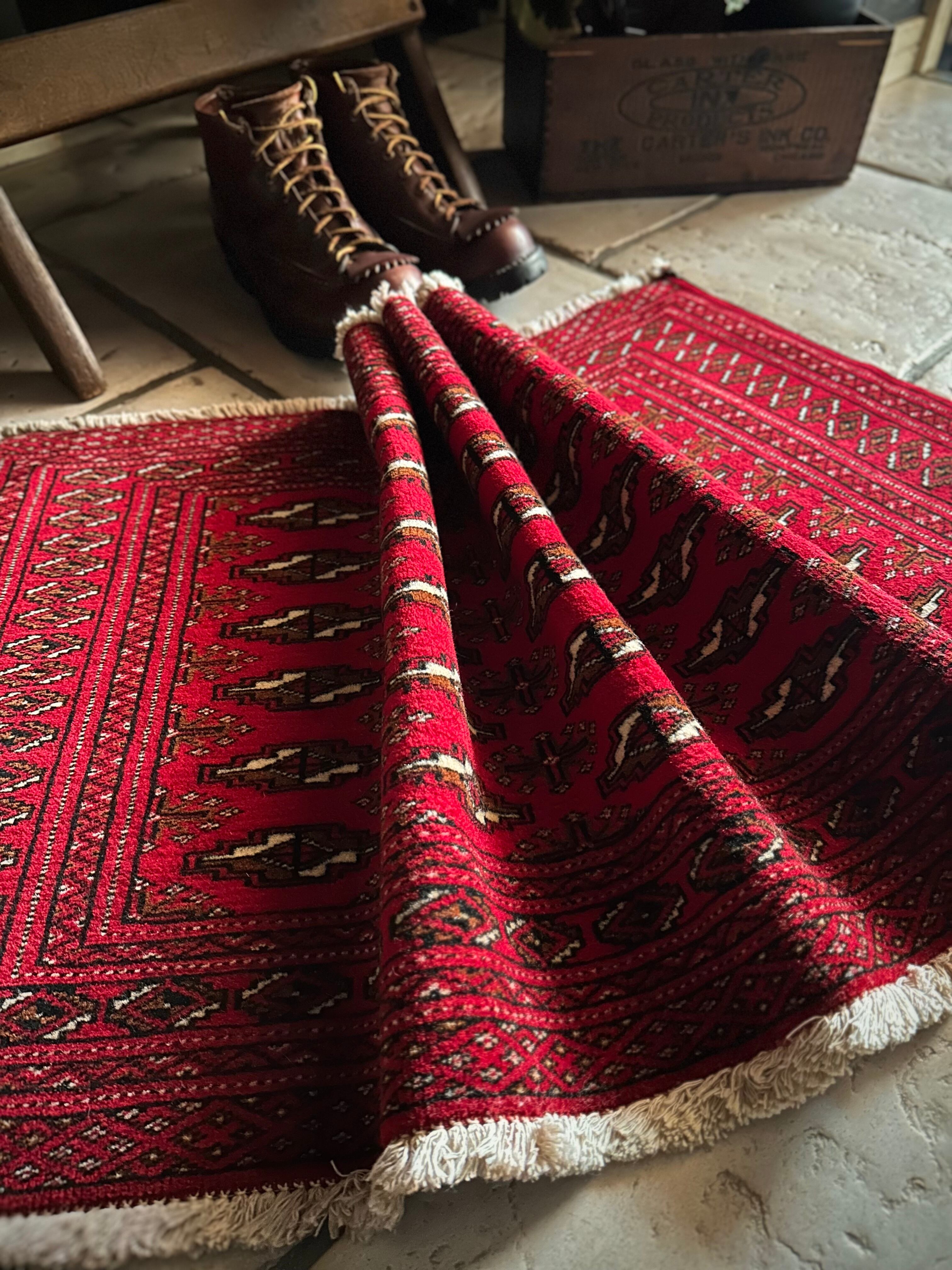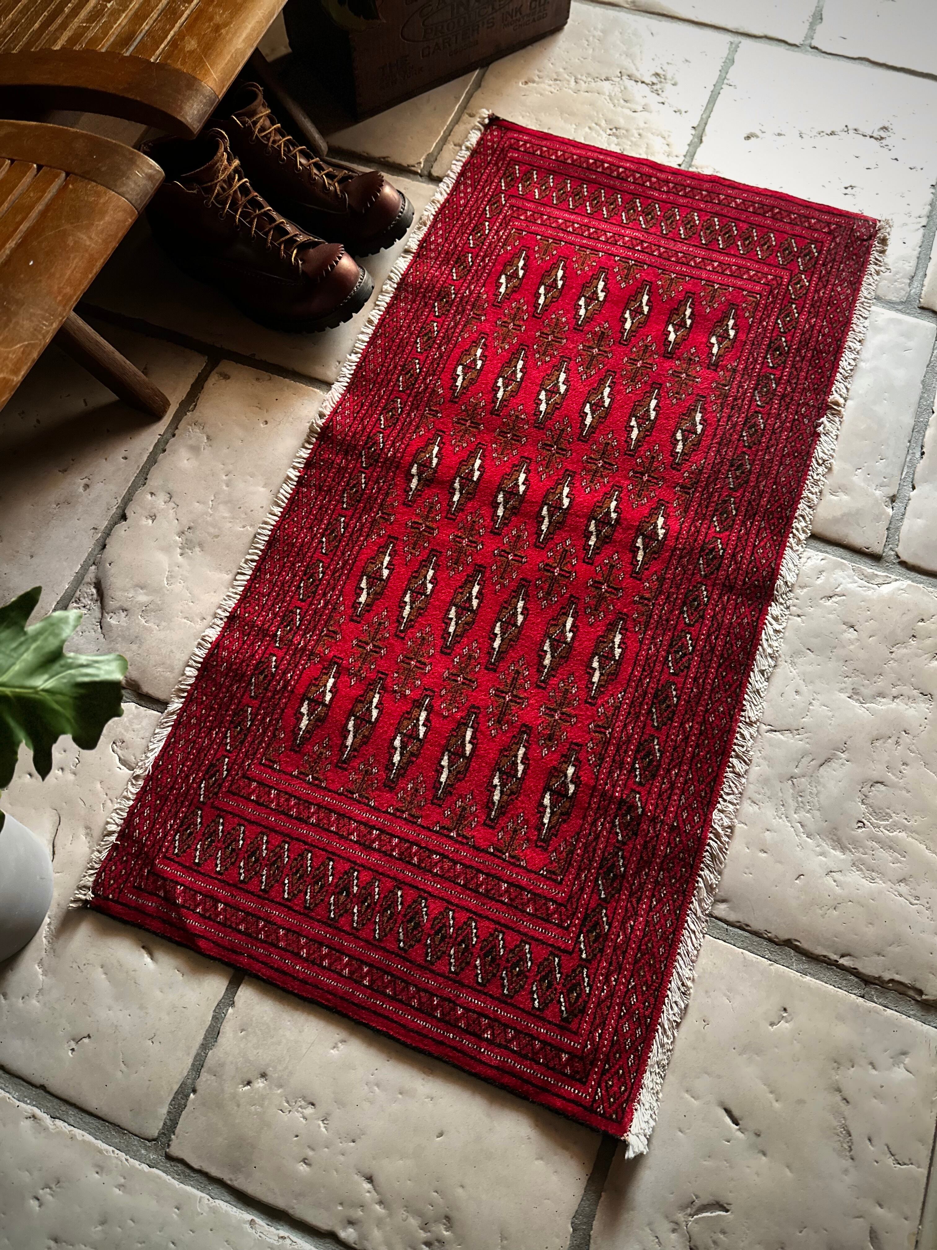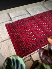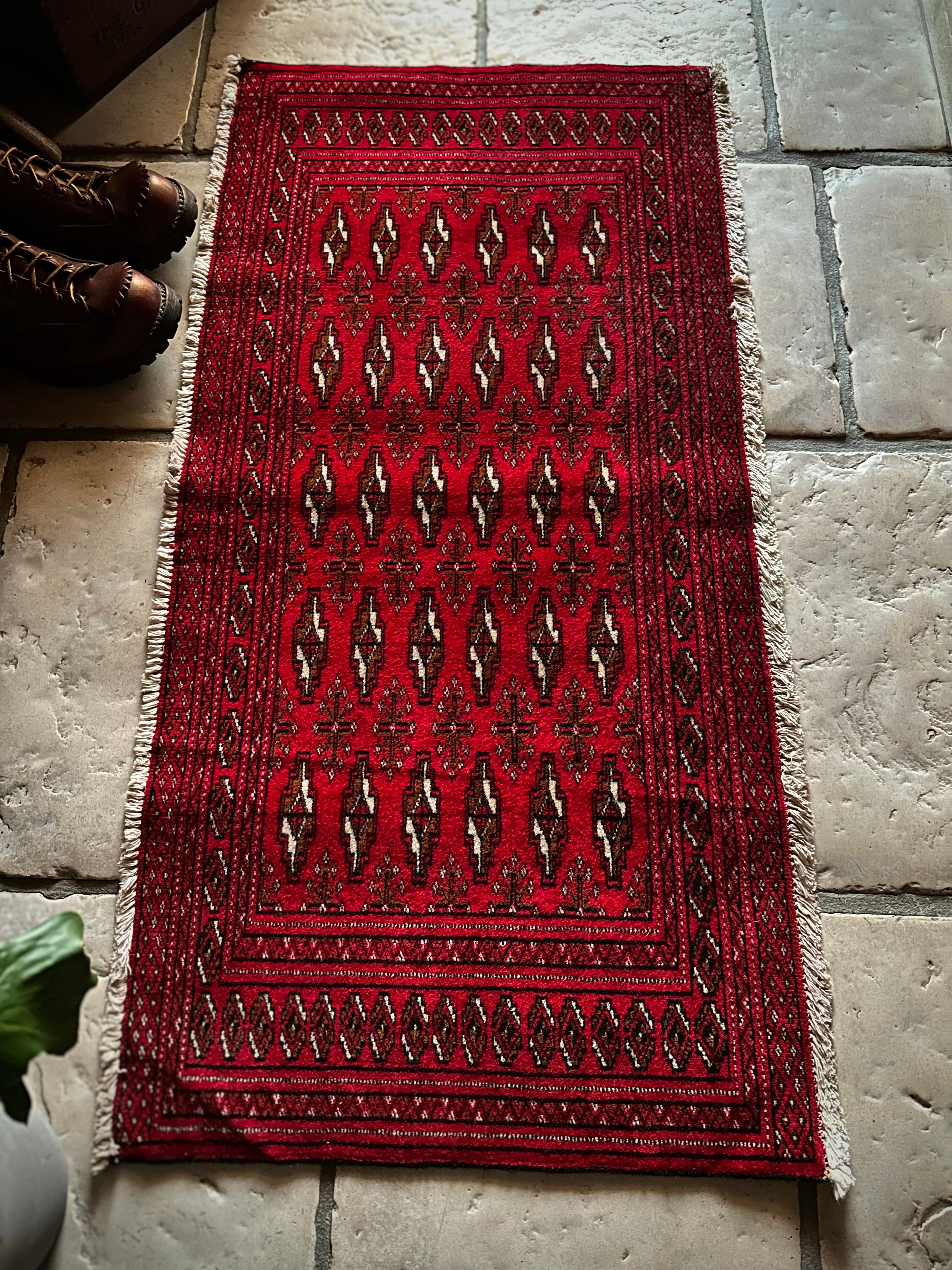 こちら小振りな玄関マットサイズながらも手の抜きどころがない細かさで、お馴染みのトルクメン・レッドにギュルの連続紋様がかっこよく、一家に1枚は敷きたいと思える伝統的なアクセントラグになります。