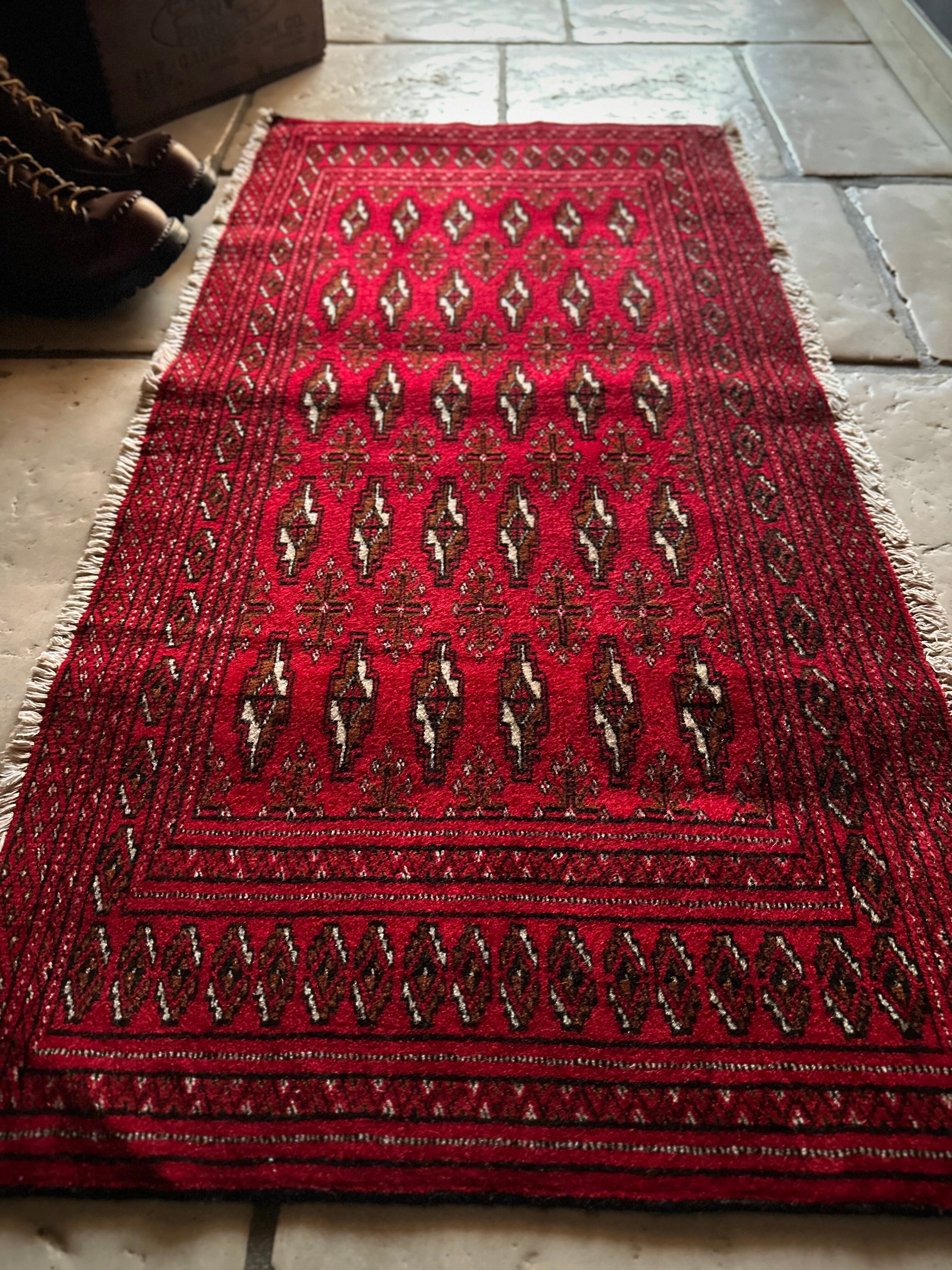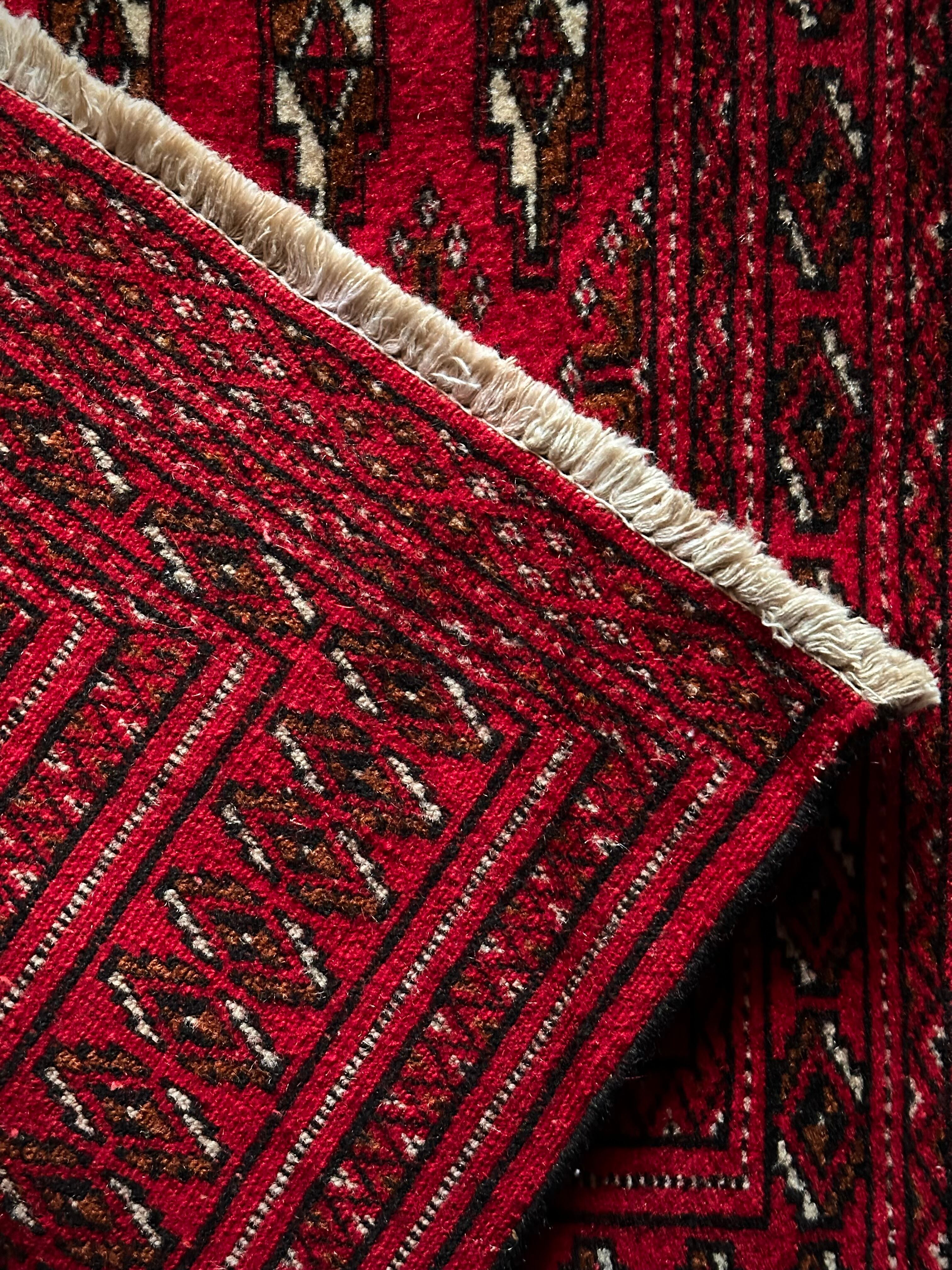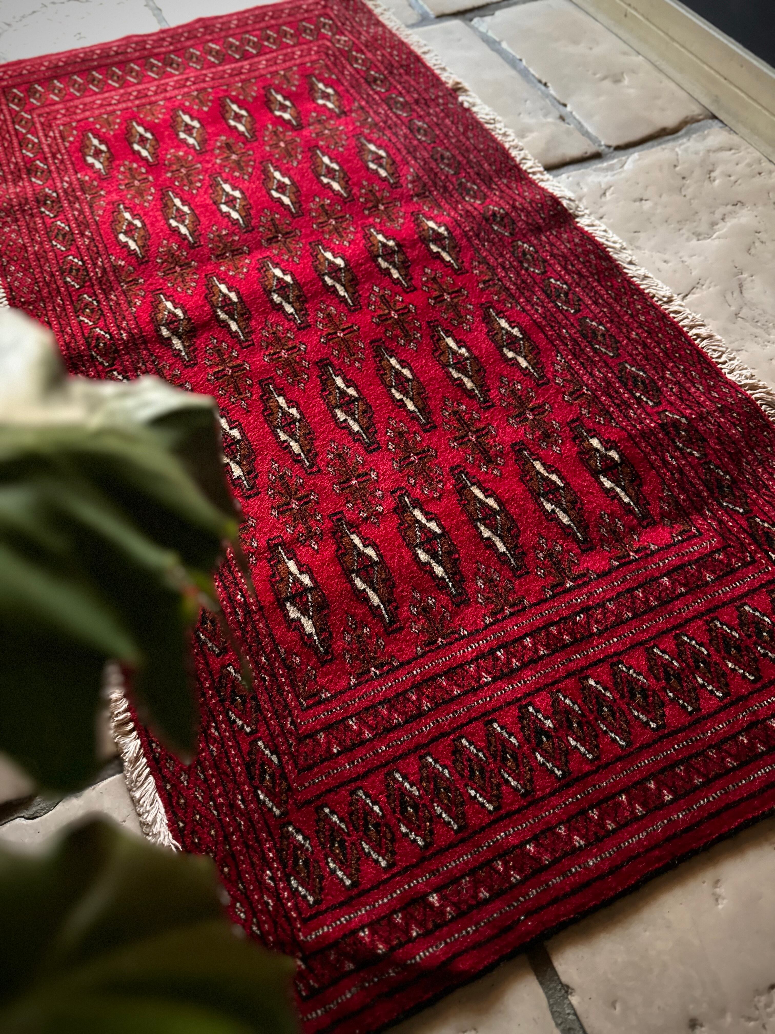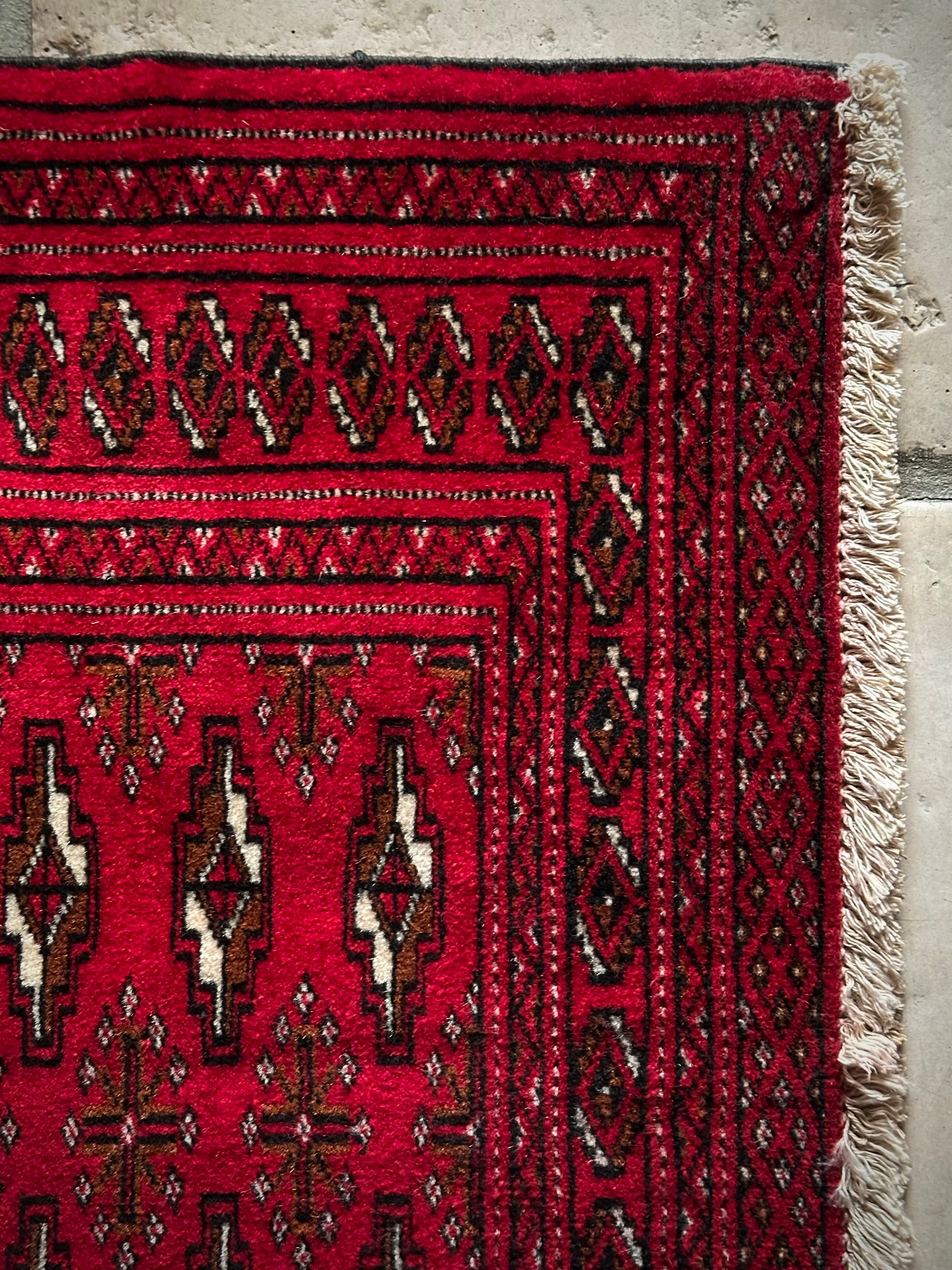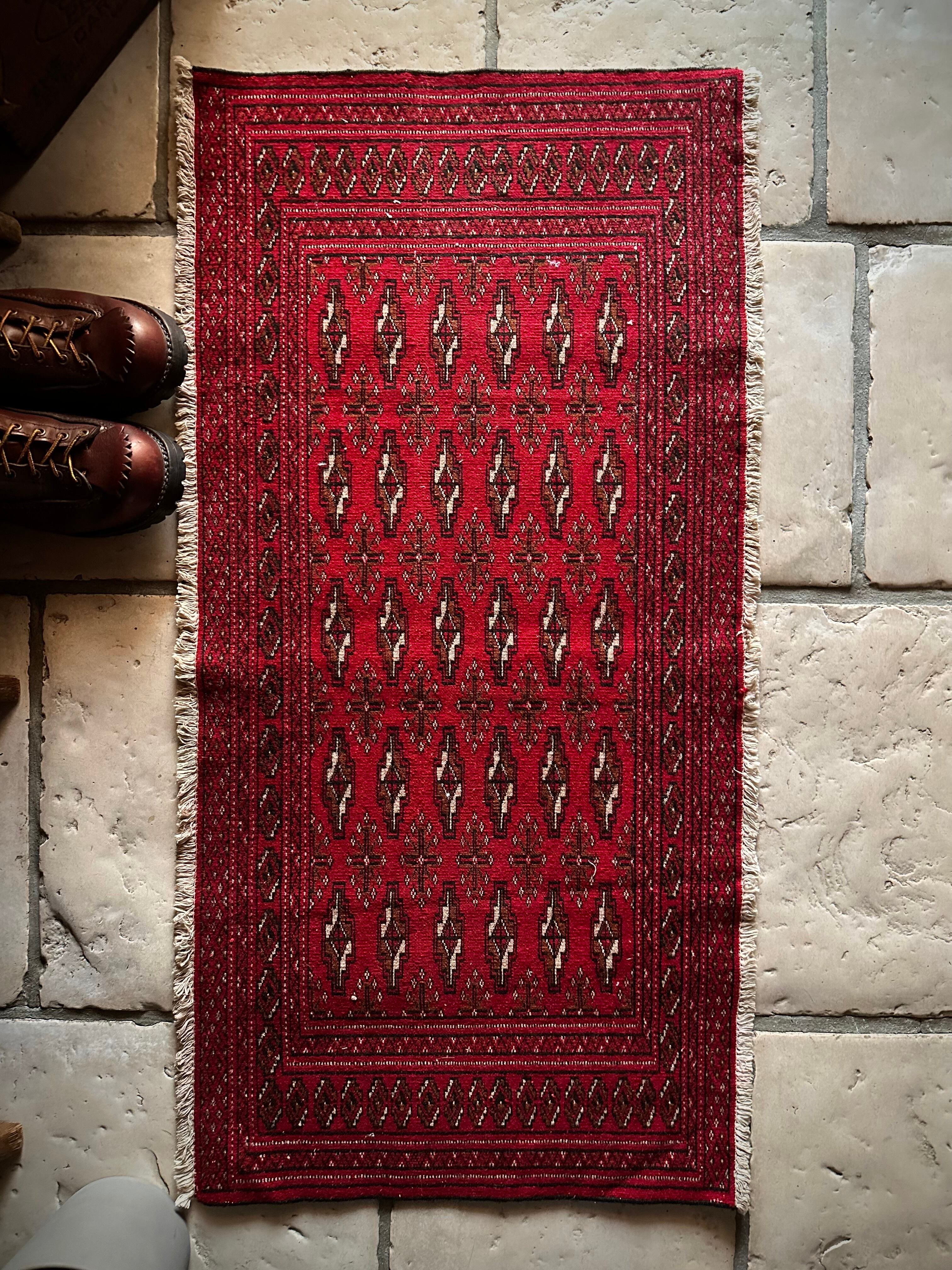 こちら小振りな玄関マットサイズながらも手の抜きどころがない細かさで、お馴染みのトルクメン・レッドにギュルの連続紋様がかっこよく、一家に1枚は敷きたいと思える伝統的なアクセントラグになります。
