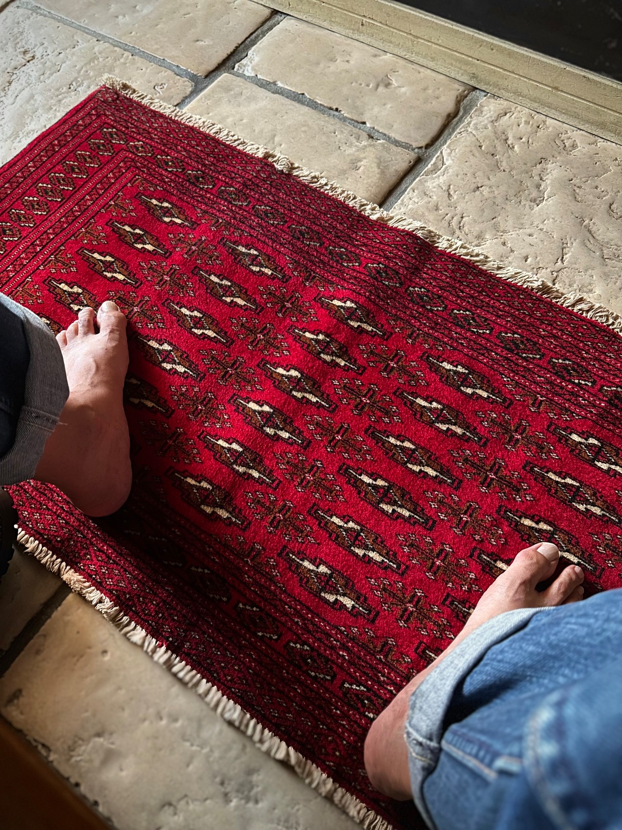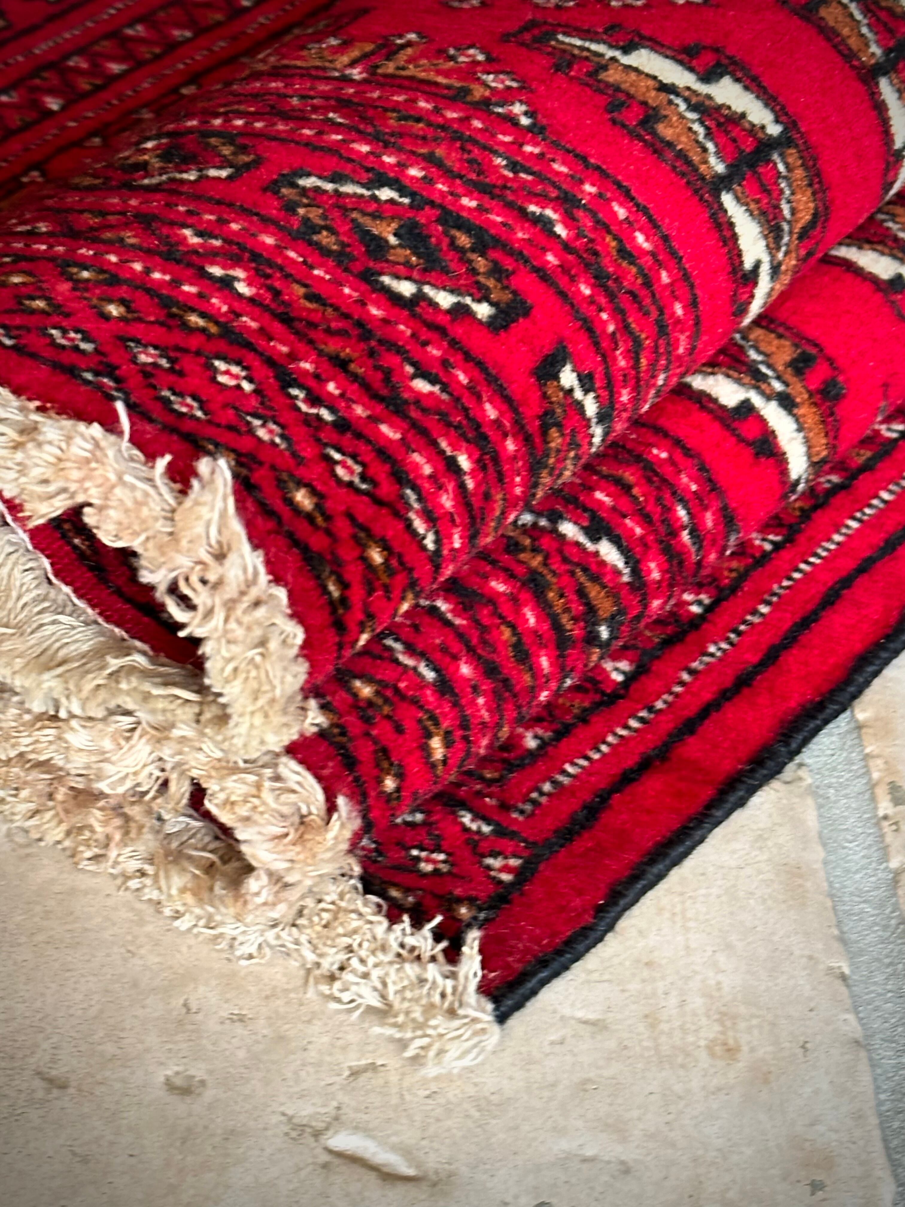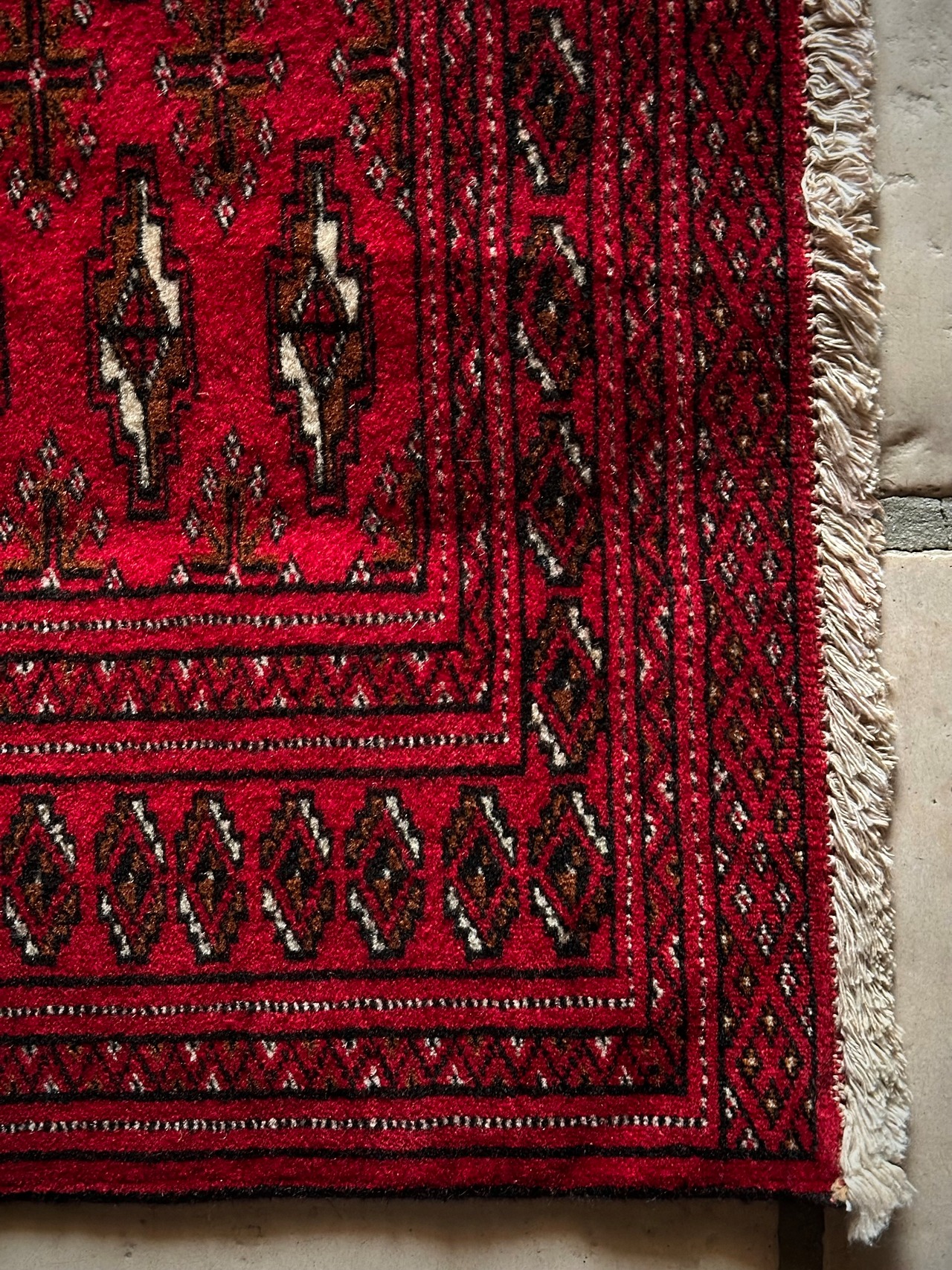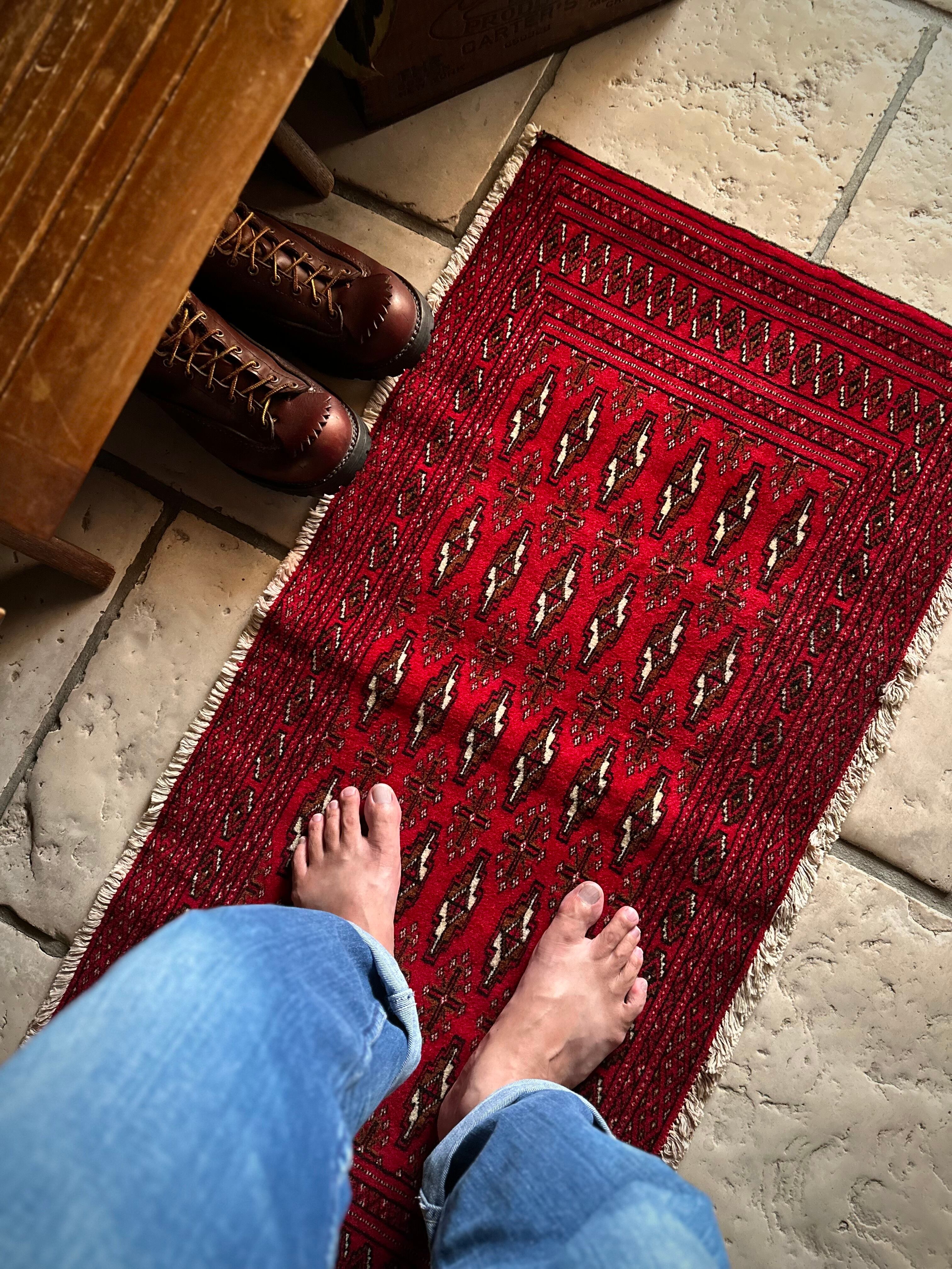 こちら小振りな玄関マットサイズながらも手の抜きどころがない細かさで、お馴染みのトルクメン・レッドにギュルの連続紋様がかっこよく、一家に1枚は敷きたいと思える伝統的なアクセントラグになります。