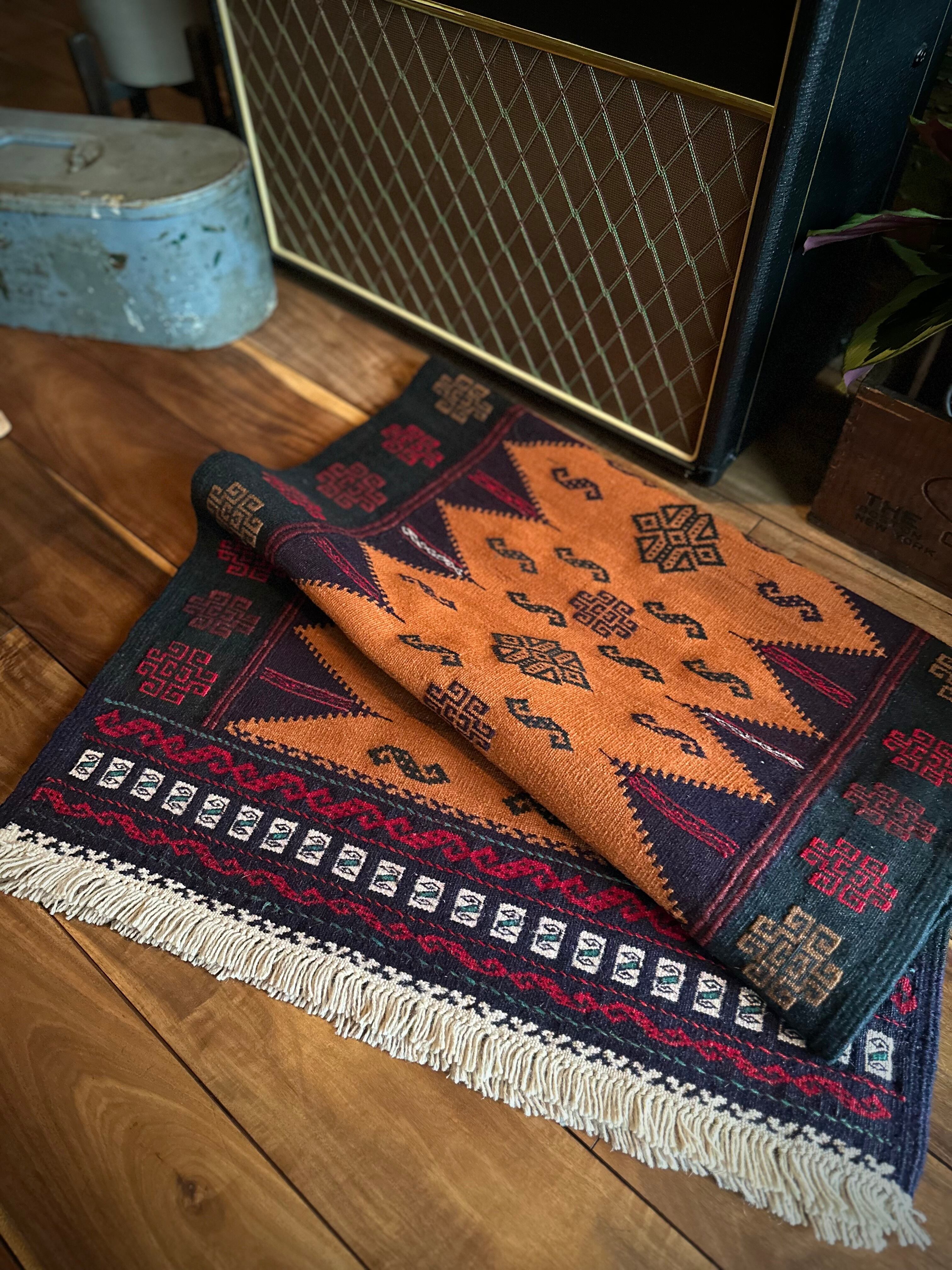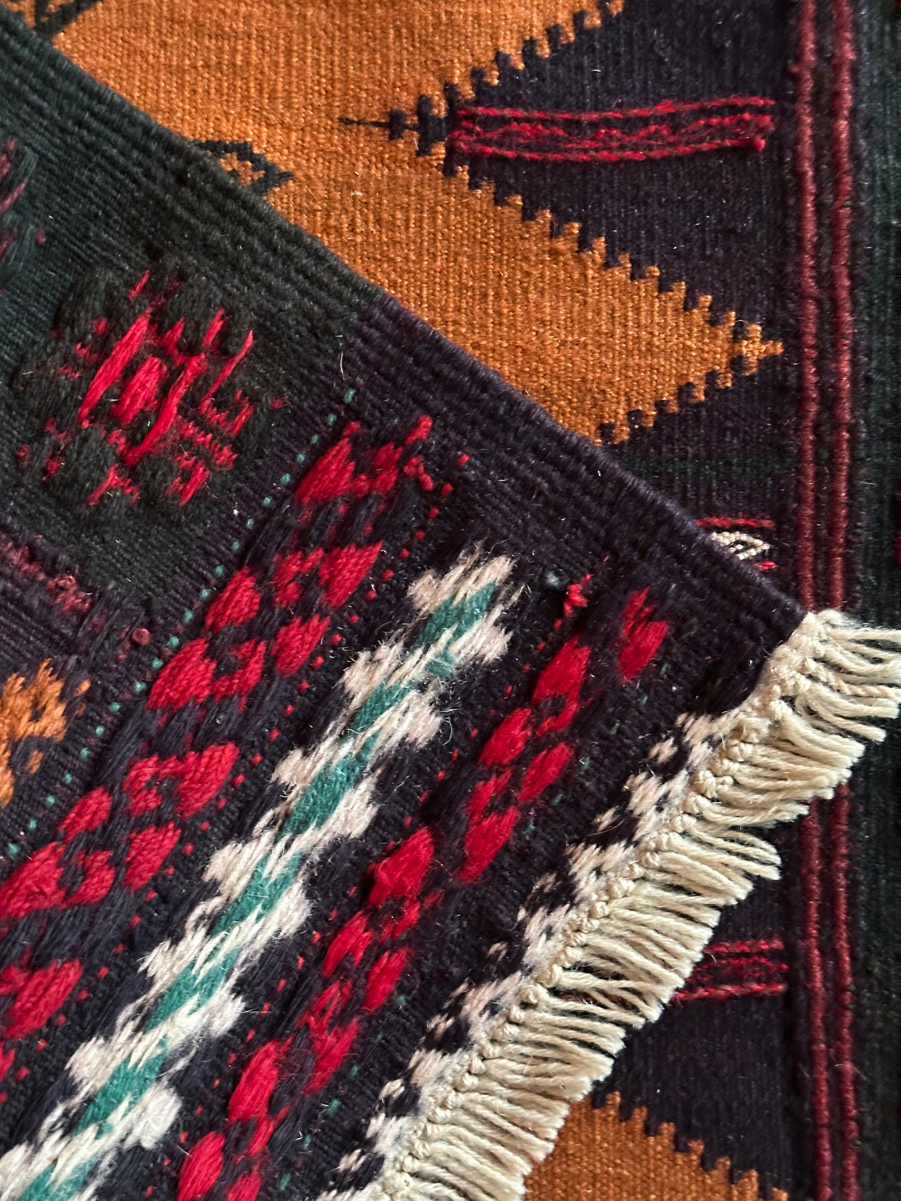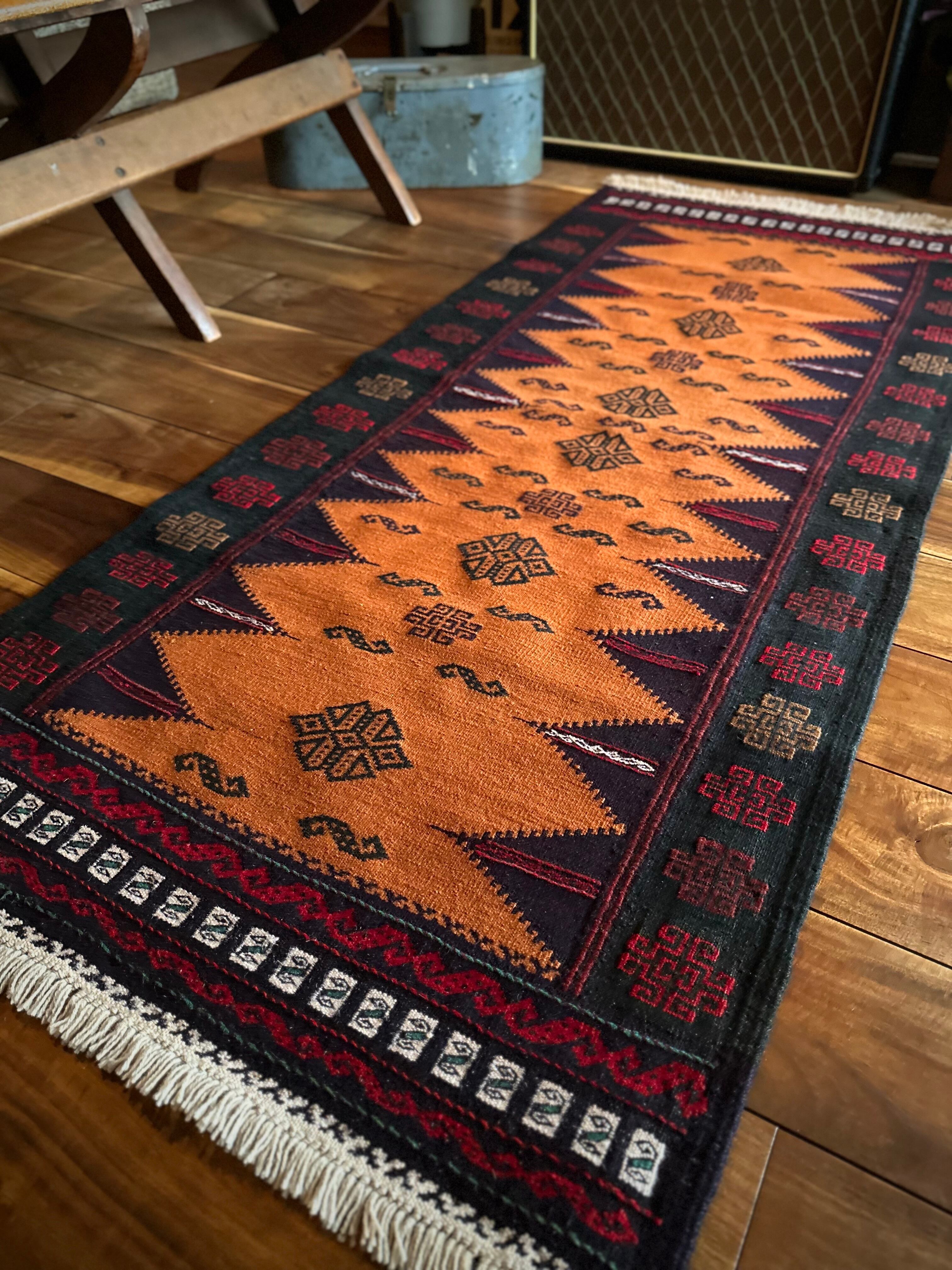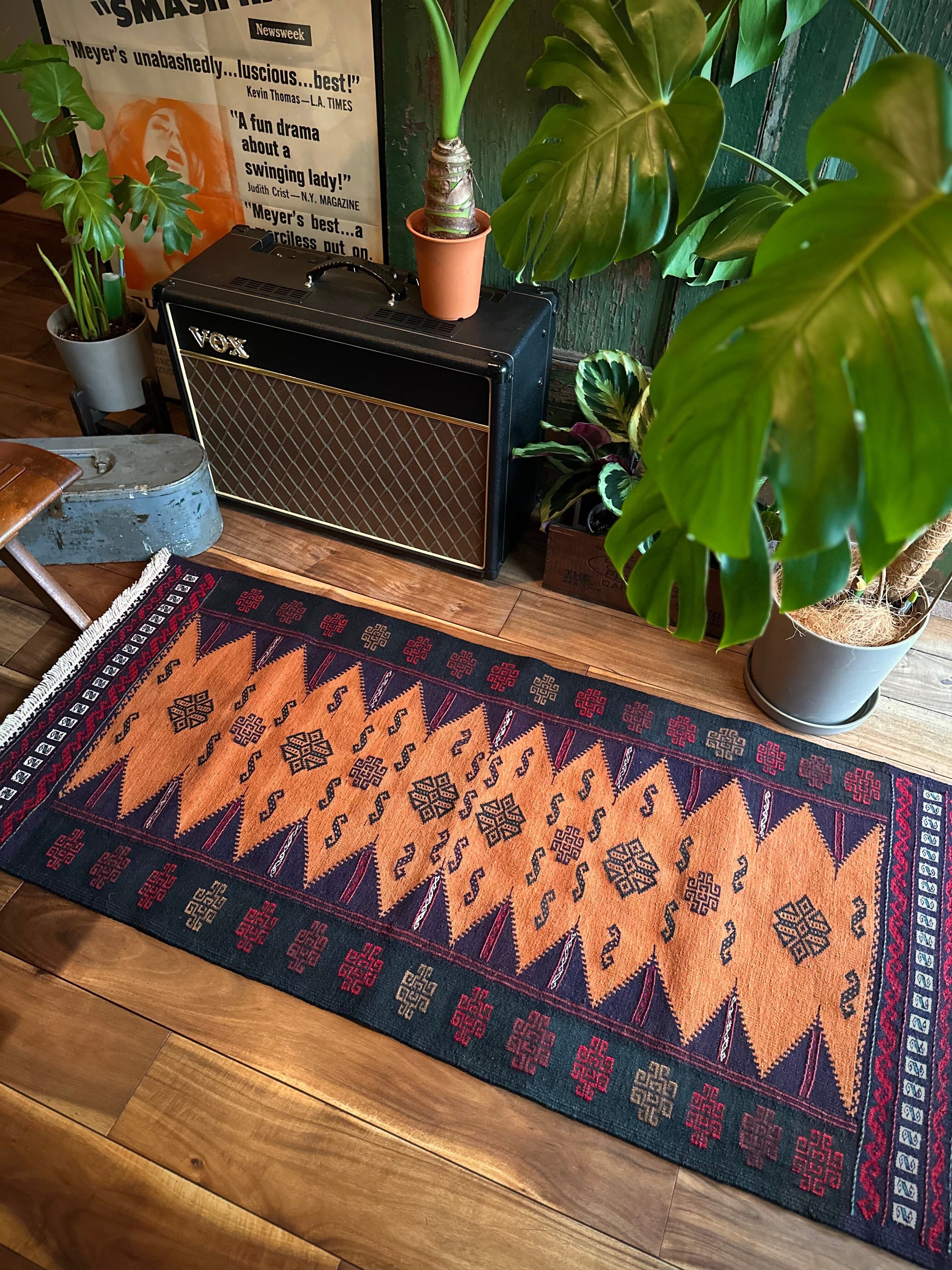 ブラックベースの中にオレンジのギザギザ模様がかっこいい、アフガニスタンはヘラート州に居住するバルーチ族のキリムで、食事の際に床に敷いて食べ物を並べるソフレと言われる食卓布になります。