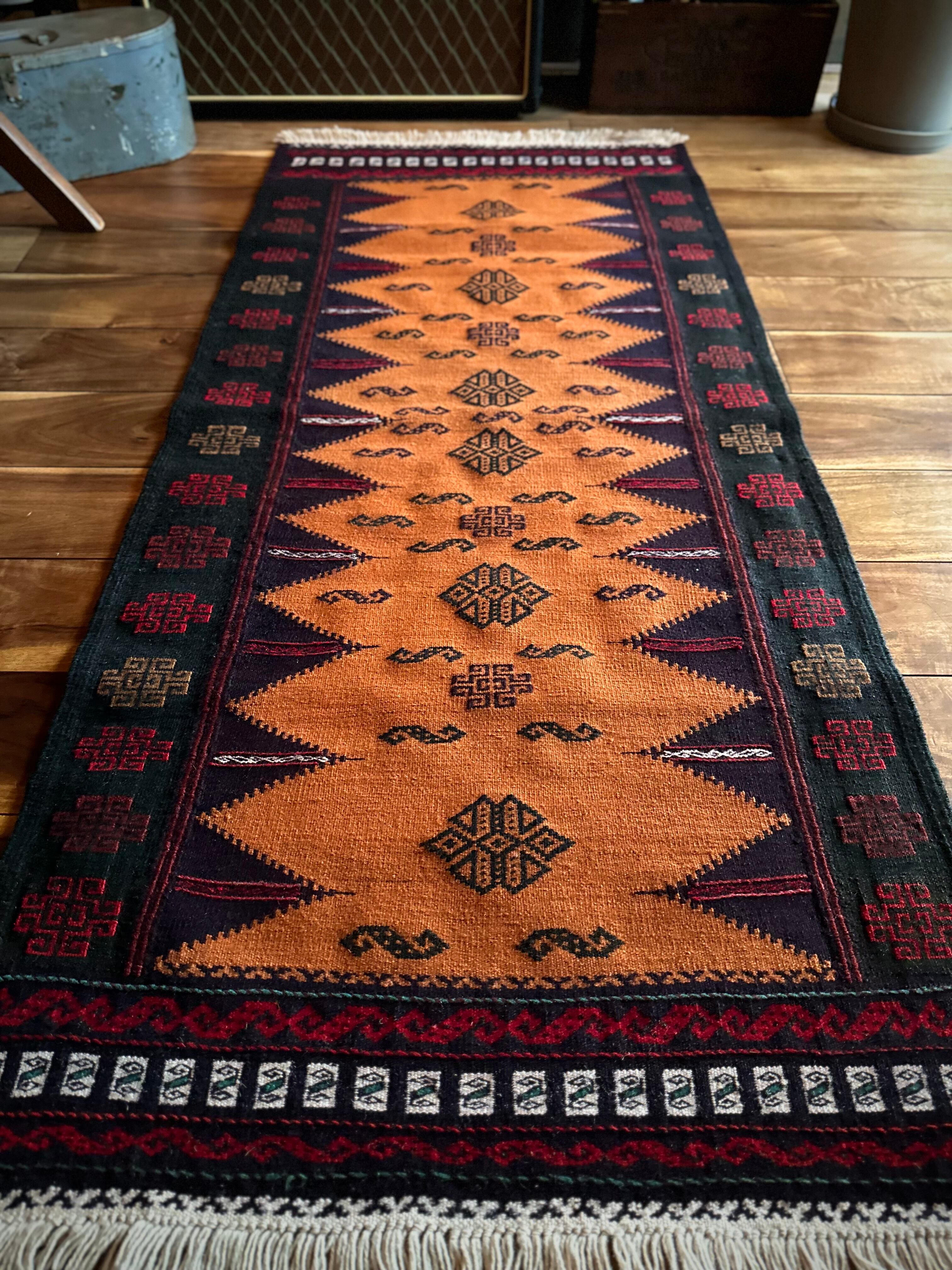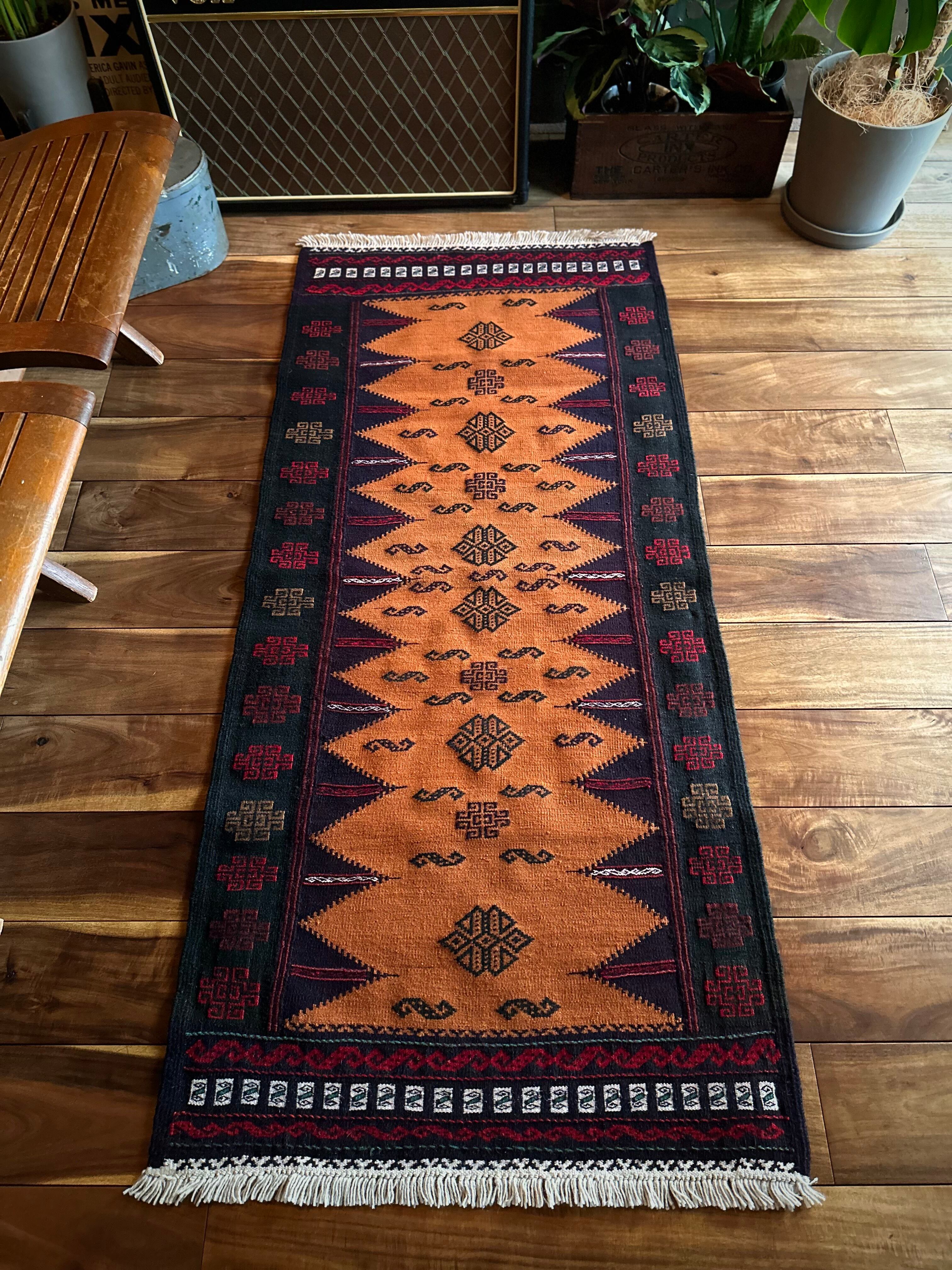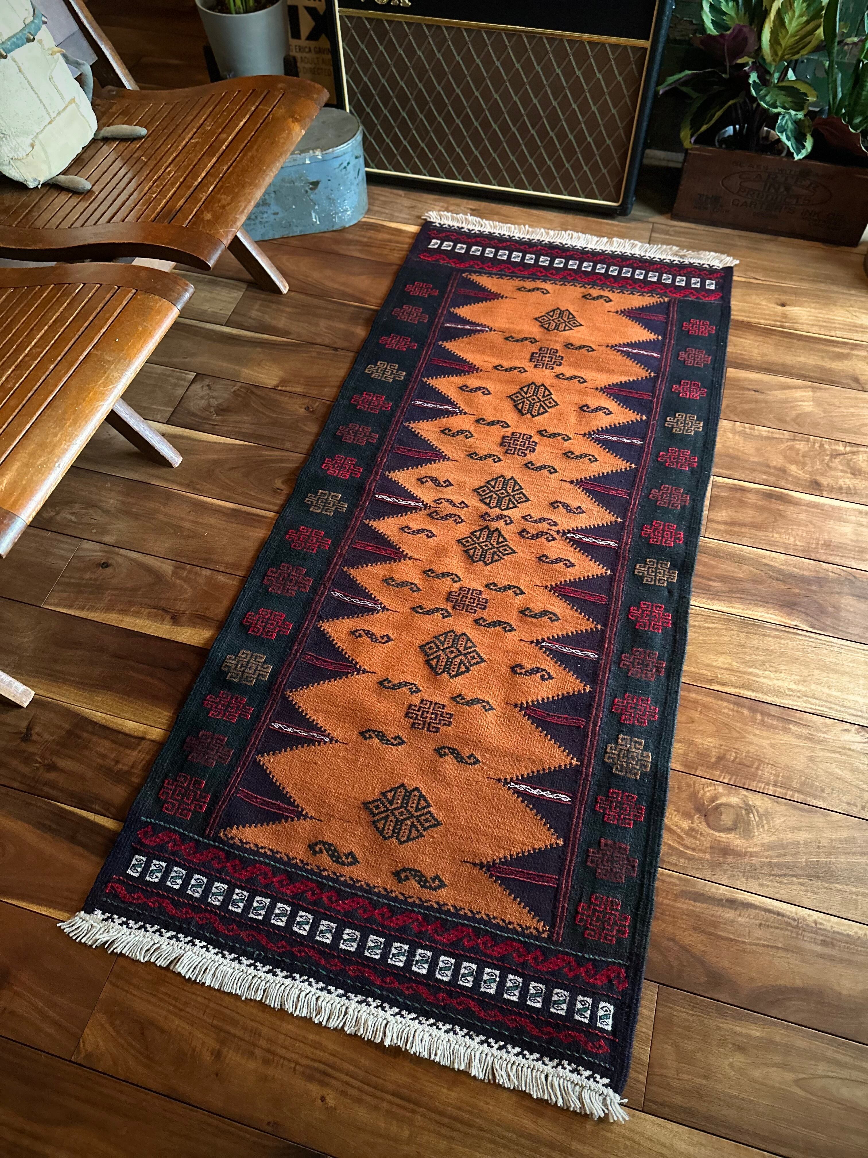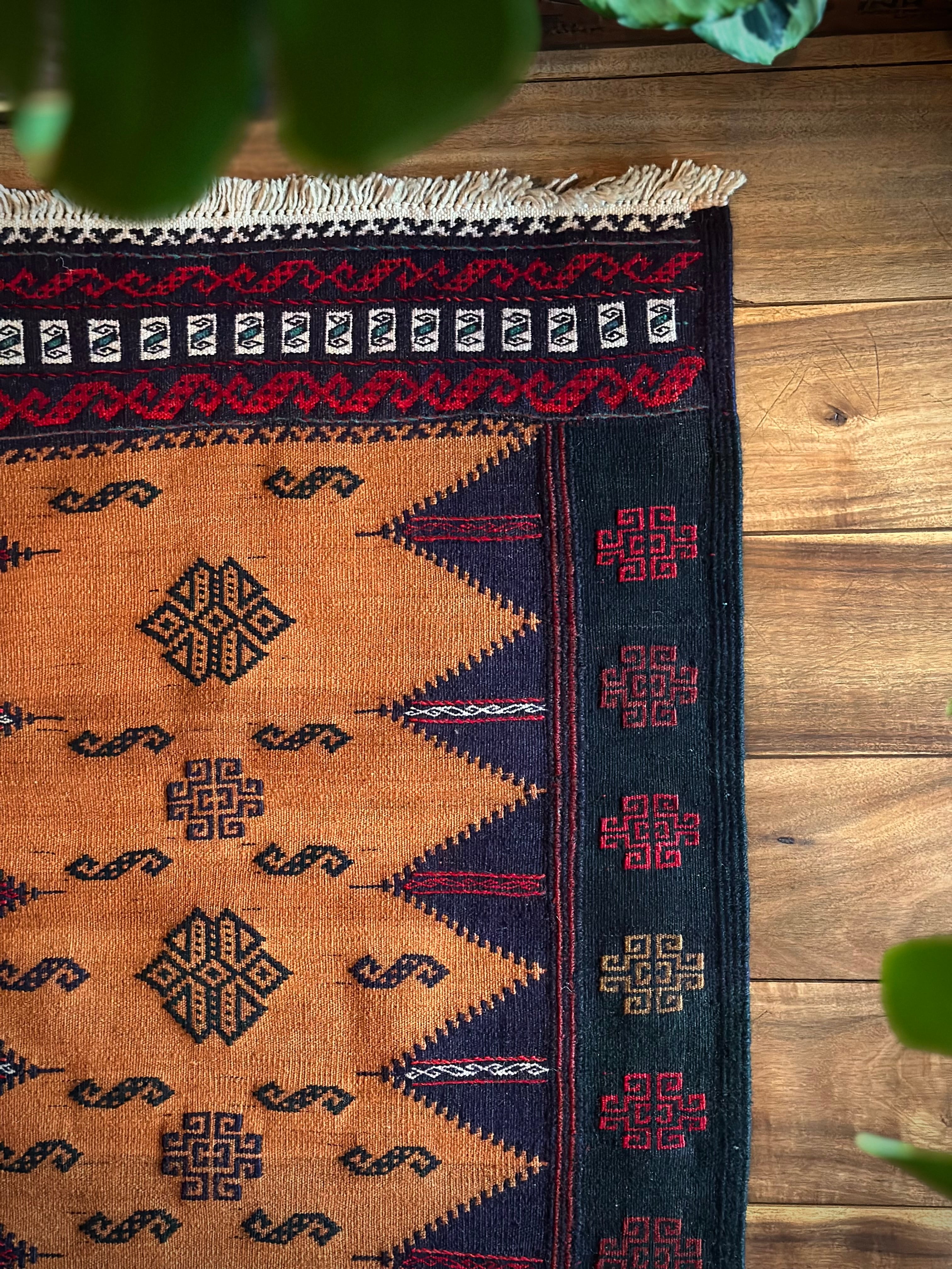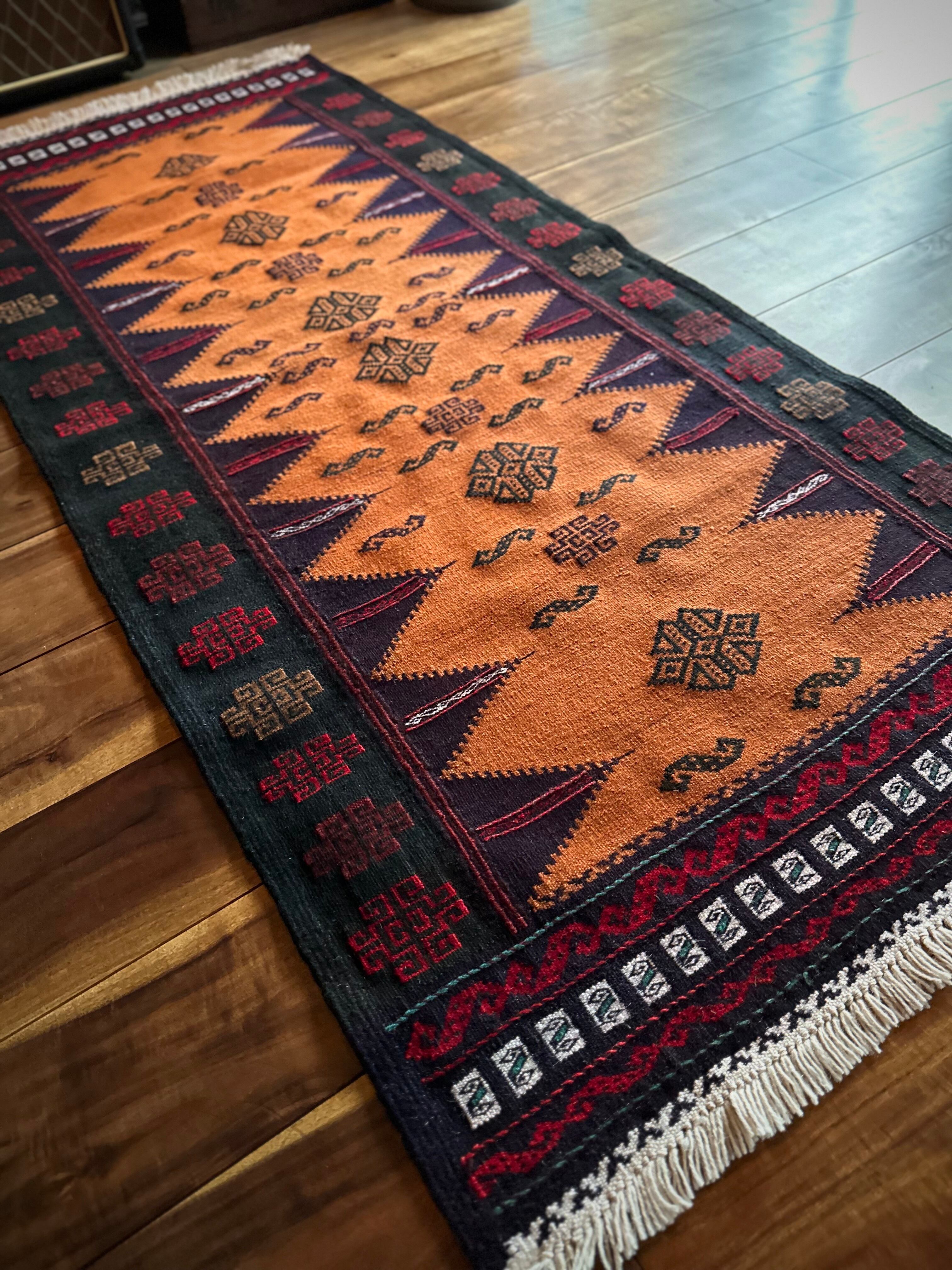 ブラックベースの中にオレンジのギザギザ模様がかっこいい、アフガニスタンはヘラート州に居住するバルーチ族のキリムで、食事の際に床に敷いて食べ物を並べるソフレと言われる食卓布になります。