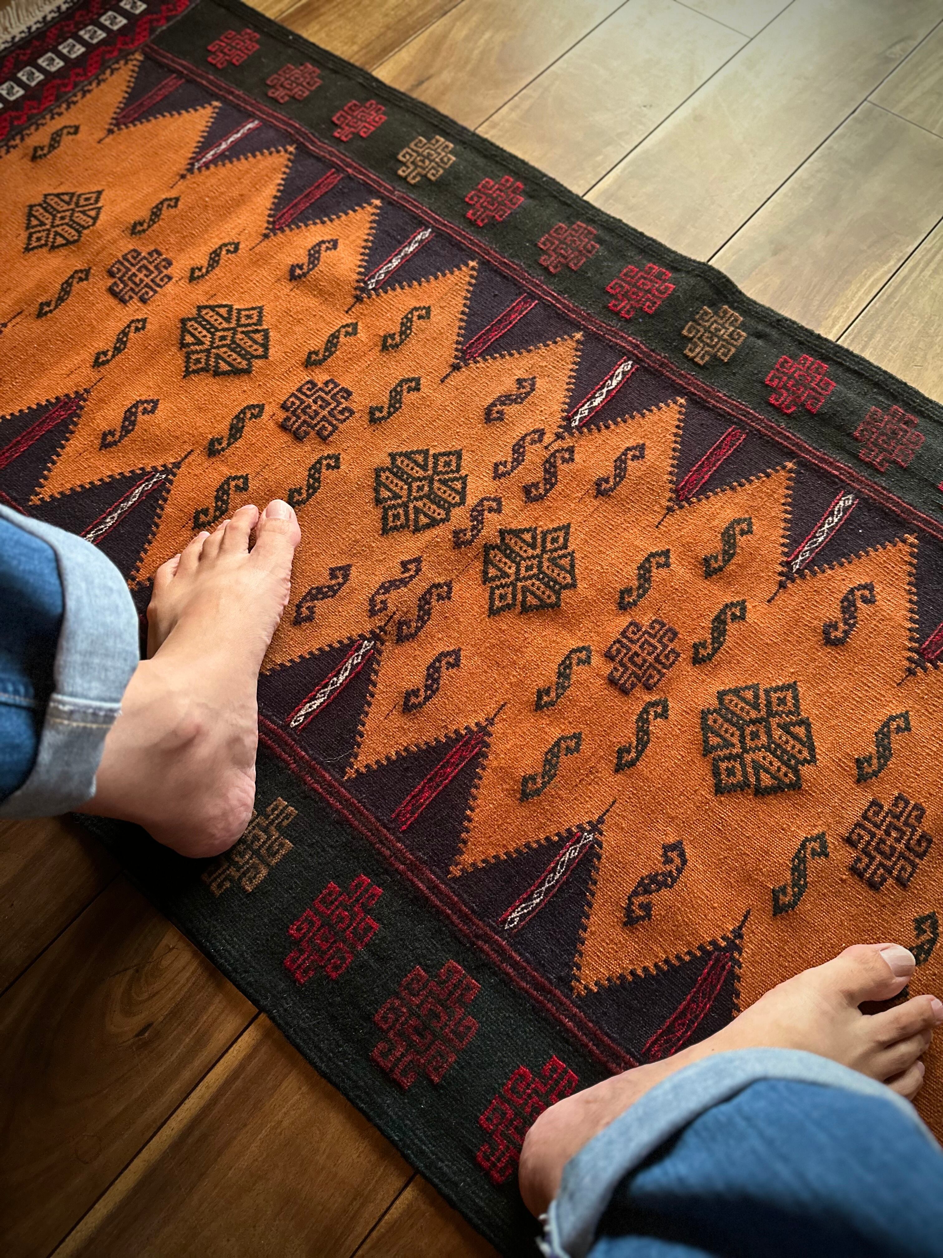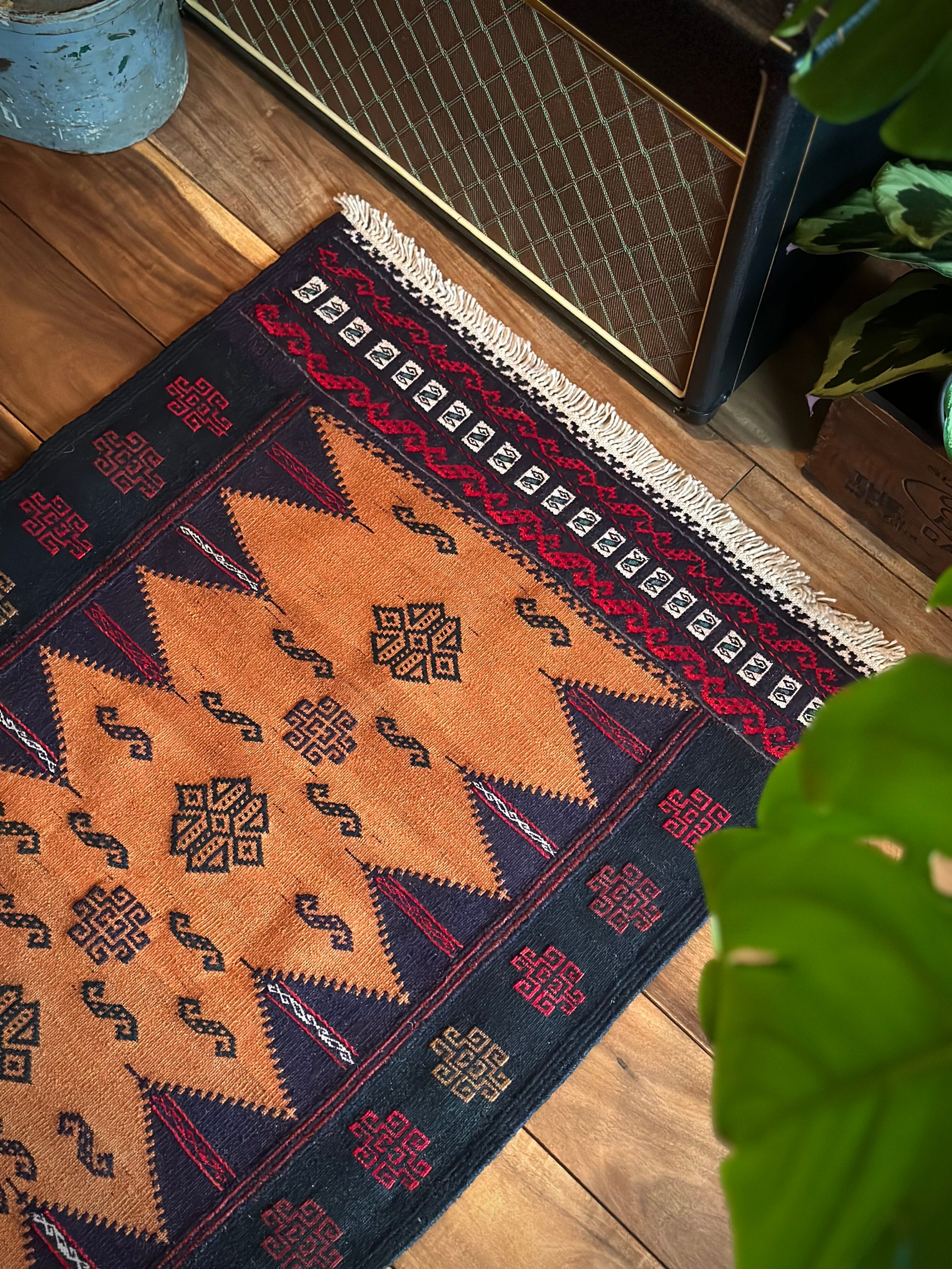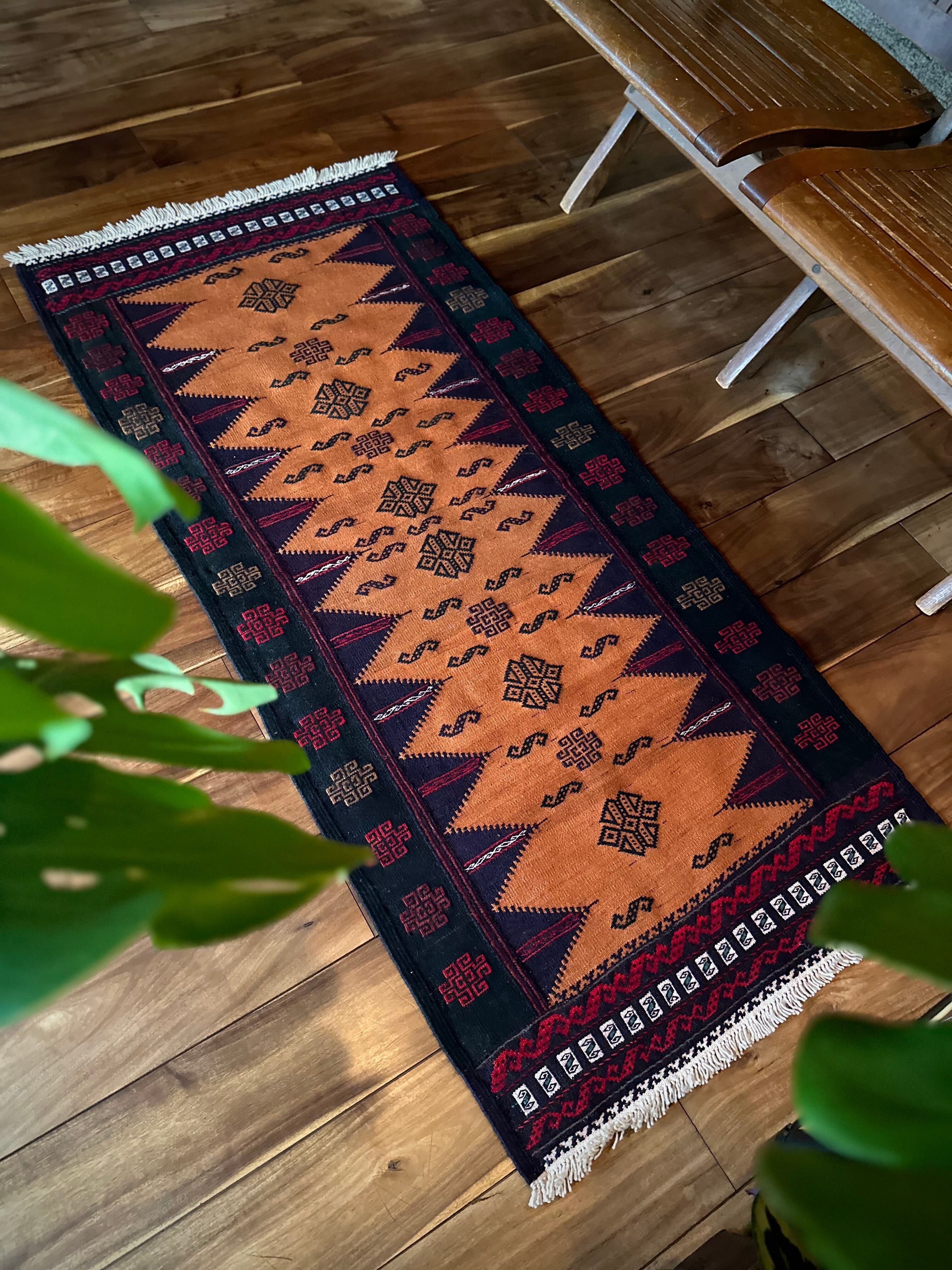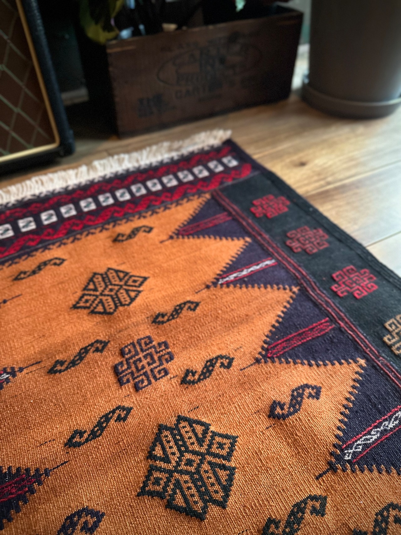 ブラックベースの中にオレンジのギザギザ模様がかっこいい、アフガニスタンはヘラート州に居住するバルーチ族のキリムで、食事の際に床に敷いて食べ物を並べるソフレと言われる食卓布になります。