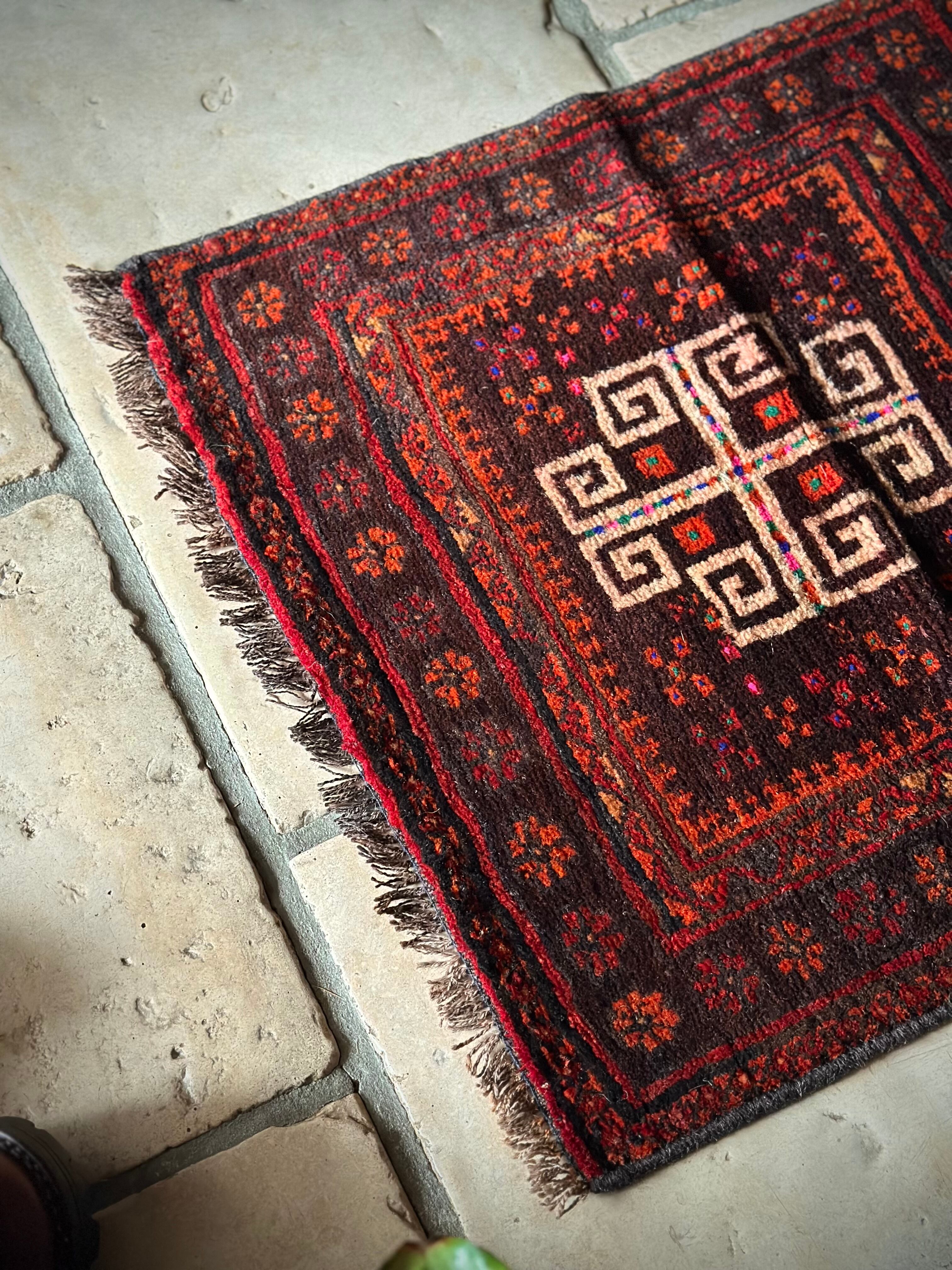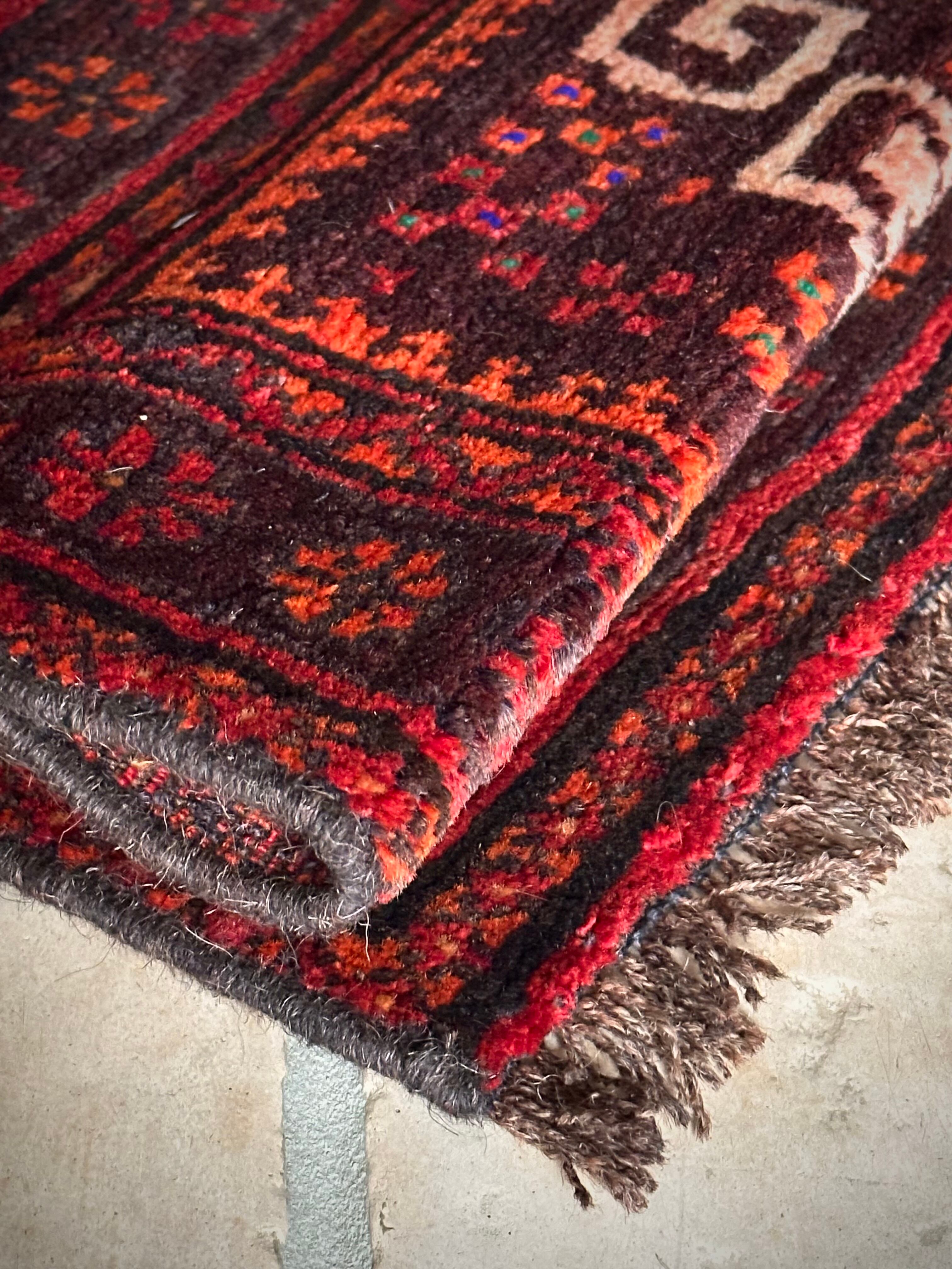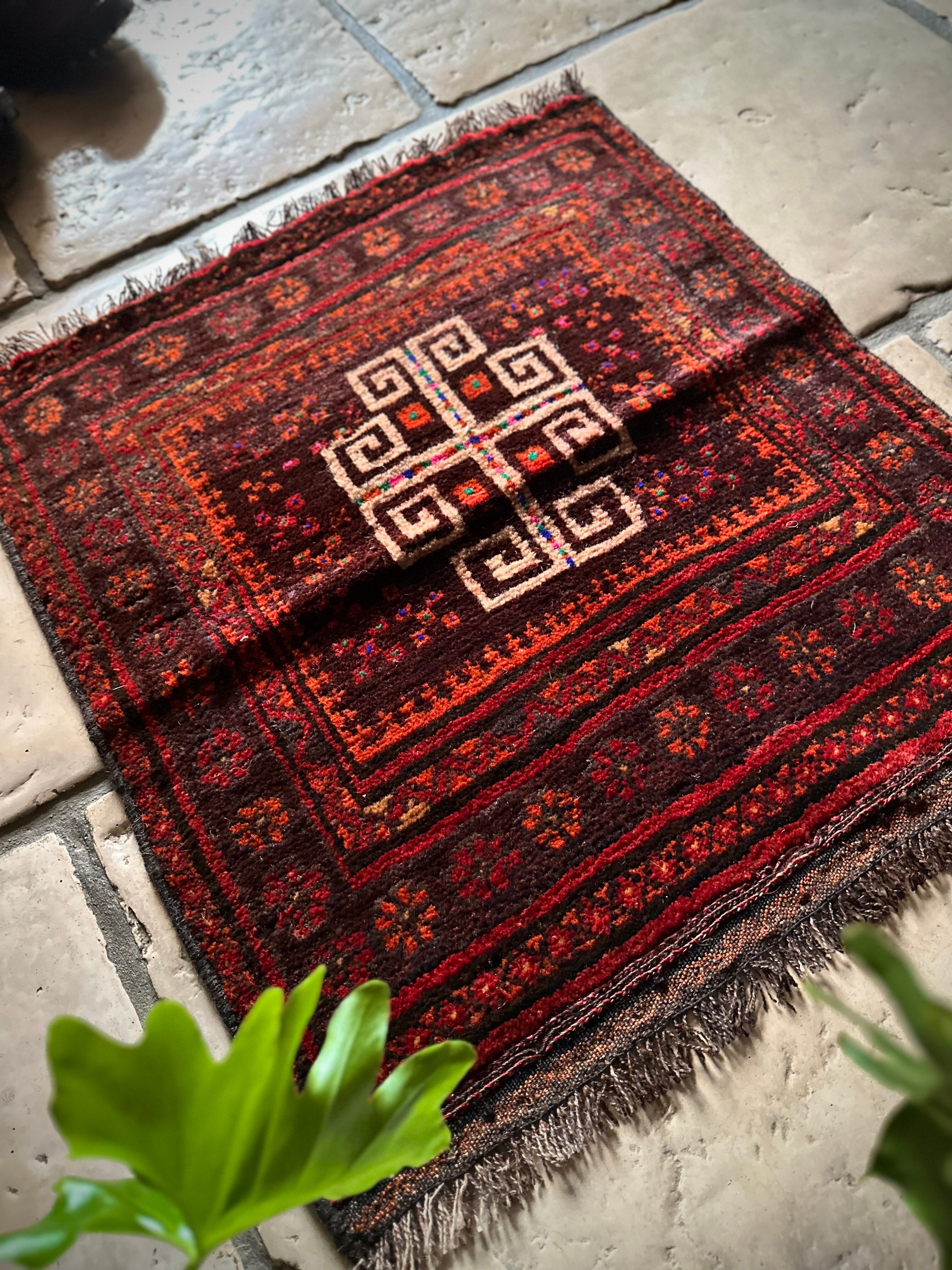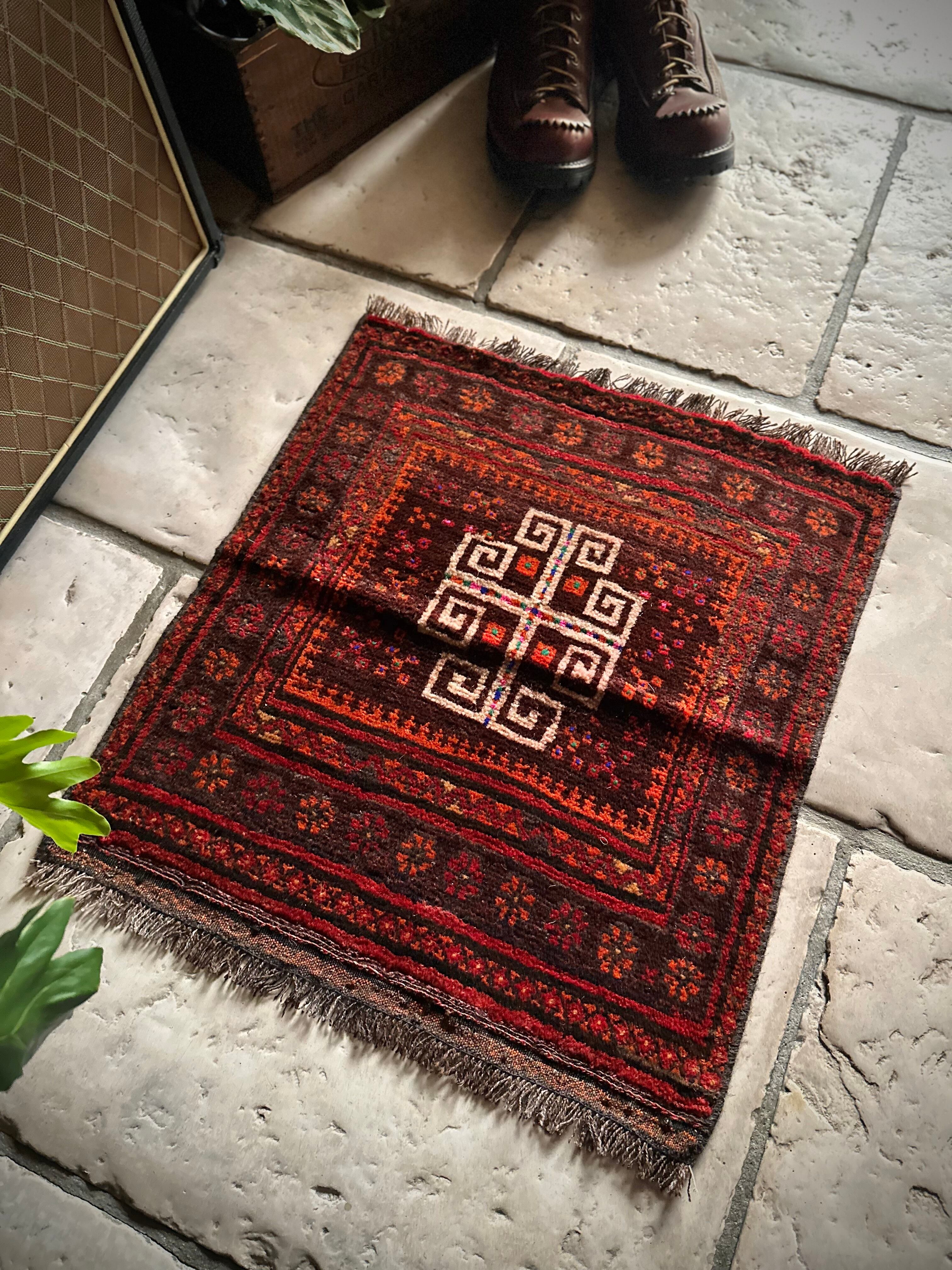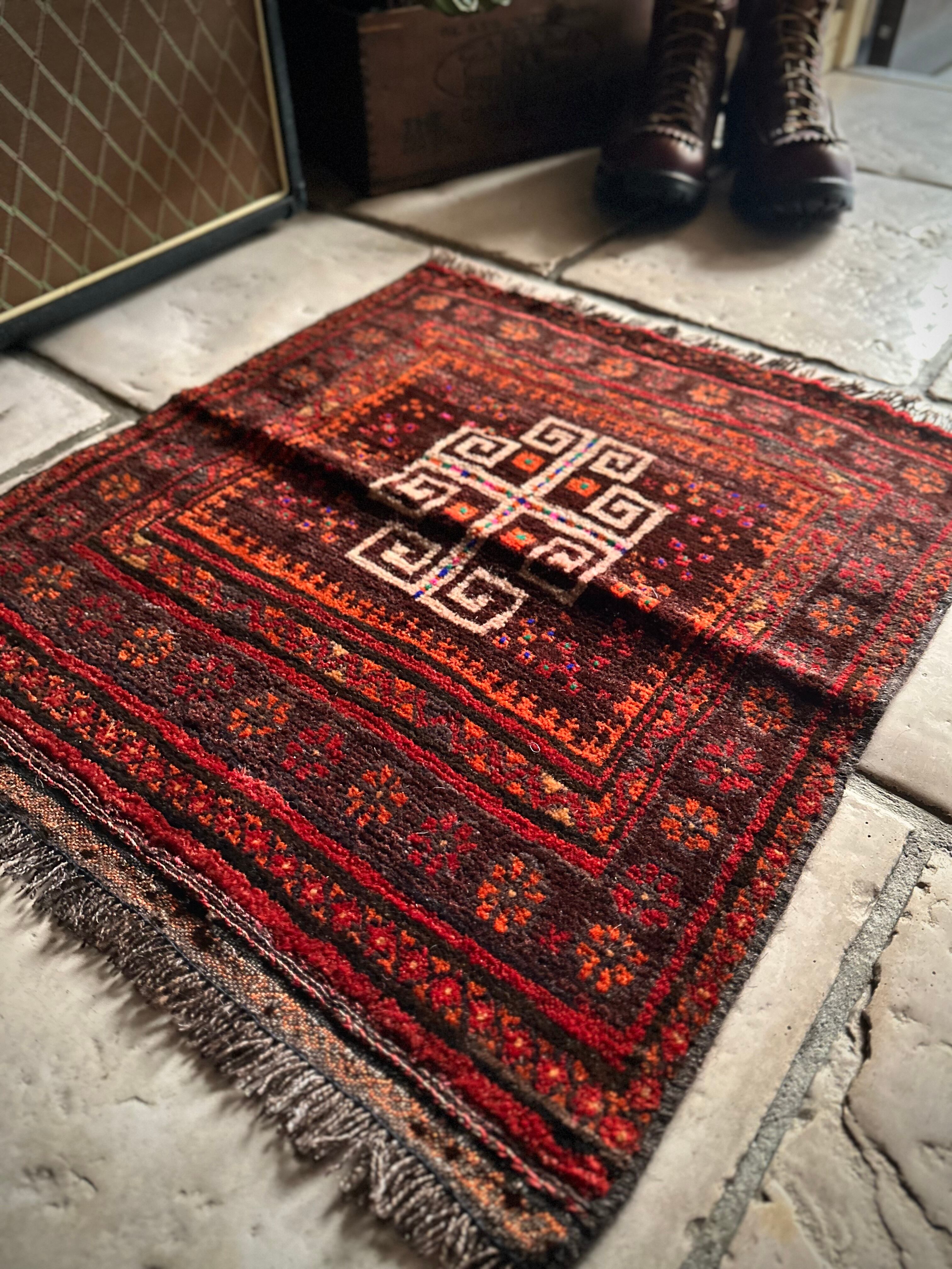 オレンジとバーガンディをベースカラーに、中央の浮き彫りにされた紋様にぐるりと囲んだ花柄模様がバルーチ族らしいトライバルラグで、元々はホルジンと呼ばれるラクダやロバの背に跨がせるサドルバッグの表皮をラグに仕立て直したモノになり、本来なら2対セットの内の片側だけになります。