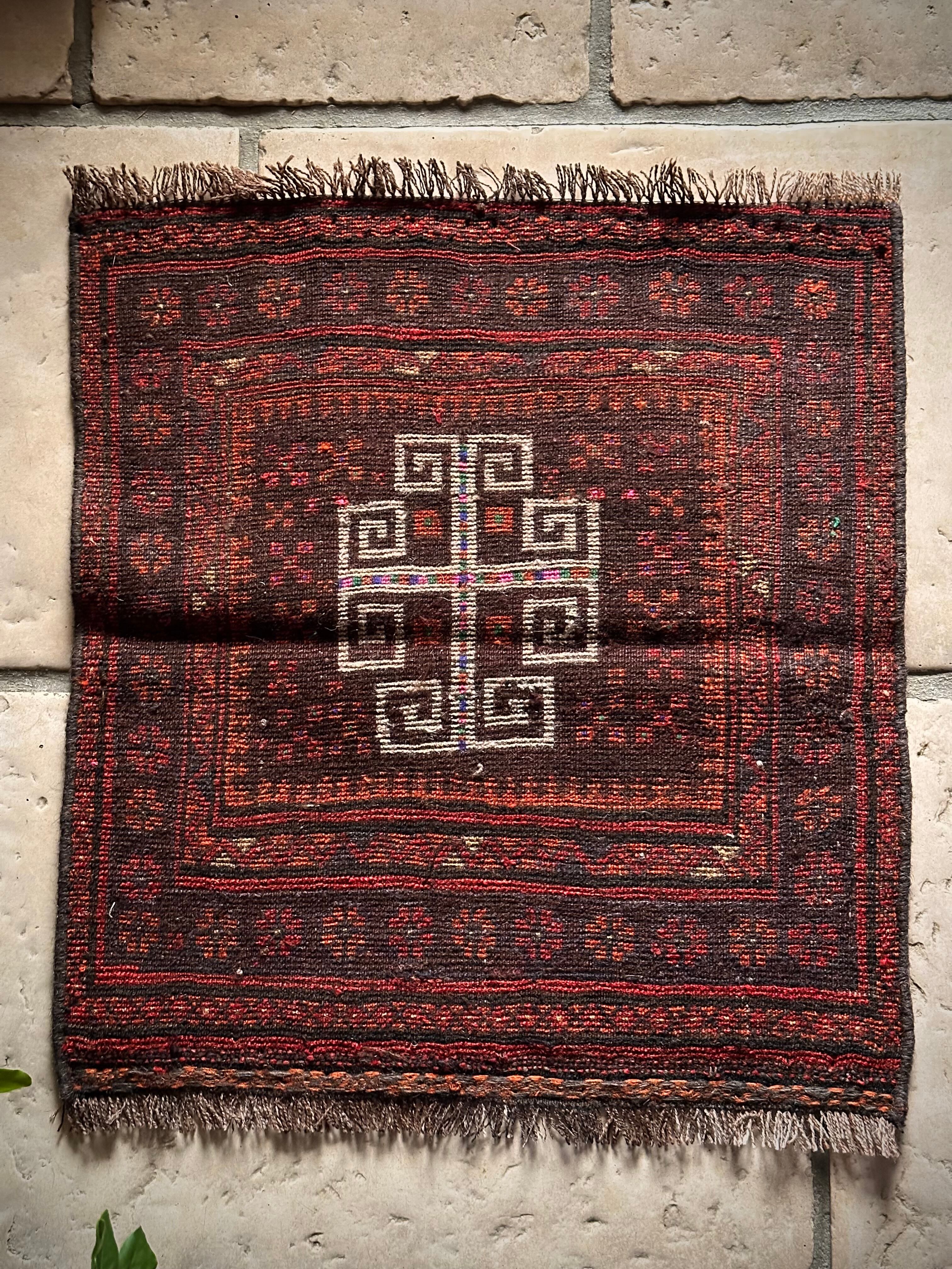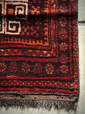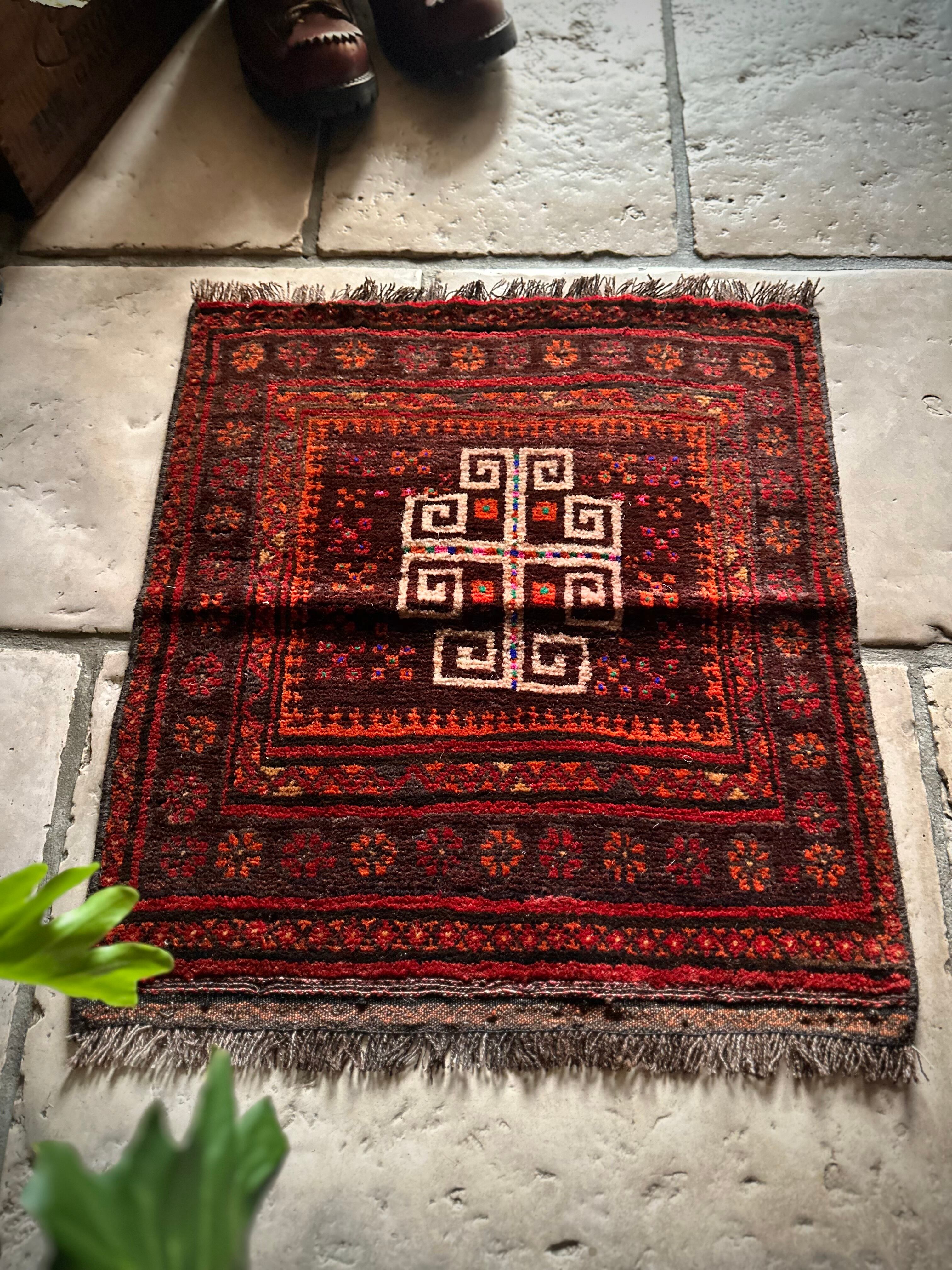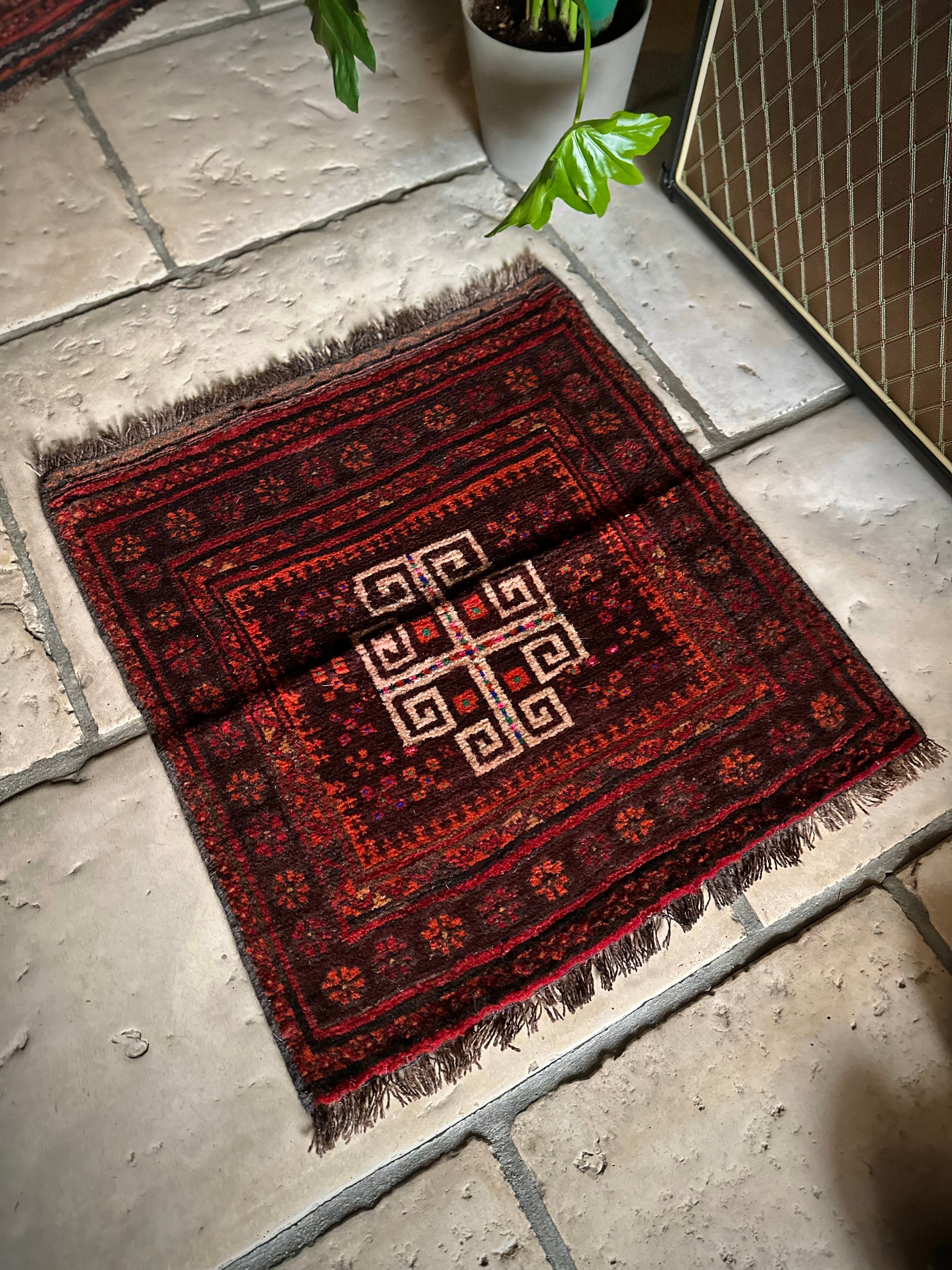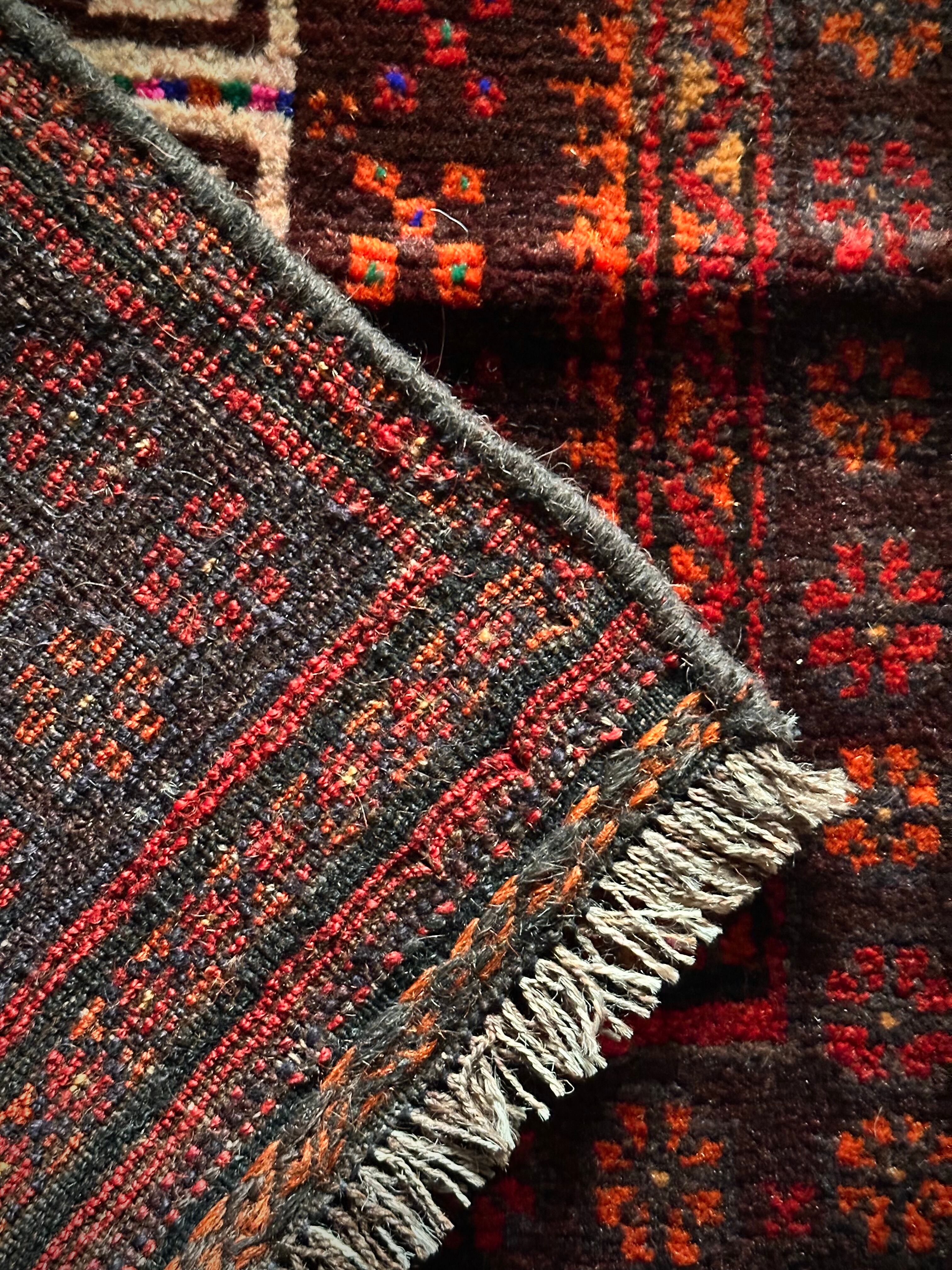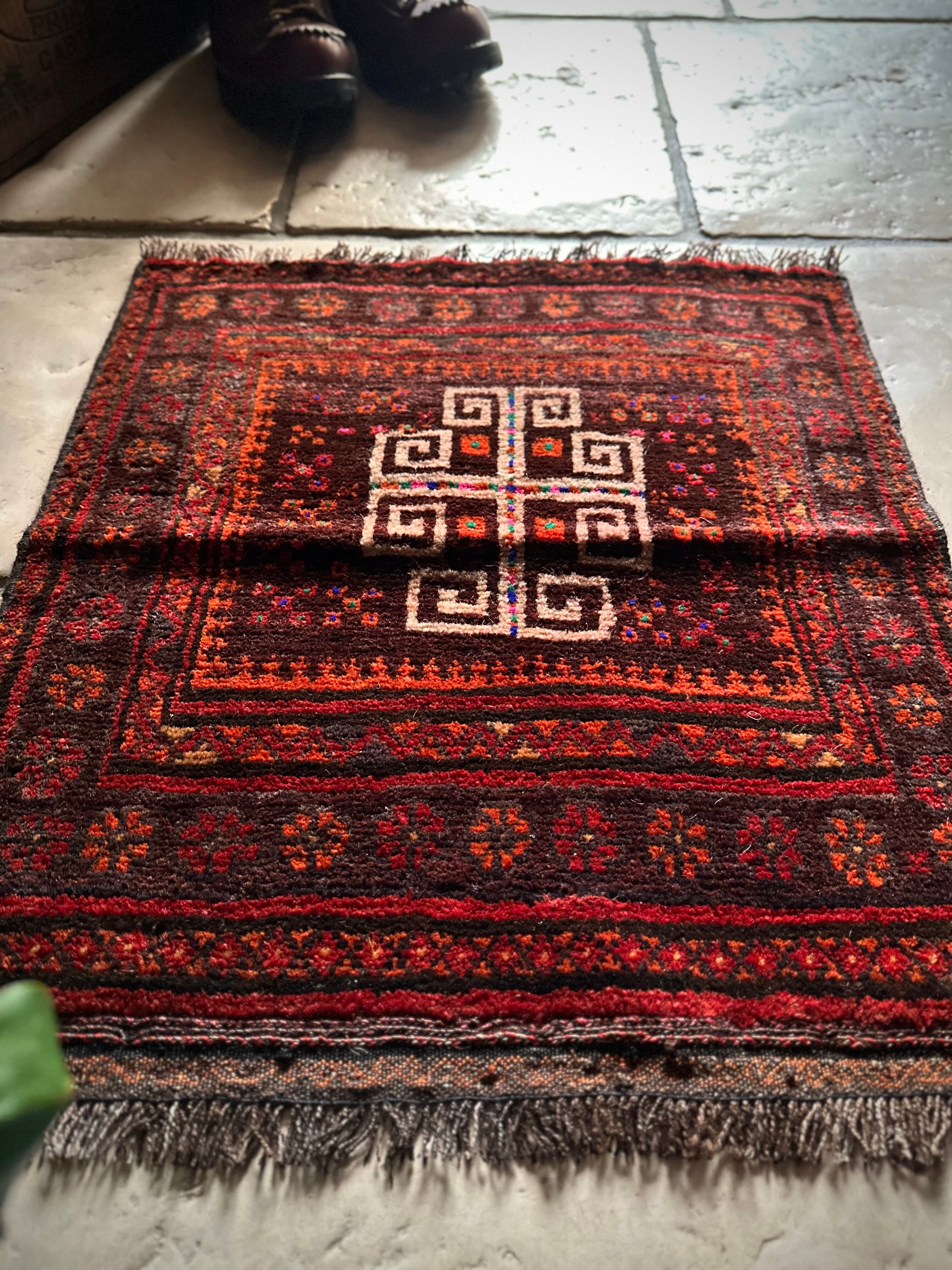 オレンジとバーガンディをベースカラーに、中央の浮き彫りにされた紋様にぐるりと囲んだ花柄模様がバルーチ族らしいトライバルラグで、元々はホルジンと呼ばれるラクダやロバの背に跨がせるサドルバッグの表皮をラグに仕立て直したモノになり、本来なら2対セットの内の片側だけになります。