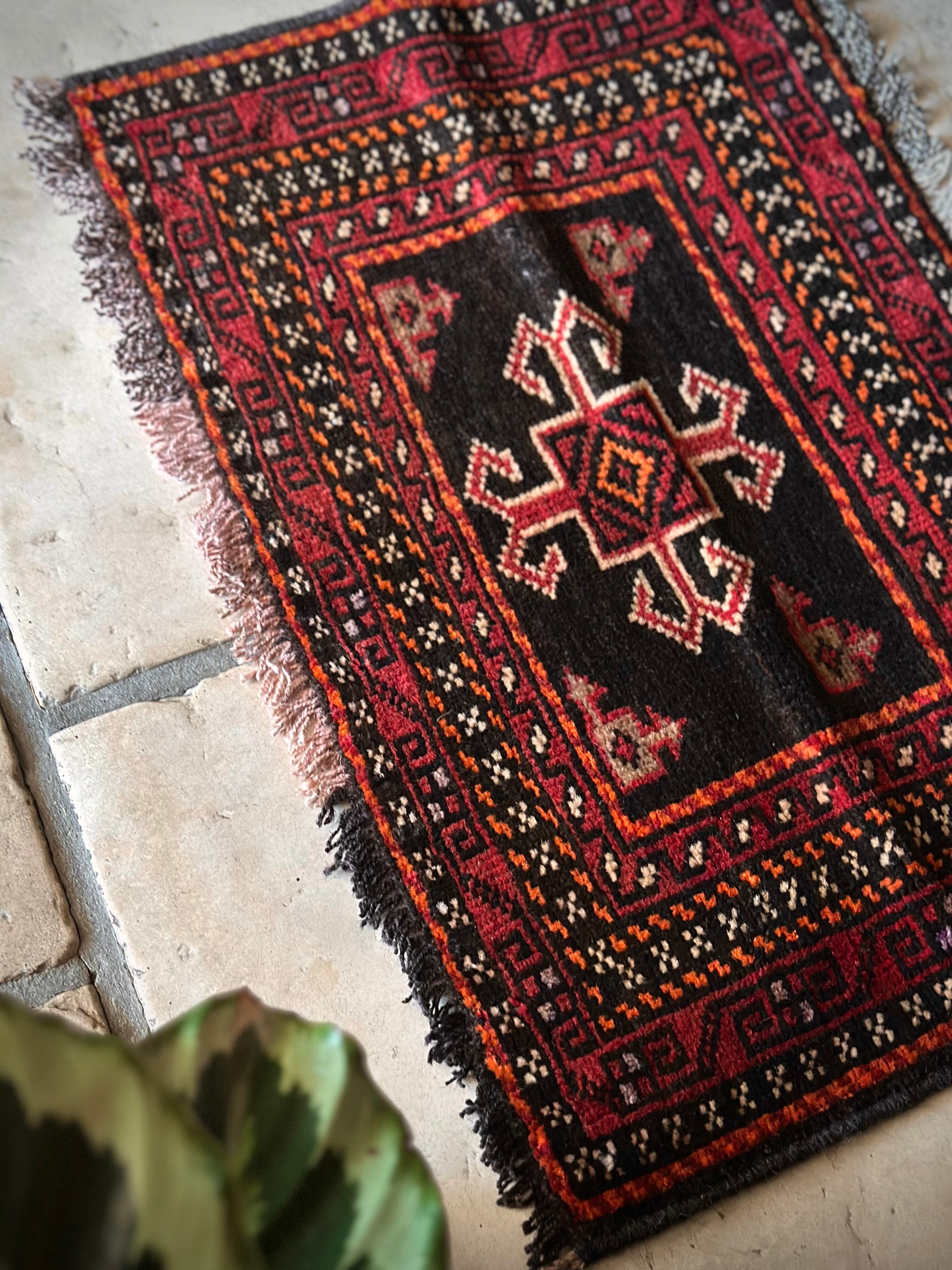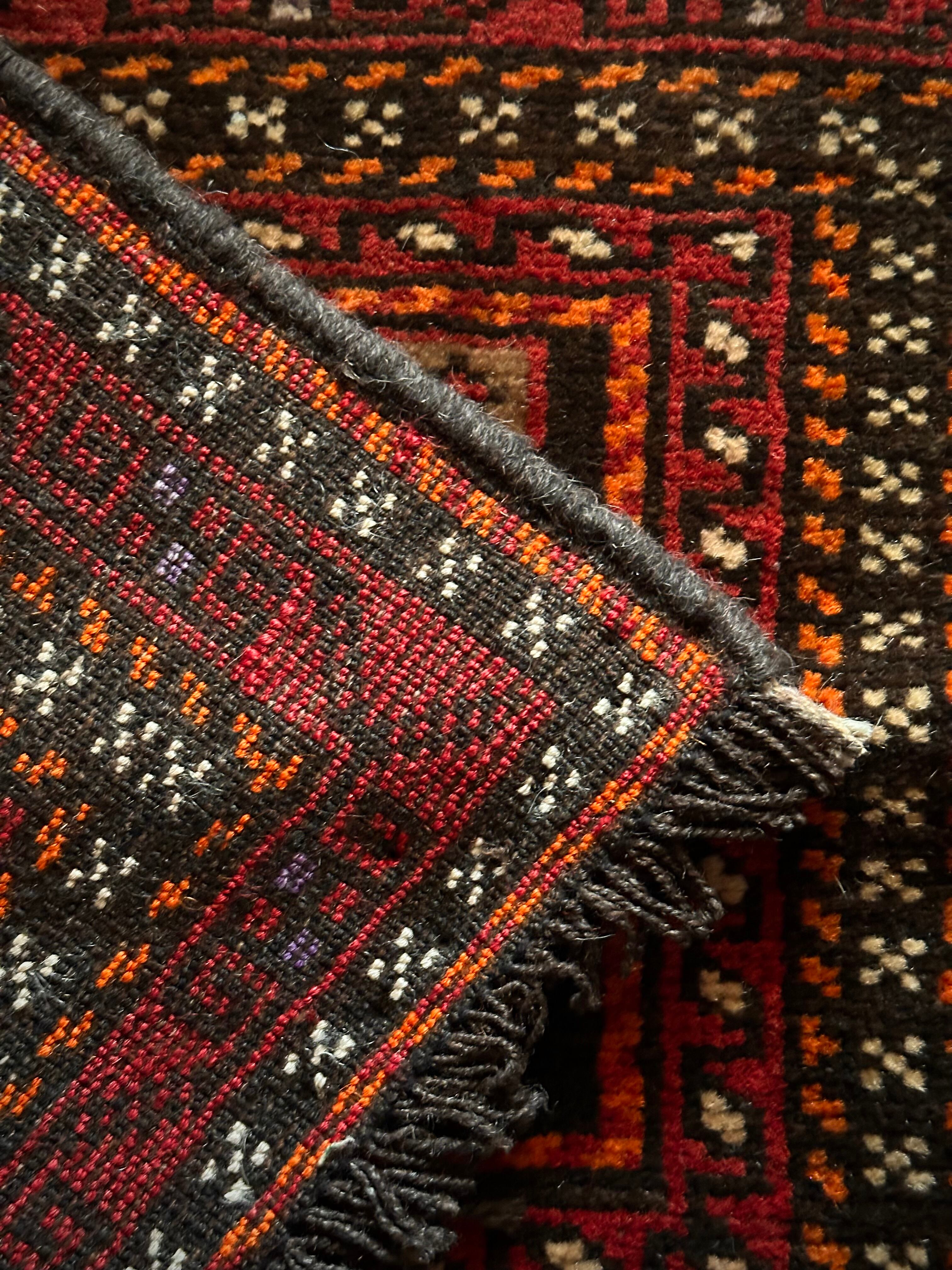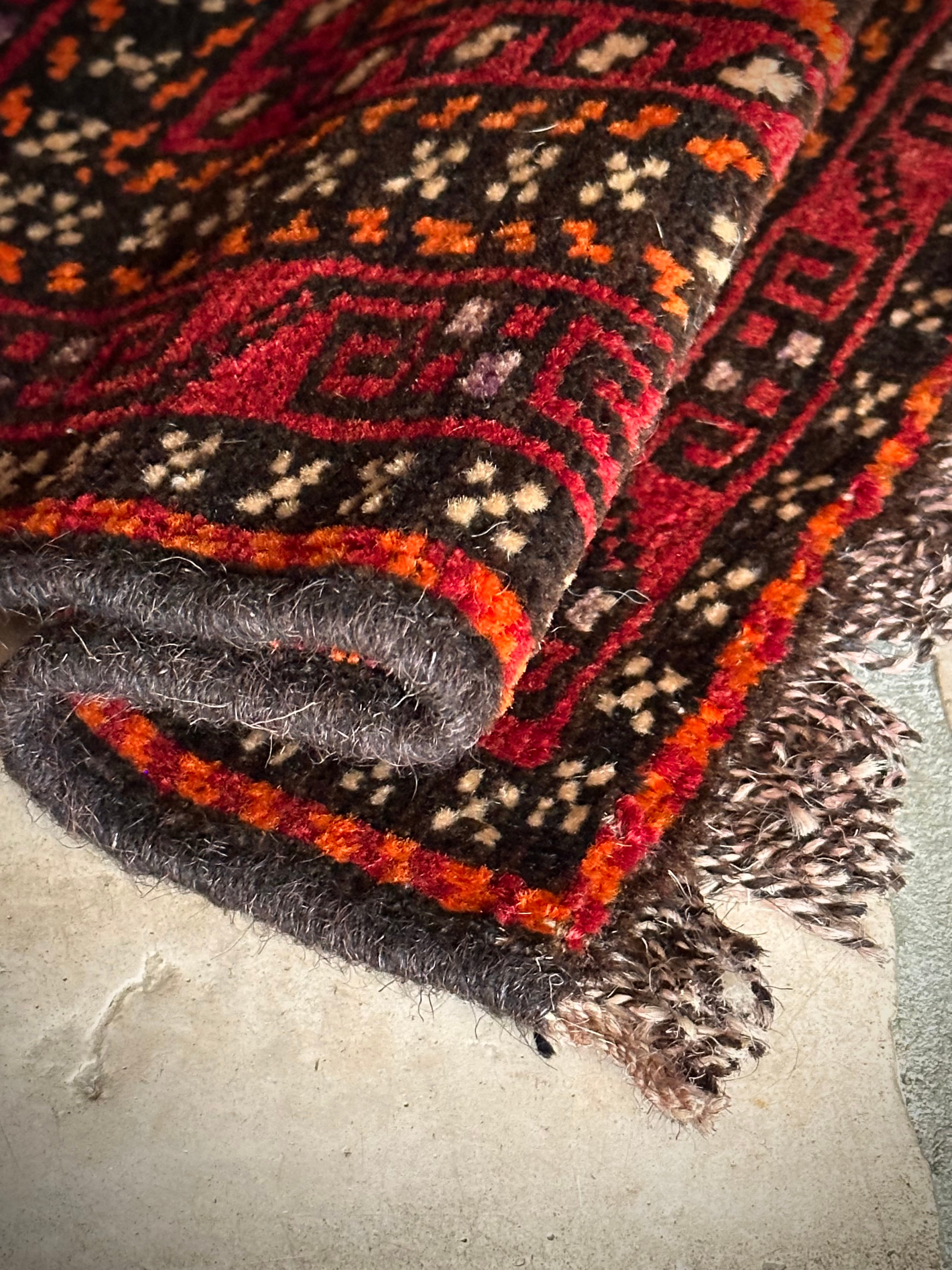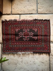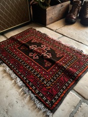 小振りなサイズながらもテラコッタベースに細かなミルフィーユ状の模様がヘラート産バルーチらしいトライバルラグで、元々はホルジンと呼ばれるラクダやロバの背に跨がせるサドルバッグの表皮をラグに仕立て直したモノになり、本来なら2対セットの内の片側だけになります。
