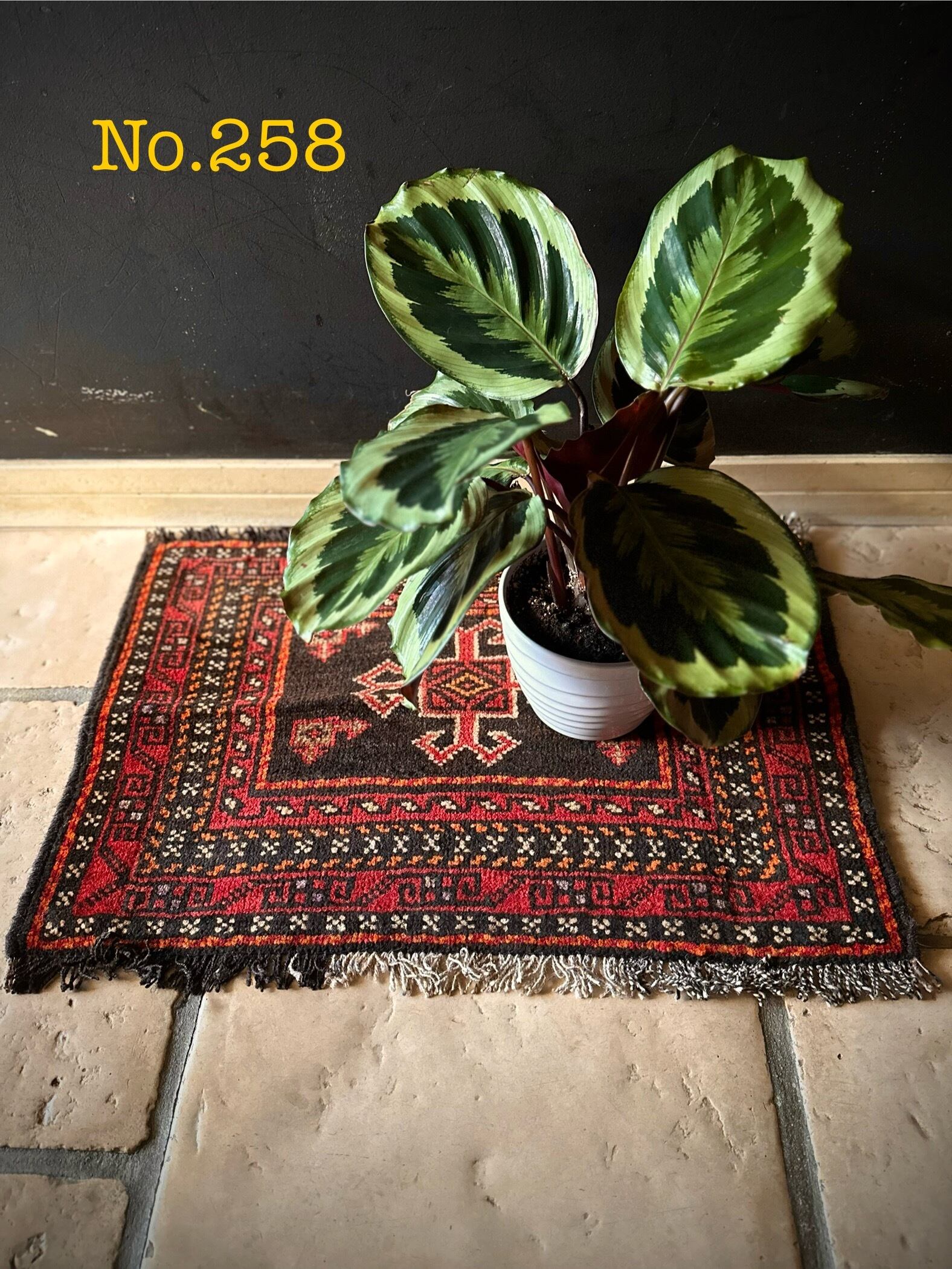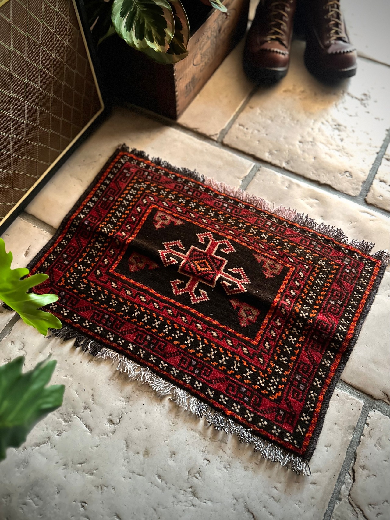 見た目にも使い勝手の良さそうなミニラグ仕立てでキリムエンドの装飾もかっこよく、ちょっとした足下はもちろんソファの座面やテーブルなんかにも多用出来るテキスタイルでしょうか。ここ最近では植物の鉢置き敷きとしてもより良い雰囲気が楽しめる1枚になります。