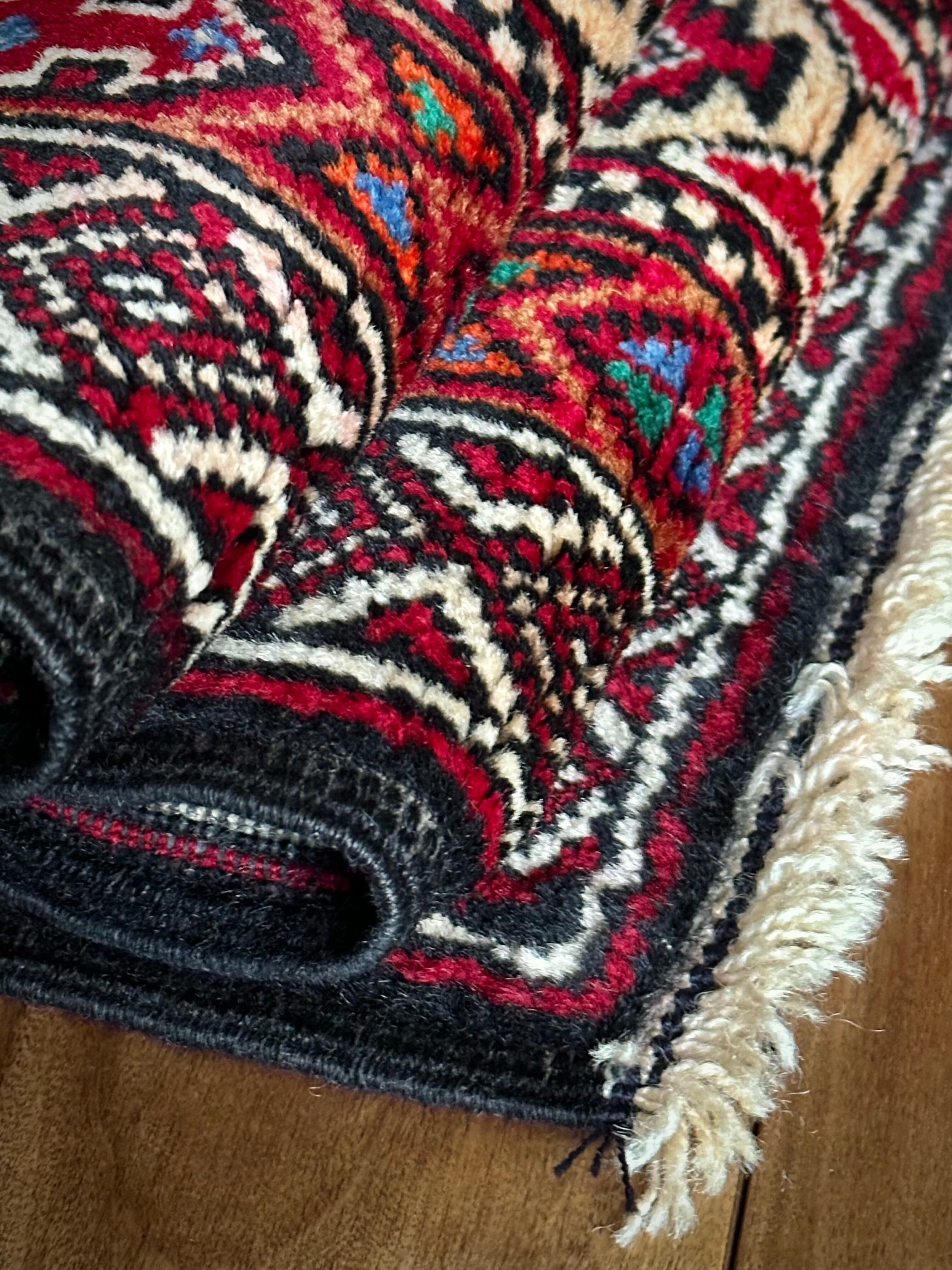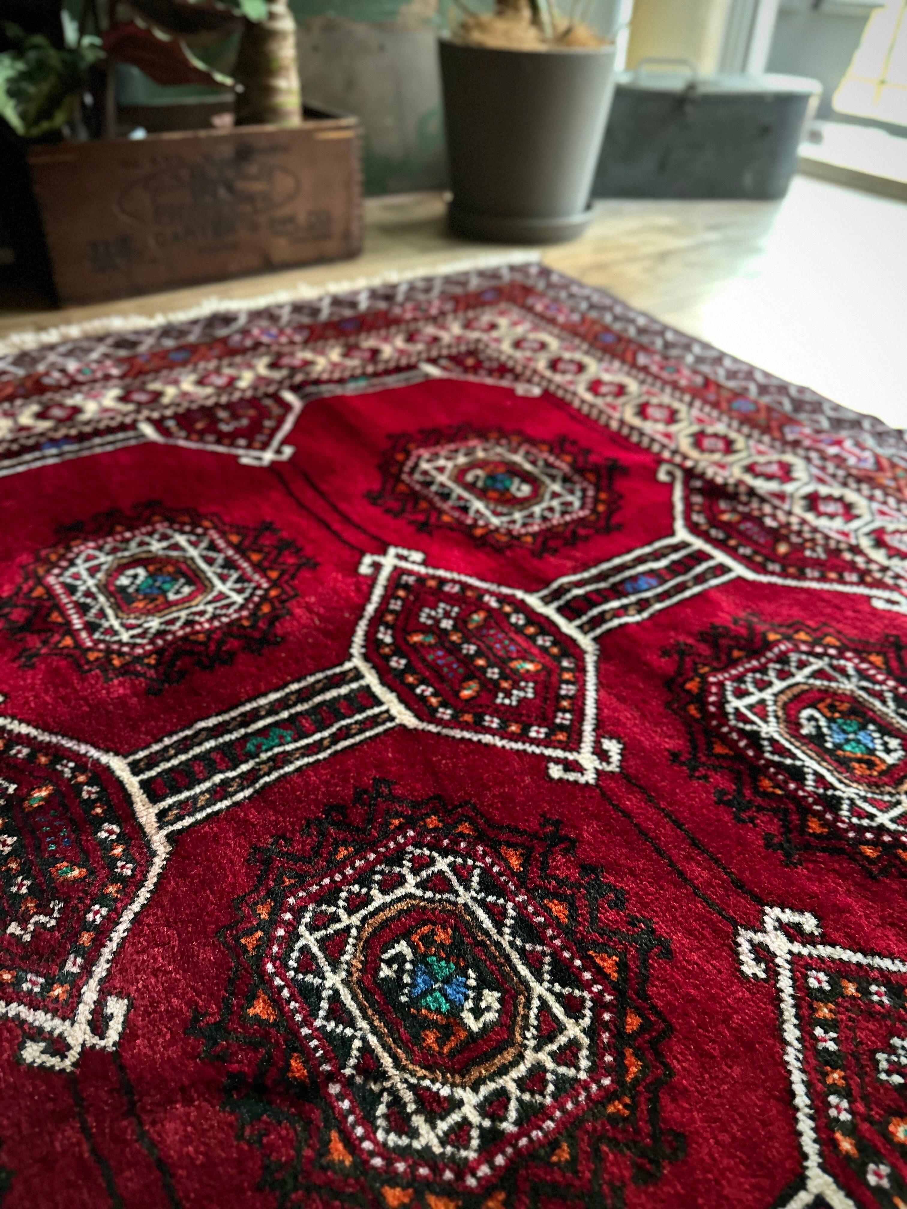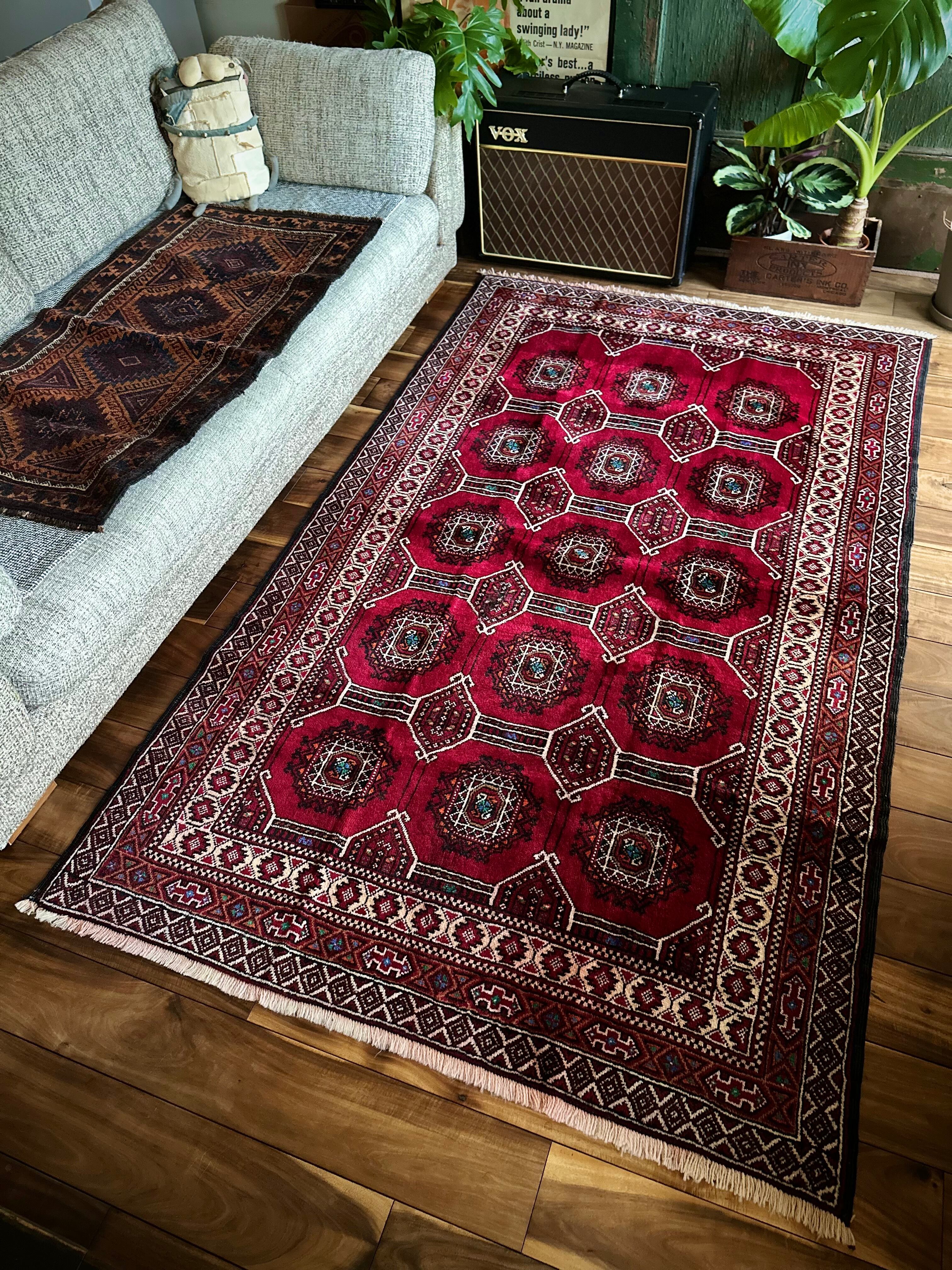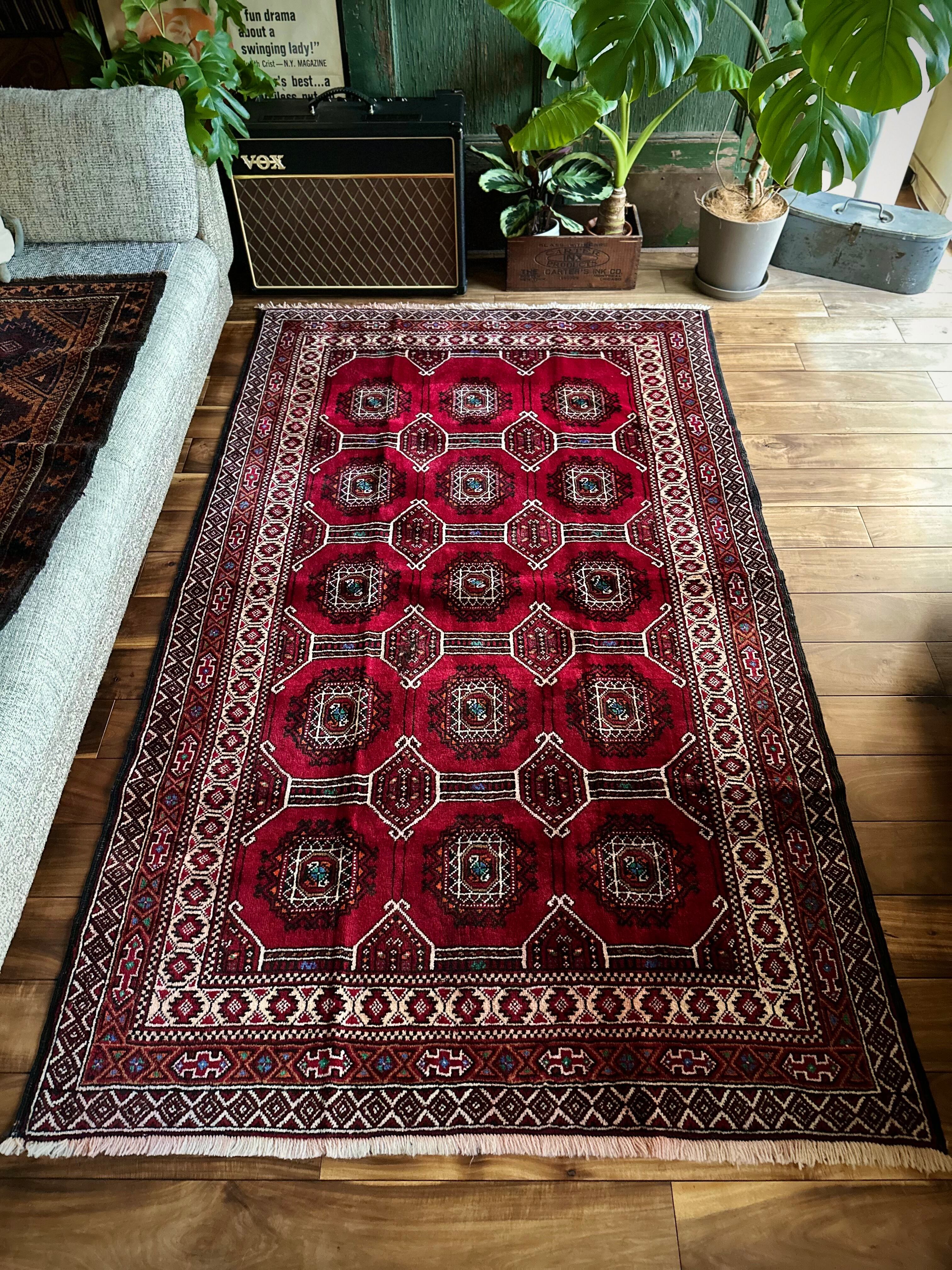 真紅なバーガンディにデフォルメされたギュルが並ぶかっこいいこちらは、イラン東部に居住するバルーチ族のトライバルラグで、小さなターコイズブルーがまるで宝石のように良いアクセントになった秀逸な1枚になります。