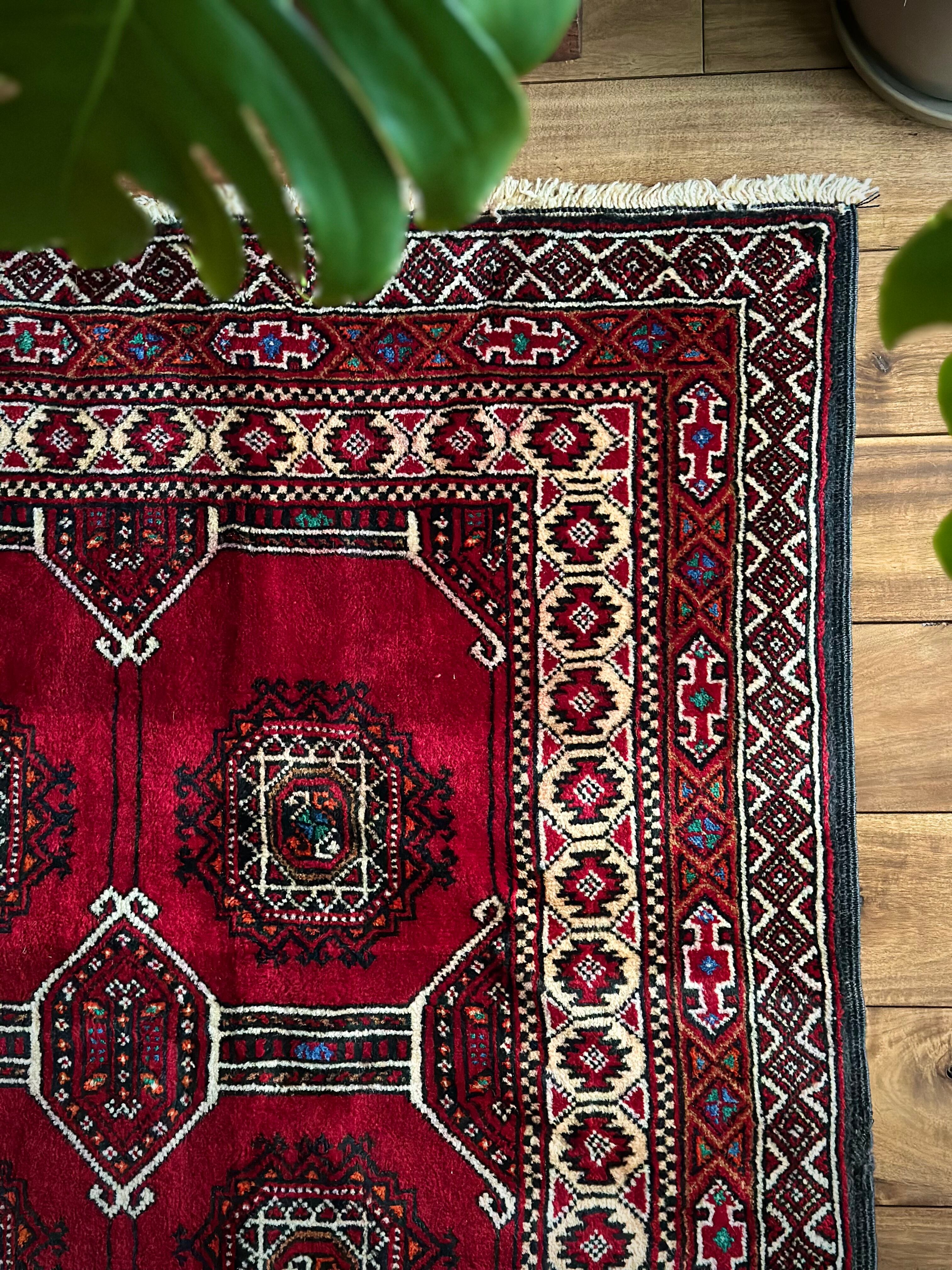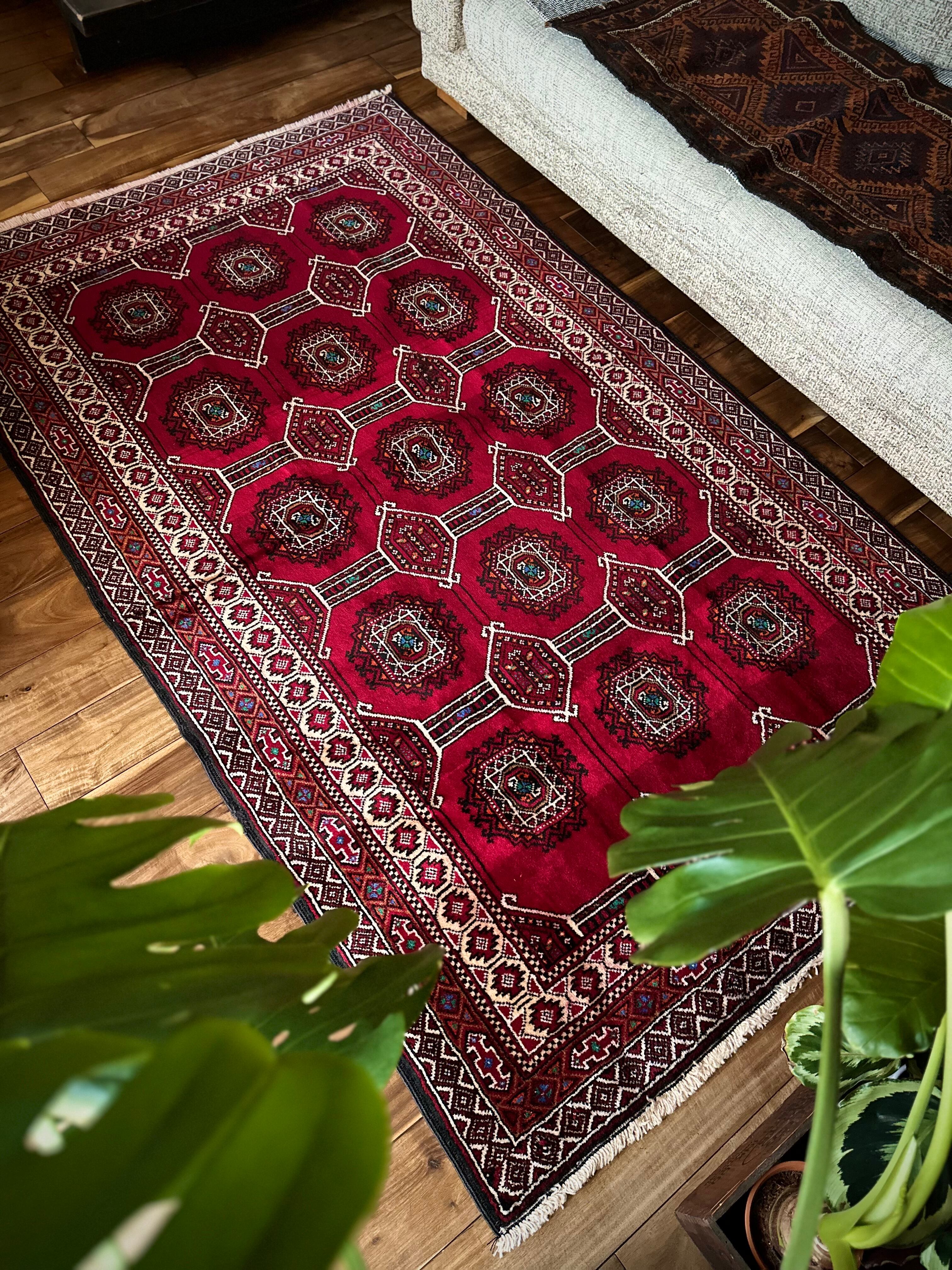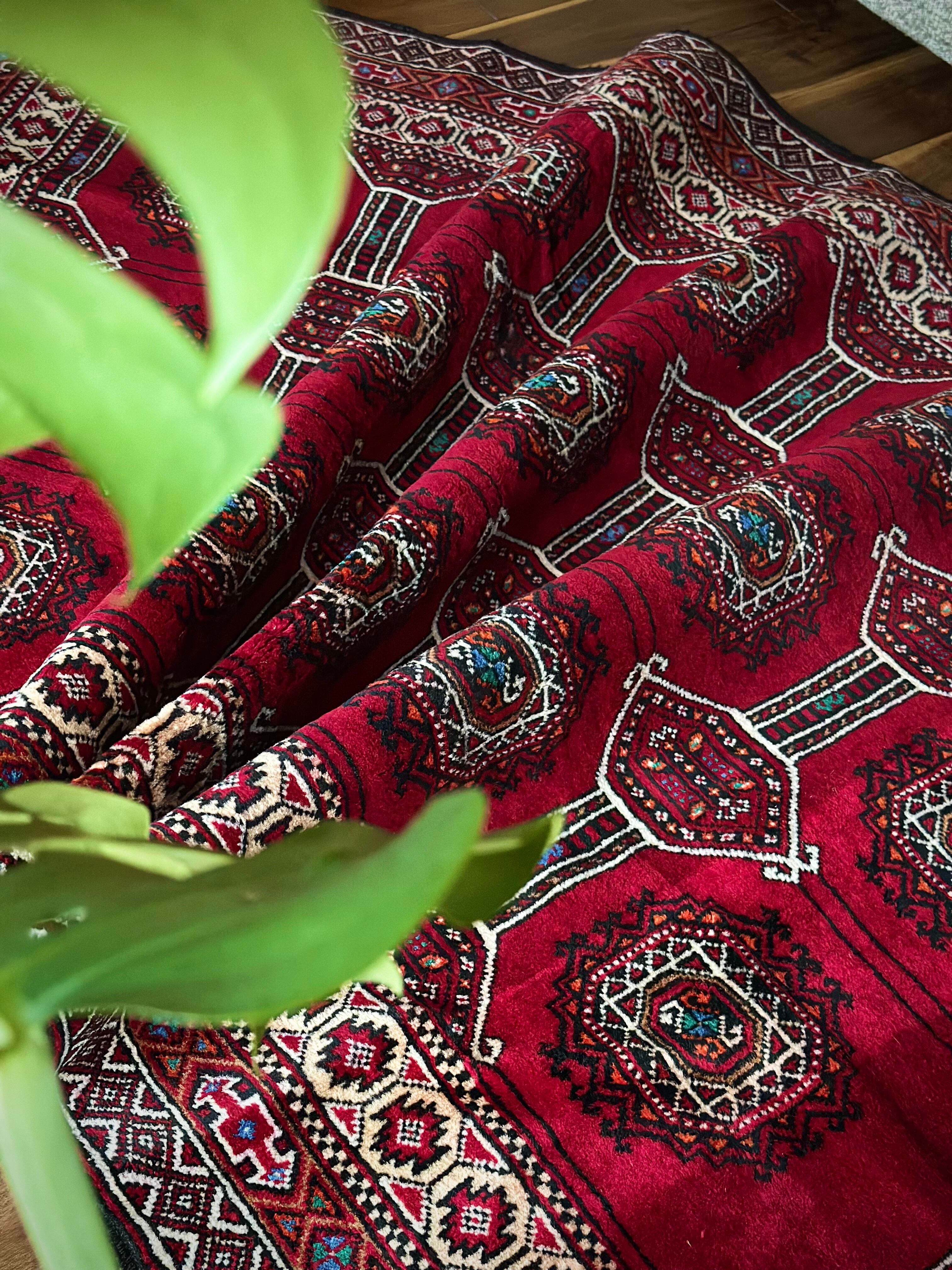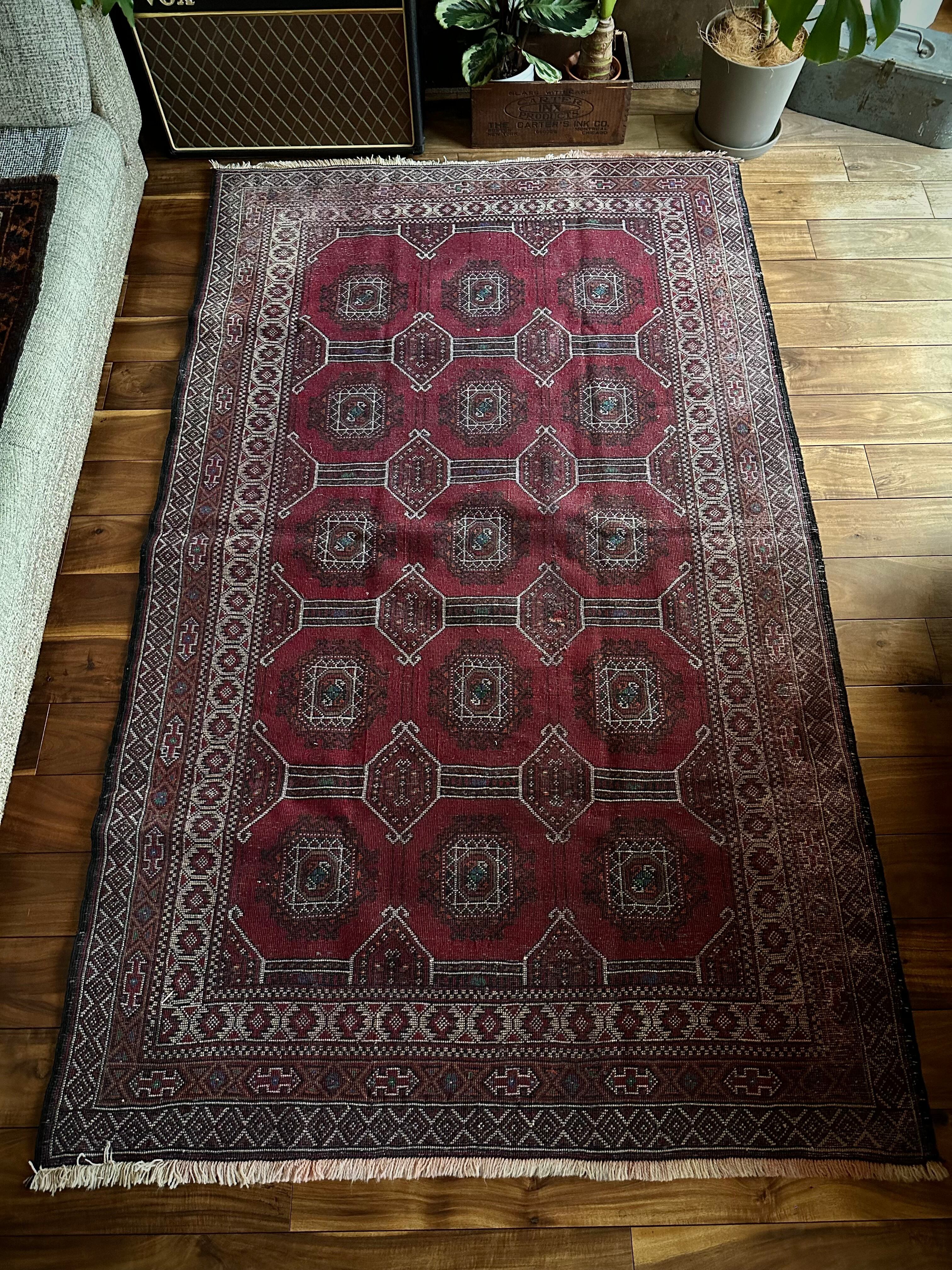 真紅なバーガンディにデフォルメされたギュルが並ぶかっこいいこちらは、イラン東部に居住するバルーチ族のトライバルラグで、小さなターコイズブルーがまるで宝石のように良いアクセントになった秀逸な1枚になります。