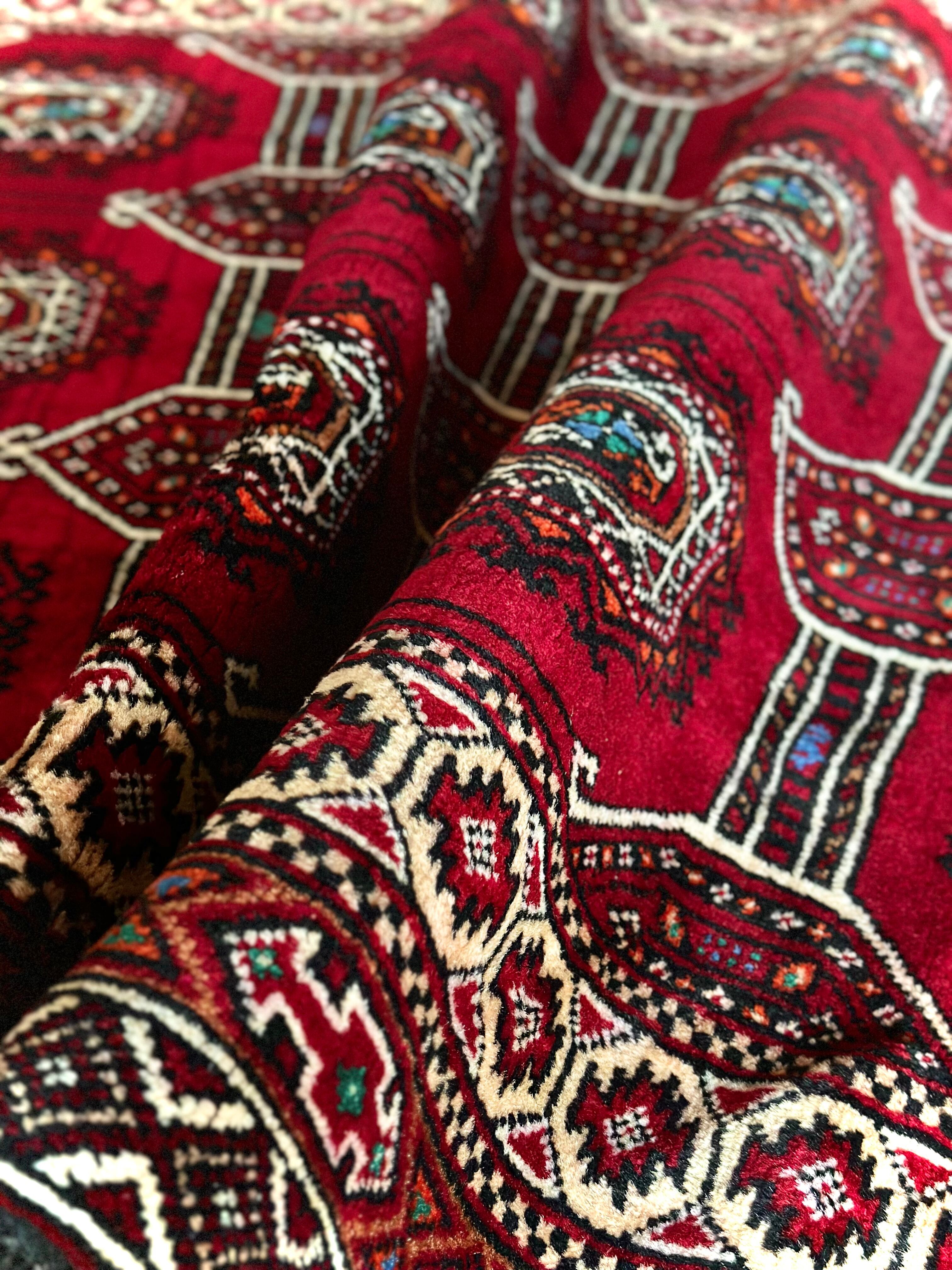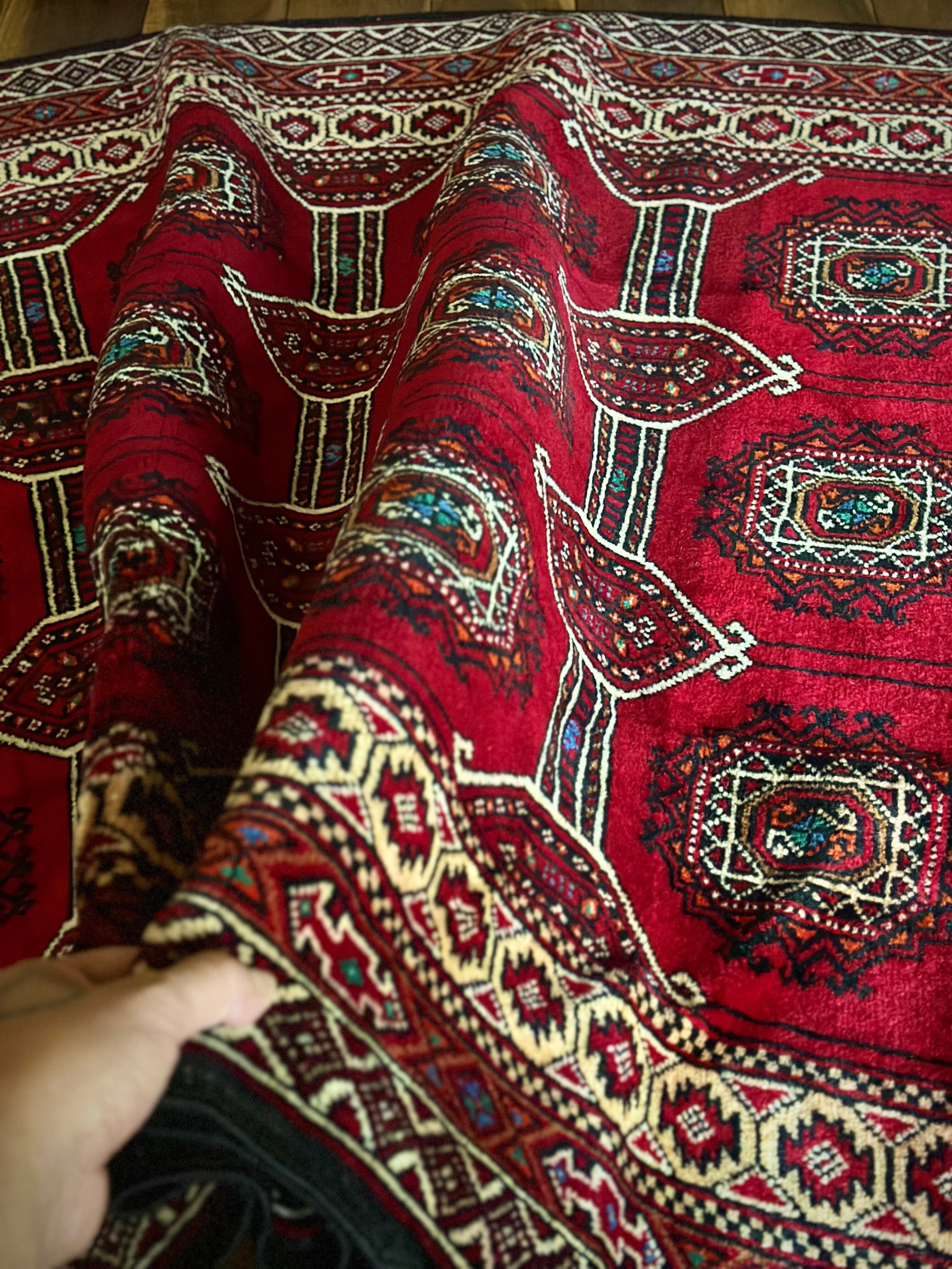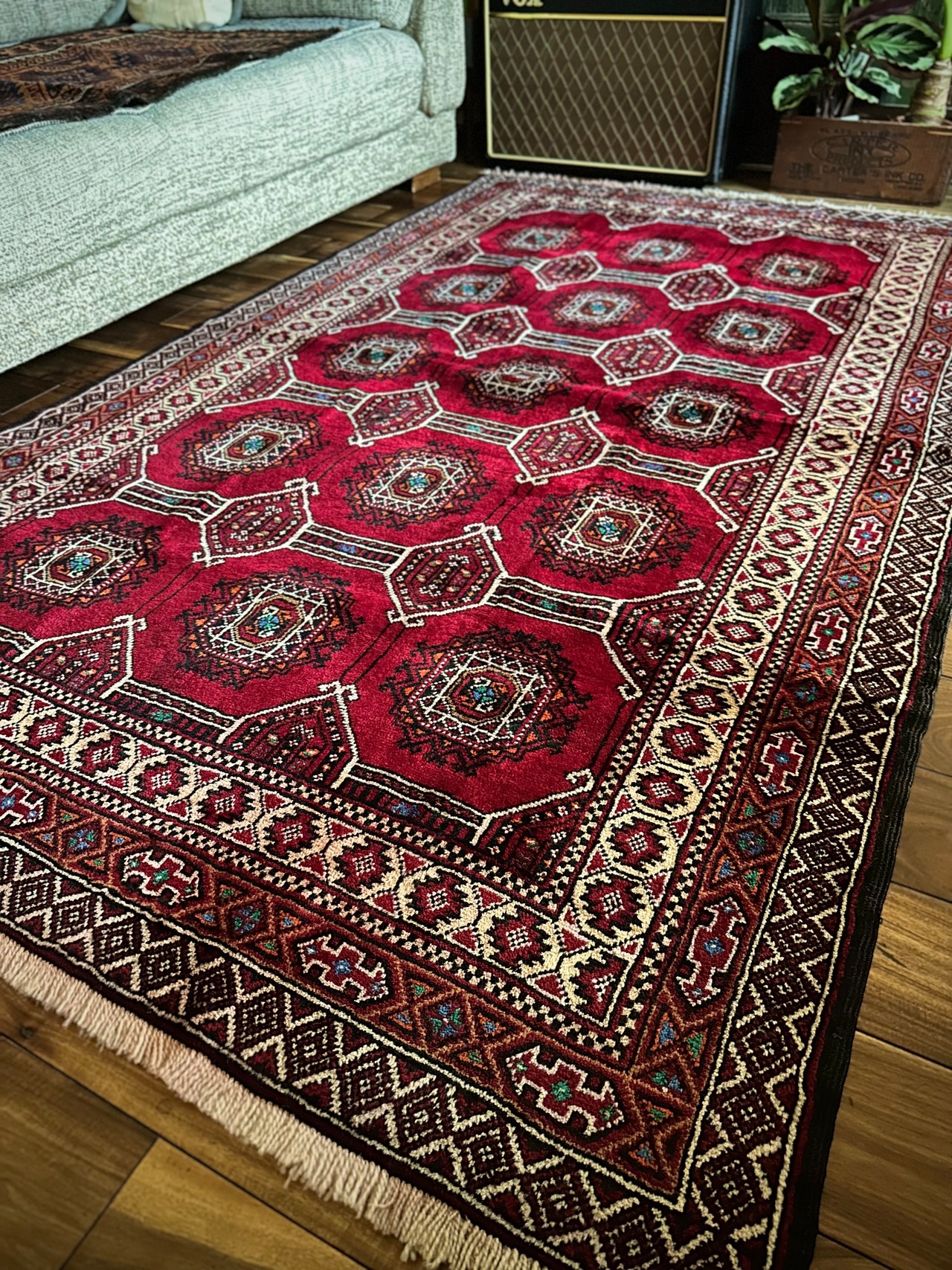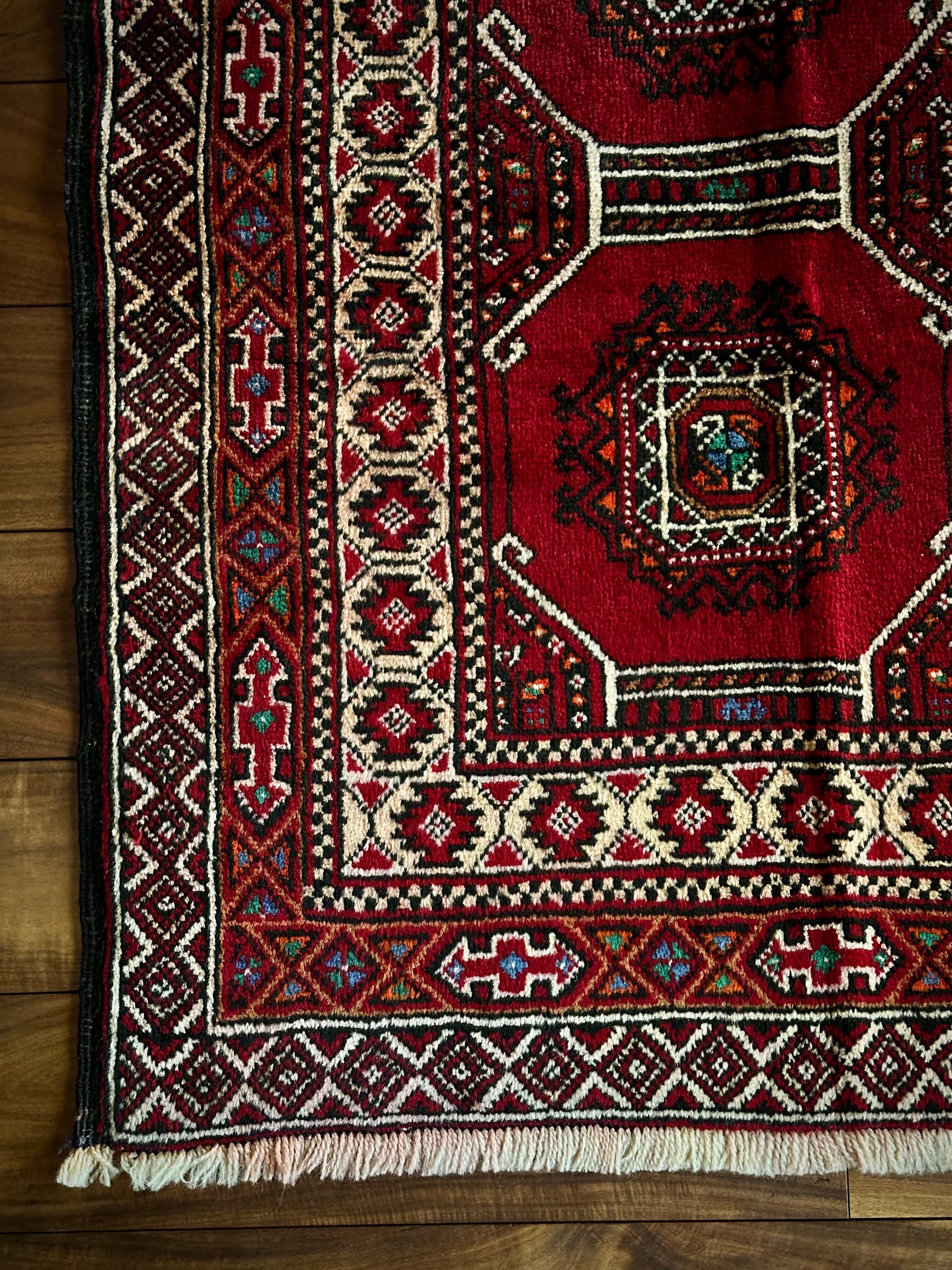 真紅なバーガンディにデフォルメされたギュルが並ぶかっこいいこちらは、イラン東部に居住するバルーチ族のトライバルラグで、小さなターコイズブルーがまるで宝石のように良いアクセントになった秀逸な1枚になります。