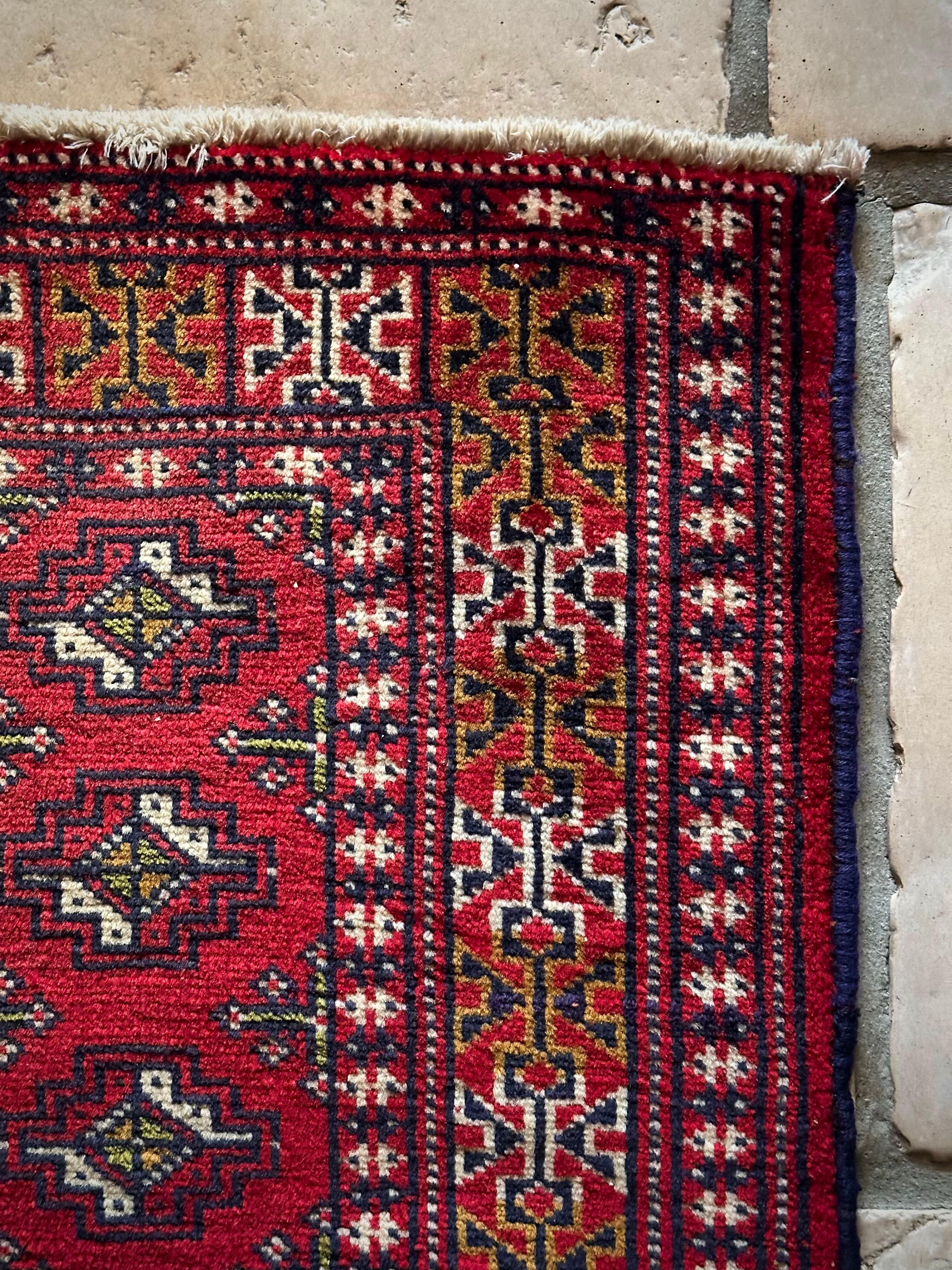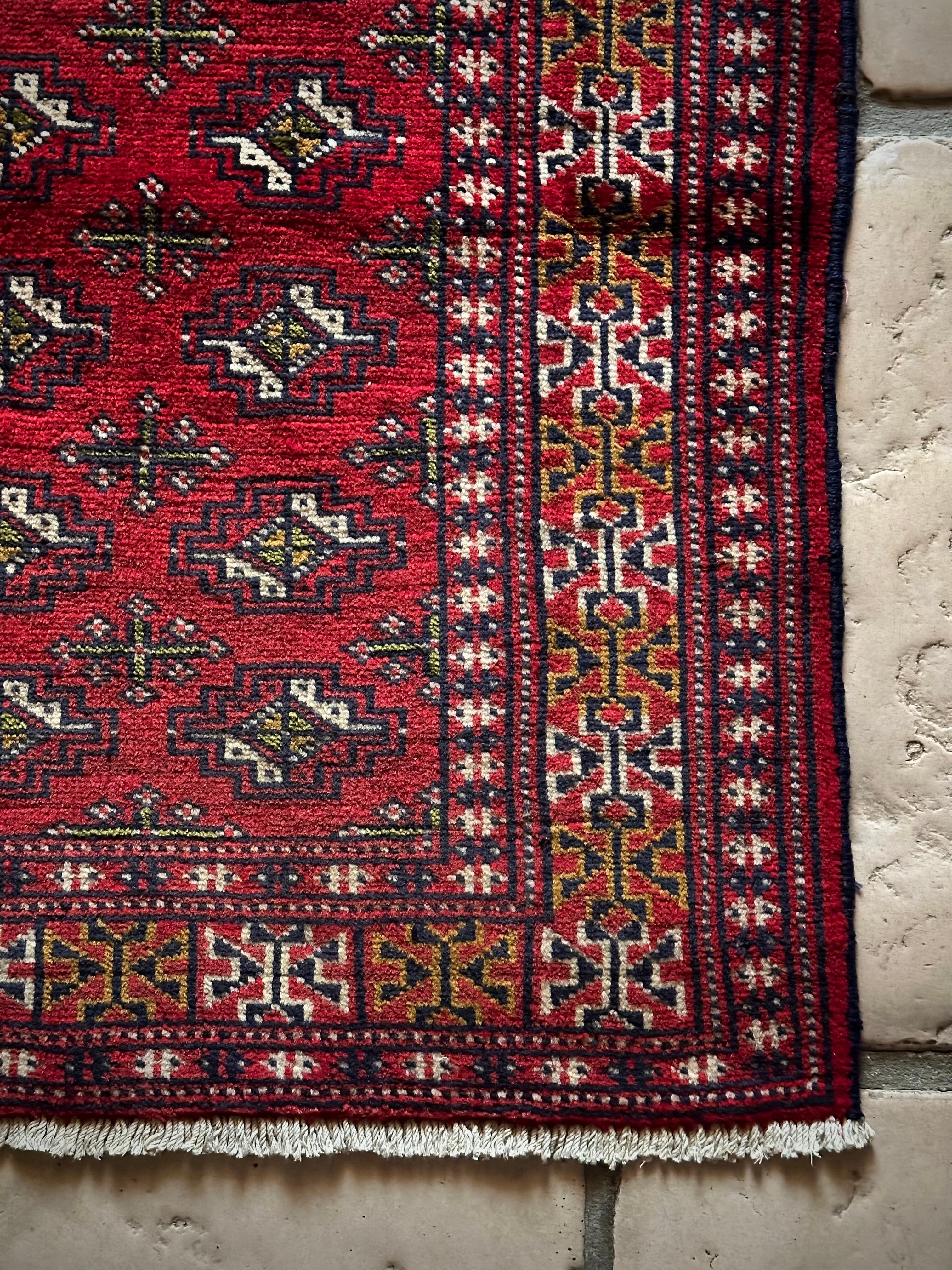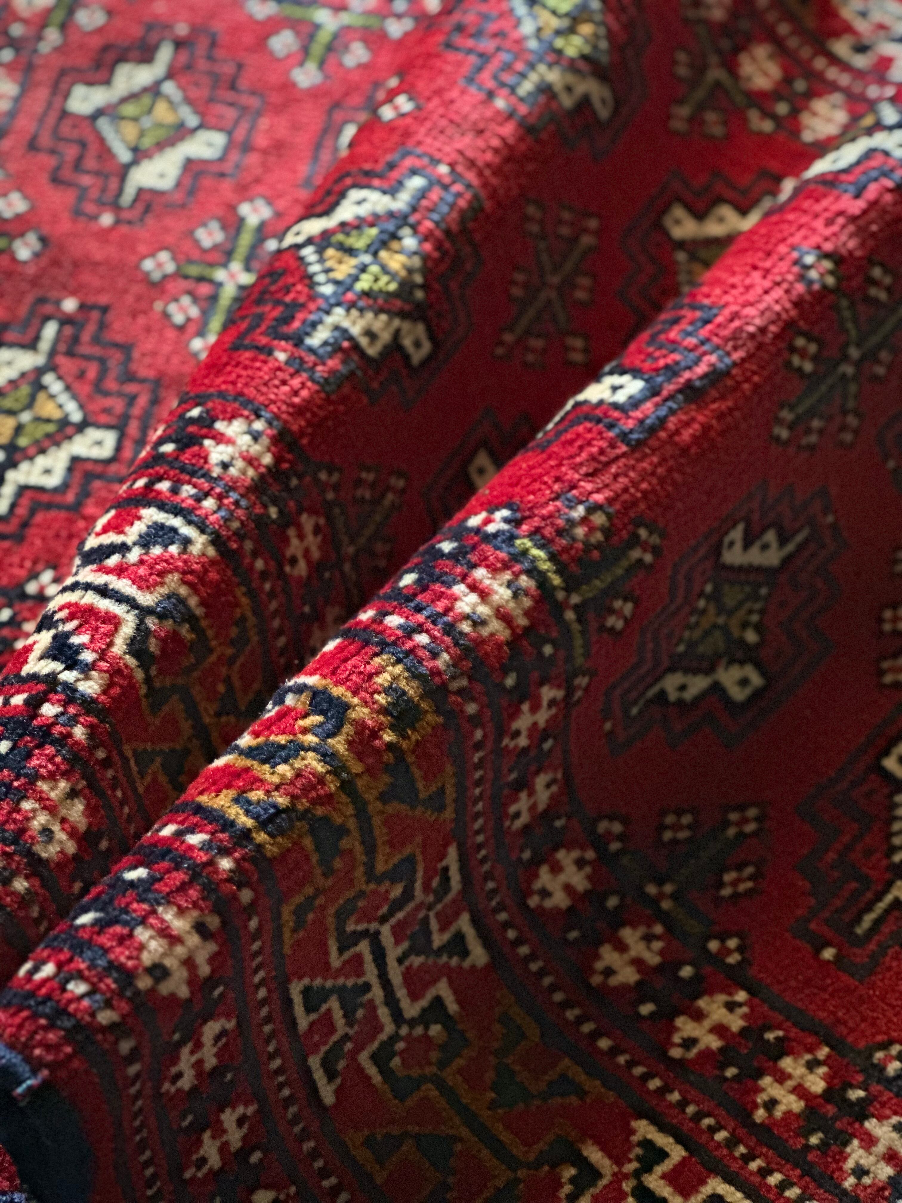 目を惹く真っ赤な色目にバランスの取れたデザインが、その部族の律儀な性格を表している、イラン北東部で織られたトルクメンのトライバルラグになります。