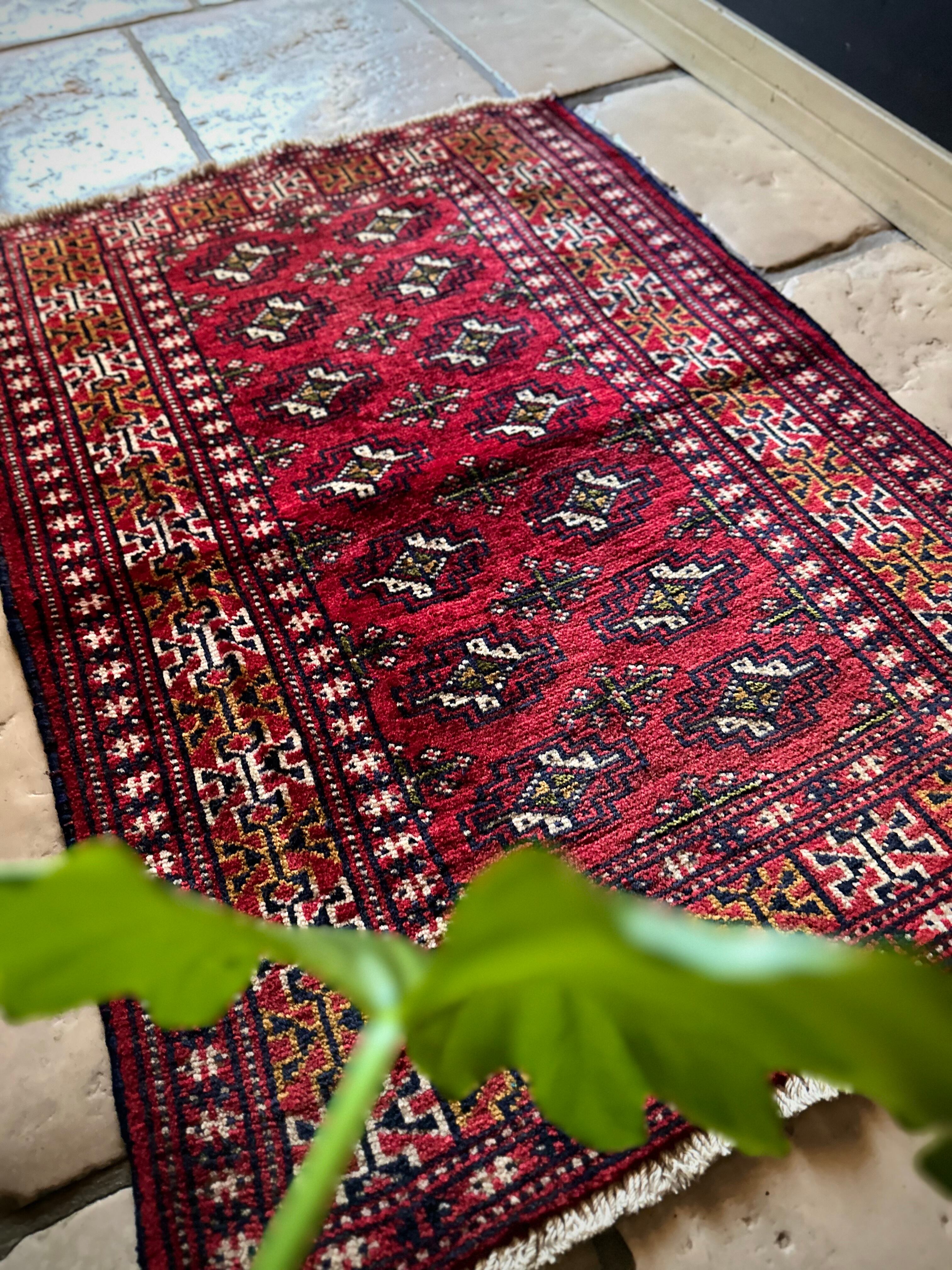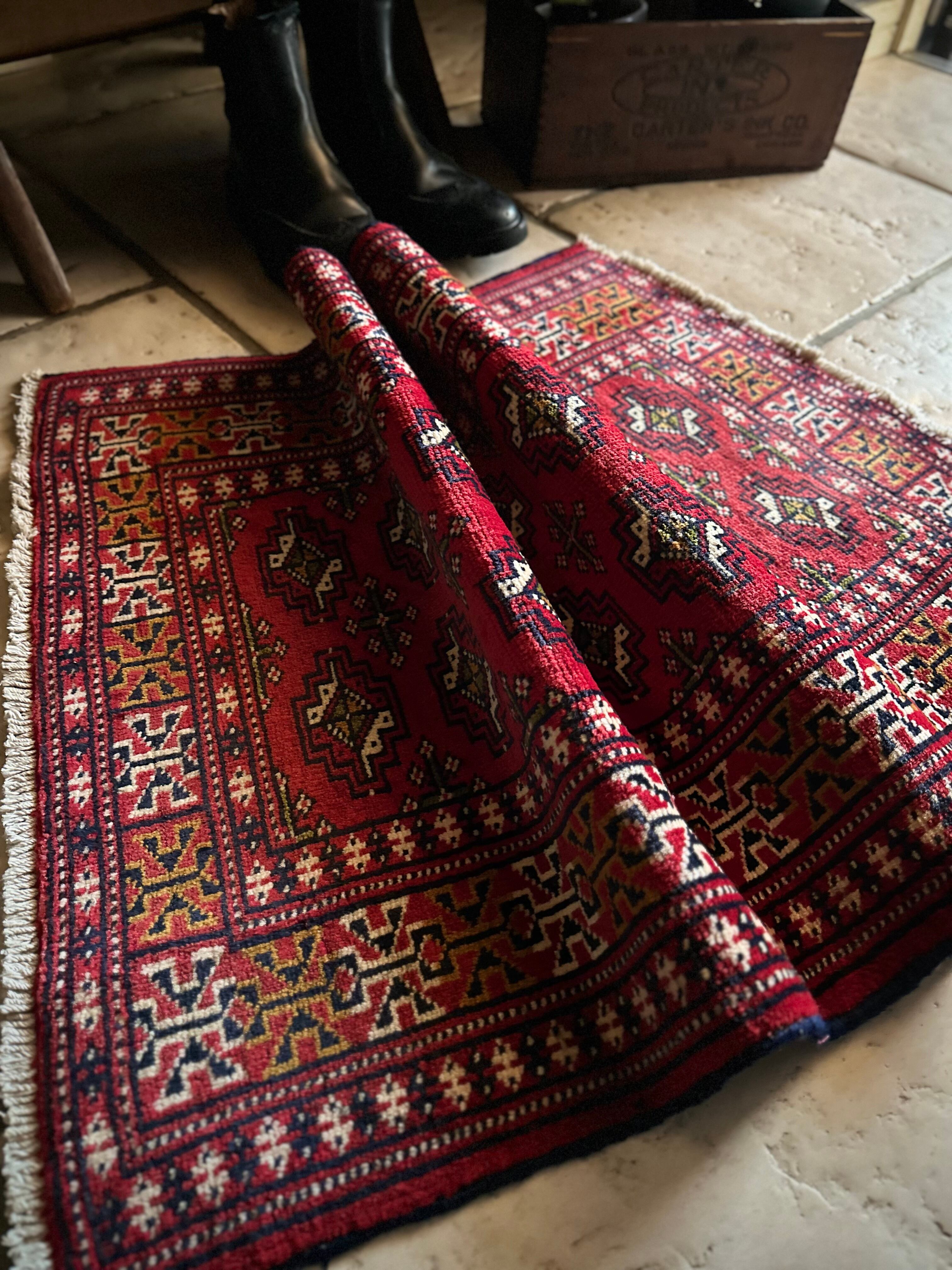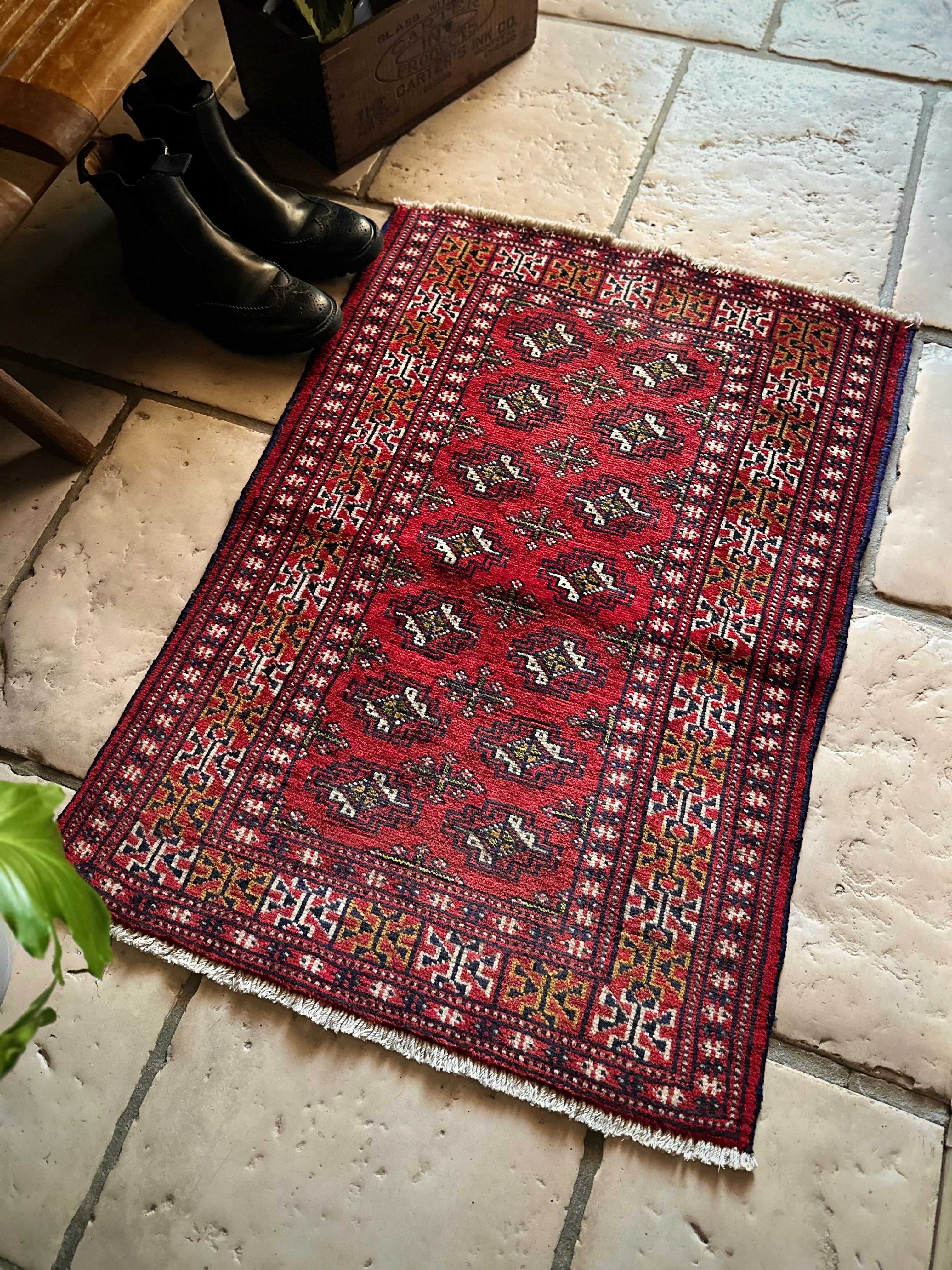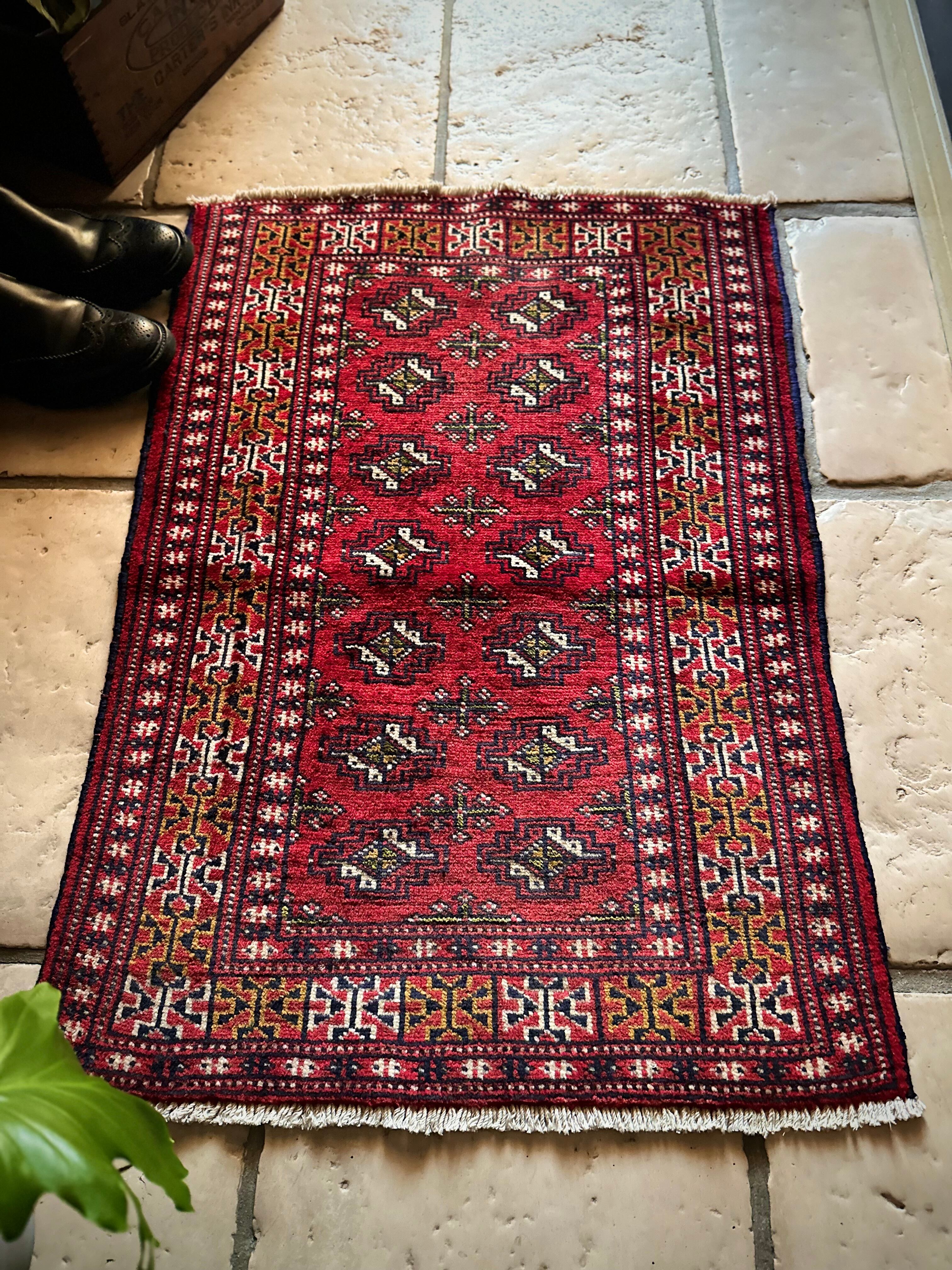 日本の住宅事情に適したサイズ感で、玄関マットとしても馴染みやすい色合いでしょうか。トルクメンらしいガシっとしたシングルウェフトに、しっとりとした短めのパイルが心地良い1枚になります。