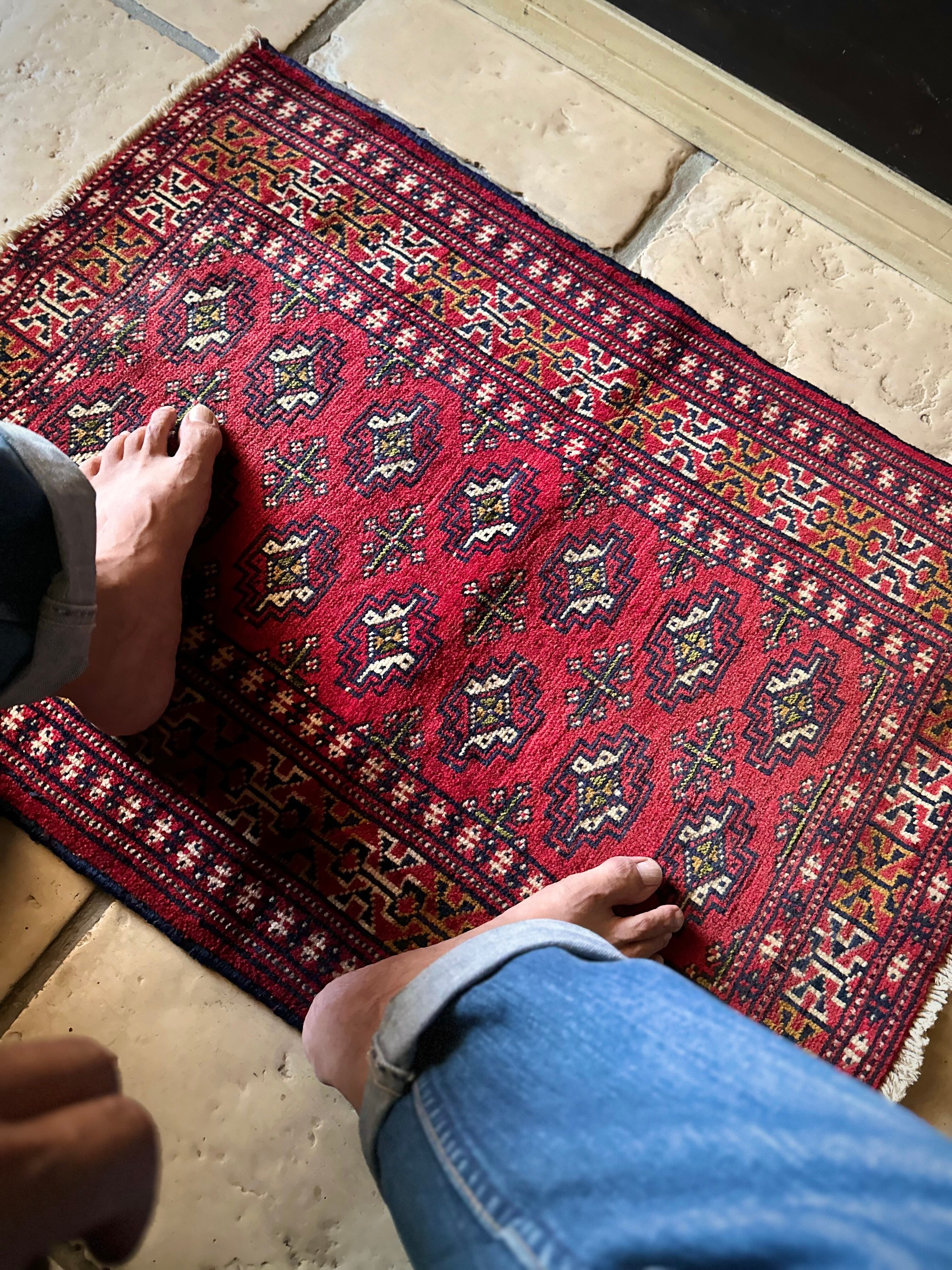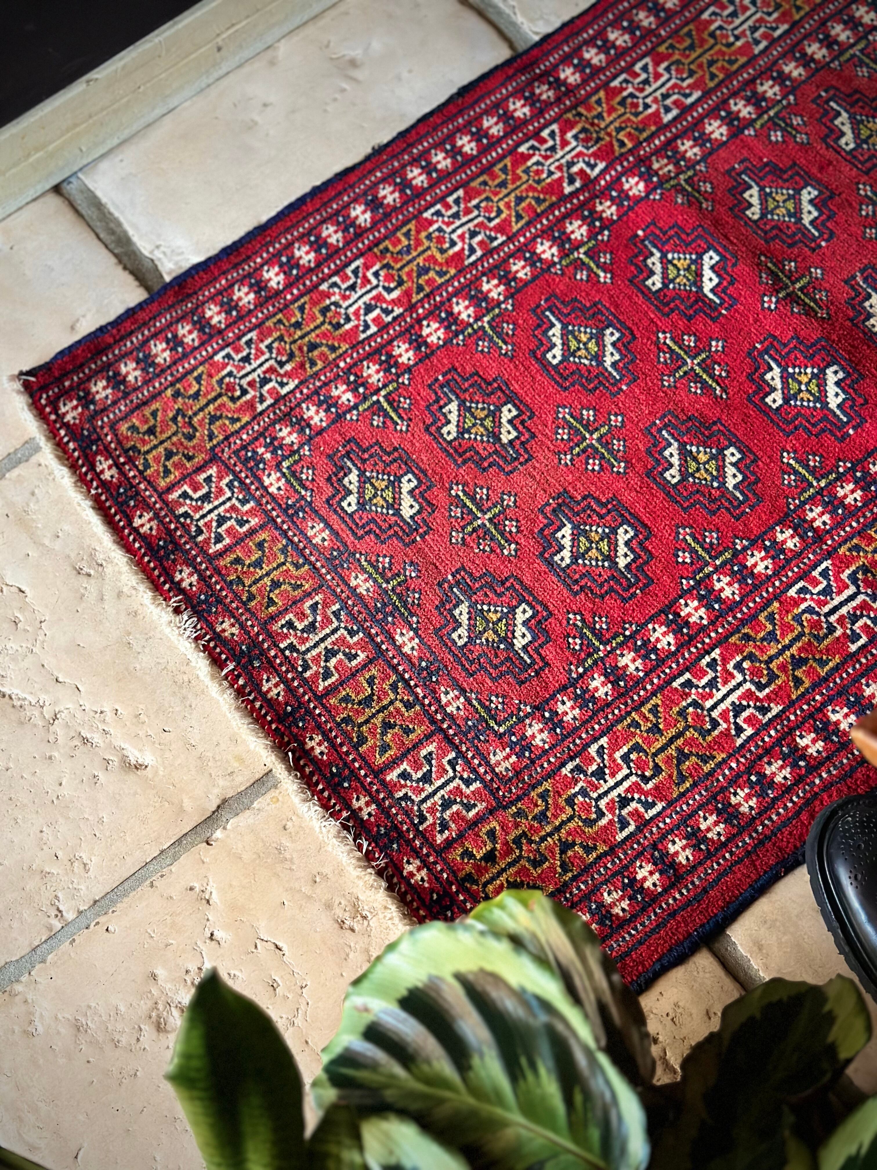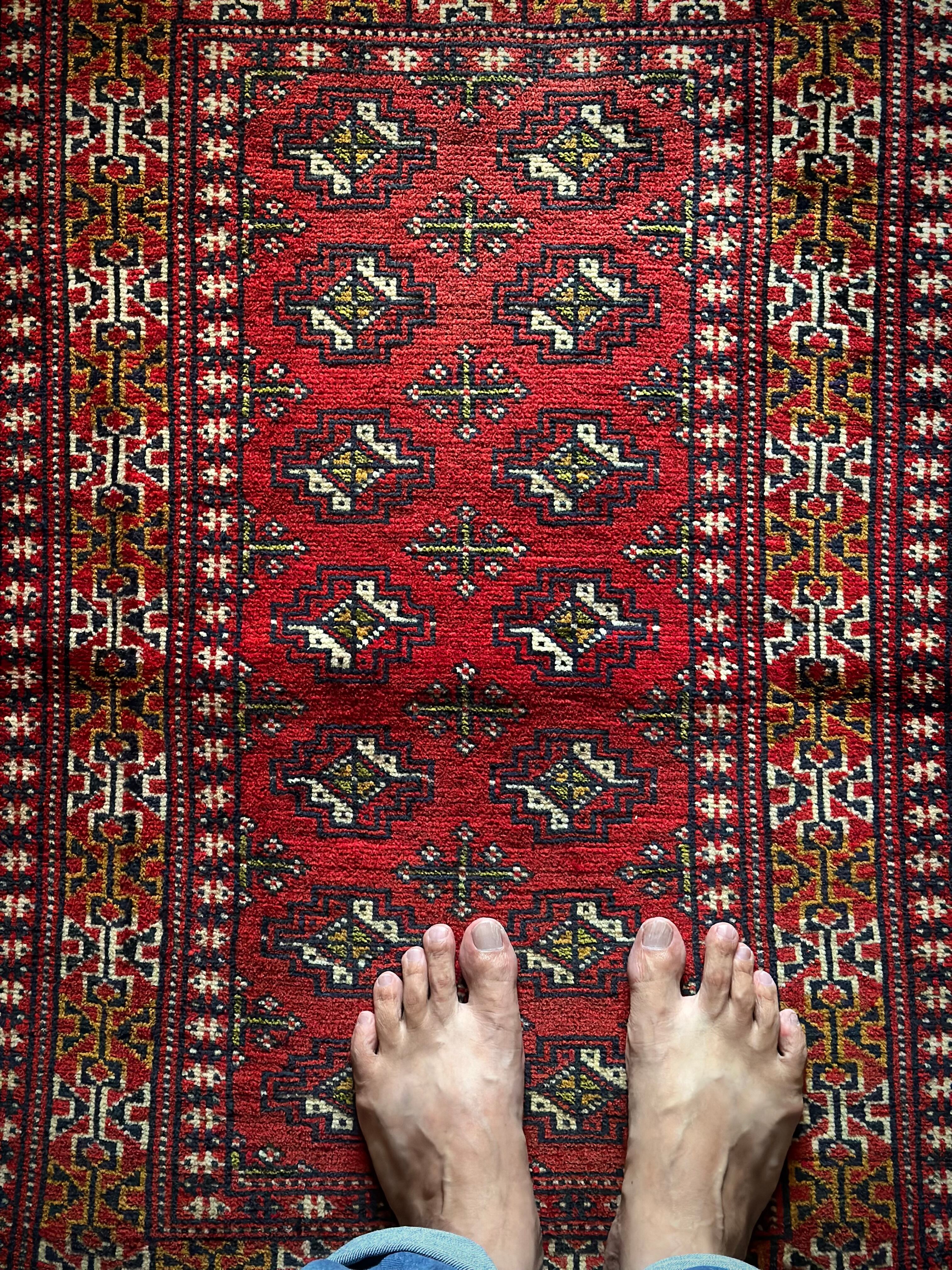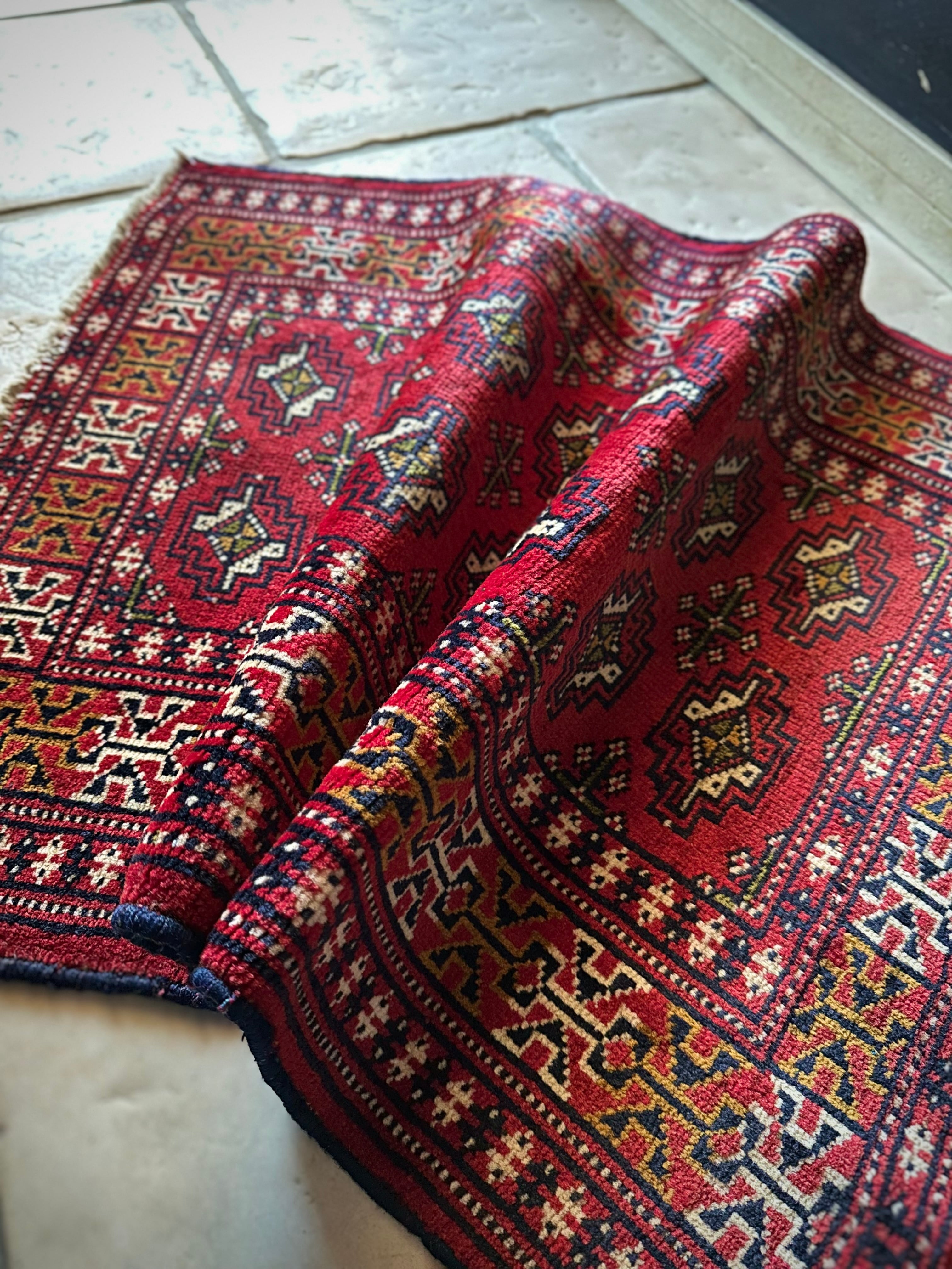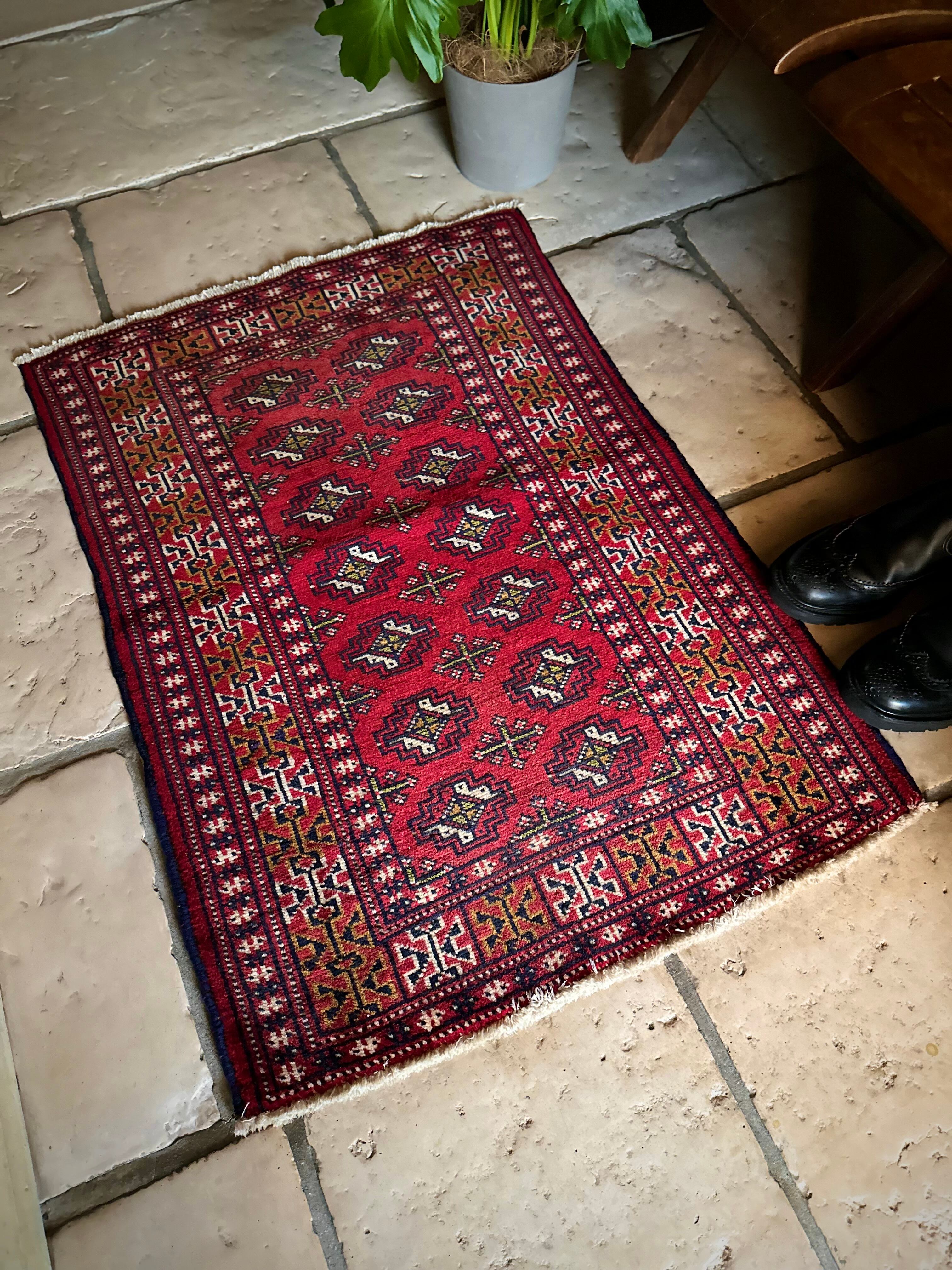 日本の住宅事情に適したサイズ感で、玄関マットとしても馴染みやすい色合いでしょうか。トルクメンらしいガシっとしたシングルウェフトに、しっとりとした短めのパイルが心地良い1枚になります。