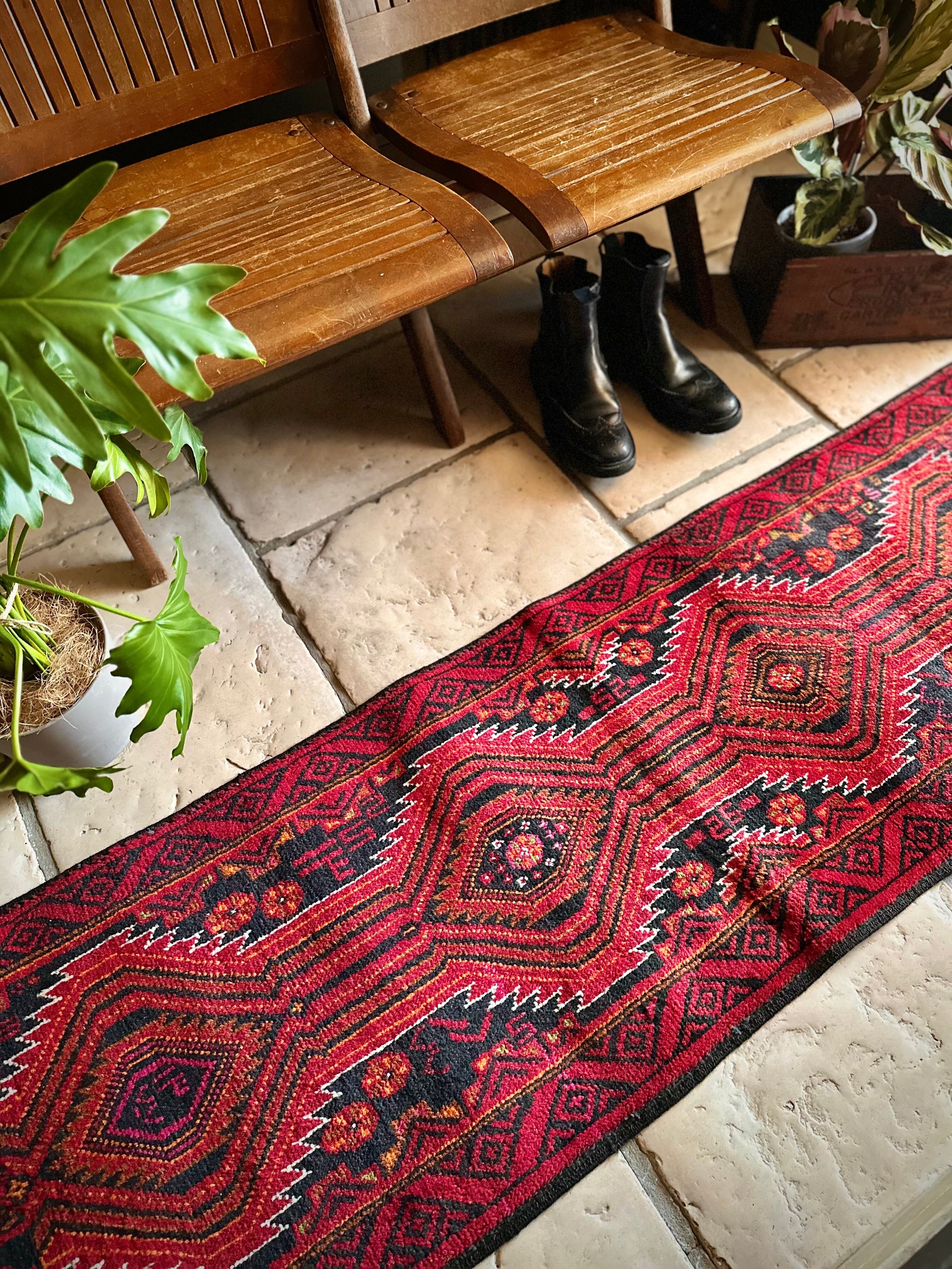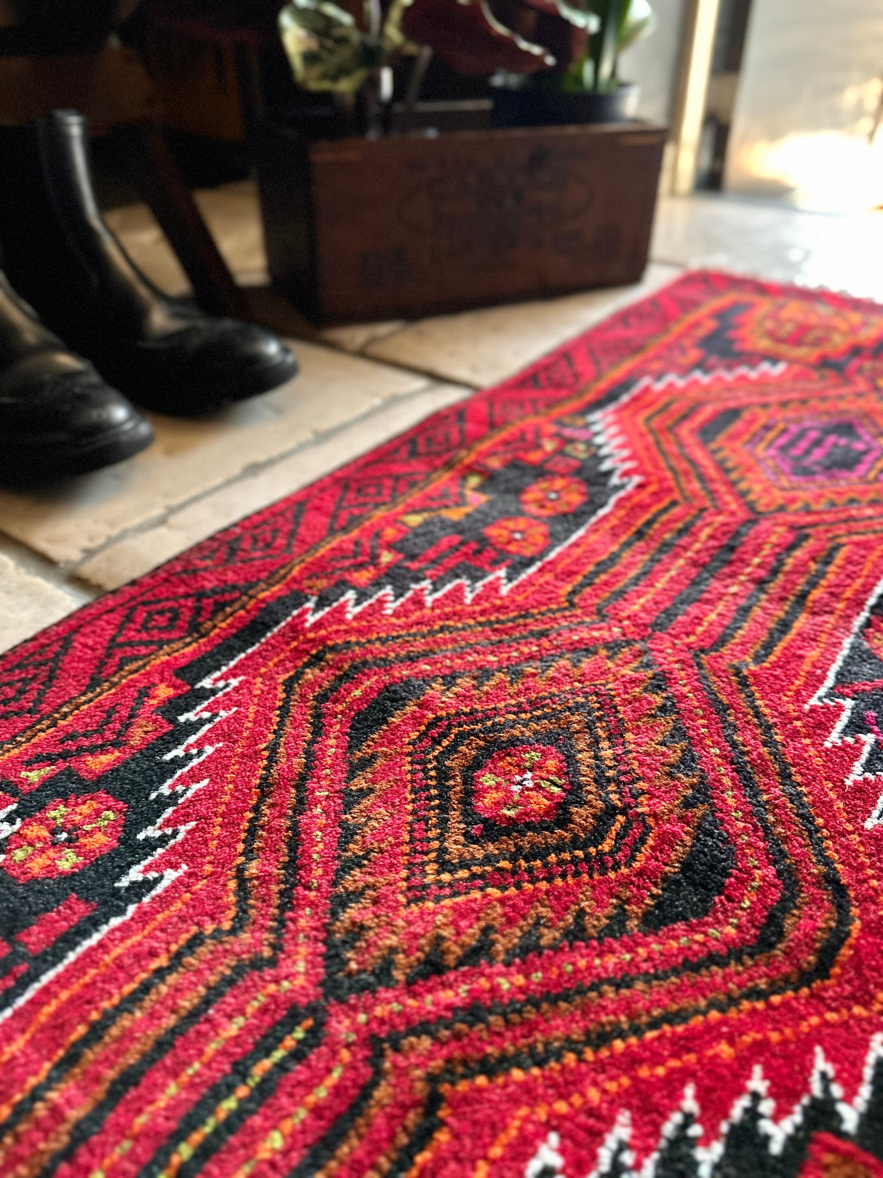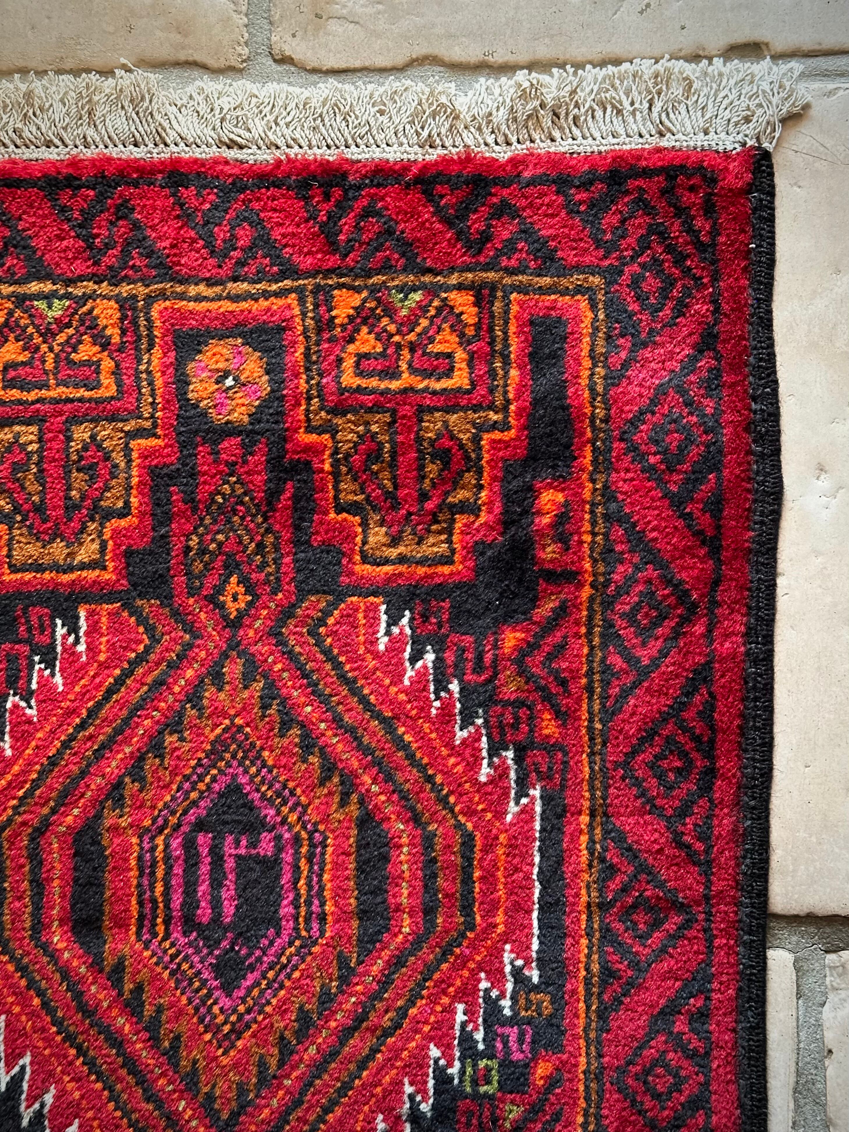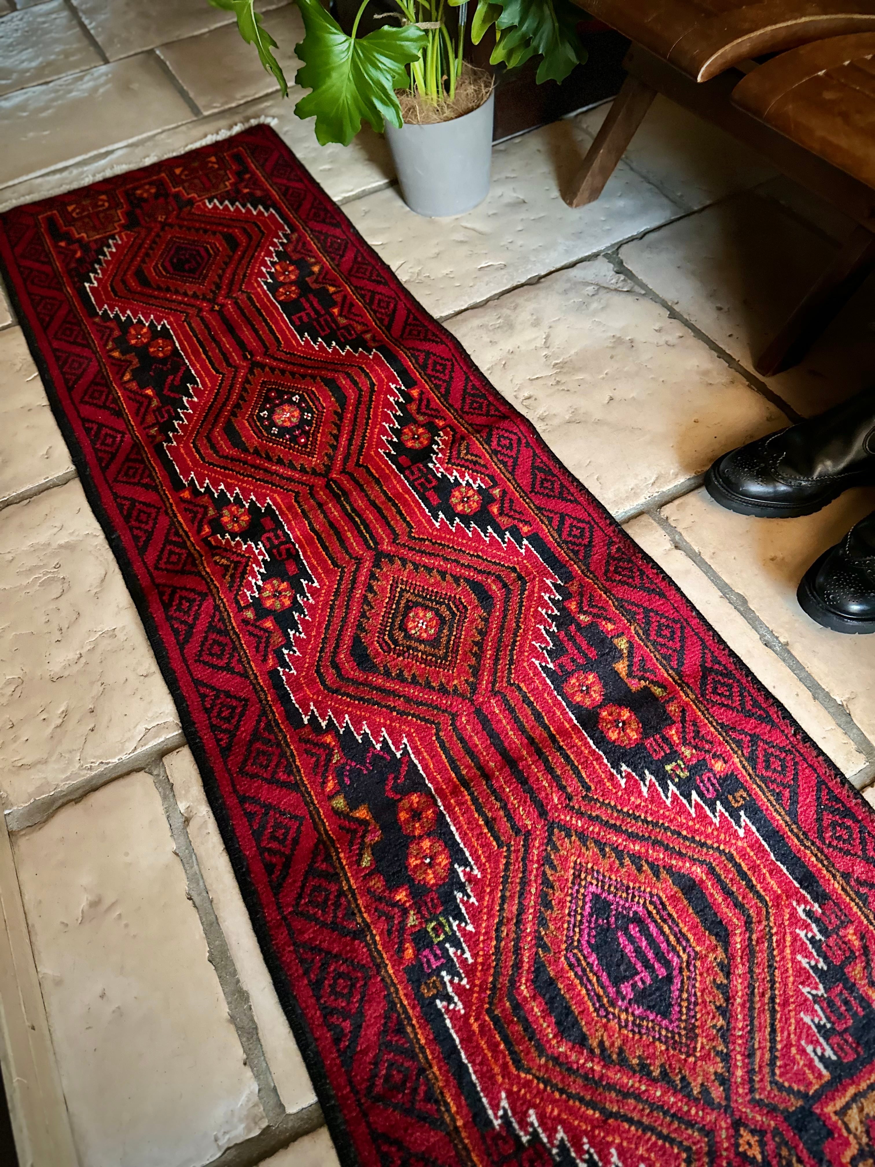 ブラック&レッドにオレンジの差し色が映えるイラン東部に居住するバルーチ族のトライバルラグで、お馴染みの白で浮き彫りにされたラインがかっこいい細長いランナーサイズの1枚になります。