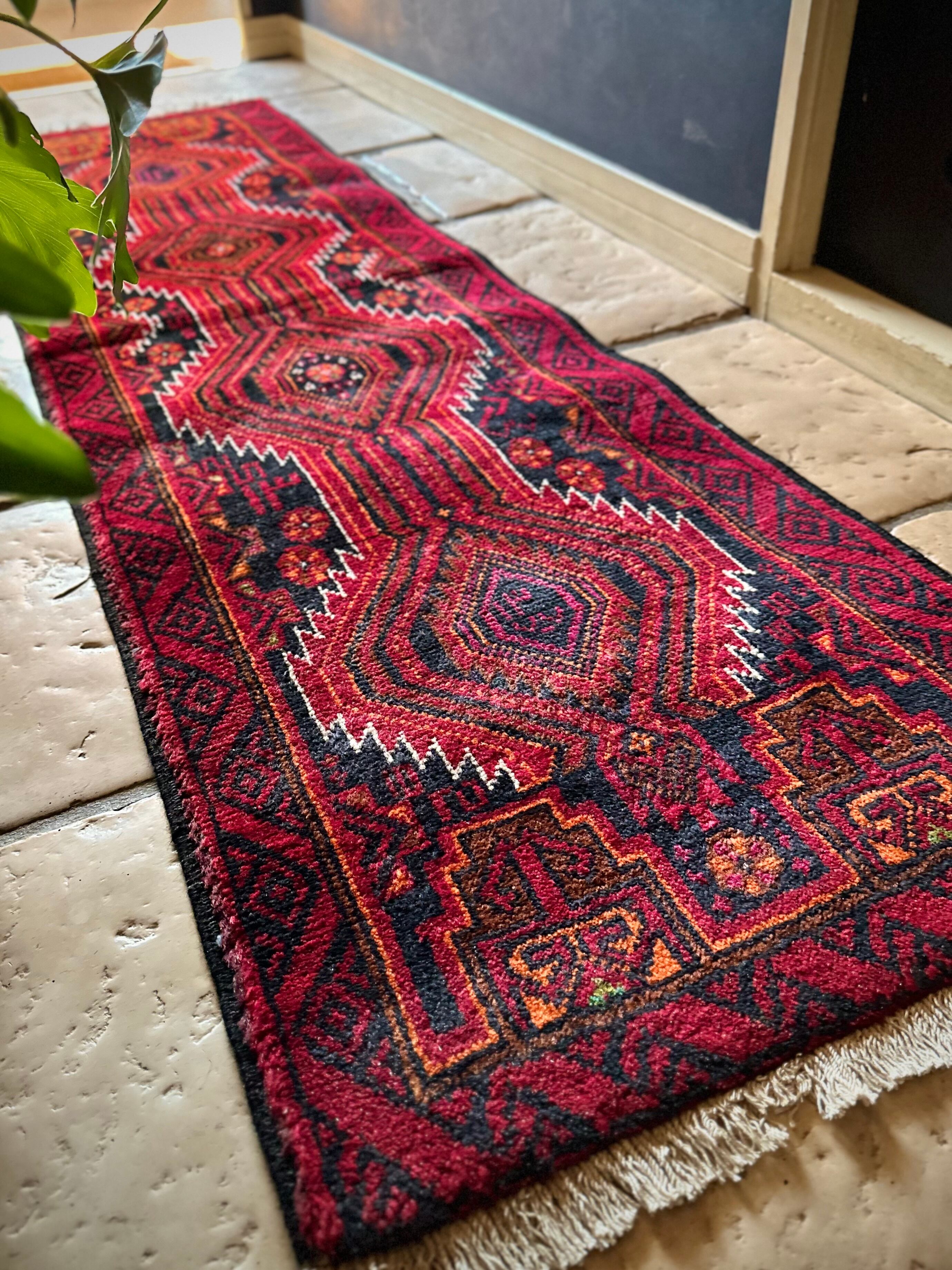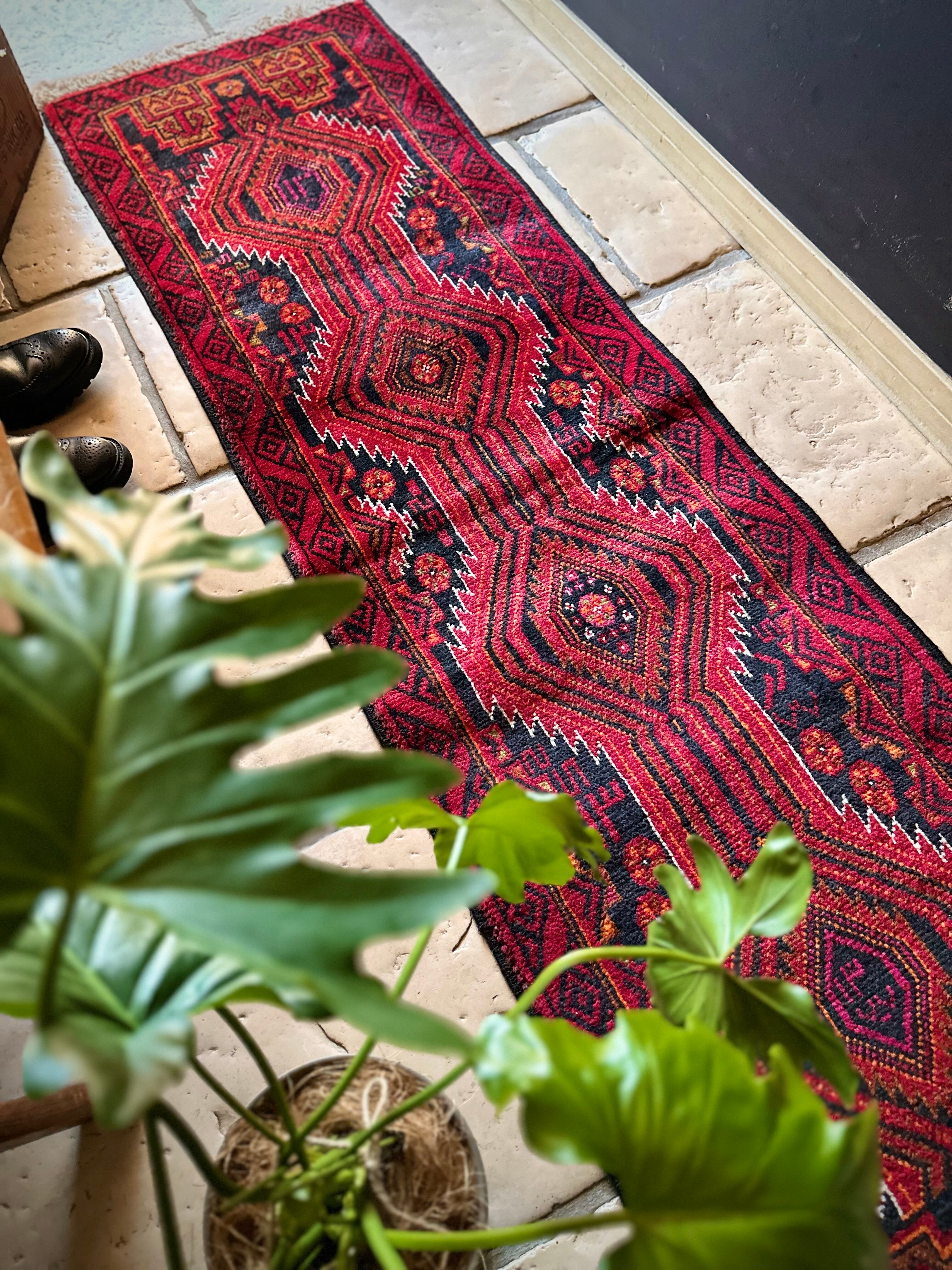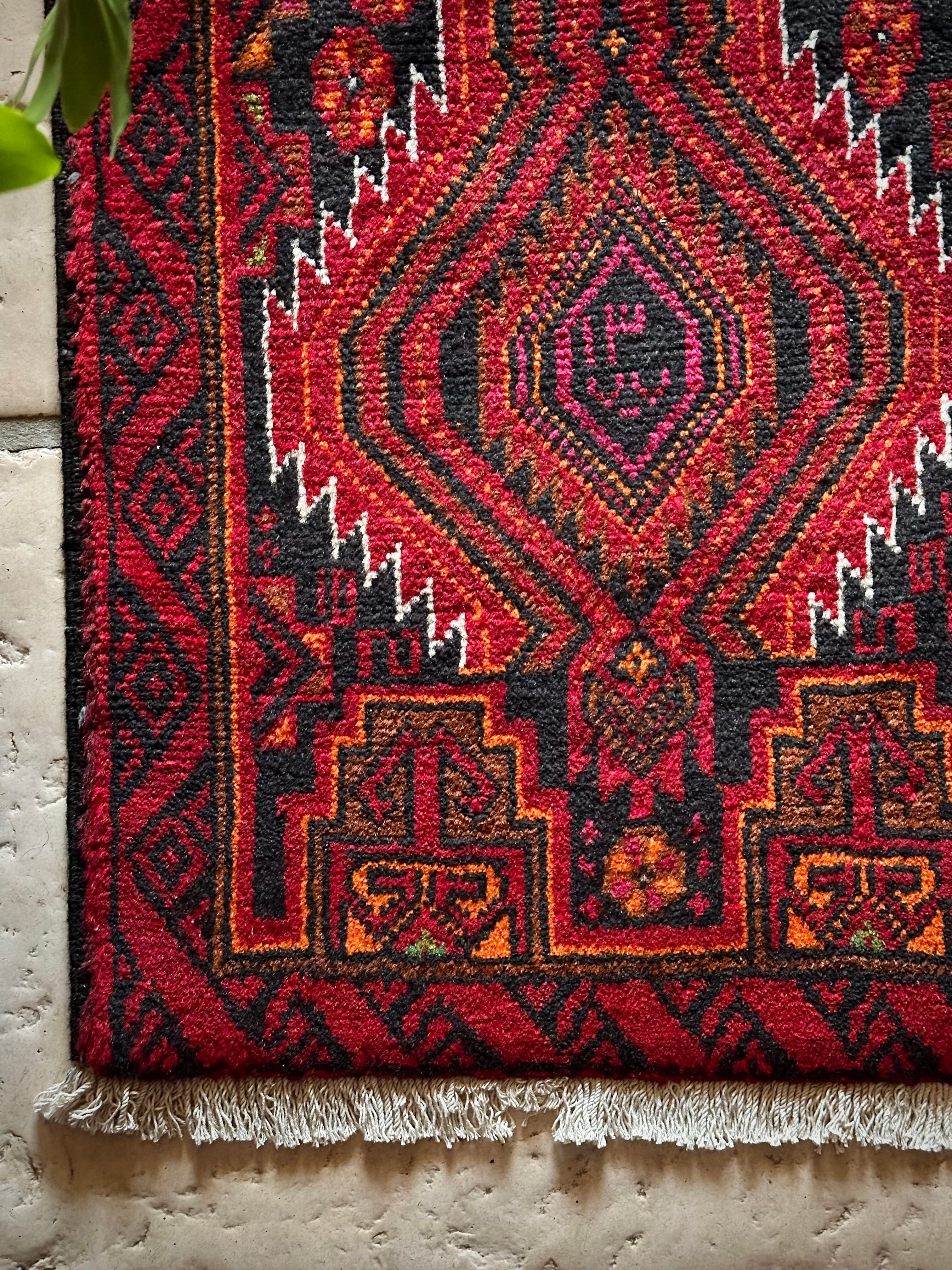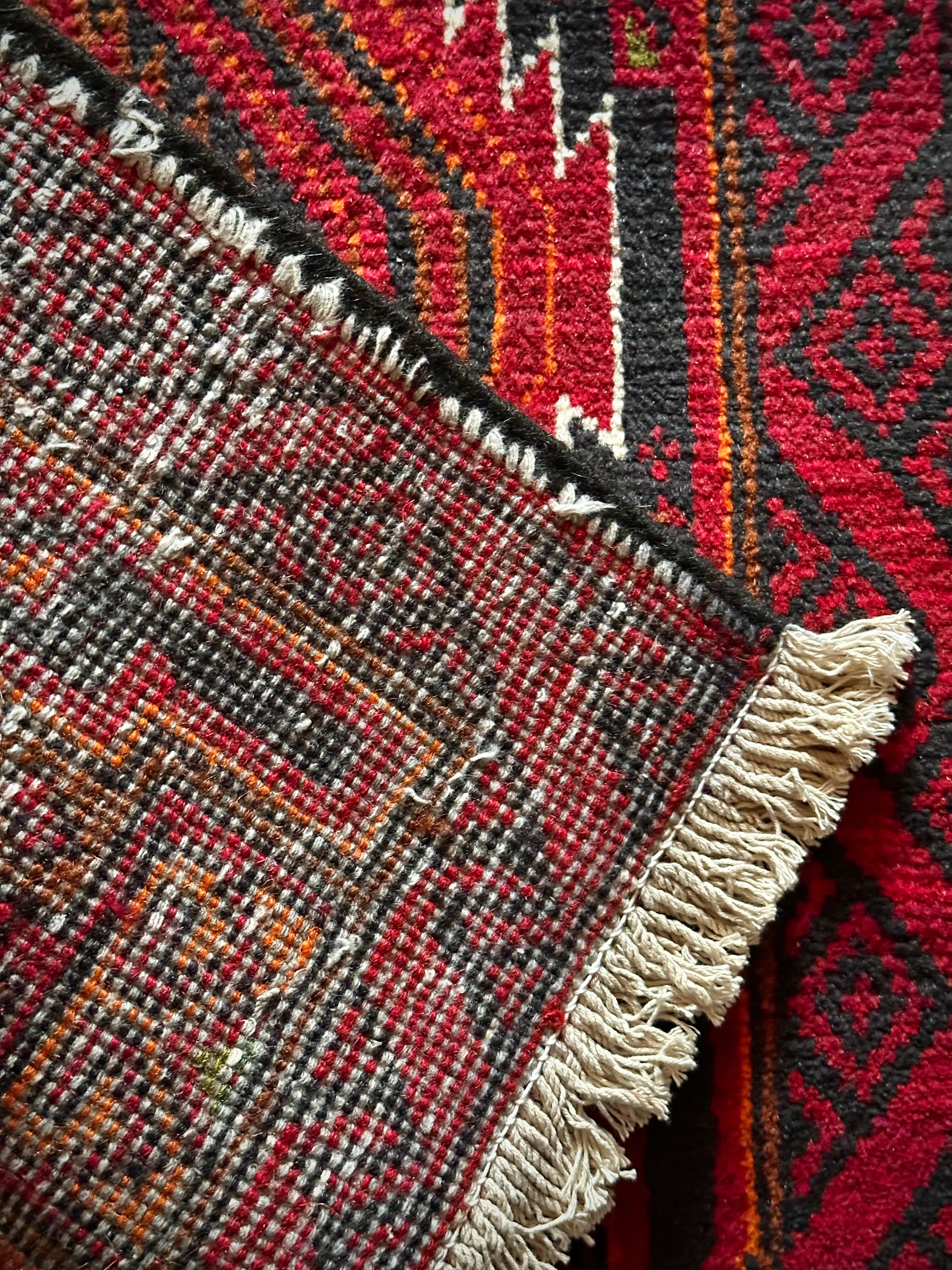 ブラック&レッドにオレンジの差し色が映えるイラン東部に居住するバルーチ族のトライバルラグで、お馴染みの白で浮き彫りにされたラインがかっこいい細長いランナーサイズの1枚になります。