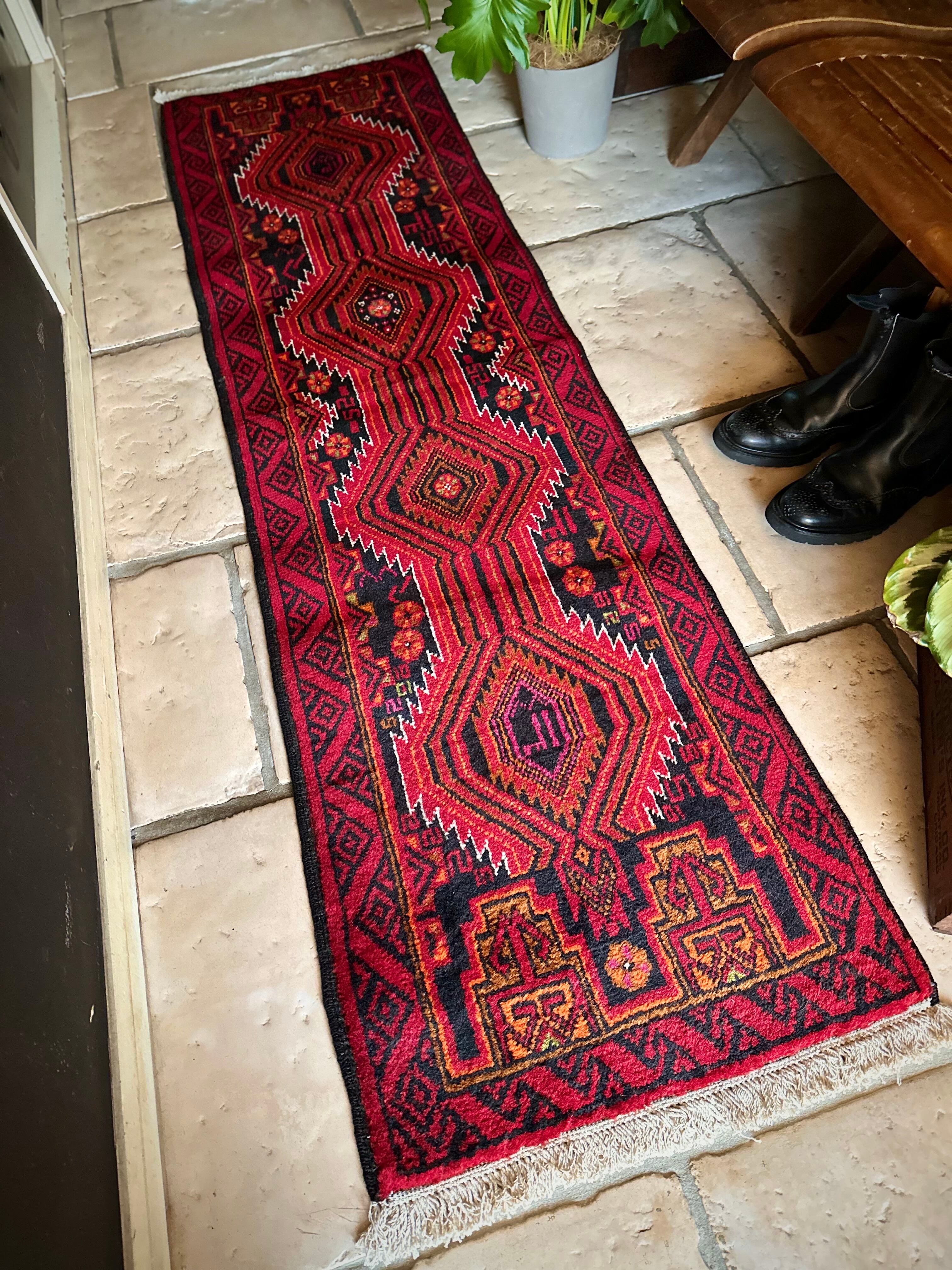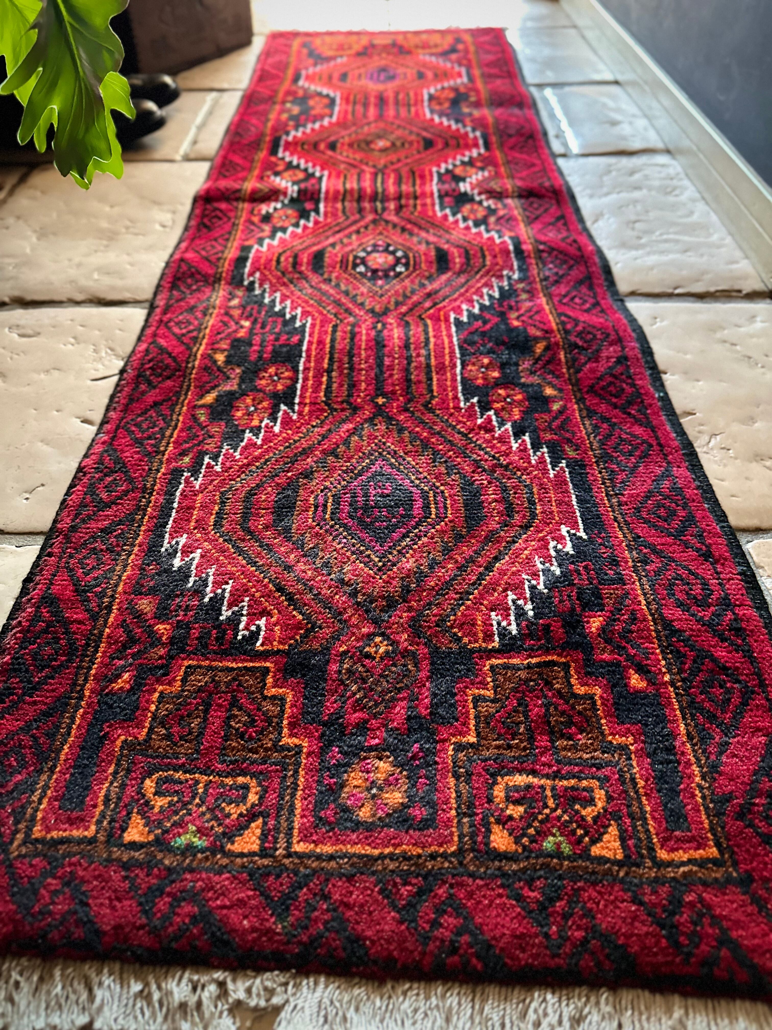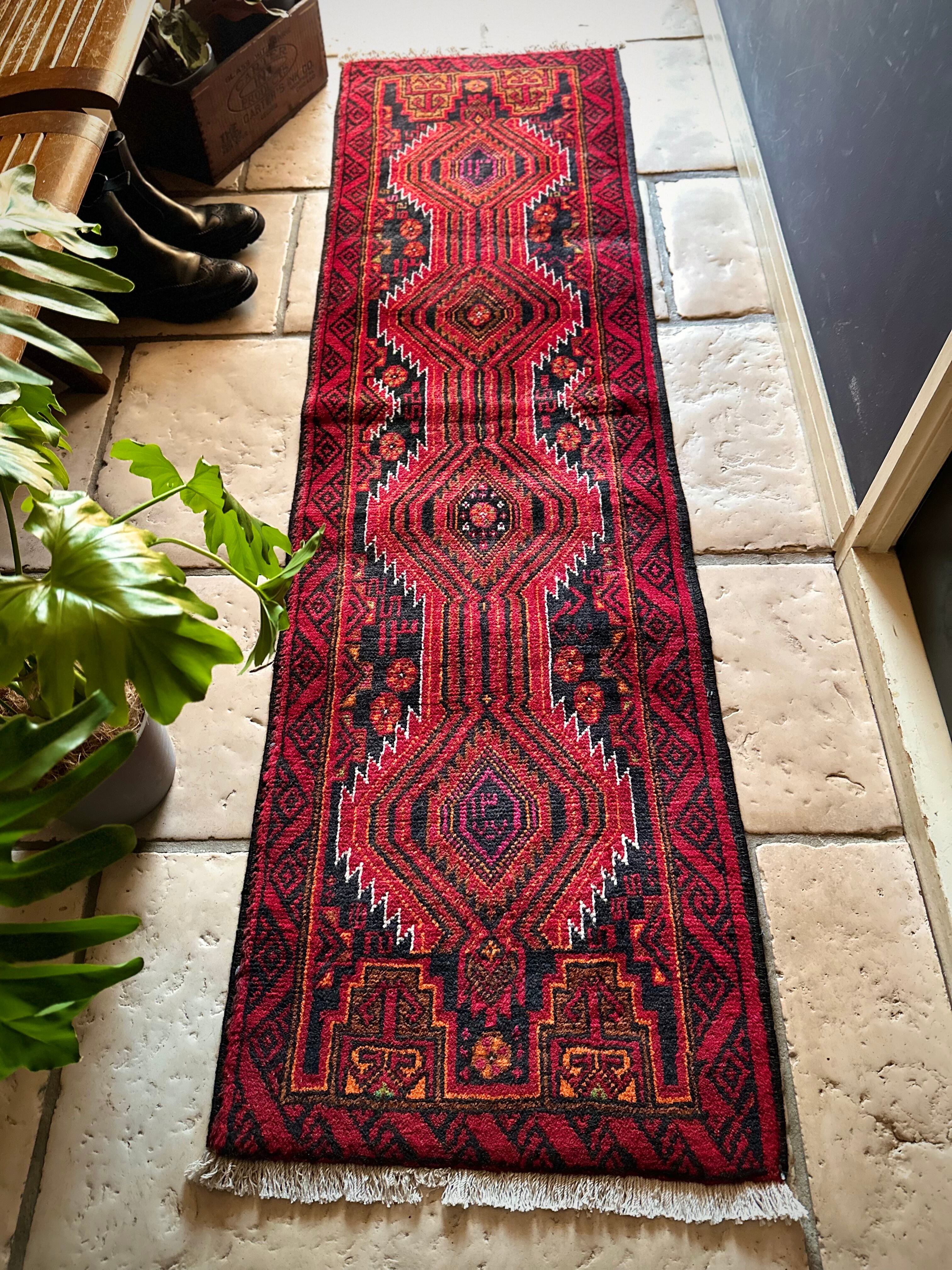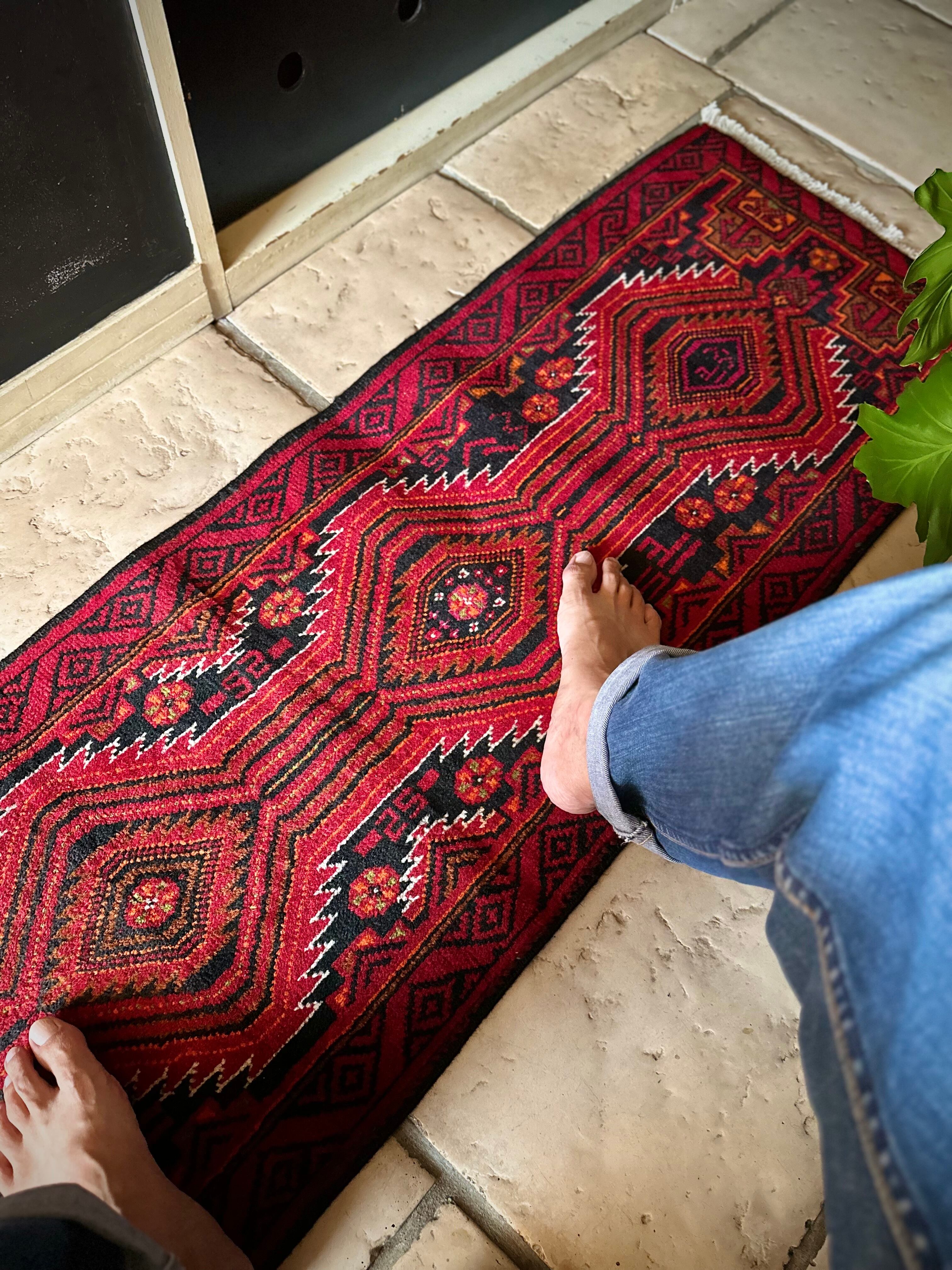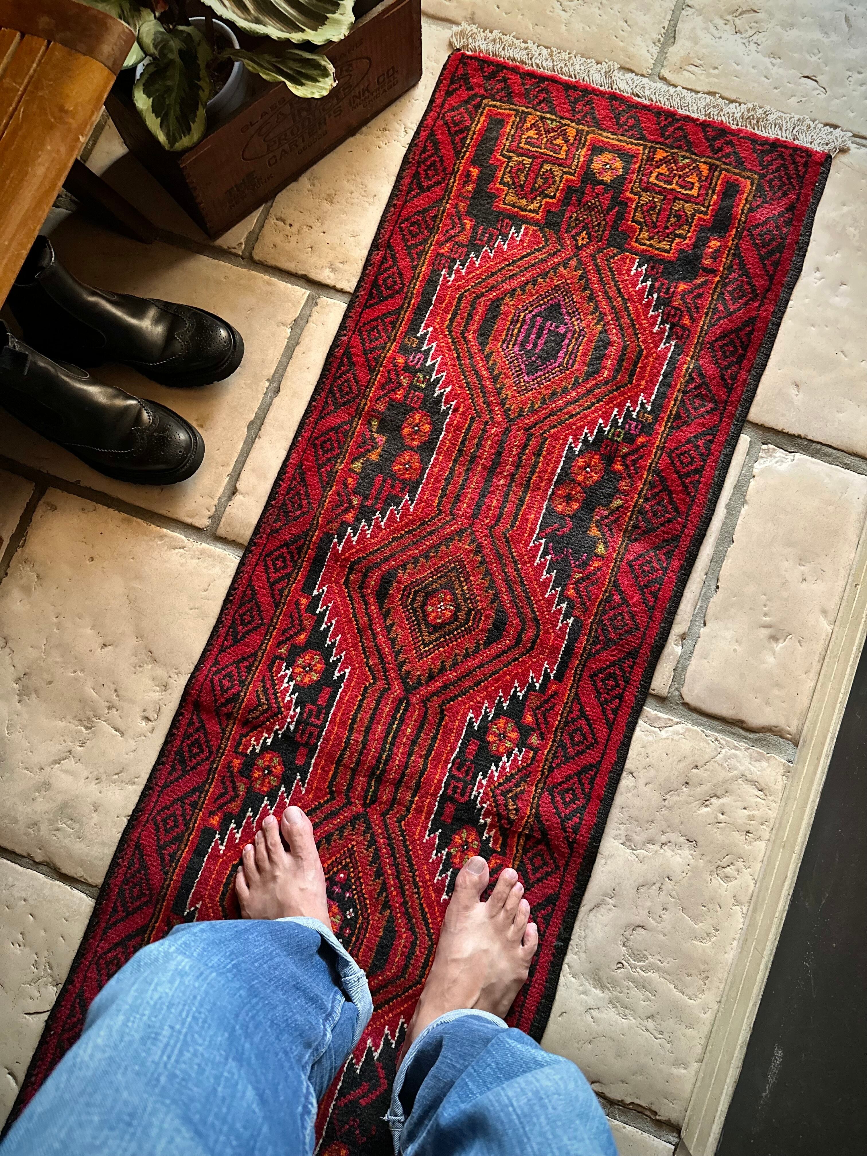 ブラック&レッドにオレンジの差し色が映えるイラン東部に居住するバルーチ族のトライバルラグで、お馴染みの白で浮き彫りにされたラインがかっこいい細長いランナーサイズの1枚になります。