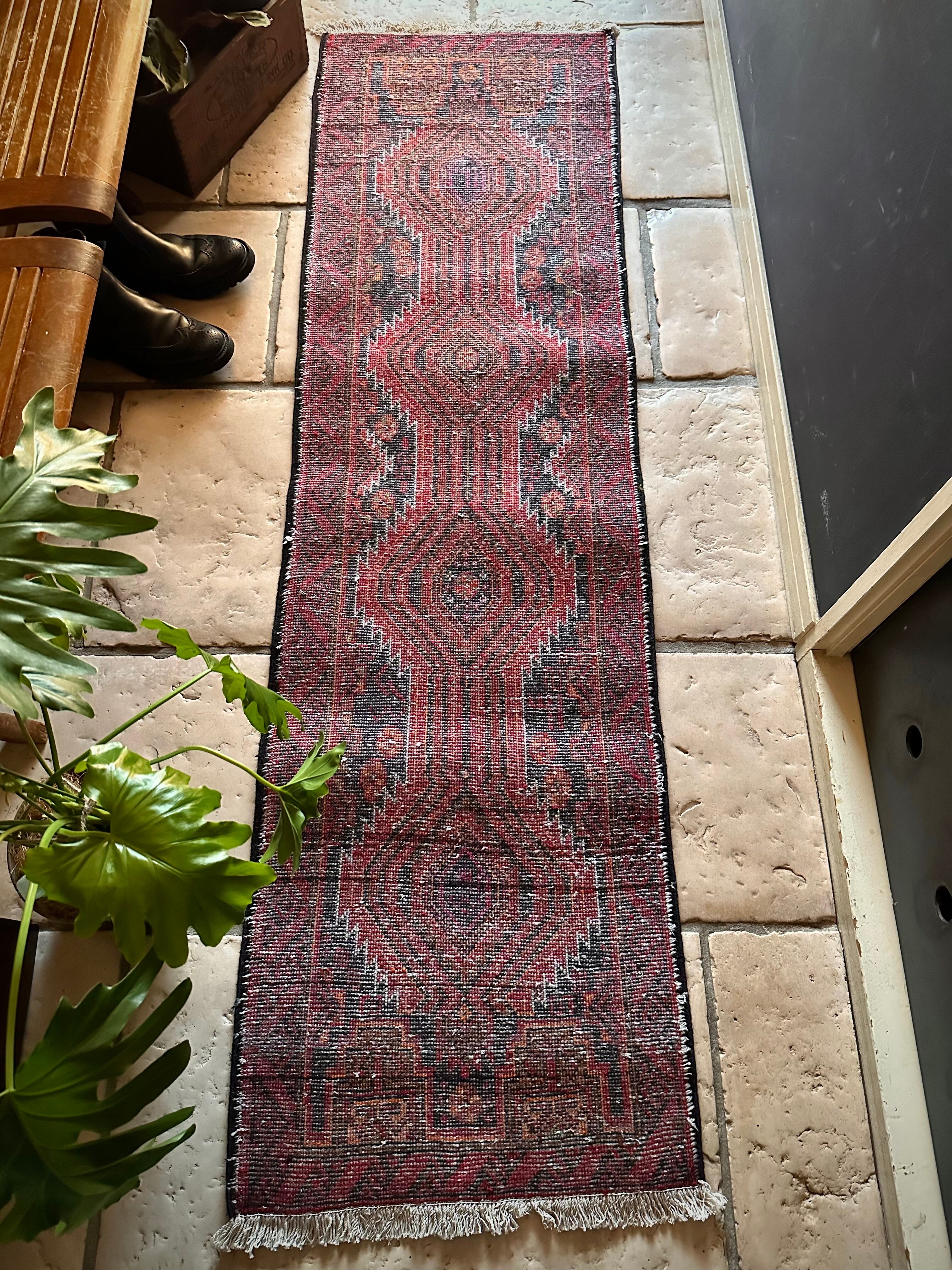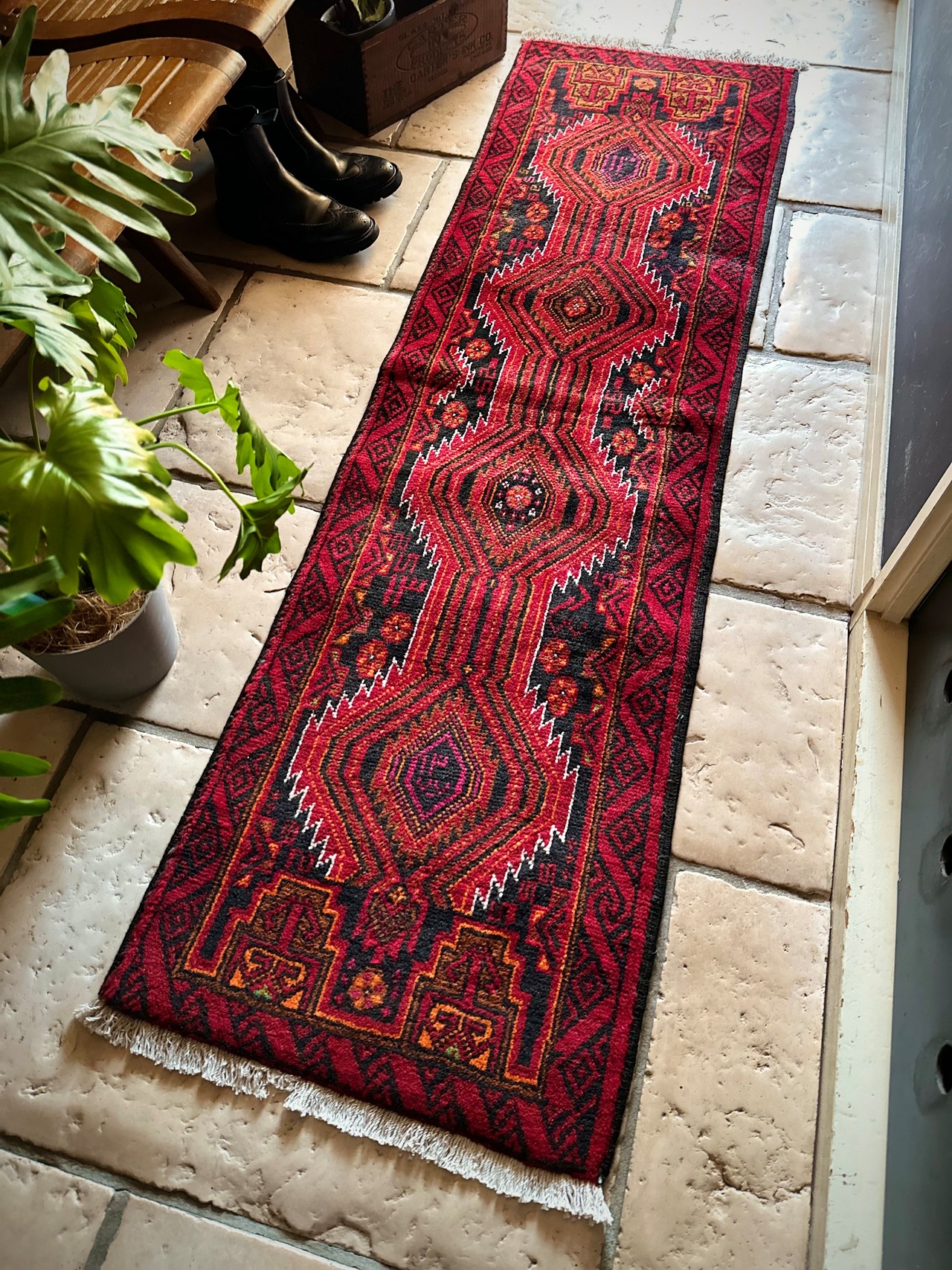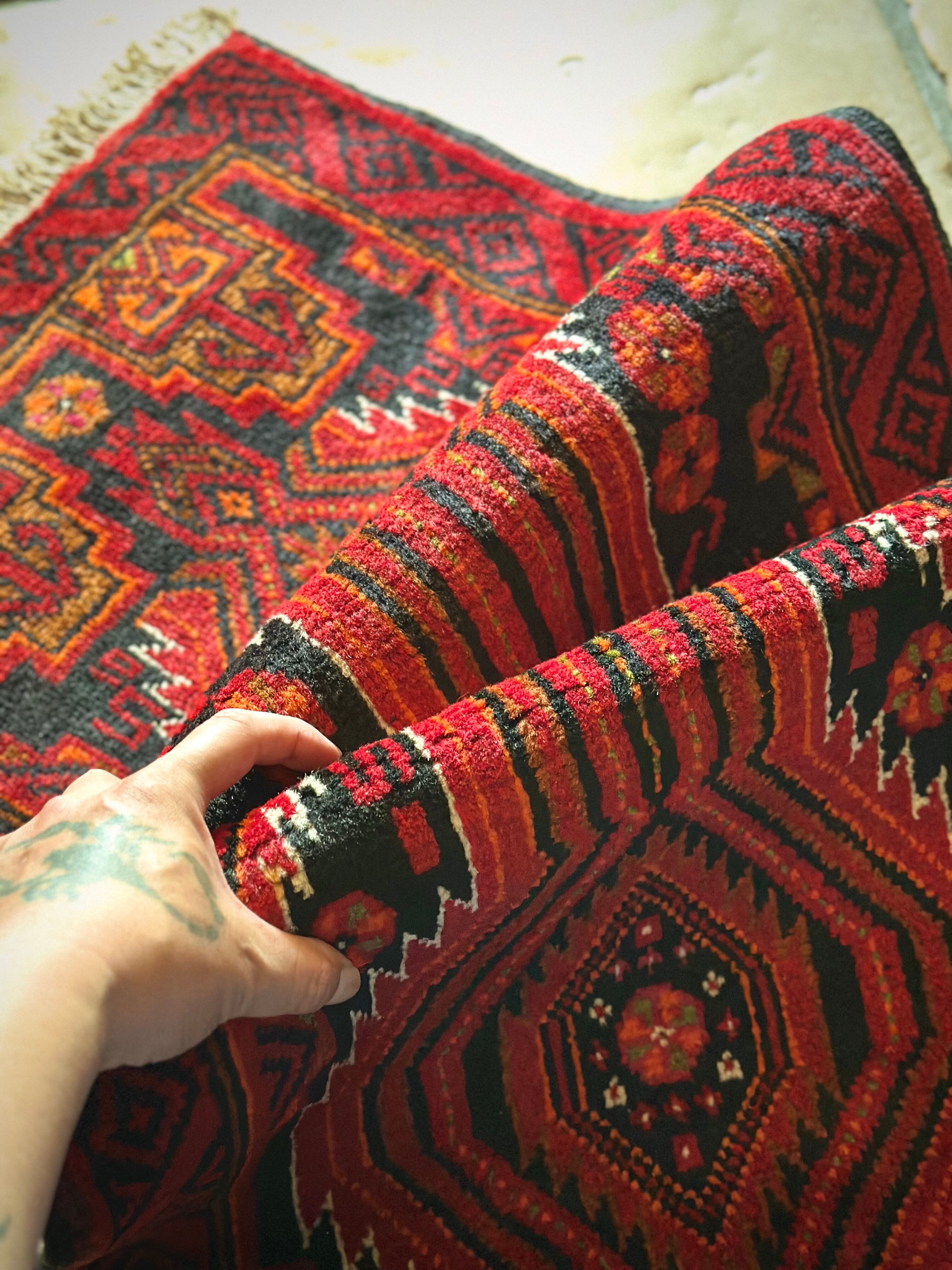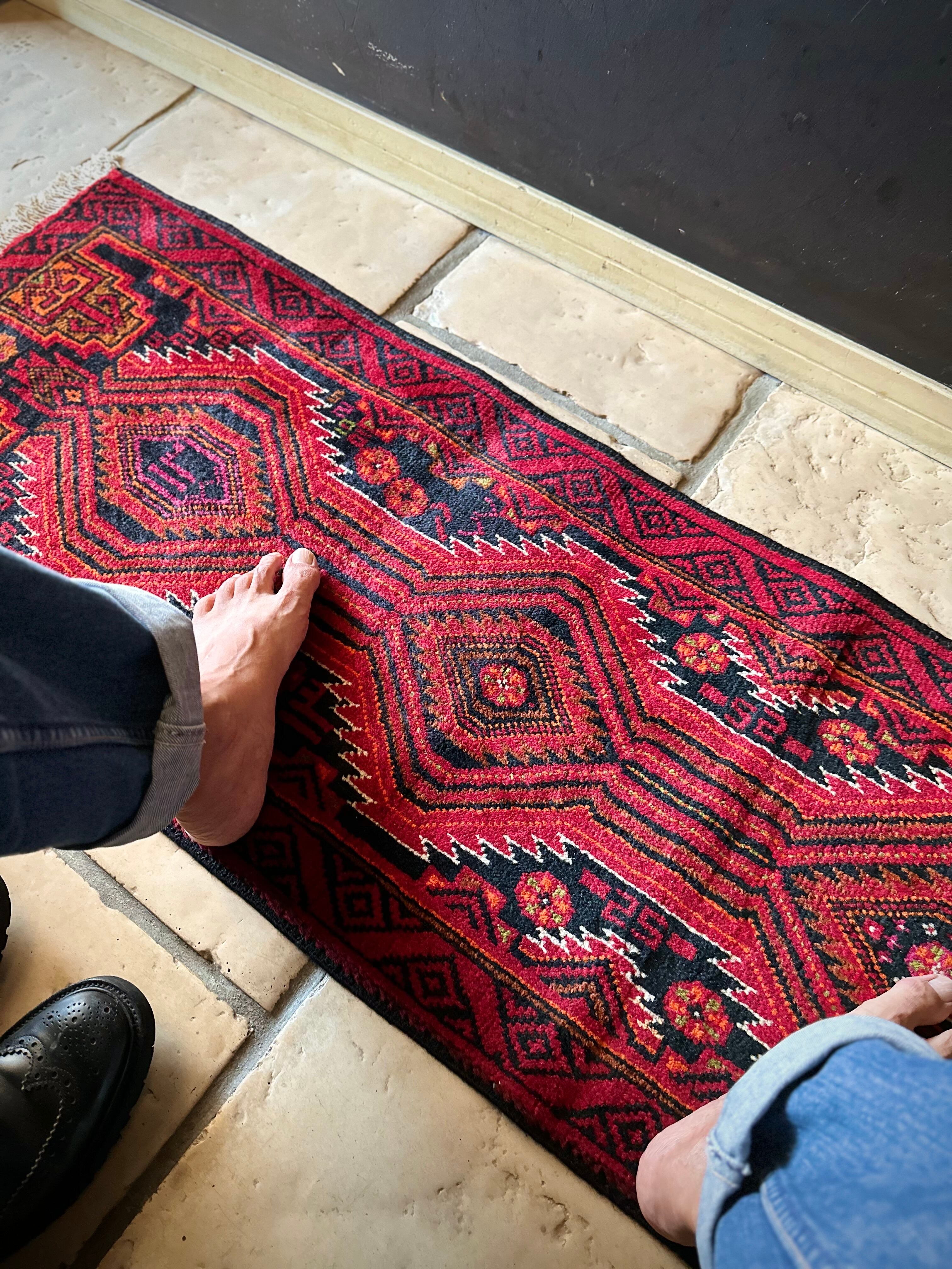 ブラック&レッドにオレンジの差し色が映えるイラン東部に居住するバルーチ族のトライバルラグで、お馴染みの白で浮き彫りにされたラインがかっこいい細長いランナーサイズの1枚になります。