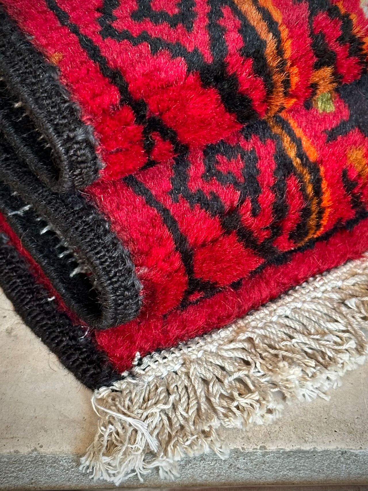 経年としては40年のヴィンテージ品となりますが、パイル自体もフサフサとしていてほぼ未使用の新品同様な状態と言えるでしょうか。もちろん目立つ汚れやダメージにリペア箇所は見当たらないミントなコンディションになりますが、一部フリンジが短くなっている箇所がありますので写真にてご確認ください。