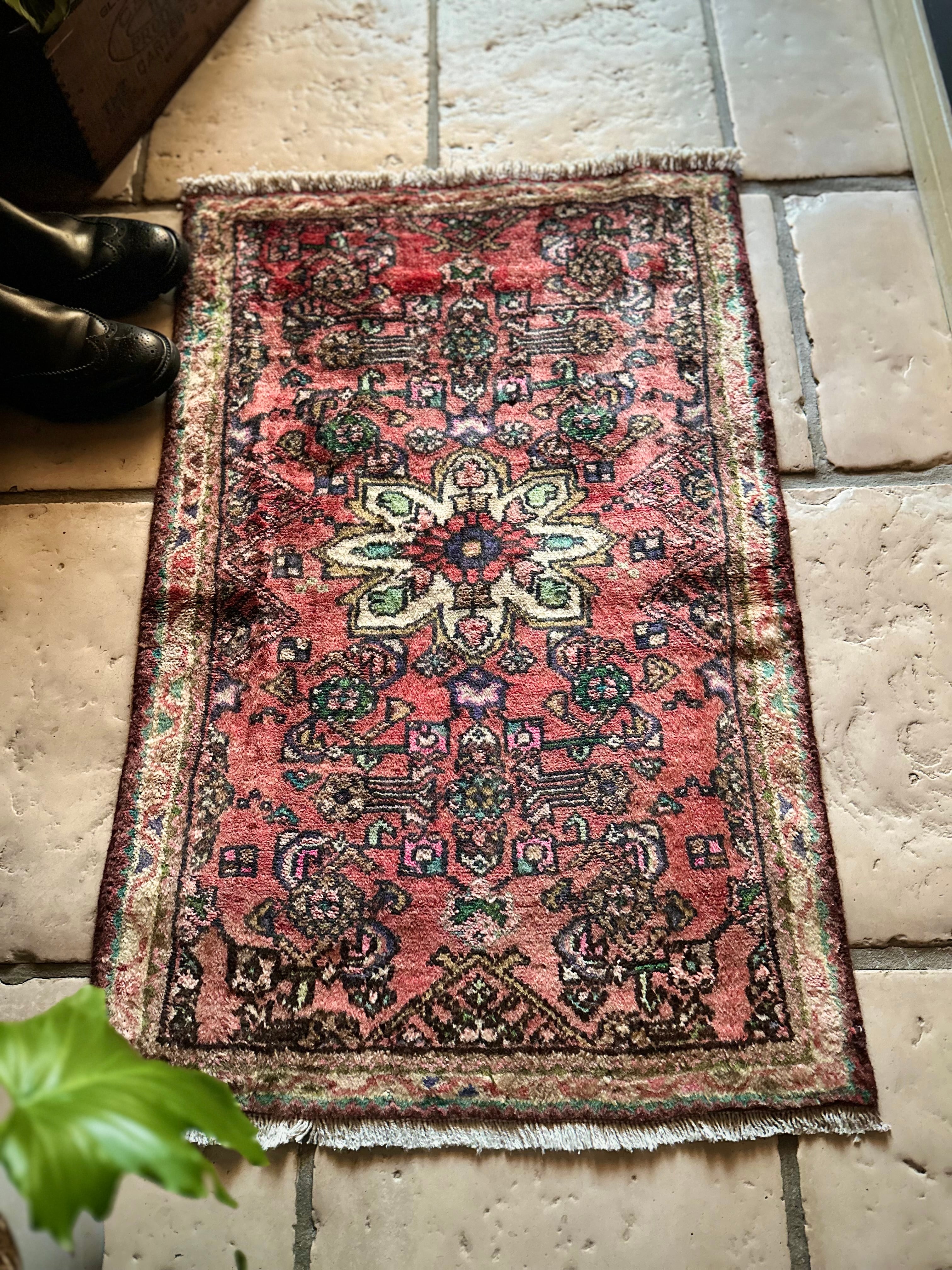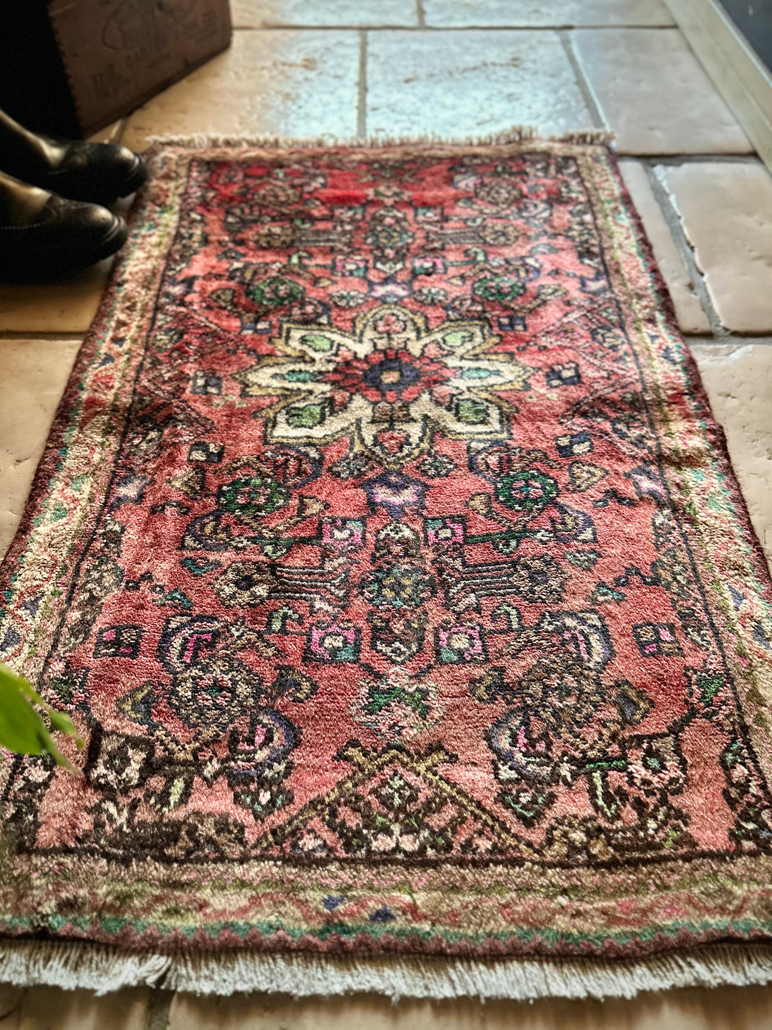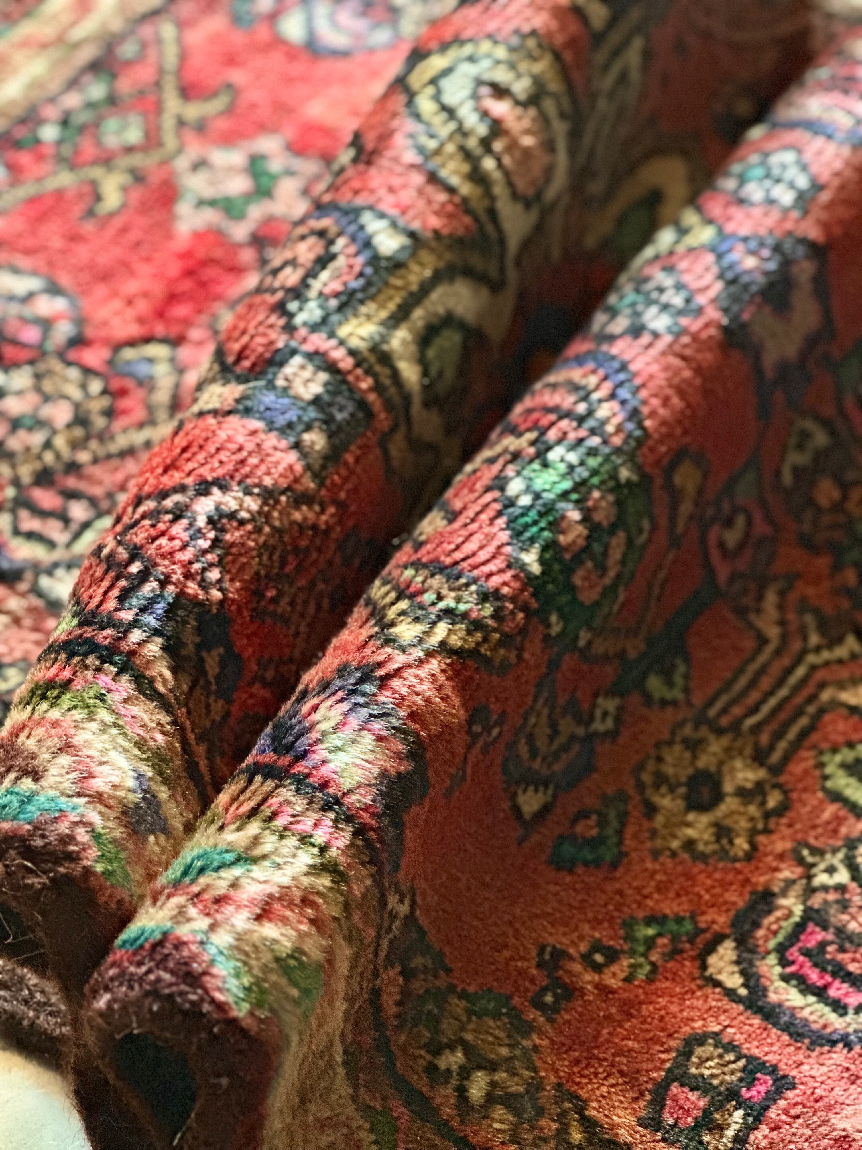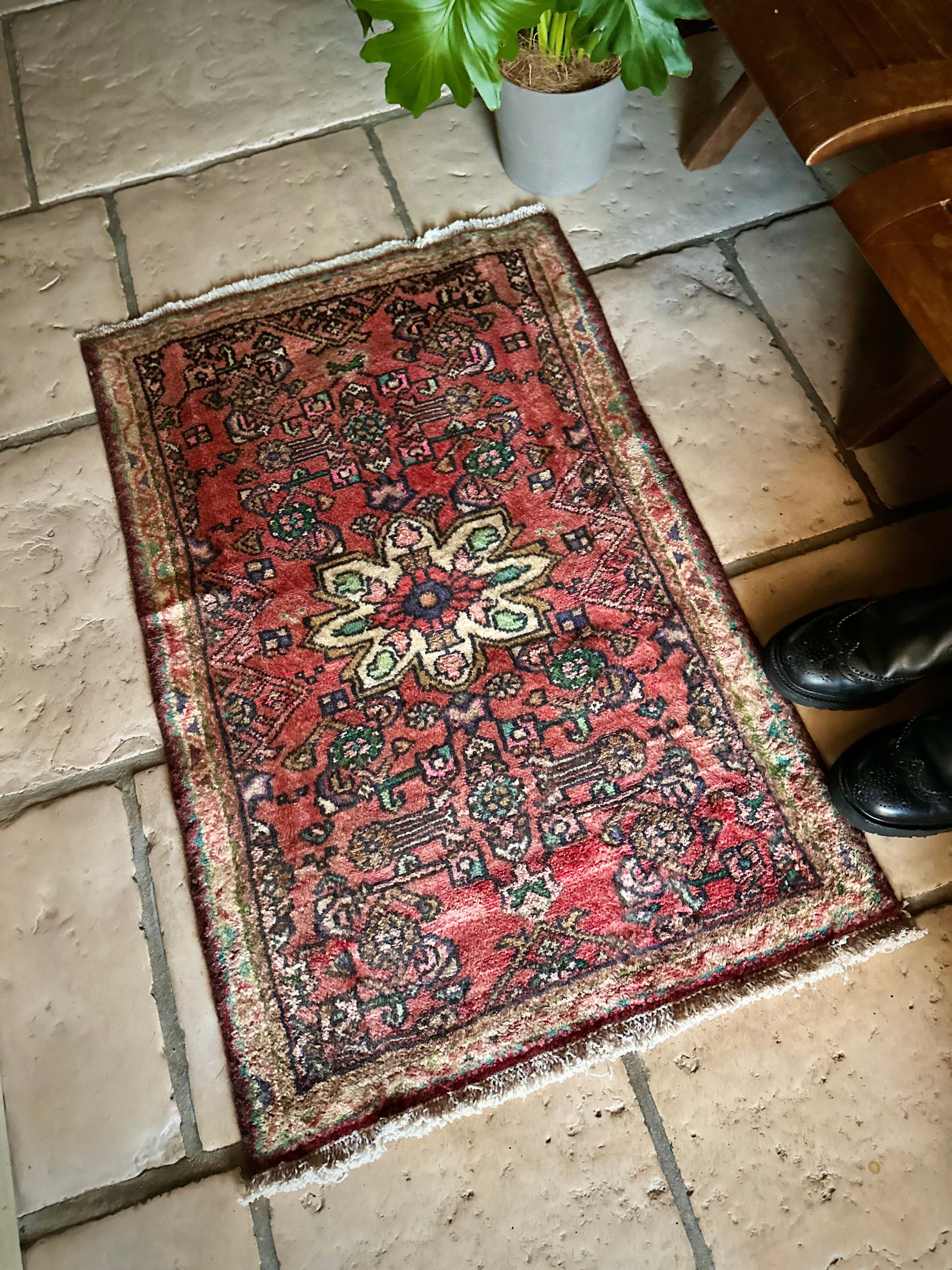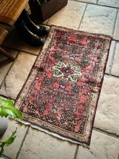 如何にもハマダン産らしいガシッとした分厚いシングル・ウェフトで織られた1枚で、パイル自体は短めながらも密度がありしっとりとした優しい肌触りに、敷く場所を選ばないこぢんまりとした玄関マットサイズのアクセントラグになります。