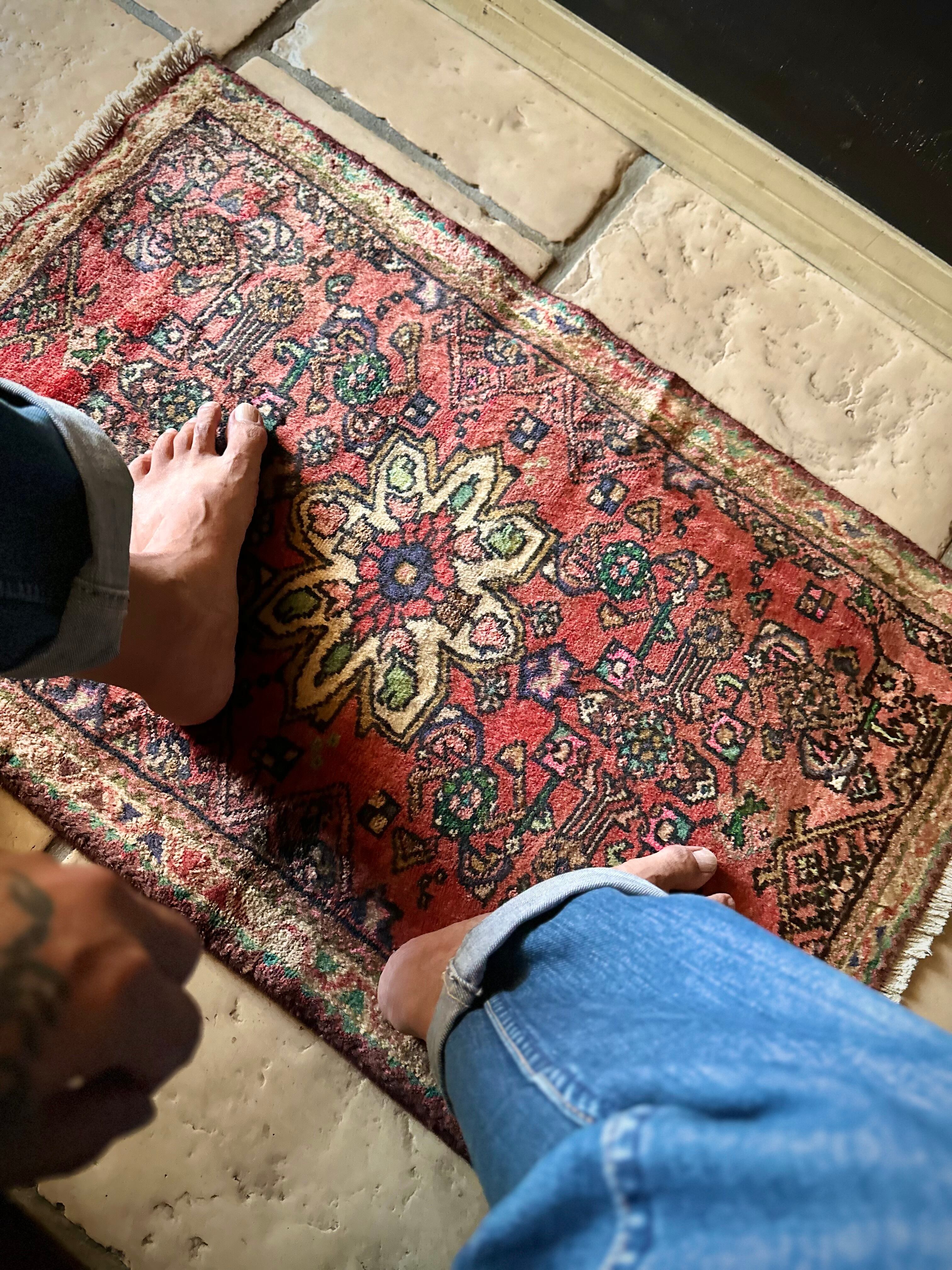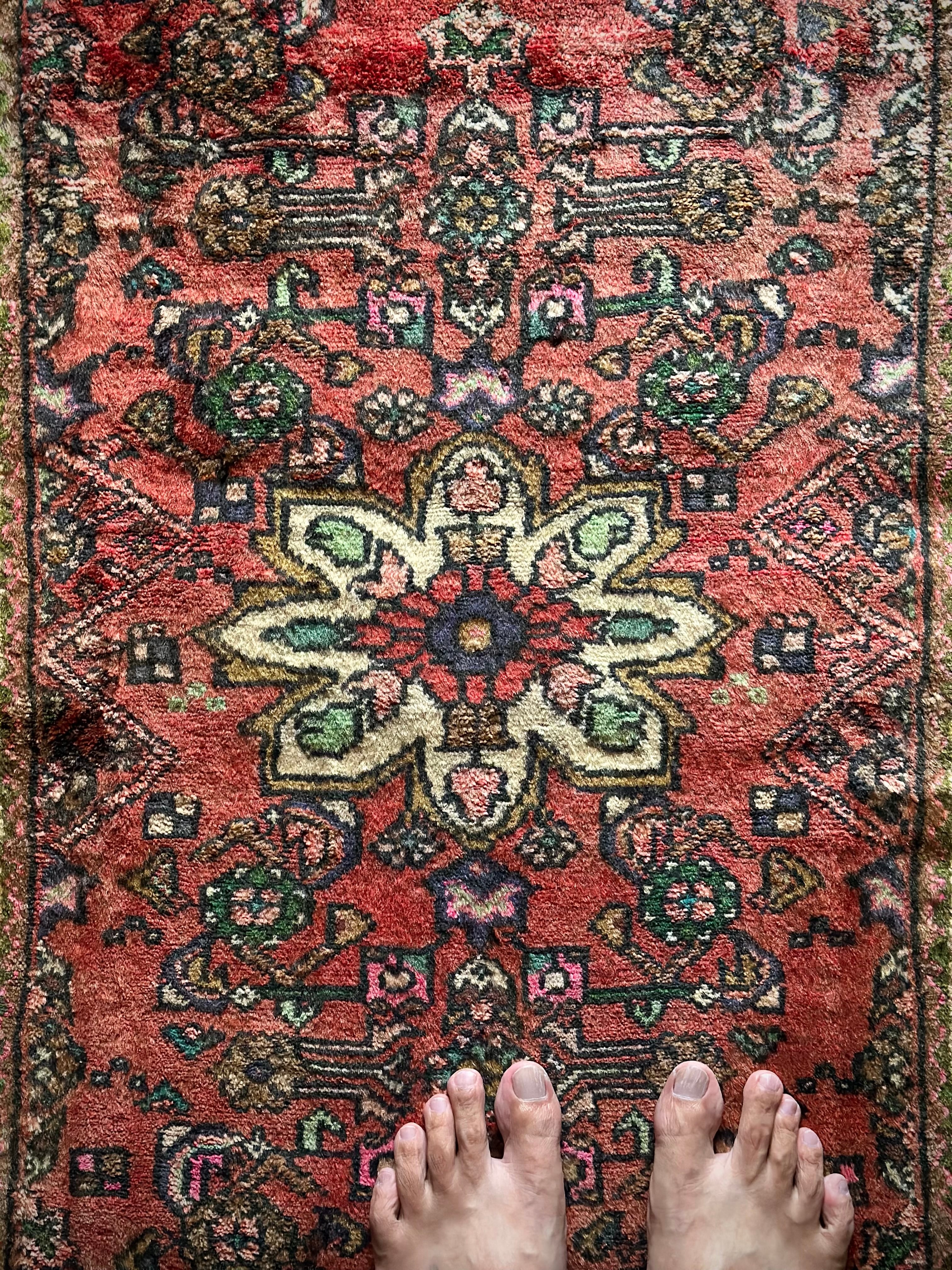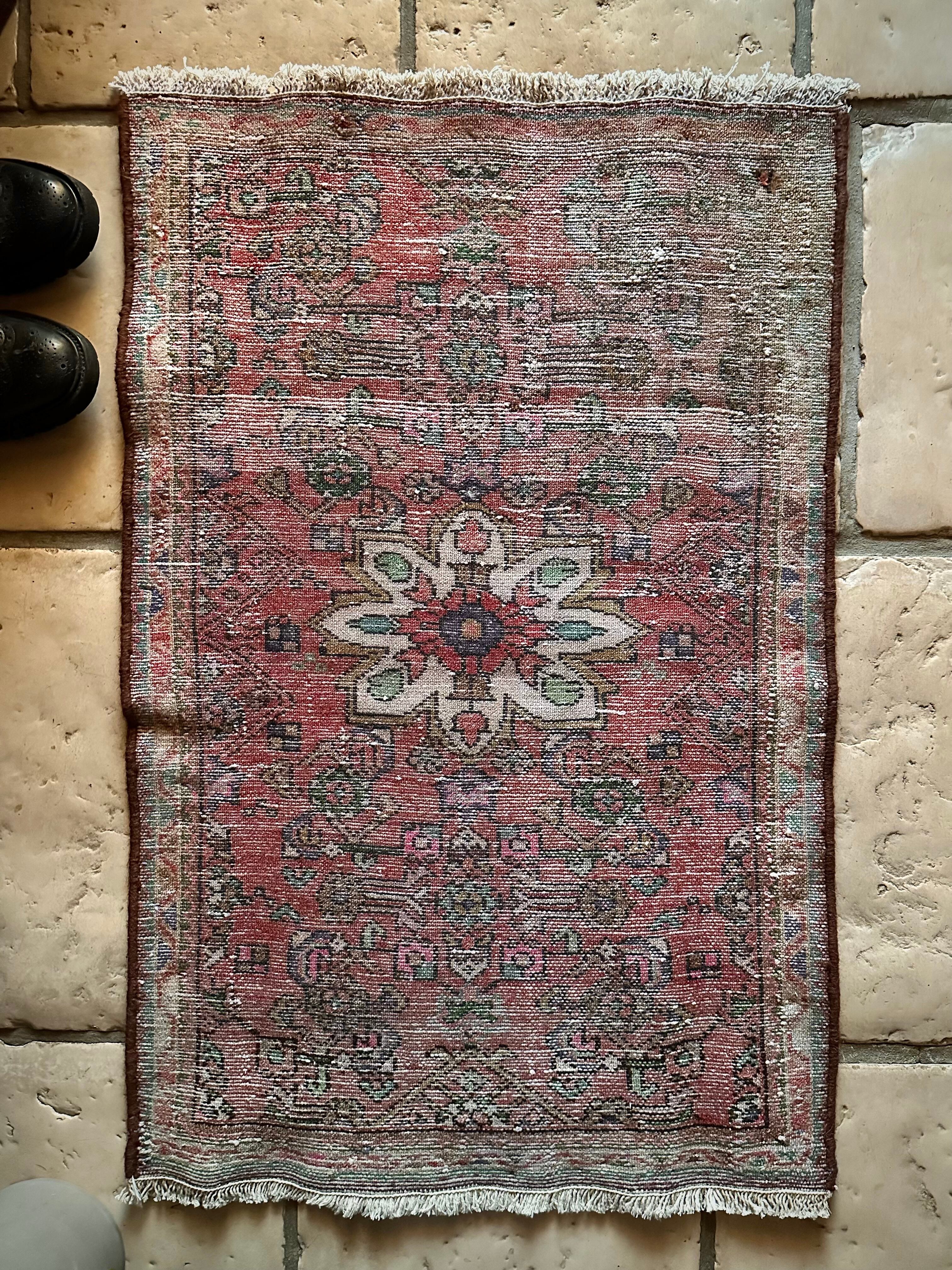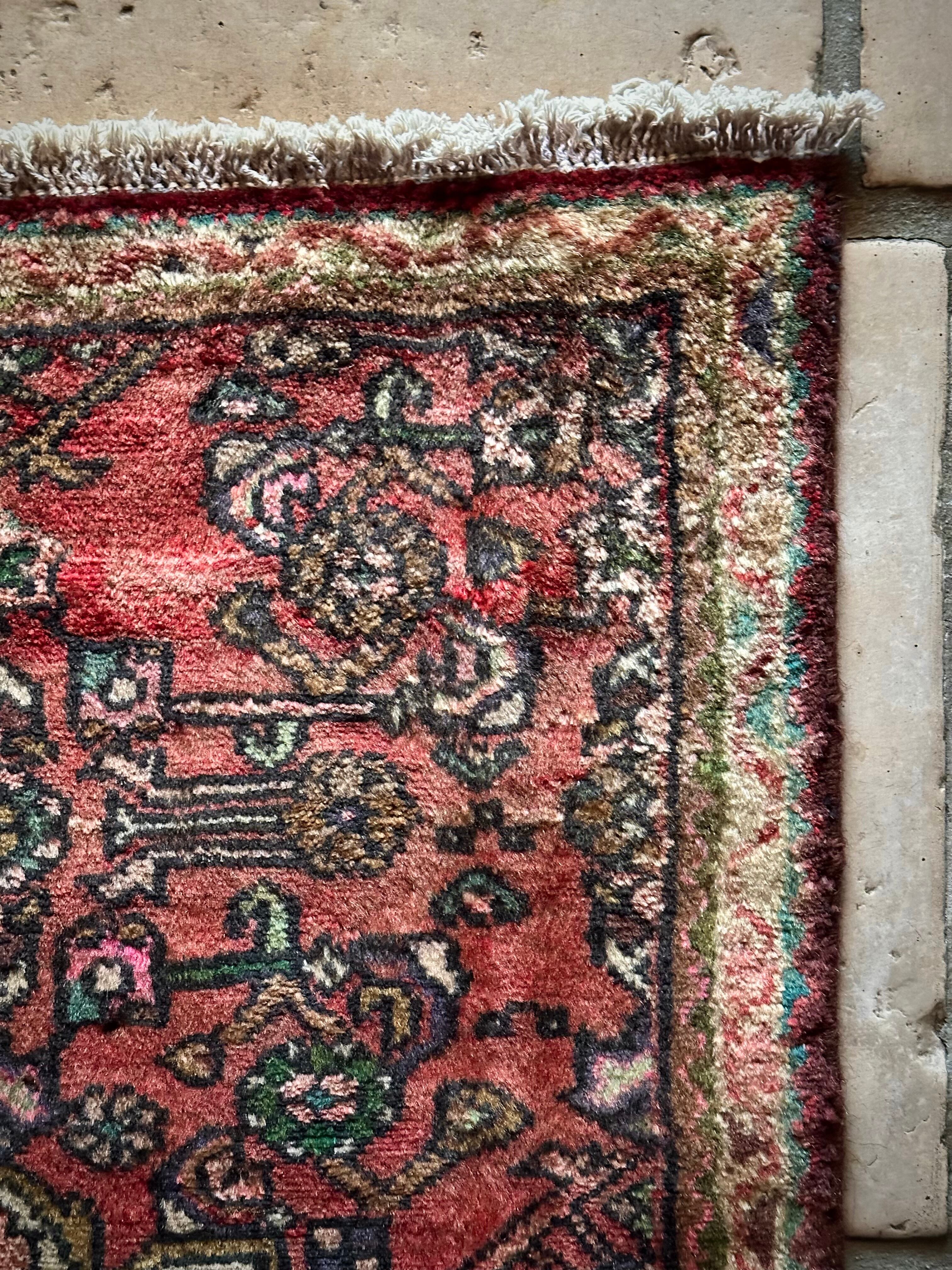 如何にもハマダン産らしいガシッとした分厚いシングル・ウェフトで織られた1枚で、パイル自体は短めながらも密度がありしっとりとした優しい肌触りに、敷く場所を選ばないこぢんまりとした玄関マットサイズのアクセントラグになります。