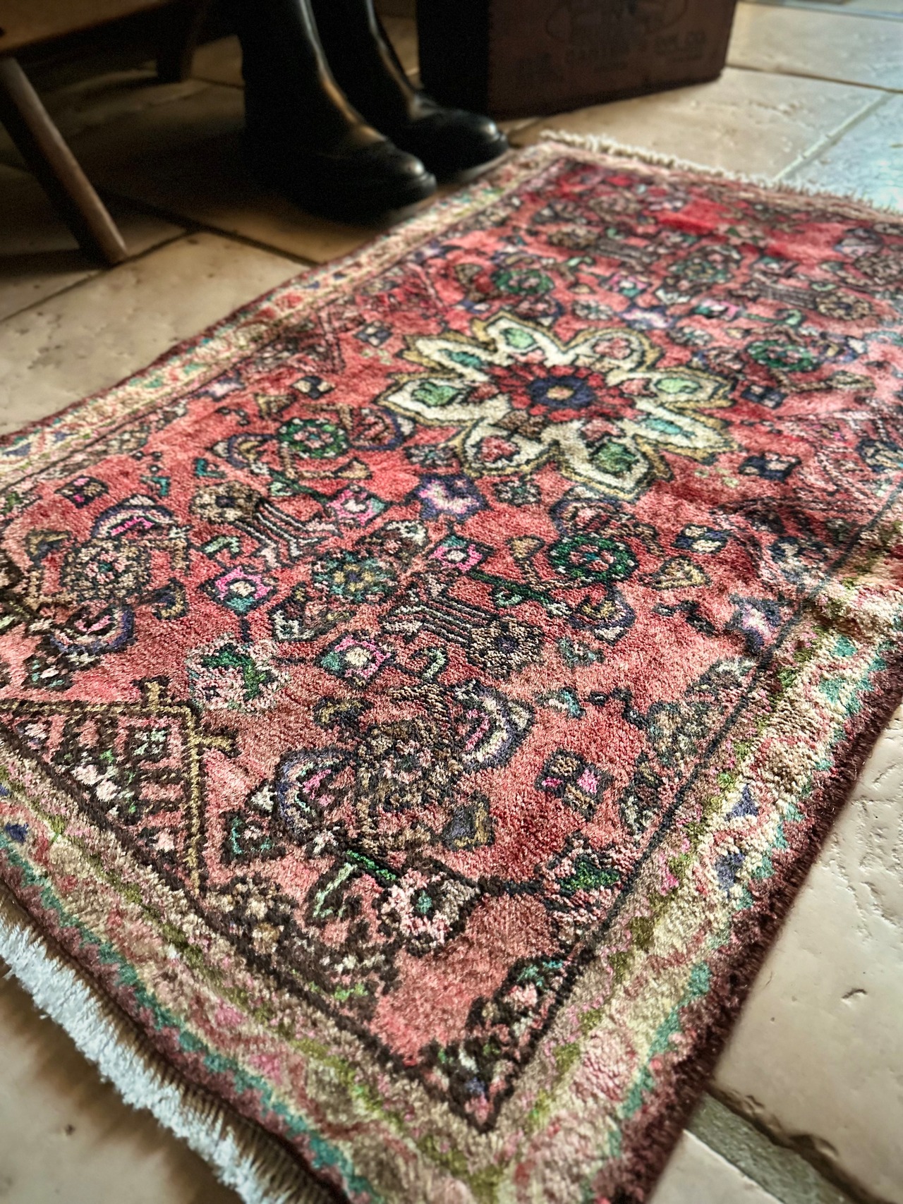 経年としては35年のヴィンテージラグならではのツヤ感が美しく、見る方向による色の変化が面白いでしょうか。それなりの使用感はありますが、特に目立つ汚れやダメージにリペア箇所は見当たらないグッドなコンディションで、白い床にもよく似合う色合いの1枚です。
