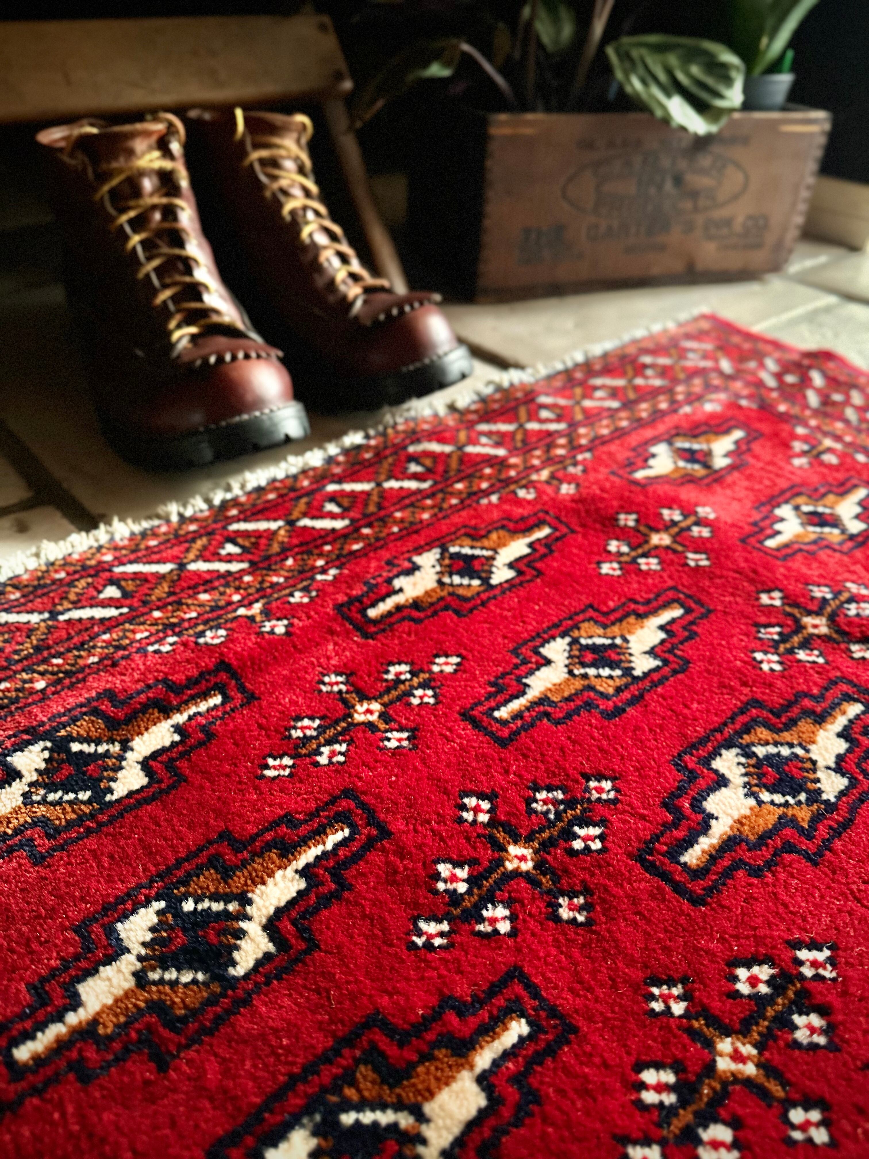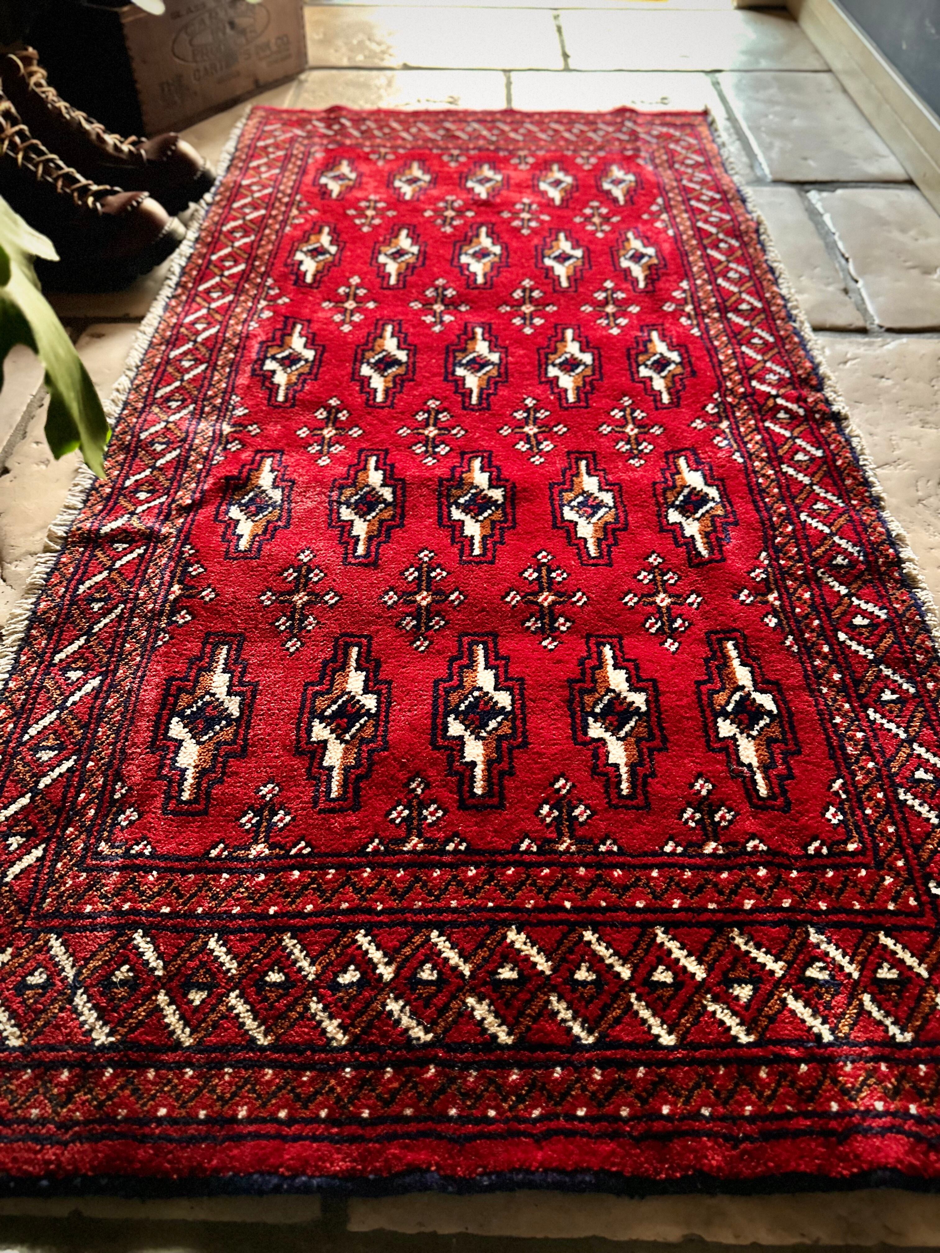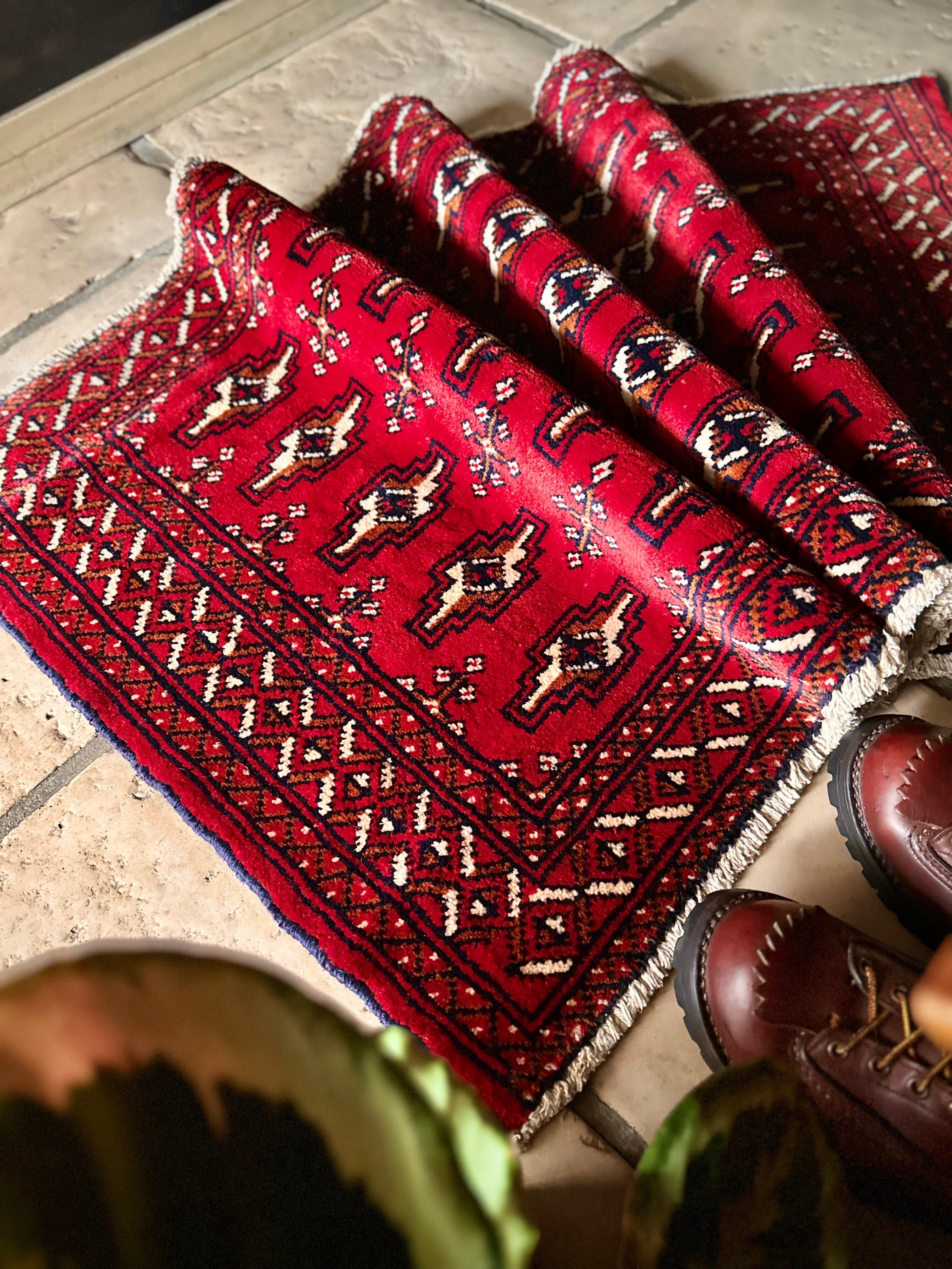 最後にラグそのものに関しては羊毛特有の匂いがあり、採寸は中央付近で計測していますが、手織りならではの歪みによる誤差や水洗いクリーニングによる縮み、また草木染めによる経年劣化の色ムラなどがありますが、それもまたヴィンテージラグの魅力かとご理解ください。