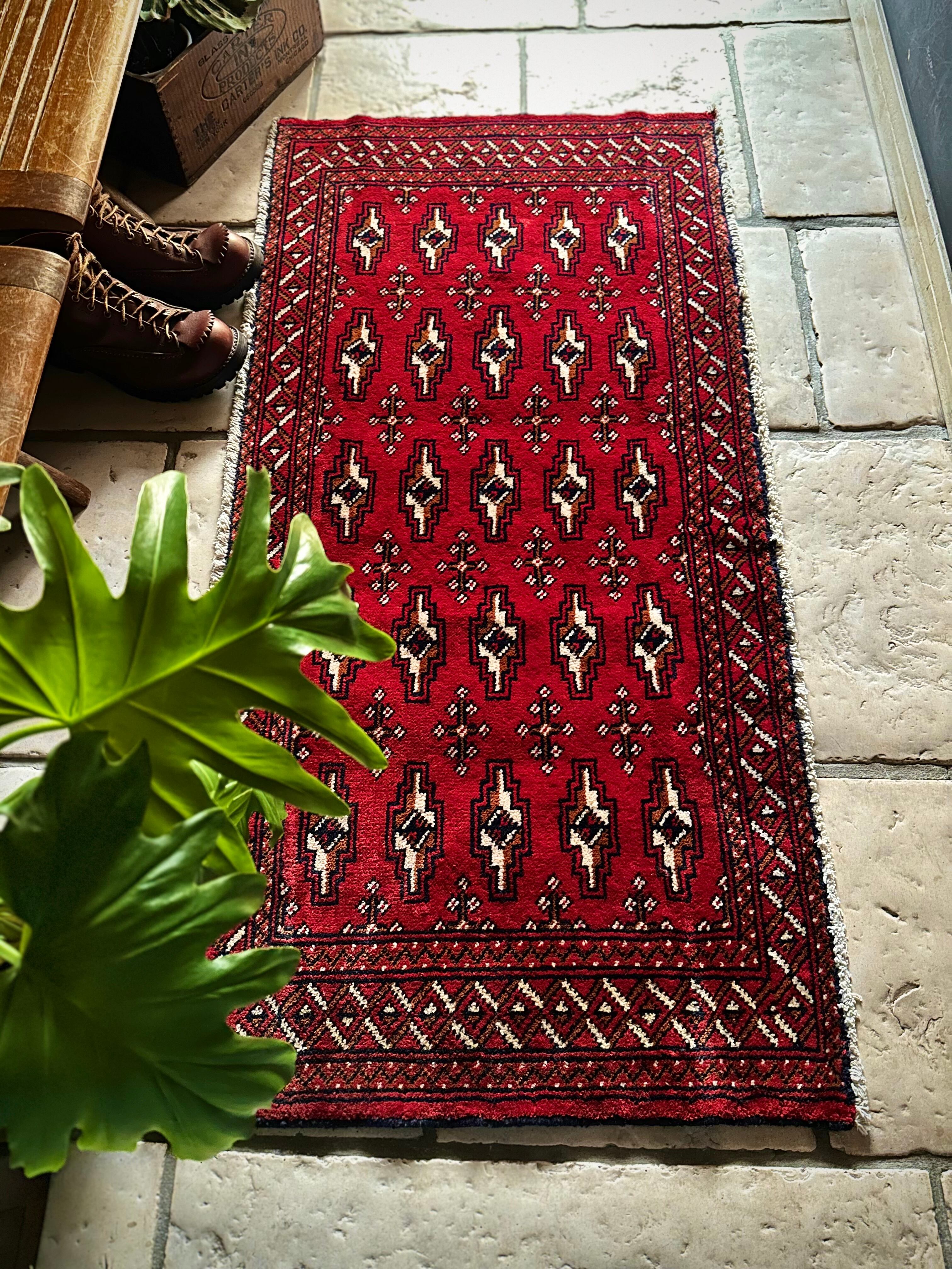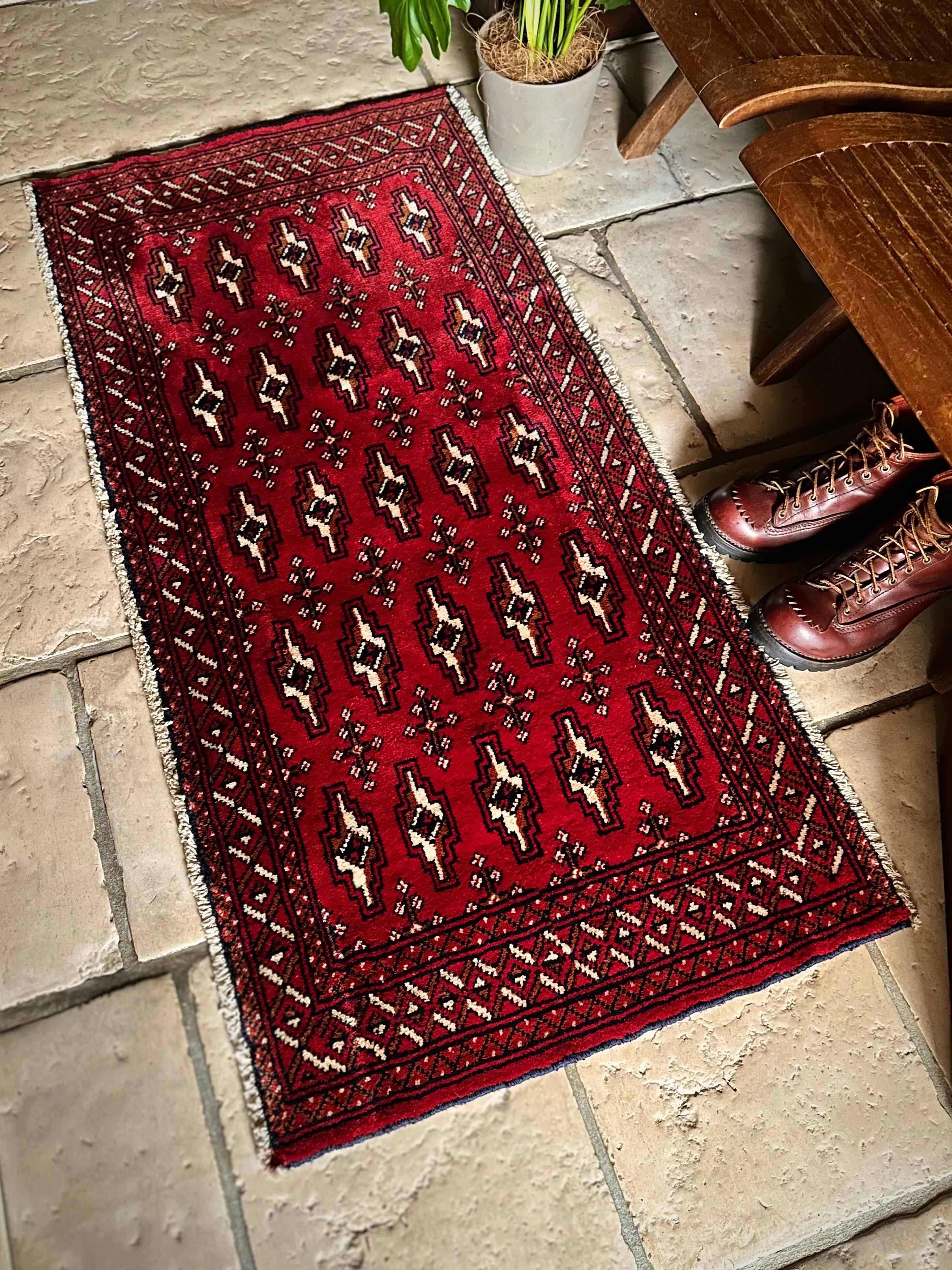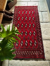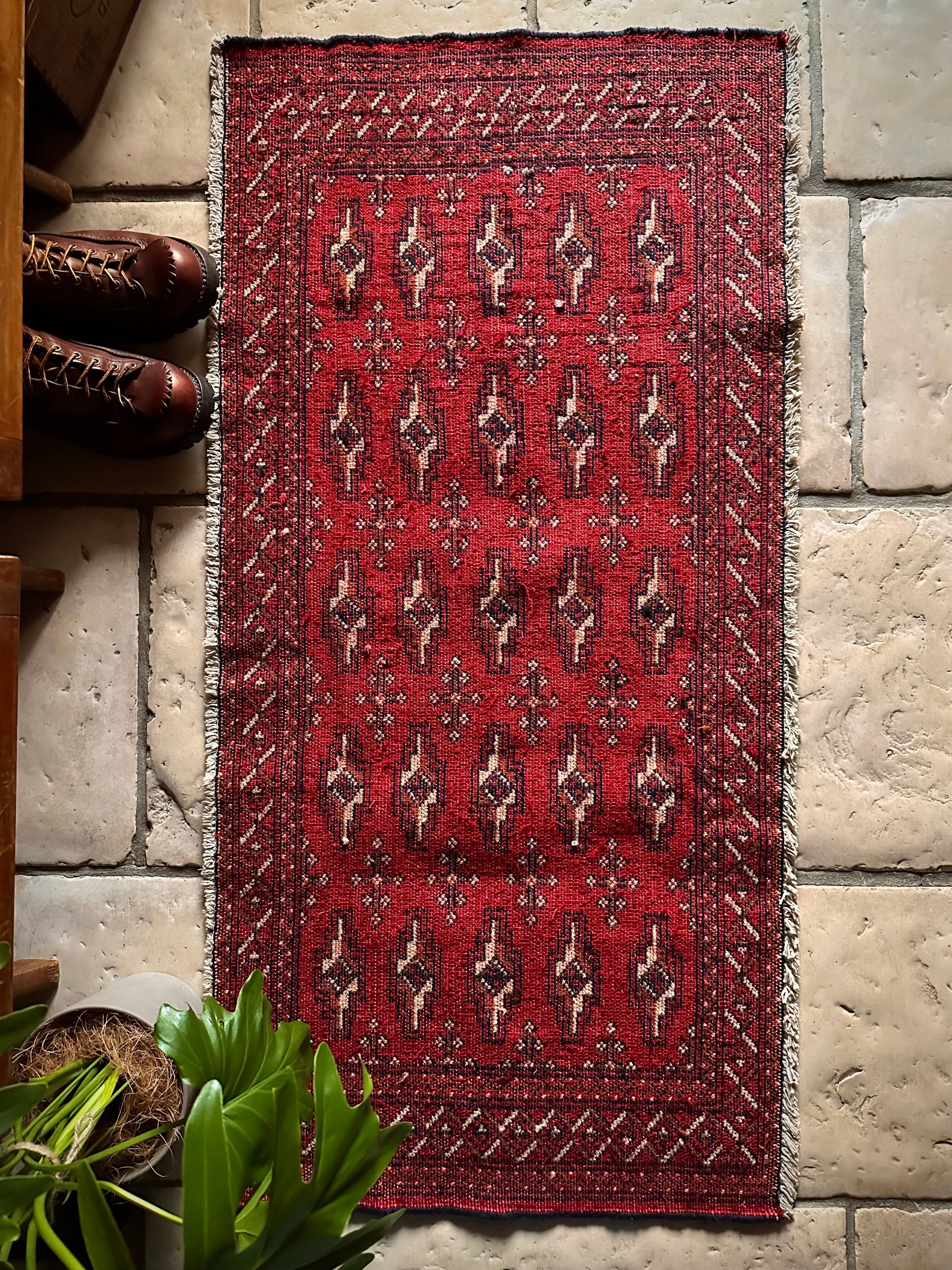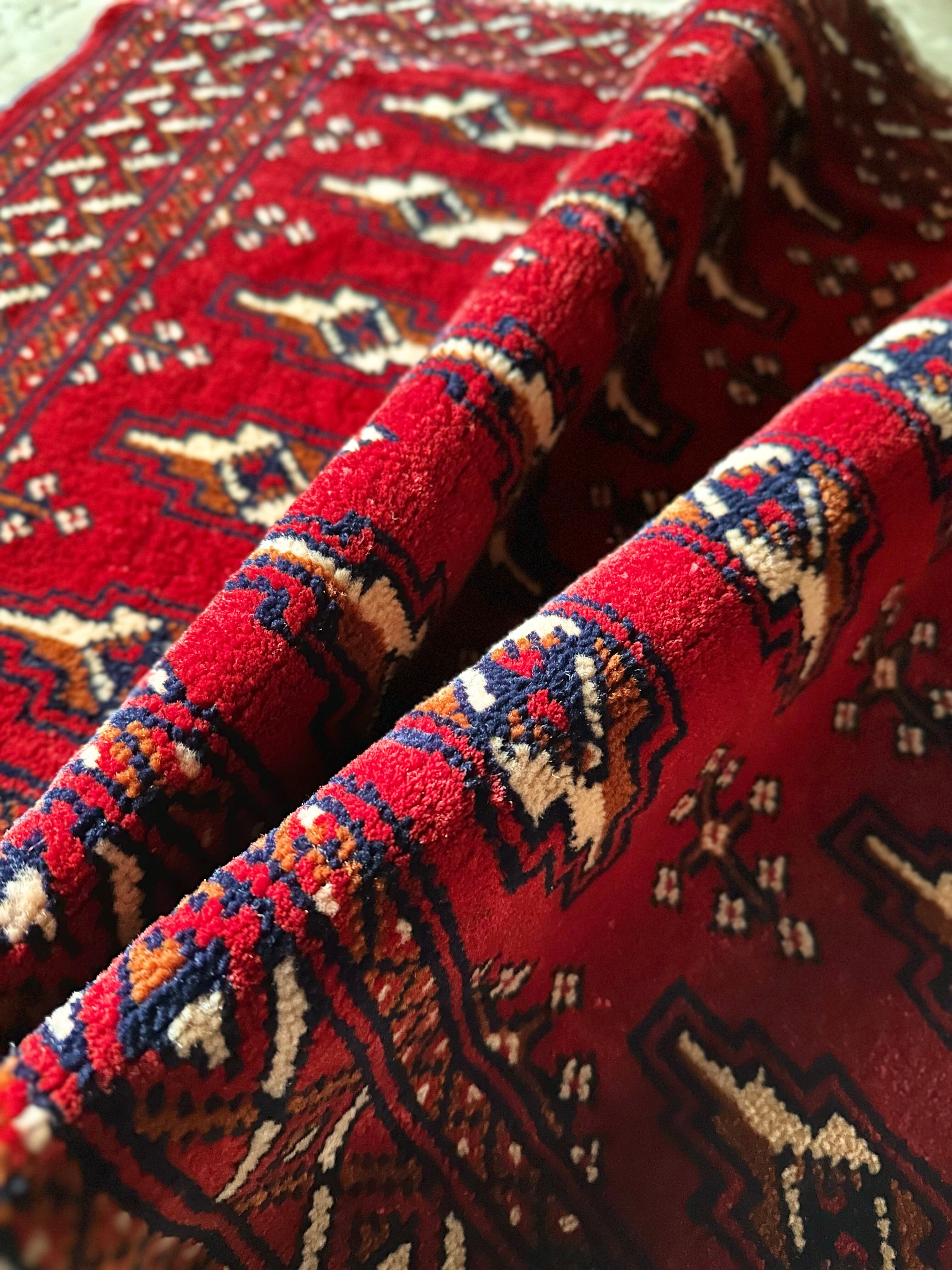 伝統的とも言える小さなギュルの連続紋様が何故か安心感を与えてくれる、真っ赤な絨毯の代名詞とも言えるトルクメンのトライバルラグになり、元々がチュワルと呼ばれる大きな収納袋で、クッションとしても使用されていたモノの表皮をラグに仕立て直した1枚になります。
