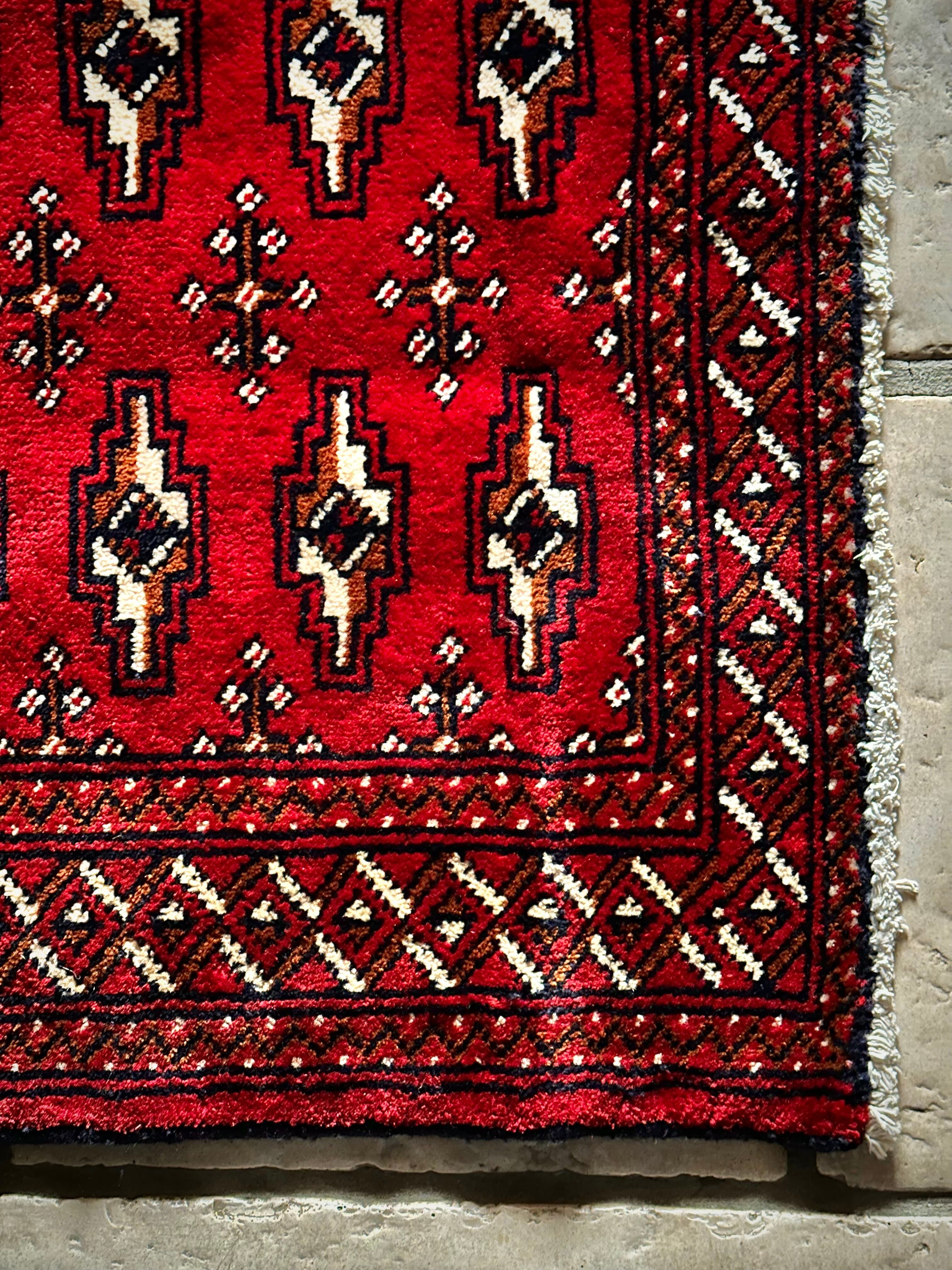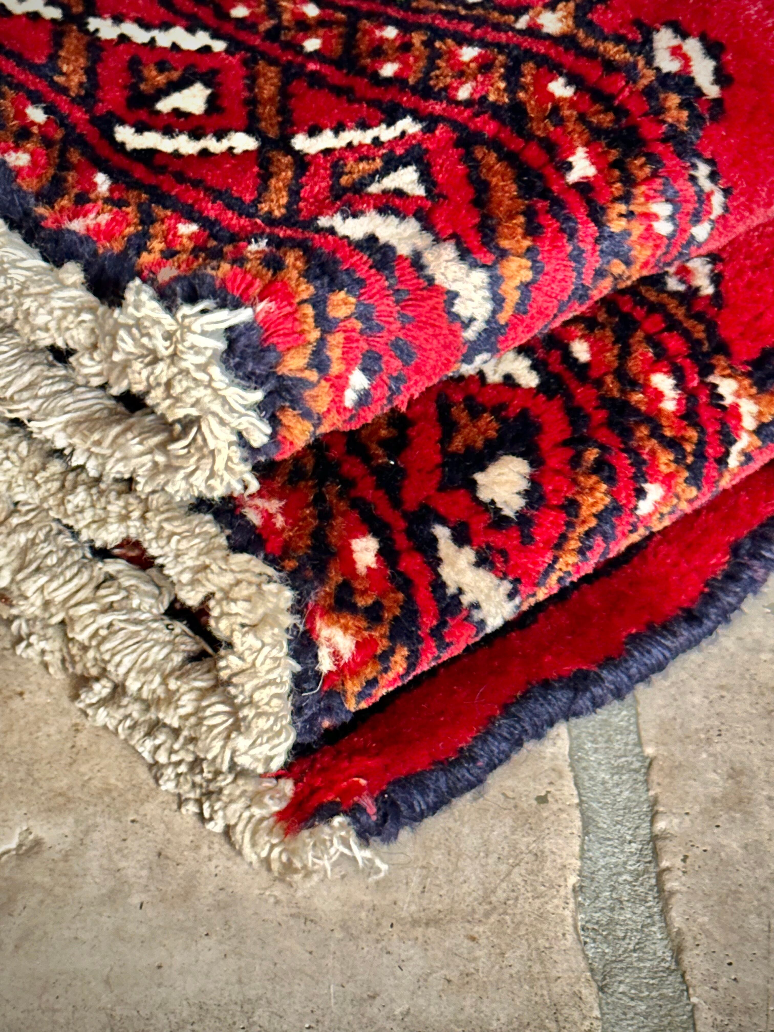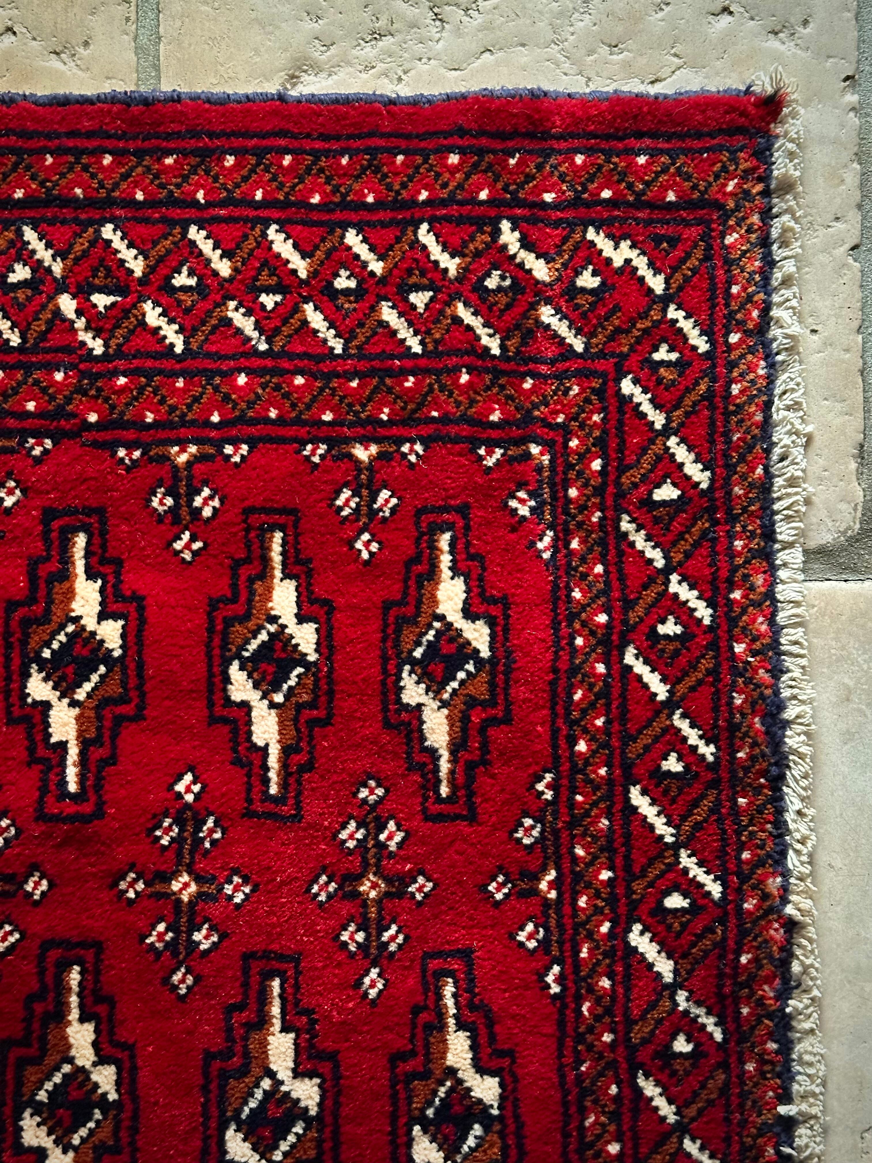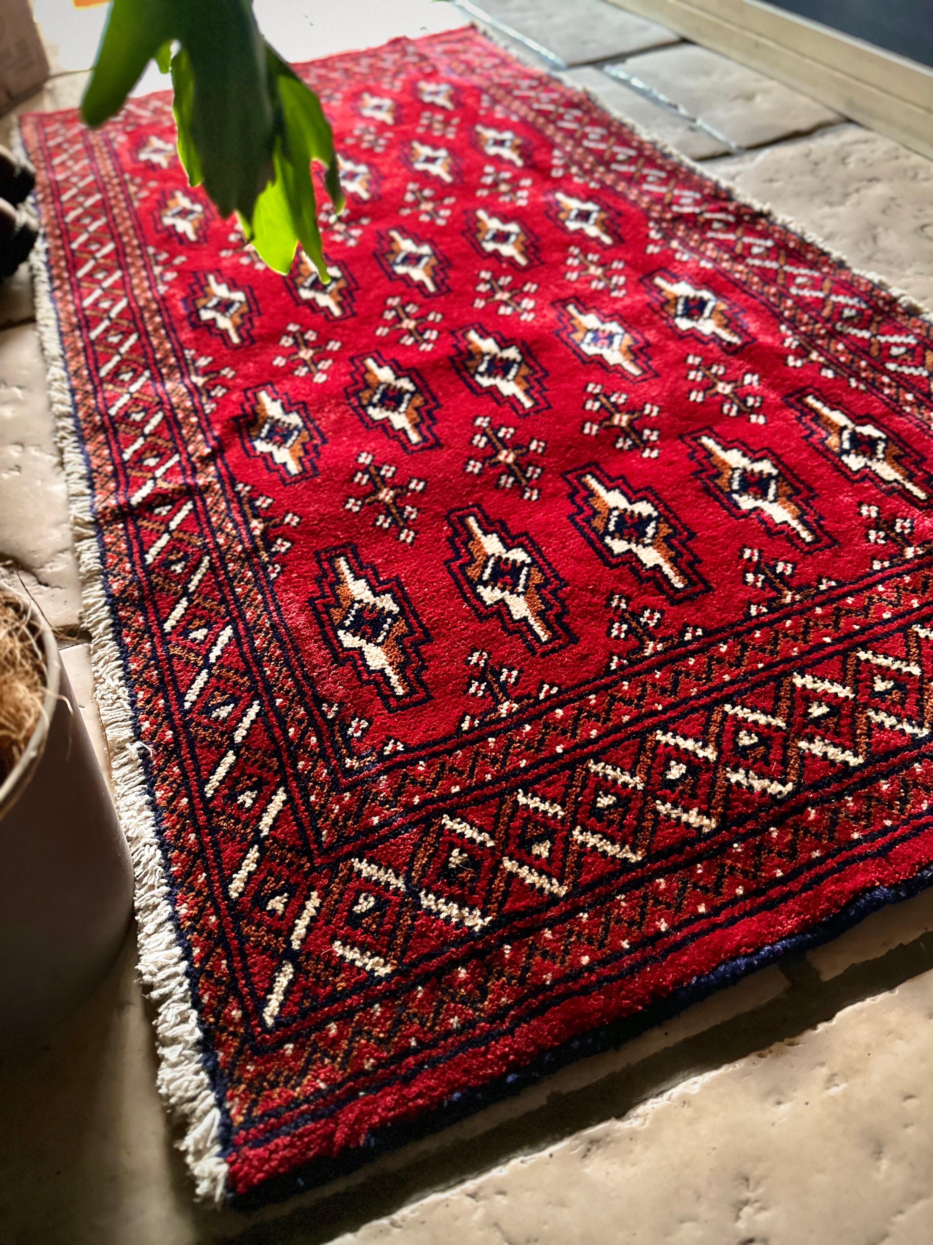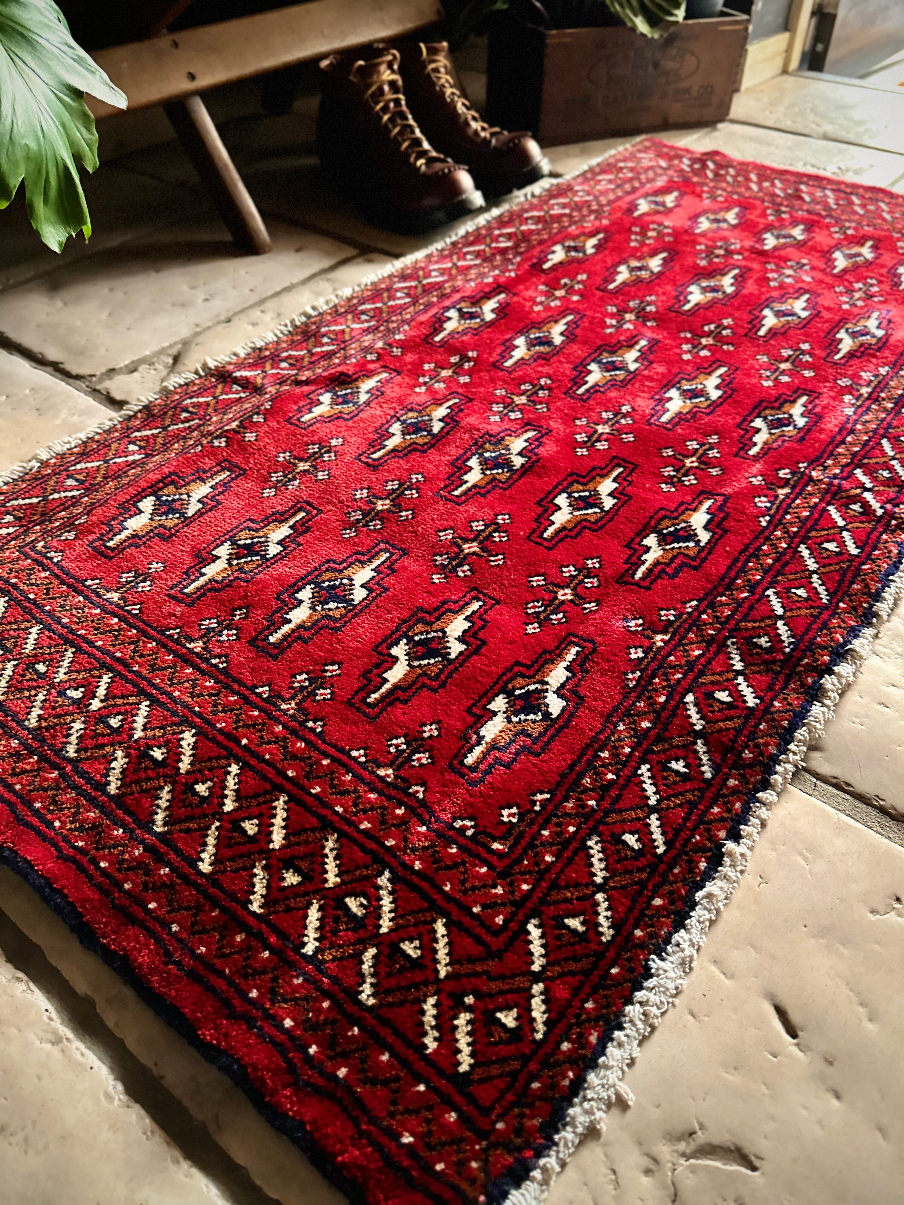 伝統的とも言える小さなギュルの連続紋様が何故か安心感を与えてくれる、真っ赤な絨毯の代名詞とも言えるトルクメンのトライバルラグになり、元々がチュワルと呼ばれる大きな収納袋で、クッションとしても使用されていたモノの表皮をラグに仕立て直した1枚になります。
