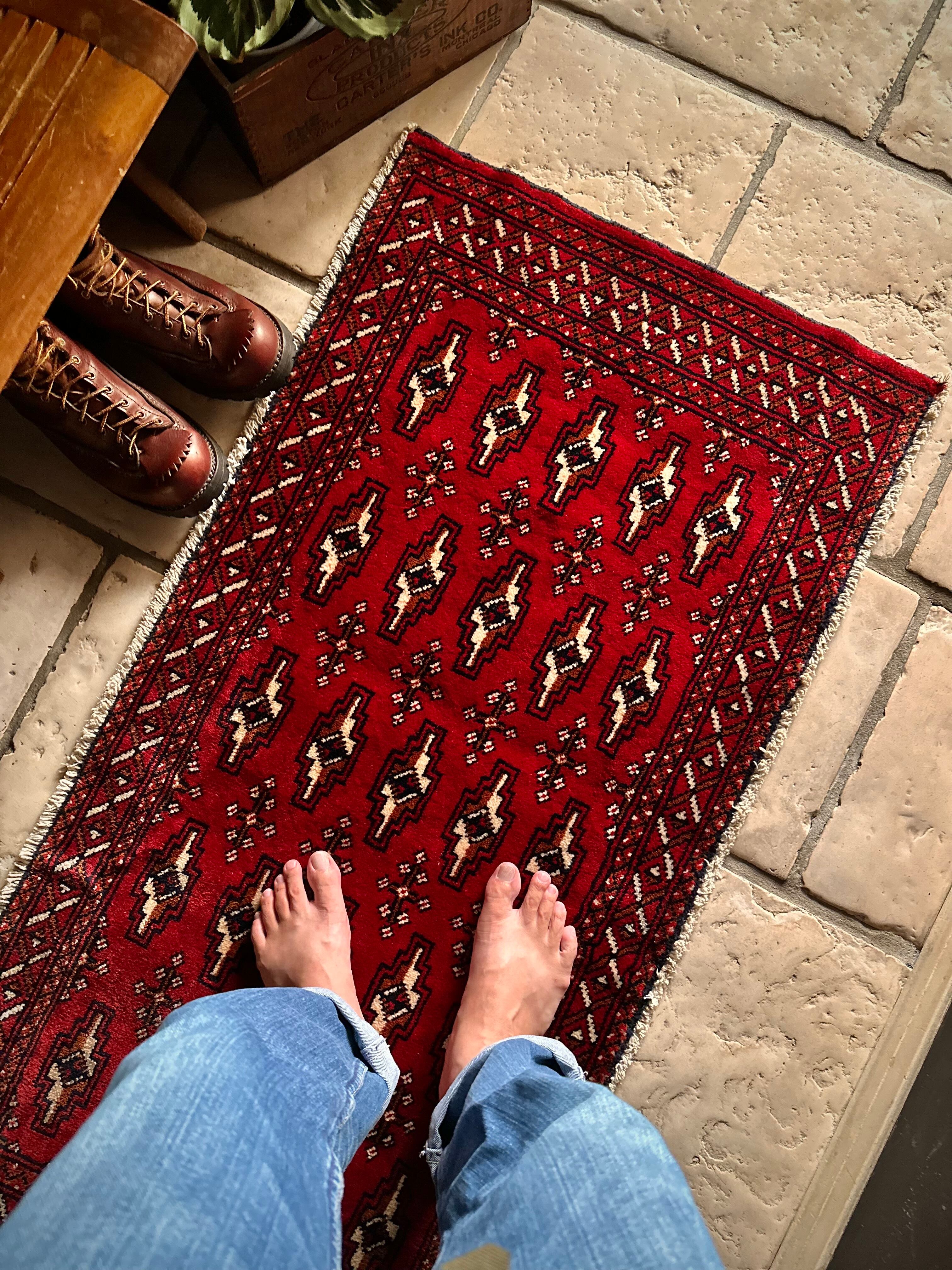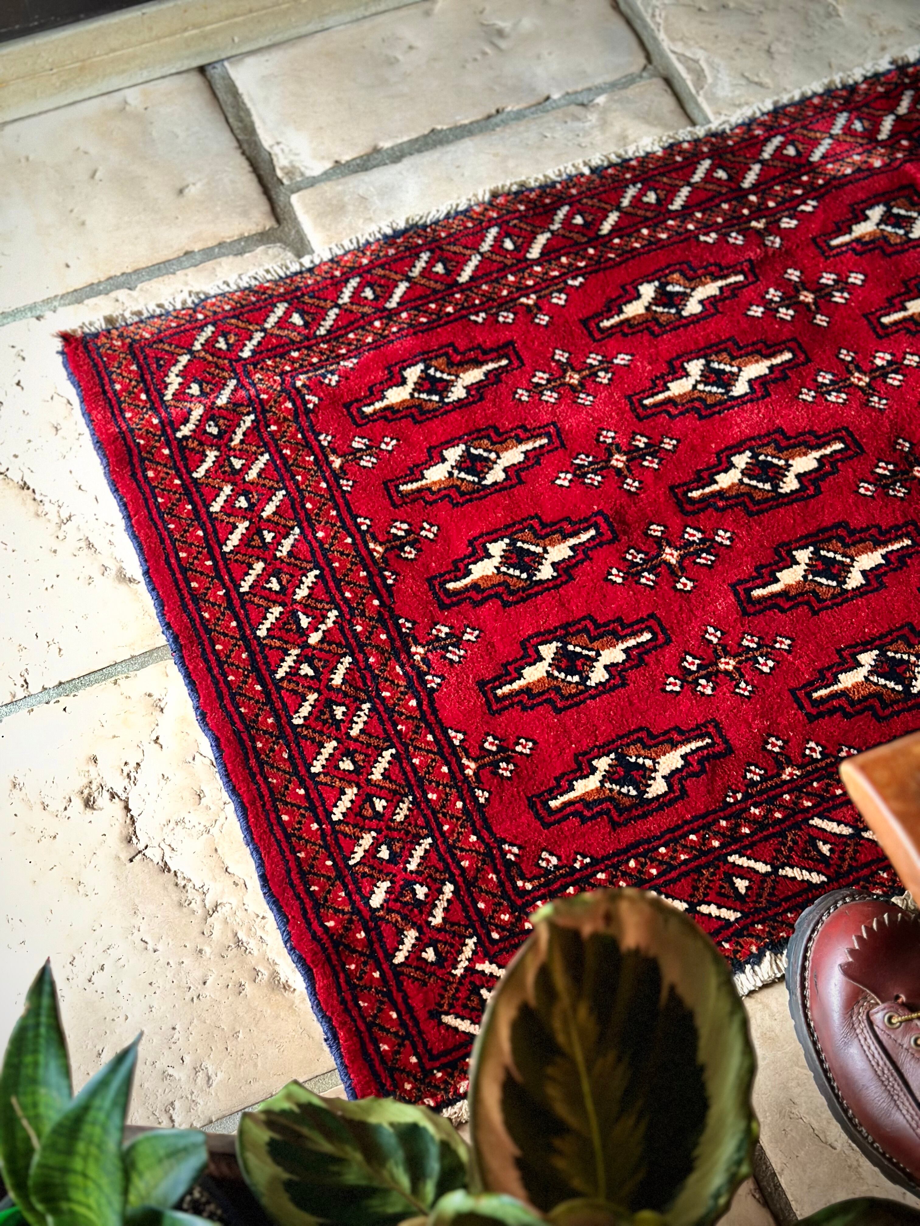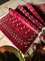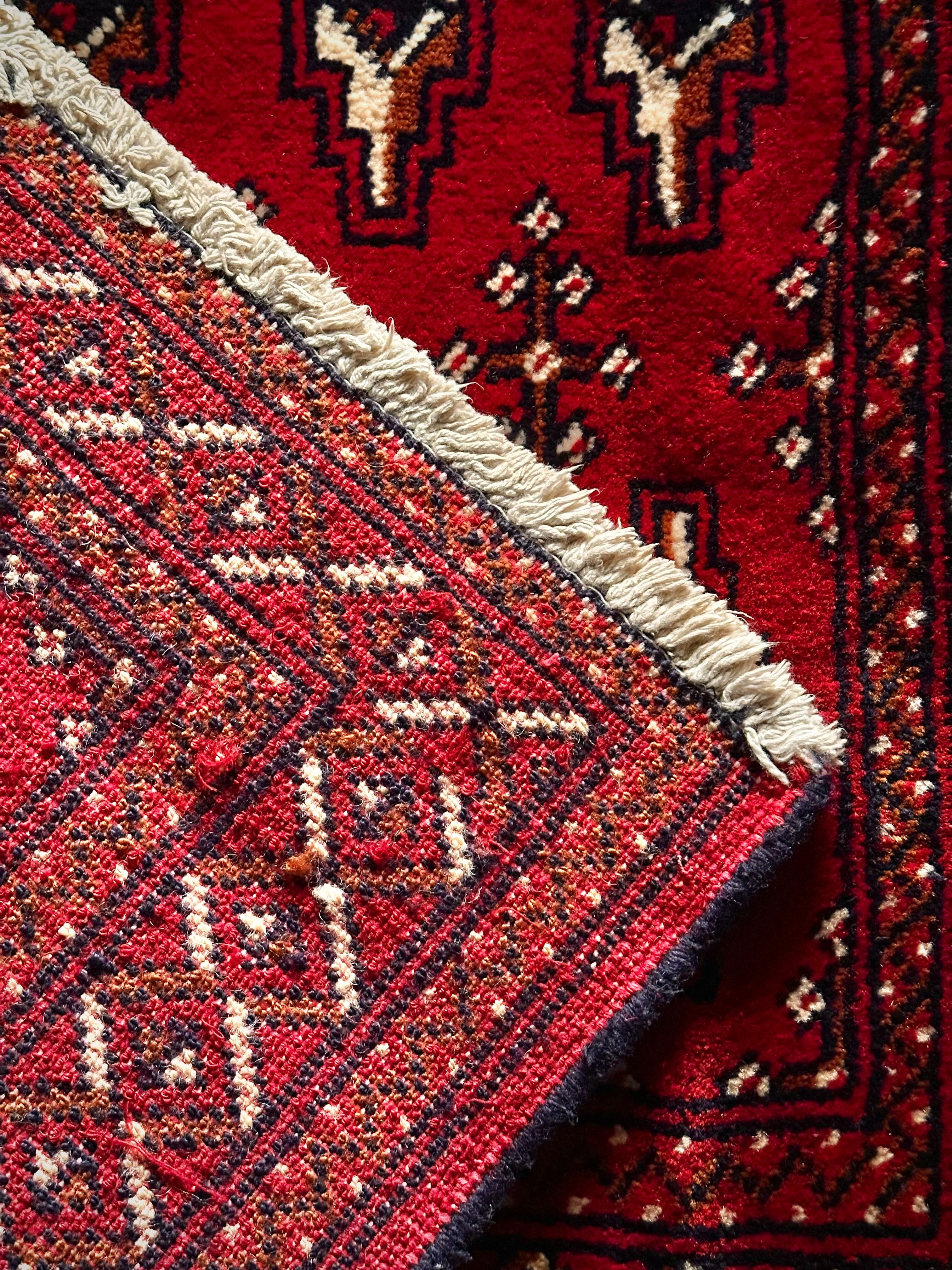経年としてはそれほど古くはない15年となり、収納袋として使われていただけに特に目立つ使用感はありませんし、汚れやリペア箇所も見当たらないグッドなコンディションで、トルクメンらしくパイル自体は長くはありませんが、しっとりとした羊毛の柔らかさで足裏を癒してくれます。