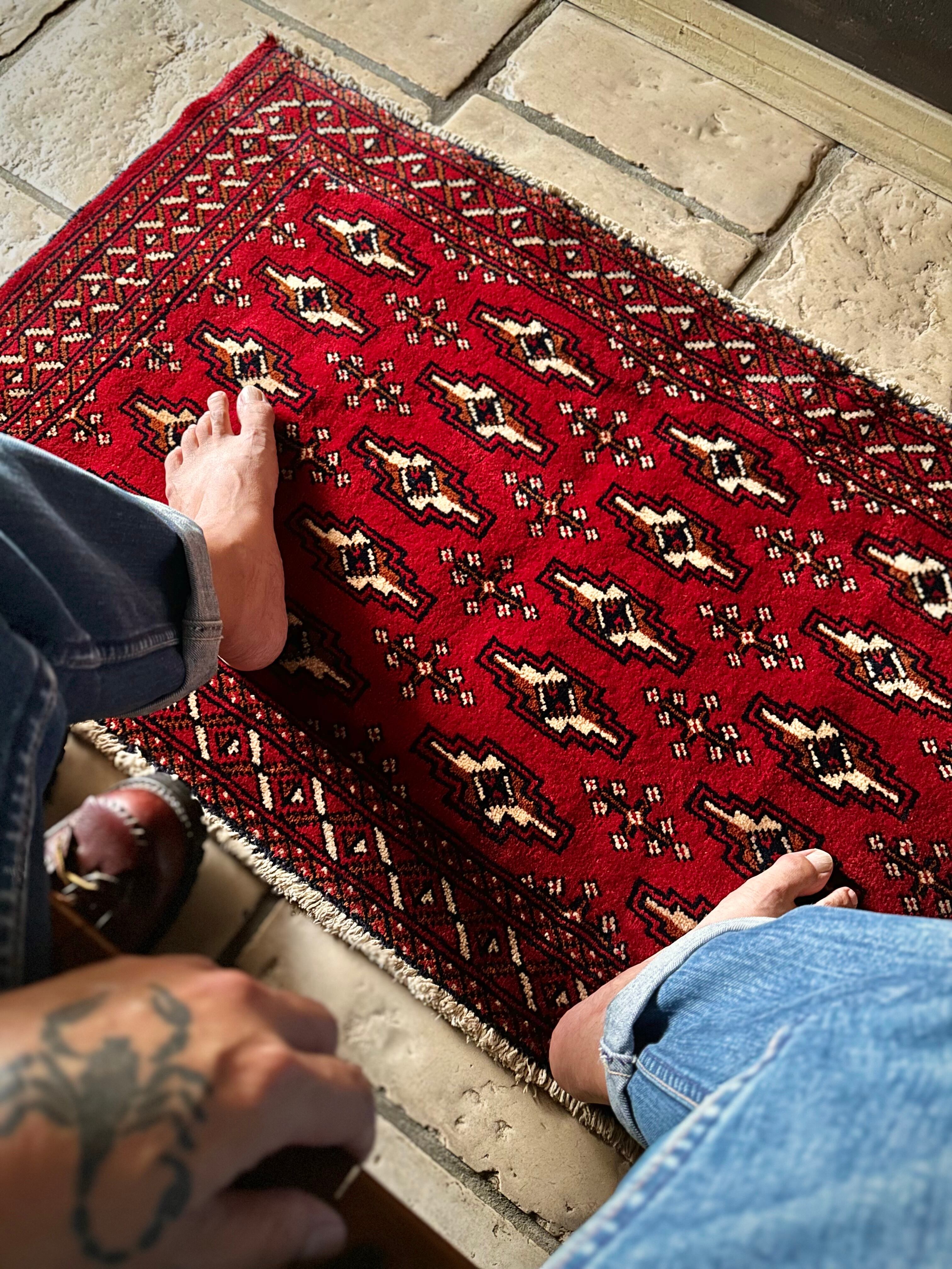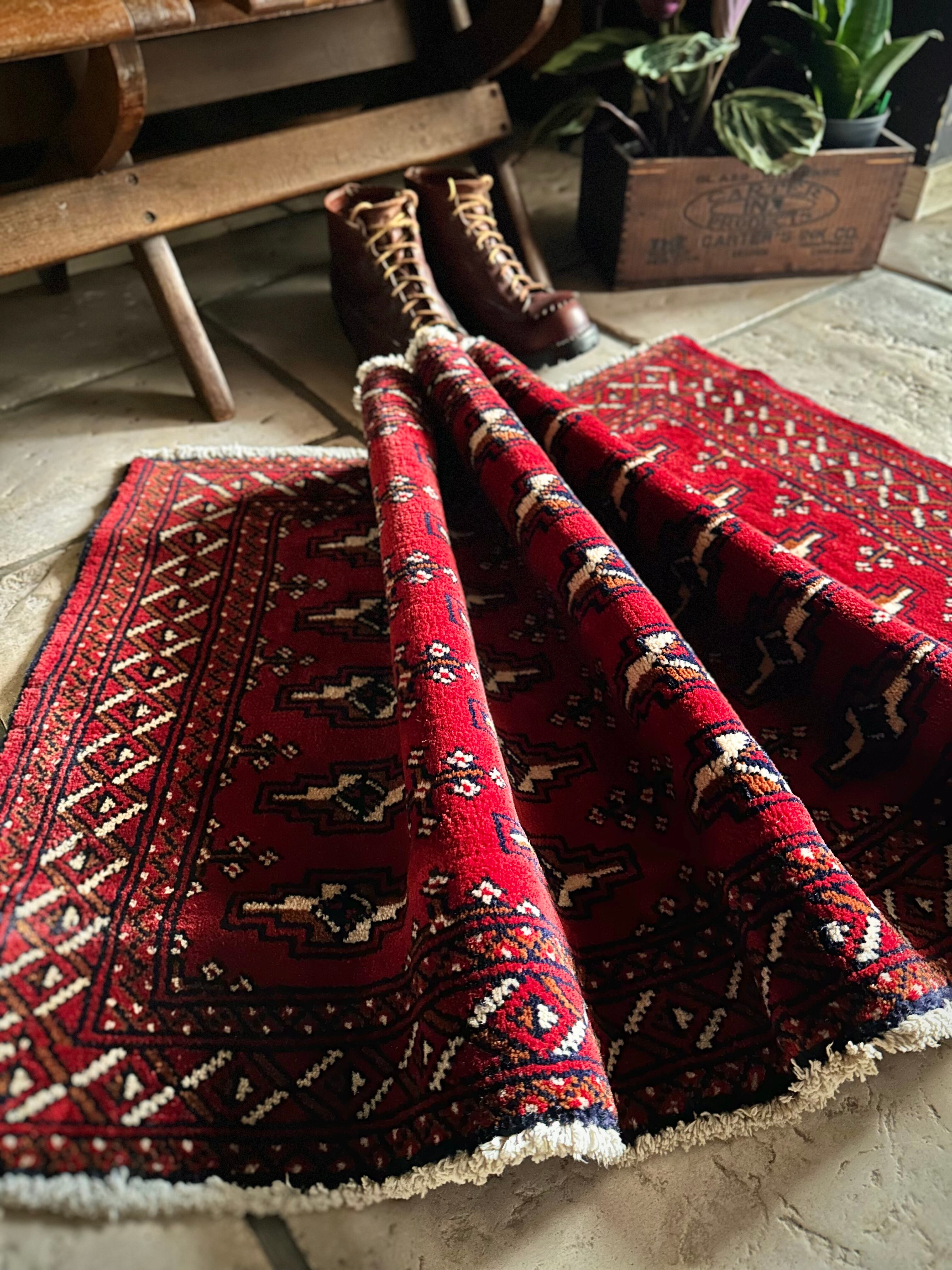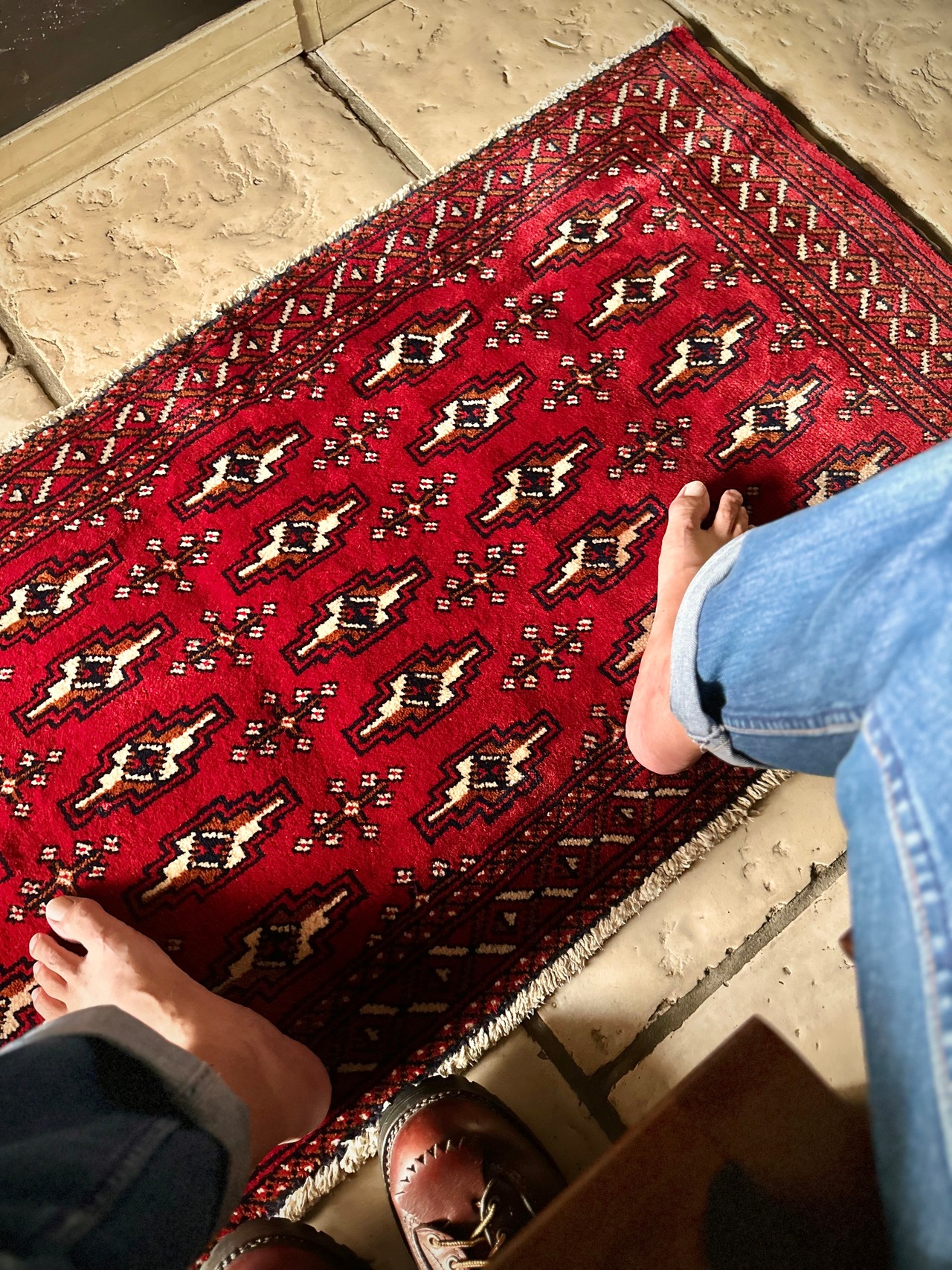 経年としてはそれほど古くはない15年となり、収納袋として使われていただけに特に目立つ使用感はありませんし、汚れやリペア箇所も見当たらないグッドなコンディションで、トルクメンらしくパイル自体は長くはありませんが、しっとりとした羊毛の柔らかさで足裏を癒してくれます。